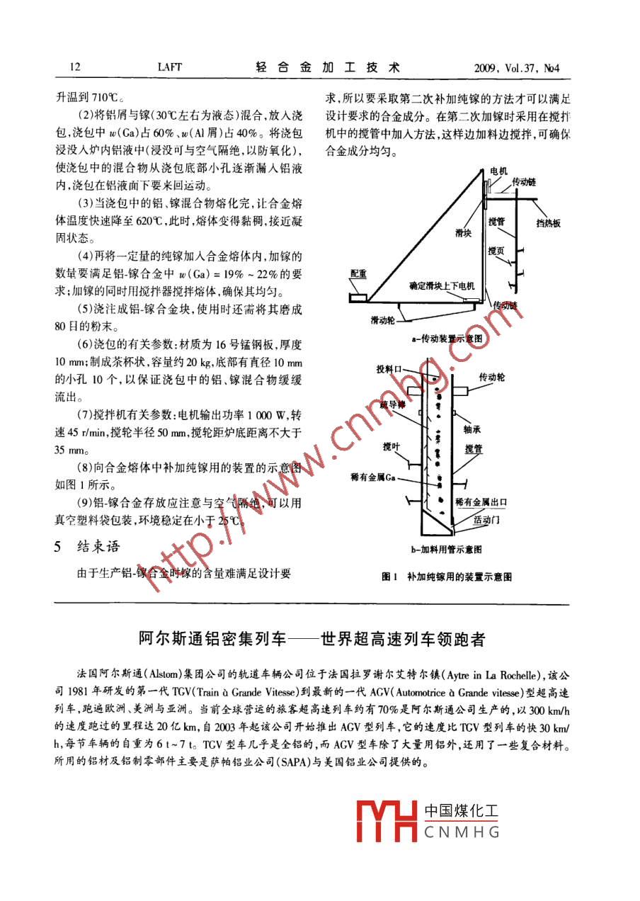 2009,Vol.37,N4輕合金加工技術(shù)LAFT鋁-鎵合金的生產(chǎn)工藝張五勛(洛陽(yáng)鎂鑫合金制品有限公司,河南洛陽(yáng)471311)摘要:氫氣是干凈的新能源,鋁和水反應(yīng)制取氧的成本低廉。但是,鋁和水反應(yīng)制取氡的過(guò)程中,反應(yīng)生成物A2O在鋁表面形成致密的保護(hù)膜,使反應(yīng)不能持續(xù)進(jìn)行。鎵可以破壞鋁表面的保護(hù)膜,使鋁和水制取氫反應(yīng)得以持續(xù)進(jìn)行。鎵分兩次和鋁熔體混合,制成鋁鎵合金。關(guān)鍵詞:鋁;鎵;氫氣;污染;能源中圖分類號(hào):TG146.2;TG292文獻(xiàn)標(biāo)識(shí)碼:A文章編號(hào):100-7235(2009)04-0011-02Production Technology for Al-Ga AlloyZHANG Wu-xunLuoyang Meixin Hejin Zhipin Co, Ltd, Luoyang 471311, China)Abstract: Hydrogen is a kind of new energy. Production of the hydrogen costs low by the reaction of aluminum and water. Howev-er,in the process of producing hydrogen by the reaction of aluminum and water, the reaction product A O, forms the compact pro-tective film on the surface of aluminum to stop the reaction. Gallium can damage the protective film on the surface of aluminum tocontinuance of the reaction of aluminum and water. Gallium mixes with aluminum melt for separate two times to produceKey words: aluminum; gallium; hydrogen: pollution; energy的接觸,致使反應(yīng)不能繼續(xù)進(jìn)行。1氫氣是一種新能源氫氣是一種干凈的新能源有廣闊的應(yīng)用前景。3鋁-鎵合金與水反應(yīng)制取氫氣現(xiàn)在已經(jīng)研制出以氫氣為燃料的汽車。但是,傳統(tǒng)現(xiàn)在研究證明,鎵(Ga)可以破壞Al2O3保護(hù)膜方法生產(chǎn)氫氣成本高,而且氫氣的生產(chǎn)和作為燃料使鋁和水的反應(yīng)得以持續(xù)進(jìn)行。可以認(rèn)為鎵是鋁和使用這兩個(gè)過(guò)程之間還有一個(gè)儲(chǔ)存問(wèn)題,在制取和水反應(yīng)制取氫氣的催化劑。鎵作為催化劑的回收利儲(chǔ)仔氫氣的工藝上也存在一定的難度。用率為75%。2鋁和水反應(yīng)制取氫氣存在的困難如果簡(jiǎn)單地把鎵放進(jìn)水里,然后把鋁也放進(jìn)水里,這樣是不行的。首先應(yīng)該把鋁和鎵制成合金用鋁和水反應(yīng)生產(chǎn)氫氣成本就會(huì)降低而且可4鋁-鎵合金生產(chǎn)工藝以直接在汽車上生產(chǎn)氫氣,省略了儲(chǔ)存環(huán)節(jié),簡(jiǎn)化了工藝。鋁鎵合金的成分是:u(Ga)=19%~2%,鋁和水反應(yīng)生產(chǎn)氫氣的化學(xué)方程式是2A+(Si)=0.015%,w(Fe)=0.015%,w(Cu)=0.005%3HO—A203+3H。但是,反應(yīng)剛一進(jìn)行,生成物余量為ALAl2O3就在鋁表面形成致密的保護(hù)膜隔絕了鋁和水TYH中國(guó)煤化工戶中熔化為液體,CNMHG收稿日期:作者簡(jiǎn)介:張五勛(1976-),男,河南洛陽(yáng)人,工程師。LAFT輕合金加工技術(shù)2009,Vol.37,M4升溫到710℃C。求,所以要采取第二次補(bǔ)加純鎵的方法才可以滿足(2)將鋁屑與鎵(30℃左右為液態(tài))混合放入澆設(shè)計(jì)要求的合金成分。在第二次加鎵時(shí)采用在攪排包,澆包中(Ca)占60%、u(A屑)占40%。將澆包機(jī)中的攪管中加入方法,這樣邊加料邊攪拌,可確保浸沒(méi)入爐內(nèi)鋁液中(浸沒(méi)可與空氣隔絕,以防氧化),合金成分均勻。使?jié)舶械幕旌衔飶臐舶撞啃】字饾u漏入鋁液電機(jī)內(nèi),澆包在鋁液聞下要來(lái)回運(yùn)動(dòng)。傳動(dòng)鏈(3)當(dāng)澆包中的鋁、鎵混合物熔化完,讓合金熔體溫度快速降至60℃,此時(shí),熔體變得黏稠,接近凝擋熱板固狀態(tài)。4)再將一定量的純鎵加入合金熔體內(nèi),加鎵的數(shù)量要滿足鋁-鎵合金中t(Ga)=19%~22%的要求;加鎵的同時(shí)用攪拌器攪拌熔體,確保其均勻。確定滑塊上下電機(jī)(5)澆注成鋁-鎵合金塊,使用時(shí)還需將其磨成傳動(dòng)鏈80日的粉末。滑動(dòng)輪(6)澆包的有關(guān)參數(shù):材質(zhì)為16號(hào)錳鋼板,厚度傳動(dòng)裝置示意圖10mm;制成茶杯狀,容量約20kg,底部有直徑10mm投料口的小孔10個(gè),以保證澆包中的鋁、鎵混合物緩緩傳動(dòng)輪流出疏導(dǎo)摔(7)攪拌機(jī)有關(guān)參數(shù):電機(jī)輸出功率100W,轉(zhuǎn)速45 r/min,攪輪半徑50mm,攪輪距爐底距離不大于(8)向合金熔體中補(bǔ)加純鎵用的裝置的示意圖如圖1所示。稀有金屬Ga(9)鋁鎵合金存放應(yīng)注意與空氣隔絕,可以用稀有金屬出口真空塑料袋包裝,環(huán)境穩(wěn)定在小于25℃。5結(jié)束語(yǔ)b-加料用管示意圖由于生產(chǎn)鋁鎵合金時(shí)鎵的含量難滿足設(shè)計(jì)要圖1補(bǔ)加純鎵用的裝置示意圖阿爾斯通鋁密集列車—世界超高速列車領(lǐng)跑者法囯阿爾斯通( Alstom)集團(tuán)公司的軌道車輛公司位于法國(guó)拉羅謝爾艾特爾鎮(zhèn)( Ayre in La rochelle),該公司1981年研發(fā)的第一代TGV( Train a grande vitesse)到最新的一代ACV( Automotrice a grandeⅶise)型超高速列車,跑遍歐洲、美洲與亞洲。當(dāng)前全球營(yíng)運(yùn)的旅客超高速列車約有70%是阿爾斯通公司生產(chǎn)的,以300km/的速度跑過(guò)的里程達(dá)20億km,自2003年起該公司開(kāi)始推出ACⅤ型列車,它的速度比TV型列車的快30kmh,每節(jié)車輛的自重為6t-7t。TUV型車幾乎是全鋁的,而ACV型車除了大量用鋁外,還用了一些復(fù)合材料。所用的鋁材及鋁制零部件主要是薩帕鋁業(yè)公司(SAPA)與美國(guó)鋁業(yè)公司提供中國(guó)煤化工CNMHG