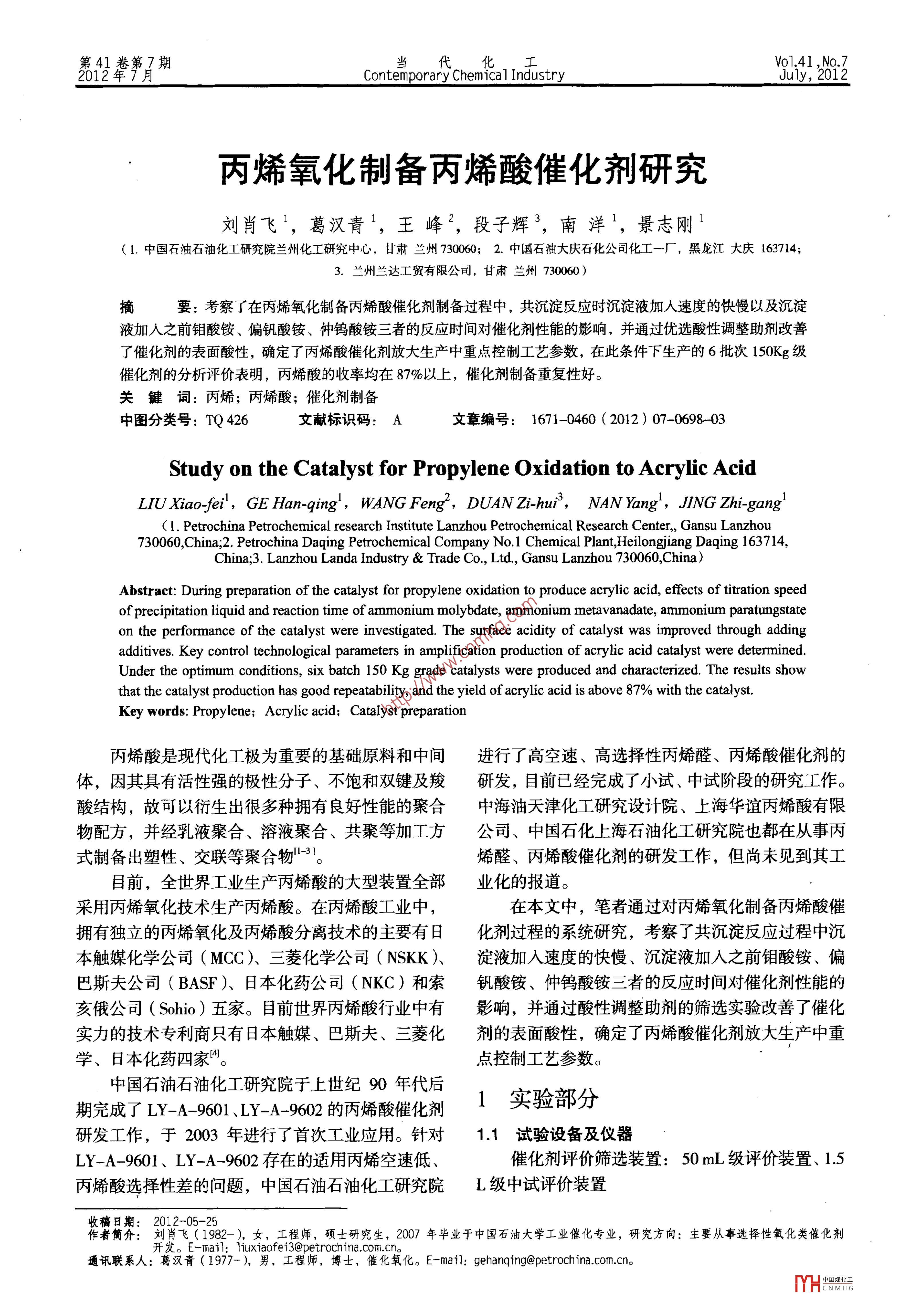 第41卷第7期當(dāng)代化工Vo1.41,No.7Contemporary Chemical IndustryJuly, 2012丙烯氧化制備丙烯酸催化劑研究劉肖飛,葛漢青,王峰,段子輝,南洋,景志剛1.中國石油石油化工研究院蘭州化工研究中心,甘肅蘭州73060;2.中國石油大慶石化公司化工一廠,黑龍江大慶163714;3.蘭州蘭達(dá)工貿(mào)有限公司,甘肅蘭州730060)摘要:考察了在丙烯氧化制備丙烯酸催化劑制備過程中,共沉淀反應(yīng)時沉淀液加入速度的快慢以及沉淀液加人之前鉬酸銨、偏釩酸銨、仲鎢酸銨三者的反應(yīng)時間對催化劑性能的影響,并通過優(yōu)選酸性調(diào)整助劑改善了催化劑的表面酸性,確定了丙烯酸催化劑放大生產(chǎn)中重點控制工藝參數(shù),在此條件下生產(chǎn)的6批次150Kg級催化劑的分析評價表明,丙烯酸的收率均在87%以上,催化劑制備重復(fù)性好。關(guān)犍詞:丙烯;丙烯酸;催化劑制備中圖分類號:TQ426文獻(xiàn)標(biāo)識碼:A文章編號:1671-0460(2012)07-069803Study on the Catalyst for Propylene Oxidation to Acrylic acidLIU Xiao-fei, GE Han-qing, WANG Feng", DUAN Zi-hui, NAN Yang, JING Zhi-gang(I Petrochina Petrochemical research Institute Lanzhou Petrochemical Research Center,, Gansu Lanzhou730060, China; 2. Petrochina Daqing Petrochemical Company No. 1 Chemical Plant, Heilongjiang Daqing 163714,China: 3. Lanzhou Landa Industry Trade Co, Ltd, Gansu Lanzhou 730060, ChinaAbstract: During preparation of the catalyst for propylene oxidation to produce acrylic acid, effects of titration speedof precipitation liquid and reaction time of ammonium molybdate, ammonium metavanadate, ammonium paratungstateon the performance of the catalyst were investigated. The sutface acidity of catalyst was improved through addingdditives. Key control technological parameters in amplification production of acrylic acid catalyst were determinedUnder the optimum conditions, six batch 150 Kg grade catalysts were produced and characterized. The results showthat the catalyst production has good repeatability, and the yield of acrylic acid is above 87% with the catalystKey words: Propylene; Acrylic acid; Catalyst preparation丙烯酸是現(xiàn)代化工極為重要的基礎(chǔ)原料和中間進(jìn)行了高空速、高選擇性丙烯醛、丙烯酸催化劑的體,因其具有活性強(qiáng)的極性分子、不飽和雙鍵及羧研發(fā),目前已經(jīng)完成了小試、中試階段的研究工作酸結(jié)構(gòu),故可以衍生出很多種擁有良好性能的聚合中海油天津化工研究設(shè)計院、上海華誼丙烯酸有限物配方,并經(jīng)乳液聚合、溶液聚合、共聚等加工方公司、中國石化上海石油化工研究院也都在從事丙式制備出塑性、交聯(lián)等聚合物-烯醛、丙烯酸催化劑的研發(fā)工作,但尚未見到其工目前,全世界工業(yè)生產(chǎn)丙烯酸的大型裝置全部業(yè)化的報道。采用丙烯氧化技術(shù)生產(chǎn)丙烯酸。在丙烯酸工業(yè)中,在本文中,筆者通過對丙烯氧化制備丙烯酸催擁有獨立的丙烯氧化及內(nèi)烯酸分離技術(shù)的主要有日化劑過程的系統(tǒng)研究,考察了共沉淀反應(yīng)過程中沉本觸媒化學(xué)公司(MC)、三菱化學(xué)公司(NSKK)、淀液加人速度的快慢、沉淀液加人之前鉬酸銨、偏巴斯夫公司(BASF)、日本化藥公司(NKC)和索釩酸銨、仲鎢酸銨三者的反應(yīng)時間對催化劑性能的亥俄公司(Sohi)五家。目前世界丙烯酸行業(yè)中有影響,并通過酸性調(diào)整助劑的篩選實驗改善了催化實力的技術(shù)專利商只有日夲觸媒、巴斯夫、三菱化劑的表面酸性,確定了丙烯酸催化劑放大生產(chǎn)中重學(xué)、日本化藥四家。點控制工藝參數(shù)。中國石油石油化工研究院于上世紀(jì)90年代后期完成了LXA901¥0的烯酸催化劑1實驗部分研發(fā)工作,于2003年進(jìn)行了首次工業(yè)應(yīng)用。針對試驗設(shè)備及儀器LY-A-9601、LY-A-9602存在的適用丙烯空速低催化劑評價篩選裝置:50mL級評價裝置、1.5丙烯酸選擇性差的問題,中國石油石油化工研究院L級中試評價裝置收稿日期:2012-05-25作者簡介:劉肖飛(1982-),女,工程師,碩士研究生,2007年畢業(yè)于中國石油大學(xué)工業(yè)催化專業(yè),研究方向:主要從事選擇性氧化類催化劑開發(fā)。E-mail:xiaofei3@ipetrocnina.com.cn.通訊聯(lián)系人:葛漢青(1977-),男,工程師,博士,催化氧化。E-mail:hanqing@petrochina.com.cn。THtVmIG第41卷第7期劉肖飛等:丙烯氧化制備兩烯酸催化劑研究699儀器:HP5890氣相色譜儀;瓦利安CP-3800加到8min時,丙烯酸的收率基本維持在88%以上,氣相色譜儀;島津GC-14C氣相色譜儀;HP6890當(dāng)?shù)渭訒r間為10min時,丙烯酸的收率為873%,氣相色譜儀略有下降,但幅度不大,表明滴加時間的變化對催12催化劑評價流程化劑的活性無明顯影響。丙烯氧化制備丙烯醛、丙烯酸反應(yīng)過程在列管AA式固定床反應(yīng)器中進(jìn)行,兩個反應(yīng)器串聯(lián)連接,內(nèi)995烯、空氣及水蒸氣計量后混合經(jīng)預(yù)熱進(jìn)入丙烯醛反應(yīng)器發(fā)生反應(yīng),生成的丙烯醛、丙烯酸及COx不經(jīng)分離直接進(jìn)入丙烯酸反應(yīng)器,生成的氧化產(chǎn)物丙烯97酸、乙酸、乙醛等經(jīng)過吸收獲取,不凝氣體COx等10經(jīng)計量后放空。961.3分析方法9510反應(yīng)產(chǎn)物主要有氣相產(chǎn)物和液相產(chǎn)物兩種。氣滴定時間/min相產(chǎn)物由氣相色譜法完成檢測,液相產(chǎn)物由氣相色圖1滴定時間對丙烯酸催化劑性能的影響譜法和化學(xué)分析法完成檢測。Fig 1 Effection of titration time on the perfor