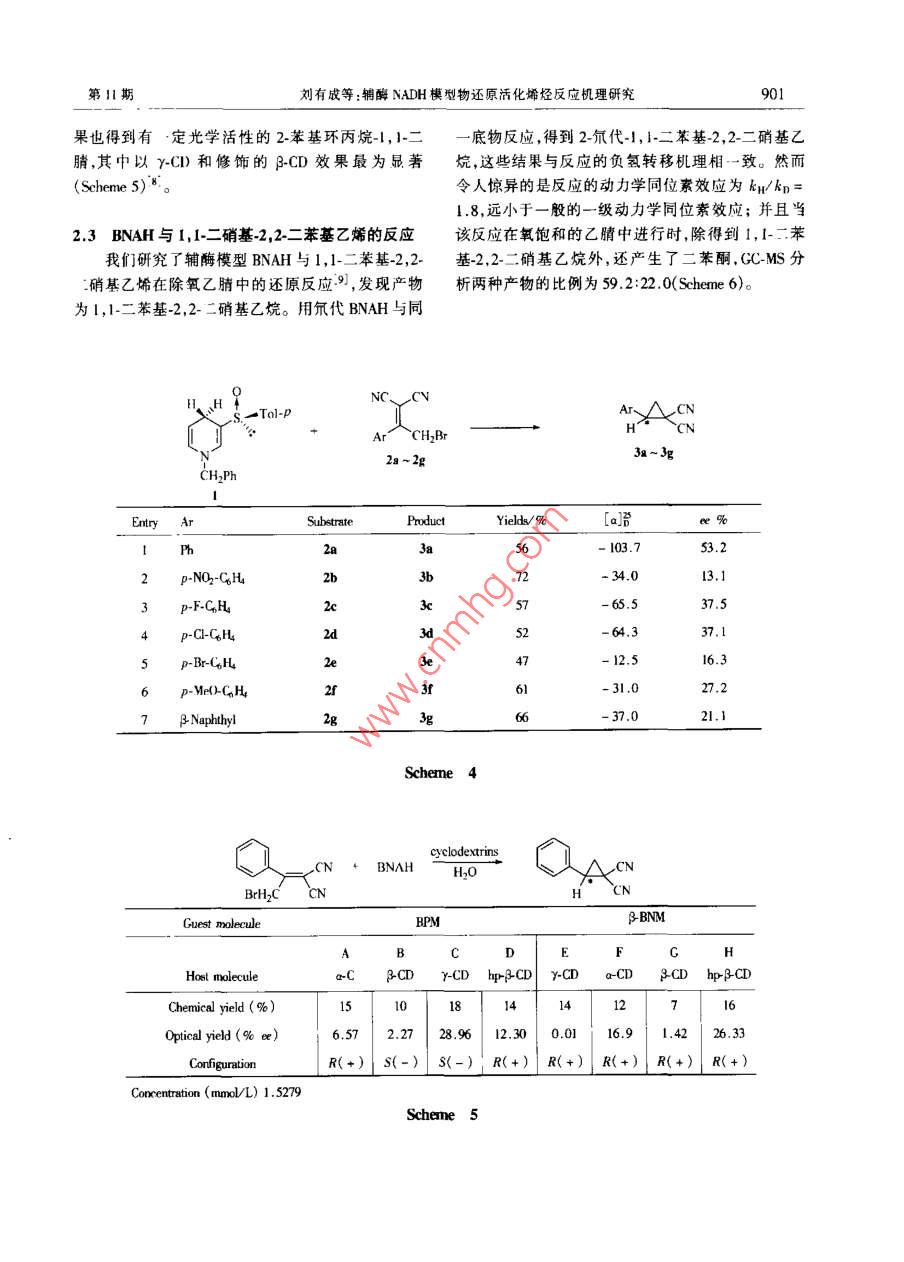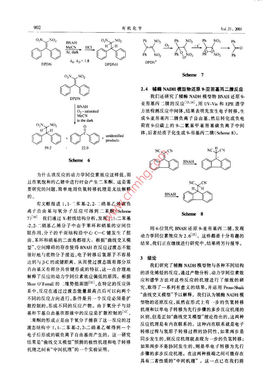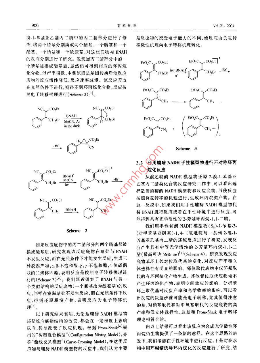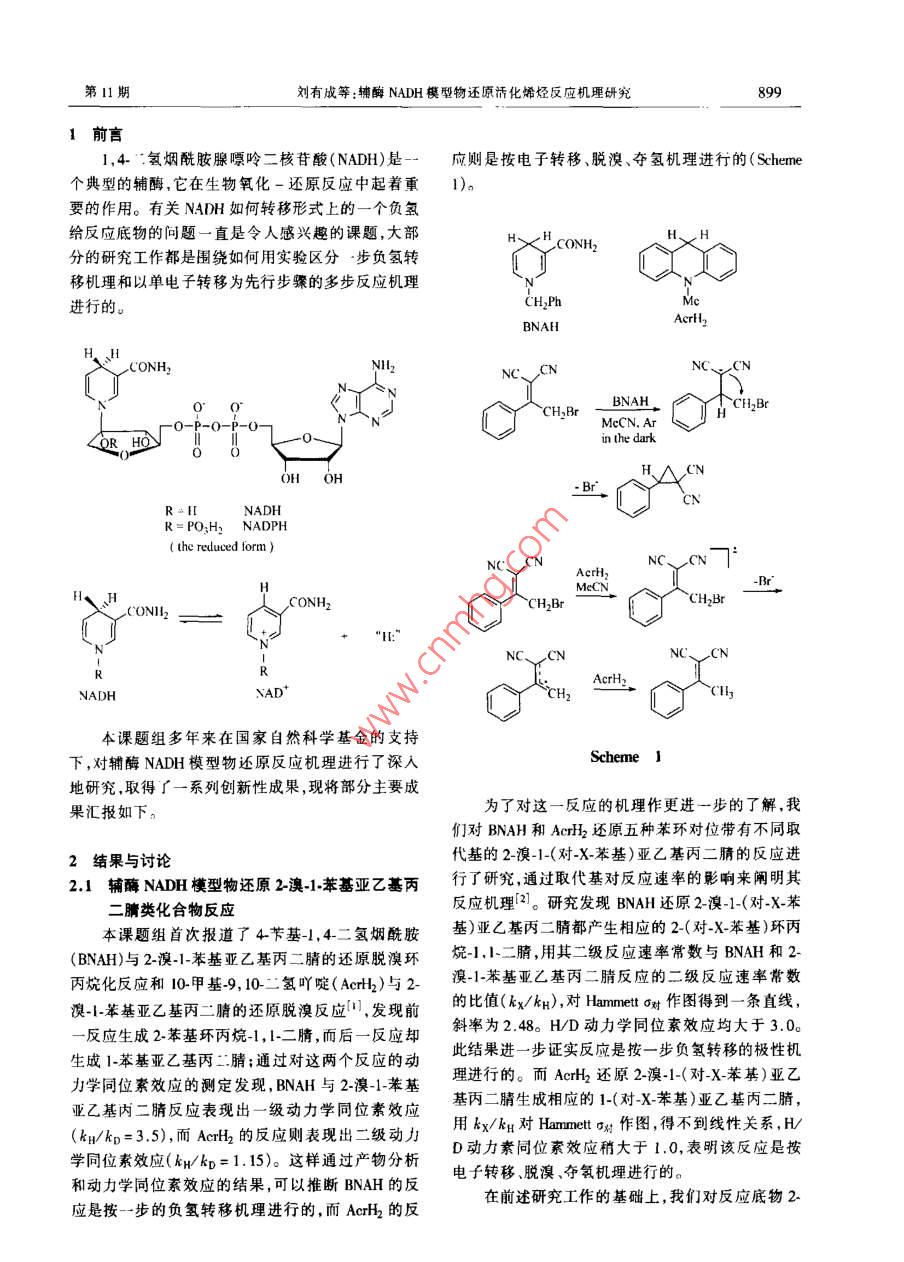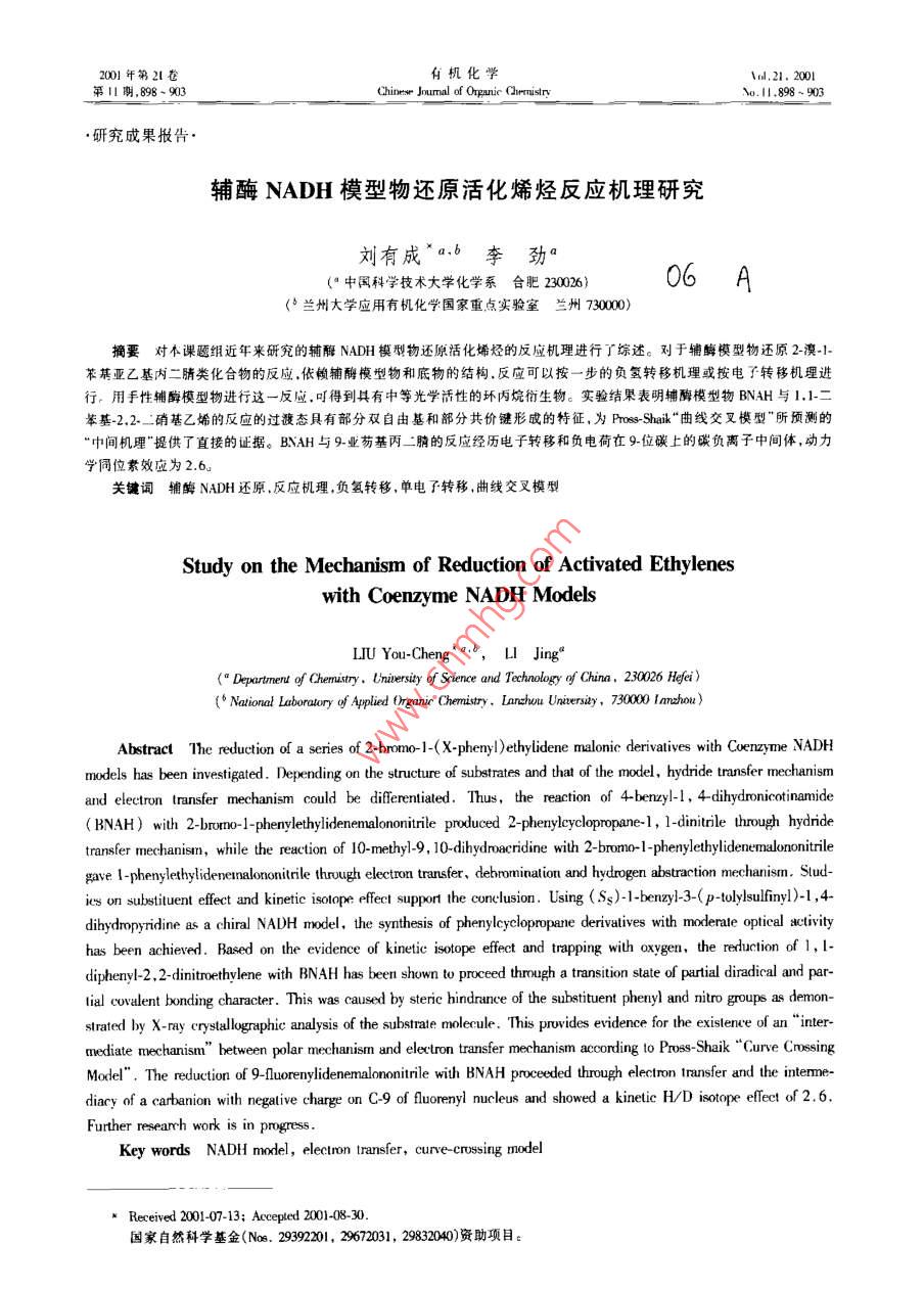 2001 年第21卷有機化學(xué)\ul.21. 2001第11期,898 ~ 903Chiner Joumal of Onpnic CarmistryNo. 1.898 ~ 903●研究成果報告.輔酶NADH模型物還原活化烯烴反應(yīng)機理研究劉有成"a.b李勁“("中國科學(xué)技術(shù)大學(xué)化學(xué)系合 肥230026)06 A(*蘭州大學(xué)應(yīng)用有機化學(xué)國家重點實驗室蘭州 730000)摘要對本課題組近年來研究的輔酶NADH模型物還原活化烯烴的反應(yīng)機理進(jìn)行了綜述。劉于鋪酶模型物還原2-澳小苯其亞乙基內(nèi)二腈類化合物的反應(yīng).依賴輔酶模型物和底物的結(jié)構(gòu),反應(yīng)可以按一步的負(fù)氫轉(zhuǎn)移機理或按電了轉(zhuǎn)移機理進(jìn)行。用手性輔酶模型物進(jìn)行這一反應(yīng).叮得到其有中等光學(xué)活性的環(huán)丙烷銜生物。實驗結(jié)果表明輔酶模型物BNAH與1.1二舉基-2.2-二硝基乙烯的反應(yīng)的過渡態(tài)具有部分雙自由基和部分共價鍵形成的特征,為Pross Shaik“曲線交叉模型"所預(yù)測的“中間機理"提供了直接的證據(jù)。BNAH與9-業(yè)芴基丙-二腈的反應(yīng)經(jīng)歷電子轉(zhuǎn)移和負(fù)電荷在9-位碳上的碳負(fù)離子中間體,動力學(xué)同位素效應(yīng)為2.6。關(guān)鍵詞輔酶 NADH還原,反應(yīng)機理,負(fù)氫轉(zhuǎn)移,單電子轉(zhuǎn)移.曲線交叉模型Study on the Mechanism of Reduction of Activated Ethyleneswith Coenzyme NADH ModelsLIU You-Cheng"aib,L Jing"(° Departmert of Chenaitry. Uniresity of Srience and Technology of China, 230026 Hegfei)(“National Laboratory of Aplied Organir Chemstry. Lanzhuu Unirerity ,730000 Imnzhou)Abstract The reduction of a series of 2-bromo- 1-(X-pheny!)ethylidene malonic derivatives with Coenzyme NADHmodels has been investigated. Depending on the structure of substrates and that of the model, hydride transfer mechanismand electron transfer mechanism could be diferentated. Thus, the reaction of 4-benzyl-I ,4-dihydronicotinamide( BNAH) with 2-brurno-l-phenyethylidenemalononitrile produced 2-penylcyclopropane-l, l-dinitrile through hydnidetransfer mechanism, while the reaction of 10-methyl-9, 1-dihydracridine with 2-bromo-1-phenylethylidenemalonontilegave I-phenyletbylidenenalontrle through electon transfer, debromination and hydrogen abstaction mechanism. Sudics on substiuent efet and kinetic isotope ef suppor the eunclusion. Using (5S)-benzy)-3-( polyul6iny)-1,4,dihydropyridine as a chiral NADH model, the synthesis of phenylcyclopropane derivatives with moderate optical activityhas been achieved. Based on the evidence of kinetic isotope ef.et and tapping with oxygen, the reduction of 1,1dipheny-2.2-dinitoethylene with BNAH has been shown to proceed through a transition state of partial diradical and par-tial covalent bonding character. This was caused by sterie hindrance of the subtuent phenyl and mitro groups as demon-strated by X-ray srstalogaphic analysis of the subtrate molecule. This provides eridence for the existenve of an' *inter-mediate mechanism”between polar mechanism and electron transter mechanism acording to Pros Shaik“Curve CrossingModel" . The reduction of 9-flurenylideneralonnitrile with BNAH proceeded through electron lransfer and the intermne-diacy of a carbanion with negative charge on C-9 of fluorenyl nucleus and showed a kinetie H/D istope efet of2.6.Further researh work is in progress.Key words NADH model, electron lransfer, curve crossing model■Received 2001-07-13; Aceped 2001-08-30.國家自然科學(xué)基金(Nos.29392201, 29672031, 29832040)資 助項目。.第11期劉有成等:輔酶NADH模型物還原活化烯烴反應(yīng)機理研究1前言1,4-”“氫煙酰胺腺嘌呤二核背酸(NADH)是--應(yīng)則是按電子轉(zhuǎn)移、脫溴、奪氫機理進(jìn)行的(Scheme個典型的輔酶,它在生物氧化-還原反應(yīng)中起著重1)。要的作用。有關(guān)NADH如何轉(zhuǎn)移形式上的一一個負(fù)氫給反應(yīng)底物的問題-直是令人感興趣的課題,大部Hy