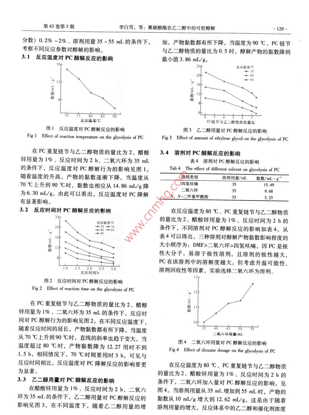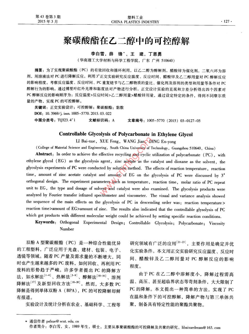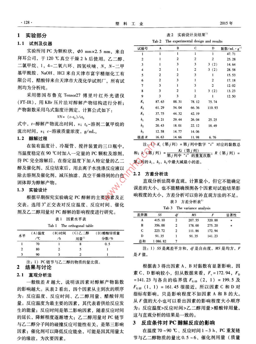 第43卷第3期塑料工業(yè)2015年3月CHINA PLASTICS INDUSTRY127聚碳酸酯在乙二醇中的可控醇解李白雪,薛鋒,王建,丁恩勇(華南理工大學(xué)材料與科學(xué)工程學(xué)院,廣東廣州510640摘要:為了實(shí)現(xiàn)聚碳酸酯(PC)的有效回收和循環(huán)利用,以乙二醇為醇解劑,醋酸鋅為催化劑,二氧六環(huán)為溶劑,用溶液法對(duì)PC進(jìn)行降解反應(yīng)。利用3‘正交實(shí)驗(yàn)研究反應(yīng)溫度、反應(yīng)時(shí)間、醋酸鋅及乙二醇用量對(duì)PC醇解反應(yīng)的影響程度??疾旆磻?yīng)溫度、反應(yīng)時(shí)間、PC重復(fù)鏈節(jié)與乙二醇物質(zhì)的量比、催化劑及溶劑的類型和用量等條件對(duì)PC醇解行為的影響。通過(guò)傅里葉紅外光滑和黏度法對(duì)產(chǎn)物進(jìn)行分析。正交設(shè)計(jì)實(shí)驗(yàn)的直觀和方差分析得出四個(gè)因素對(duì)PC醇解反應(yīng)的影響順序?yàn)?反應(yīng)溫度>反應(yīng)時(shí)間>乙二醇用量>醋酸鋅用量,通過(guò)設(shè)定特定的條件,得到不同摩爾質(zhì)量的產(chǎn)物,實(shí)現(xiàn)PC的可控醇解。關(guān)鍵詞:正交實(shí)驗(yàn)設(shè)計(jì);可控醇解;聚碳酸酯;黏數(shù)DOI:10.3969/i.isn.1005-5770.2015.03.022中圖分類號(hào):TQ323.41文獻(xiàn)標(biāo)識(shí)碼:A文章編號(hào):1005-5770(2015)03-0127-05Controllable Glycolysis of Polycarbonate in Ethylene GlycolLI Bai-xue, XUE Feng, WANG Jian, DING En-yongCollege of Material Science and Engineering, South China University of Technology, Guangzhou 510640, China)Abstract: In order to achieve the effective recycling and cyclic utilization of polycarbonate(PC),withethylene glycol (EG)as the glycolysis agent, zinc acetate as the catalyst and dioxane as the solvent, theglycolysis experiments of PC were conducted by solution method. The effects of reaction temperature, reactiontime, amount of zinc acetate catalyst and amount of EG on the glycolysis of PC were discussed by 3orthogonal design. The experiment parameters such as temperature, reaction time, molar ratio of PC repeatunit to EG, the type and dosage of solvent and catalyst were also examined. The glycolysis products wereanalyzed by Fourier transfer infrared spectrometer and viscometer. The visual and variance analysis showedthe sequence of the main effects on the glycolysis of PC in descending order was: reaction temperature>reaction time>amount of EG>amount of zine. The results also indicated that the controllable glysolysis of PCwhich got products with different molecular weight could be achieved by setting specific reaction conditionsKeywords: Orthogonal Experimental Design; Controllable Glycolysis; Polycarbonate; ViscosityNumber雙酚A型聚碳酸酯(PC)是一種綜合性能優(yōu)異研究領(lǐng)域有廣泛的應(yīng)用21-3,主要作用是確定并優(yōu)的工程塑料,廣泛應(yīng)用于光盤、建材、包裝、電子化實(shí)驗(yàn)條件。本文用正交實(shí)驗(yàn)研究反應(yīng)溫度、反應(yīng)時(shí)透鏡等領(lǐng)域。隨著PC產(chǎn)量及需求量的不斷增大,同間、醋酸鋅及乙二醇用量對(duì)PC醇解反應(yīng)的影響時(shí)也產(chǎn)生越來(lái)越多的PC廢料,如何回收、再利用PC程度。廢料的形勢(shì)趨于嚴(yán)峻。許多學(xué)者提出PC的降解方法,如水解法4、熱解法9、醇解法01、溶劑由于PC在乙二醇中溶解度小,降解過(guò)程需高降解法及新型回收方法。然而,大多數(shù)PC溫、高壓、甚至超臨界狀態(tài)等苛刻條件,大大限制了降解是得到單體雙酚A(BPA),PC的可控降解卻鮮PC的降解。本文提出一種簡(jiǎn)單的方法,實(shí)現(xiàn)了PC有報(bào)道。在溫和條件下的可控醇解,降解產(chǎn)物與第三單體共實(shí)驗(yàn)設(shè)計(jì)及統(tǒng)計(jì)分析在農(nóng)業(yè)、基礎(chǔ)科學(xué)、工程等聚,制備具有特定性能的聚酯共聚物。*通信作者psfe@scut.edu.cn作者簡(jiǎn)介:李白雪,女,1989年生,碩士,主要從事聚碳酸酯的可控降解及共聚的研究。libaixuedream@163.com128塑料工業(yè)2015年1實(shí)驗(yàn)部分表2實(shí)驗(yàn)設(shè)計(jì)及結(jié)果1.1試劑及儀器Tab 2 The experimental design and results實(shí)驗(yàn)所用PC為顆粒狀,Φ3mm×2.5mm,來(lái)自試驗(yàn)號(hào)D黏數(shù)/m:8拜耳公司,于120℃真空干燥2h后使用。乙二醇二氯甲烷、1,4-二氧六環(huán)、四氫呋喃、N,N-二甲基甲酰胺、NaOH、HCl來(lái)自天津市富宇精細(xì)化工有限公司,醋酸鋅來(lái)自天津市大茂化學(xué)試劑廠,所有試234567231123231328.515.5317.18劑均為分析純。22333(2)13.23采用德國(guó)布魯克 Tensor7傅里葉紅外光譜儀(FTR),用KBr壓片法對(duì)醇解產(chǎn)物結(jié)構(gòu)進(jìn)行分析87.6388.3178,1275.74產(chǎn)物黏數(shù)采用烏式黏度計(jì)測(cè)定,計(jì)算公式如下VN=(t-to)/ctoKKK29.2129.4426.0425,25式中,-醇解產(chǎn)物流出時(shí)間,s;to-溶劑二氯甲烷的18.0l22.1218.49流出時(shí)間,s;c-溶液質(zhì)量濃度,g/mL。2.5814.7714.061.2醇解過(guò)程極差R16.6314661.986在裝有溫度計(jì)、冷凝管、攪拌裝置的三口瓶中,注:1)K(第j列)=第j列中數(shù)字“i”對(duì)應(yīng)的黏數(shù)總當(dāng)溫度穩(wěn)定在90℃時(shí)加入一定量的PC顆粒及溶劑,和;k(第j列)K(第j列的重復(fù)次數(shù):R(第j列)=待PC完全溶解后,在指定溫度下加入特定量的乙二第j列的k1,k2,k中最大減最小的差。醇及催化劑,反應(yīng)結(jié)束后,用去離子水洗滌反應(yīng)液以除去溶劑及催化劑,減壓抽濾、真空干燥得到的白色22方差分析法固體即為醇解產(chǎn)物。直觀分析法簡(jiǎn)單