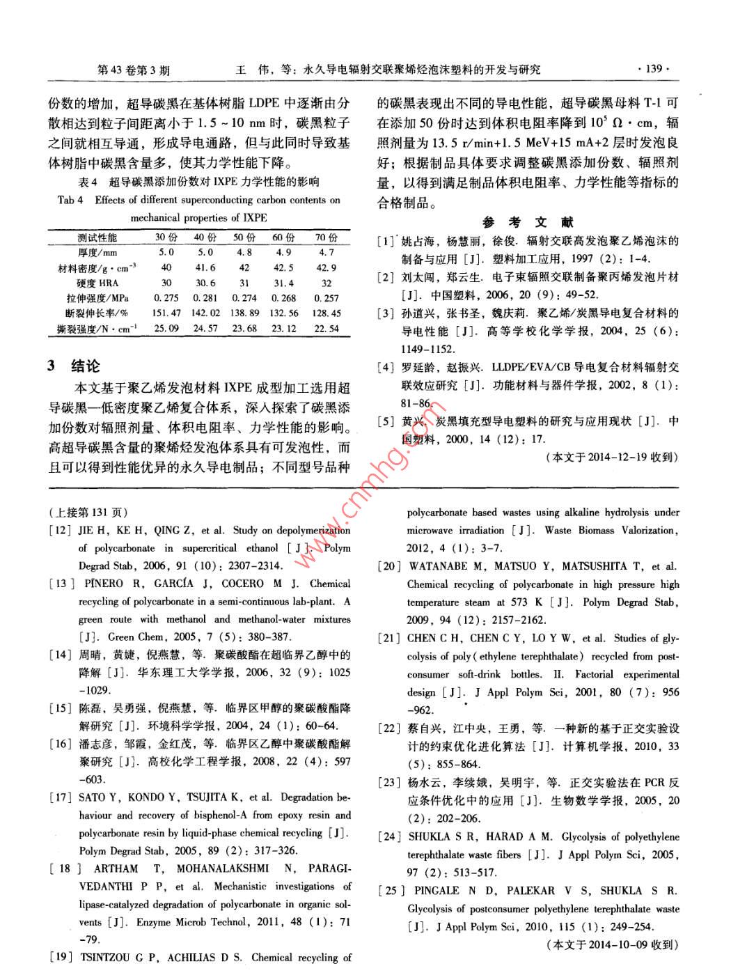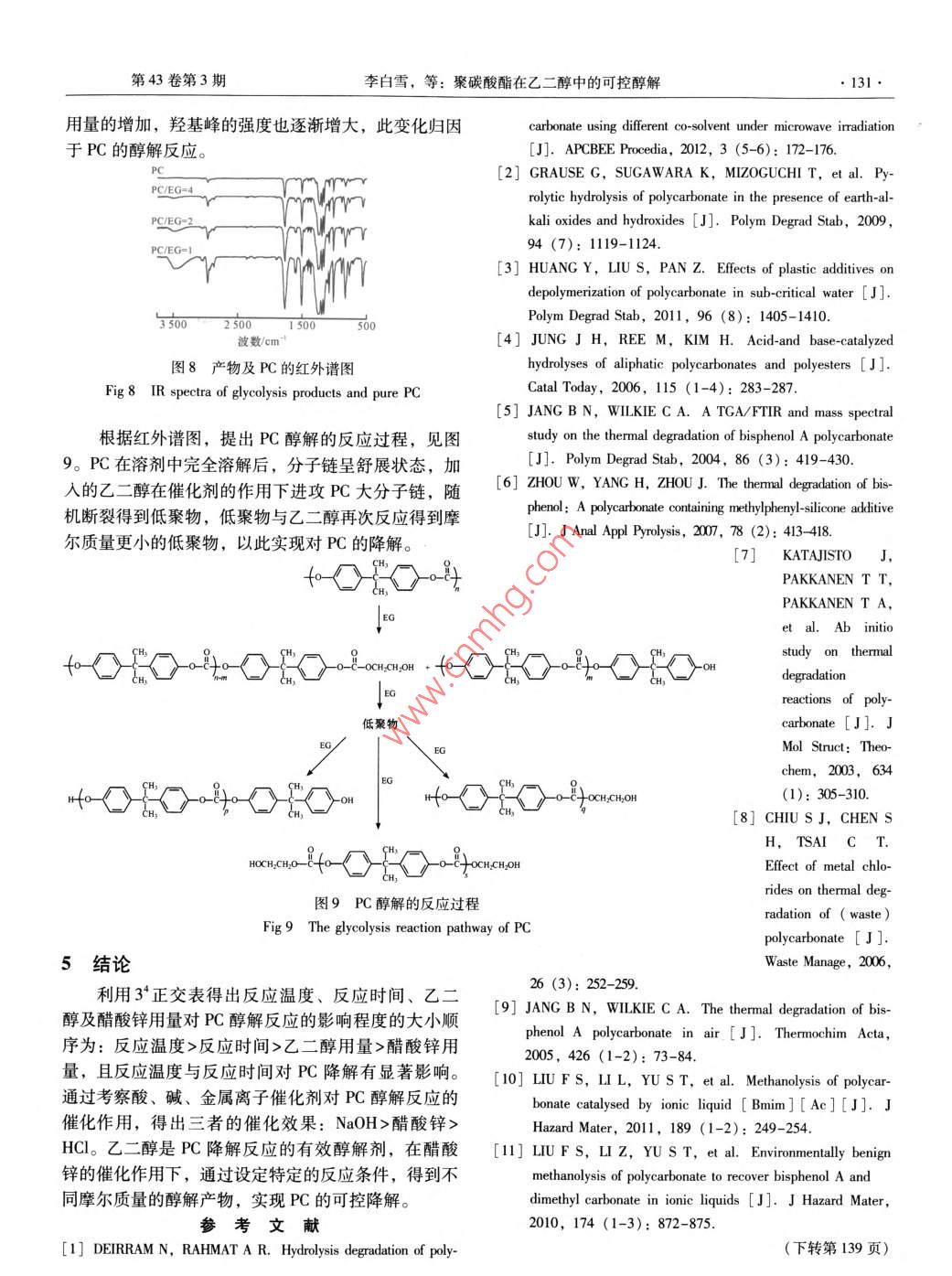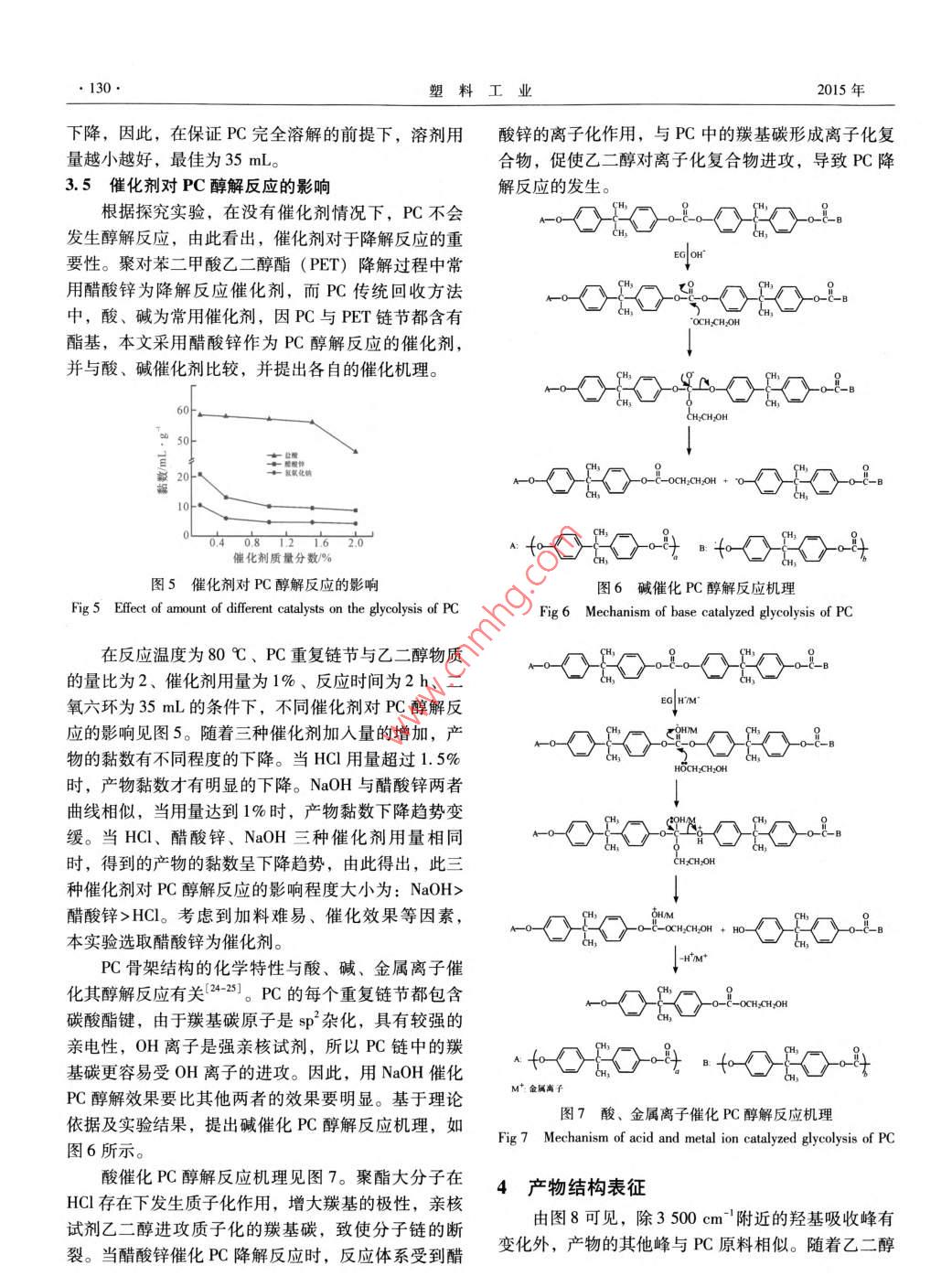第43卷第3期塑料工業(yè)2015年3月CHINA PLASTICS INDUSTRY127聚碳酸酯在乙二醇中的可控醇解李白雪,薛鋒,王建,丁恩勇(華南理工大學(xué)材料與科學(xué)工程學(xué)院,廣東廣州510640摘要:為了實(shí)現(xiàn)聚碳酸酯(PC)的有效回收和循環(huán)利用,以乙二醇為醇解劑,醋酸鋅為催化劑,二氧六環(huán)為溶劑,用溶液法對(duì)PC進(jìn)行降解反應(yīng)。利用3‘正交實(shí)驗(yàn)研究反應(yīng)溫度、反應(yīng)時(shí)間、醋酸鋅及乙二醇用量對(duì)PC醇解反應(yīng)的影響程度??疾旆磻?yīng)溫度、反應(yīng)時(shí)間、PC重復(fù)鏈節(jié)與乙二醇物質(zhì)的量比、催化劑及溶劑的類型和用量等條件對(duì)PC醇解行為的影響。通過(guò)傅里葉紅外光滑和黏度法對(duì)產(chǎn)物進(jìn)行分析。正交設(shè)計(jì)實(shí)驗(yàn)的直觀和方差分析得出四個(gè)因素對(duì)PC醇解反應(yīng)的影響順序?yàn)?反應(yīng)溫度>反應(yīng)時(shí)間>乙二醇用量>醋酸鋅用量,通過(guò)設(shè)定特定的條件,得到不同摩爾質(zhì)量的產(chǎn)物,實(shí)現(xiàn)PC的可控醇解。關(guān)鍵詞:正交實(shí)驗(yàn)設(shè)計(jì);可控醇解;聚碳酸酯;黏數(shù)DOI:10.3969/i.isn.1005-5770.2015.03.022中圖分類號(hào):TQ323.41文獻(xiàn)標(biāo)識(shí)碼:A文章編號(hào):1005-5770(2015)03-0127-05Controllable Glycolysis of Polycarbonate in Ethylene GlycolLI Bai-xue, XUE Feng, WANG Jian, DING En-yongCollege of Material Science and Engineering, South China University of Technology, Guangzhou 510640, China)Abstract: In order to achieve the effective recycling and cyclic utilization of polycarbonate(PC),withethylene glycol (EG)as the glycolysis agent, zinc acetate as the catalyst and dioxane as the solvent, theglycolysis experiments of PC were conducted by solution method. The effects of reaction temperature, reactiontime, amount of zinc acetate catalyst and amount of EG on the glycolysis of PC were discussed by 3orthogonal design. The experiment parameters such as temperature, reaction time, molar ratio of PC repeatunit to EG, the type and dosage of solvent and catalyst were also examined. The glycolysis products wereanalyzed by Fourier transfer infrared spectrometer and viscometer. The visual and variance analysis showedthe sequence of the main effects on the glycolysis of PC in descending order was: reaction temperature>reaction time>amount of EG>amount of zine. The results also indicated that the controllable glysolysis of PCwhich got products with different molecular weight could be achieved by setting specific reaction conditionsKeywords: Orthogonal Experimental Design; Controllable Glycolysis; Polycarbonate; ViscosityNumber雙酚A型聚碳酸酯(PC)是一種綜合性能優(yōu)異研究領(lǐng)域有廣泛的應(yīng)用21-3,主要作用是確定并優(yōu)的工程塑料,廣泛應(yīng)用于光盤、建材、包裝、電子化實(shí)驗(yàn)條件。本文用正交實(shí)驗(yàn)研究反應(yīng)溫度、反應(yīng)時(shí)透鏡等領(lǐng)域。隨著PC產(chǎn)量及需求量的不斷增大,同間、醋酸鋅及乙二醇用量對(duì)PC醇解反應(yīng)的影響時(shí)也產(chǎn)生越來(lái)越多的PC廢料,如何回收、再利用PC程度。廢料的形勢(shì)趨于嚴(yán)峻。許多學(xué)者提出PC的降解方法,如水解法4、熱解法9、醇解法01、溶劑由于PC在乙二醇中溶解度小,降解過(guò)程需高降解法及新型回收方法。然而,大多數(shù)PC溫、高壓、甚至超臨界狀態(tài)等苛刻條件,大大限制了降解是得到單體雙酚A(BPA),PC的可控降解卻鮮PC的降解。本文提出一種簡(jiǎn)單的方法,實(shí)現(xiàn)了PC有報(bào)道。在溫和條件下的可控醇解,降解產(chǎn)物與第三單體共實(shí)驗(yàn)設(shè)計(jì)及統(tǒng)計(jì)分析在農(nóng)業(yè)、基礎(chǔ)科學(xué)、工程等聚,制備具有特定性能的聚酯共聚物。*通信作者psfe@scut.edu.cn作者簡(jiǎn)介:李白雪,女,1989年生,碩士,主要從事聚碳酸酯的可控降解及共聚的研究。libaixuedream@163.com128塑料工業(yè)2015年1實(shí)驗(yàn)部分表2實(shí)驗(yàn)設(shè)計(jì)及結(jié)果1.1試劑及儀器Tab 2 The experimental design and results實(shí)驗(yàn)所用PC為顆粒狀,Φ3mm×2.5mm,來(lái)自試驗(yàn)號(hào)D黏數(shù)/m:8拜耳公司,于120℃真空干燥2h后使用。乙二醇二氯甲烷、1,4-二氧六環(huán)、四氫呋喃、N,N-二甲基甲酰胺、NaOH、HCl來(lái)自天津市富宇精細(xì)化工有限公司,醋酸鋅來(lái)自天津市大茂化學(xué)試劑廠,所有試234567231123231328.515.5317.18劑均為分析純。22333(2)13.23采用德國(guó)布魯克 Tensor7傅里葉紅外光譜儀(FTR),用KBr壓片法對(duì)醇解產(chǎn)物結(jié)構(gòu)進(jìn)行分析87.6388.3178,1275.74產(chǎn)物黏數(shù)采用烏式黏度計(jì)測(cè)定,計(jì)算公式如下VN=(t-to)/ctoKKK29.2129.4426.0425,25式中,-醇解產(chǎn)物流出時(shí)間,s;to-溶劑二氯甲烷的18.0l22.1218.49流出時(shí)間,s;c-溶液質(zhì)量濃度,g/mL。2.5814.7714.061.2醇解過(guò)程極差R16.6314661.986在裝有溫度計(jì)、冷凝管、攪拌裝置的三口瓶中,注:1)K(第j列)=第j列中數(shù)字“i”對(duì)應(yīng)的黏數(shù)總當(dāng)溫度穩(wěn)定在90℃時(shí)加入一定量的PC顆粒及溶劑,和;k(第j列)K(第j列的重復(fù)次數(shù):R(第j列)=待PC完全溶解后,在指定溫度下加入特定量的乙二第j列的k1,k2,k中最大減最小的差。醇及催化劑,反應(yīng)結(jié)束后,用去離子水洗滌反應(yīng)液以除去溶劑及催化劑,減壓抽濾、真空干燥得到的白色22方差分析法固體即為醇解產(chǎn)物。直觀分析法簡(jiǎn)單