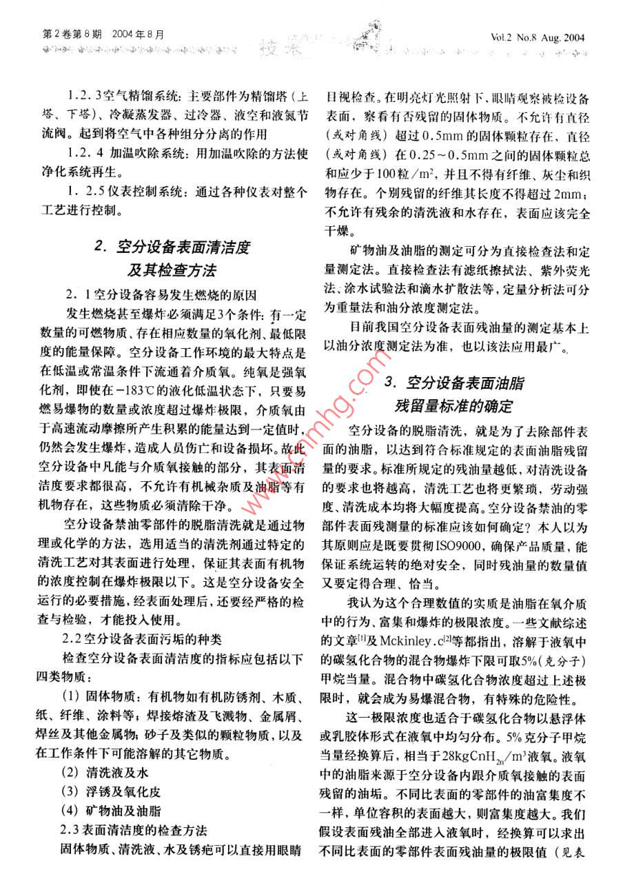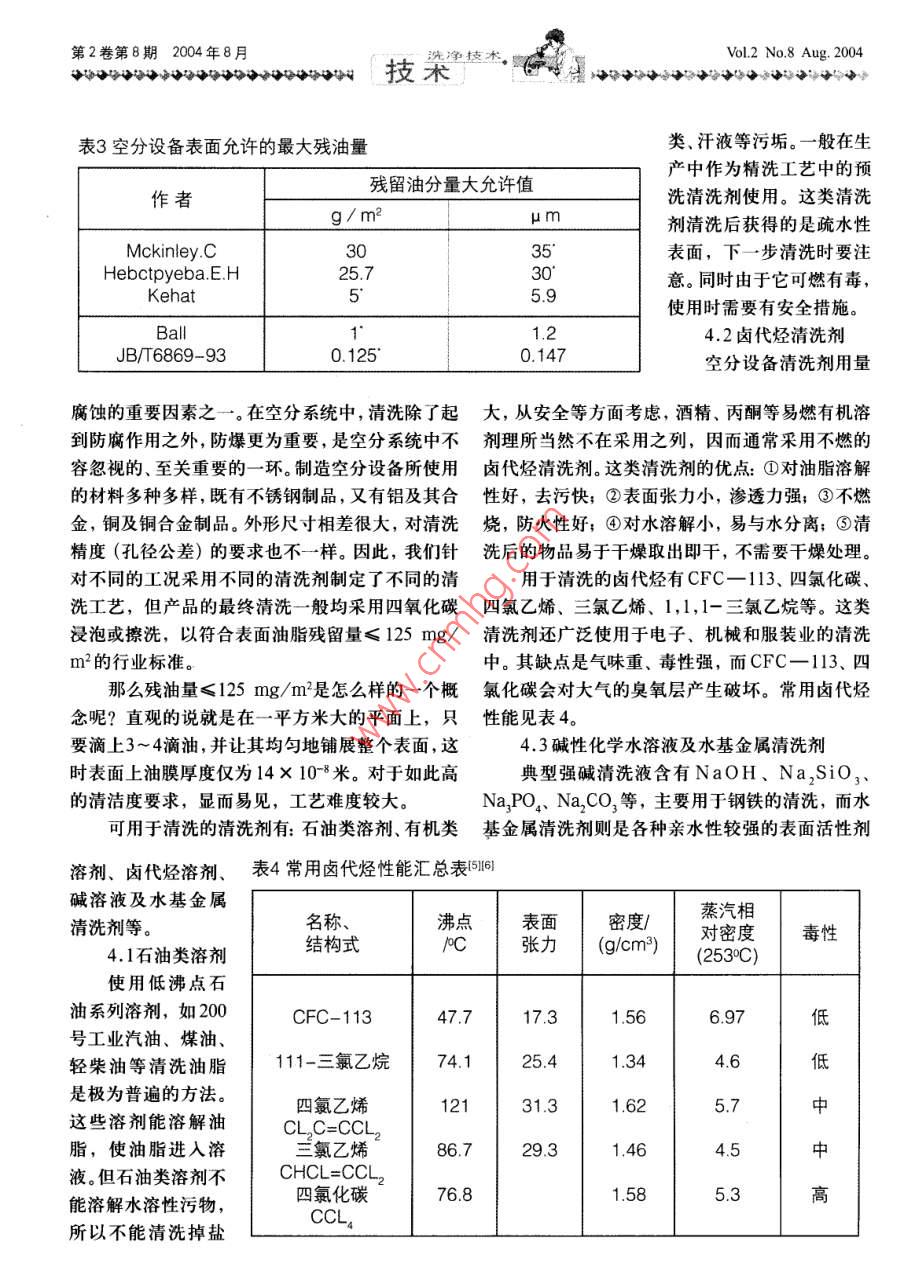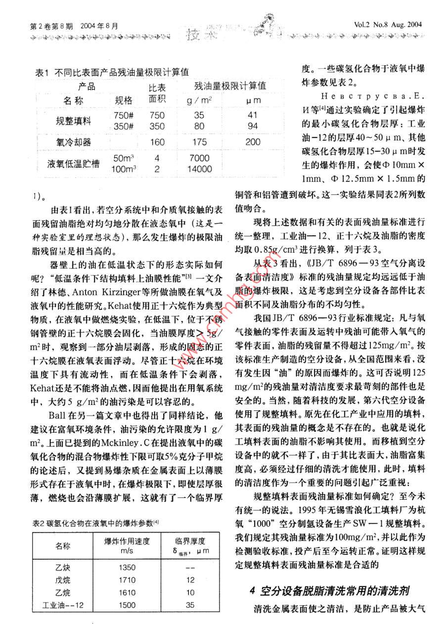VoL 2 No 8 Aug 2004心《技術(shù)·技術(shù)交流》簡(jiǎn)介責(zé)任編輯:梁治齊通過(guò)對(duì)清洗技術(shù)的深入交流與探討,進(jìn)一步加強(qiáng)電話:010-64398822-8021科研與實(shí)踐的密切合作,從而促進(jìn)我國(guó)清洗行業(yè)健康傳真:010-64399585快速的發(fā)展。E-mail:editor@ccetca.com來(lái)稿要求liangzq@ccetca.com文章內(nèi)容以技術(shù)為核心,突出其實(shí)踐性和可操作性,并具有嚴(yán)密的科學(xué)理論依據(jù)和較強(qiáng)的行業(yè)針對(duì)性??辗衷O(shè)備的清洗盤(pán)郁杭州杭氧科技股份有限公司浙江31000)摘要文章介紹了空分設(shè)備及其性能特點(diǎn),空分設(shè)備的工藝流程,空分設(shè)備表面清潔度及其檢查方法,指出通過(guò)清洗降低空分設(shè)備表面油脂的殘留量對(duì)保障空分設(shè)備性能的正常發(fā)揮有著重要意義,過(guò)去通常采用四氯化碳作清洗劑,文章研究了在淘汰0DS新形勢(shì)下可采用的清洗劑和清洗技術(shù),介紹了在這方面取得的成果和經(jīng)驗(yàn)。關(guān)鍵詞空分設(shè)備污垢油脂四氟化碳替代清洗劑中圖分類號(hào)TH48文獻(xiàn)標(biāo)識(shí)碼A文章編號(hào)1672-2248(2004)08-0013-061、空分設(shè)備及其性能特點(diǎn)裝置。但就基本流程而言,主要有四種,即高壓1.1空分設(shè)備中壓、高低壓和全低壓流程。我國(guó)空分設(shè)備的生產(chǎn)空分設(shè)備就是以空氣為原料,通過(guò)壓縮循環(huán)規(guī)模已經(jīng)從早期只能生產(chǎn)20m/h(氧)的制氧機(jī)深度冷凍的方法把空氣變成液態(tài),再經(jīng)過(guò)精餾而發(fā)展到現(xiàn)在具有生產(chǎn)20000n0h、3000n3h從液態(tài)空氣中逐步分離生產(chǎn)出氧氣、氮?dú)饧皻鍤夂?0000h(氧)的特大型空分設(shè)備的能力。等惰性氣體的設(shè)備。1.2空分設(shè)備的基本系統(tǒng):目前我國(guó)生產(chǎn)的空分設(shè)備的形式、種類繁多空分設(shè)備從工藝流程來(lái)說(shuō)可以分為5個(gè)基本有生產(chǎn)氣態(tài)氧、氮的裝置,也有生產(chǎn)液態(tài)氧、氮的系統(tǒng):1.2.1雜質(zhì)的凈化系統(tǒng):主要是通過(guò)空氣過(guò)濾器和分子篩吸收器等裝置,凈化空氣中混有的收稿日期2004-7-9機(jī)械雜質(zhì)、水分、二氧化碳、乙炔等許郁蒼(1940-).男.浙江溫州人,1962年畢業(yè)于復(fù)旦大學(xué)化1.2.2空氣冷卻和液化系統(tǒng):主要由空氣壓學(xué)系1902-1902年在中科院上海冶金研究所工作192年后在杭州縮機(jī)、熱交換器、膨脹機(jī)和空氣節(jié)流閥等組成,起杭氧集團(tuán)工作。高級(jí)工程師,主要從事防腐及表面工程處理工藝研到使空氣深度冷凍的作用。第2卷第8期2004年8月VoL 2 No, 8 Aug 20041.2.3空氣精餾系統(tǒng):主要部件為精餾塔(上目視檢査。在明亮燈光照射下眼睛觀察被檢設(shè)備塔、下塔)、冷凝蒸發(fā)器、過(guò)冷器、液空和液氮節(jié)表面,察看有否殘留的固體物質(zhì)。不允許有直徑流閥。起到將空氣中各種組分分離的作用(或?qū)蔷€)超過(guò)0.5mm的固體顆粒存在,直徑1.2.4加溫吹除系統(tǒng):用加溫吹除的方法使(或?qū)蔷€)在0.25~0.5mm之間的固體顆??們艋到y(tǒng)再生。和應(yīng)少于100粒/m2,并且不得有纖維、灰塵和織1.2.5儀表控制系統(tǒng):通過(guò)各種儀表對(duì)整個(gè)物存在。個(gè)別殘留的纖維其長(zhǎng)度不得超過(guò)2mm;工藝進(jìn)行控制不允許有殘余的清洗液和水存在,表面應(yīng)該完全干燥。2.空分設(shè)備表面清潔度礦物油及油脂的測(cè)定可分為直接檢查法和定及其檢查方法量測(cè)定法。直接檢査法有濾紙擦拭法、紫外熒光2.1空分設(shè)備容易發(fā)生燃燒的原因法涂水試驗(yàn)法和滴水?dāng)U散法等,定量分析法可分發(fā)生燃燒甚至爆炸必須滿足3個(gè)條性有一定為重量法和油分濃度測(cè)定法。數(shù)量的可燃物質(zhì)、存在相應(yīng)數(shù)量的氧化劑、最低限目前我國(guó)空分設(shè)備表面殘油量的測(cè)定基本上度的能量保障。空分設(shè)備工作環(huán)境的最大特點(diǎn)是以油分濃度測(cè)定法為準(zhǔn),也以該法應(yīng)用最廣在低溫或常溫條件下流通著介質(zhì)氧。純氧是強(qiáng)氧化劑,即使在-183℃的液化低溫狀態(tài)下,只要易3.空分設(shè)備表面油脂燃易爆物的數(shù)量或濃度超過(guò)爆炸極限,介質(zhì)氧由殘留量標(biāo)準(zhǔn)的確定于高速流動(dòng)摩擦所產(chǎn)生積累的能量達(dá)到一定值時(shí),空分設(shè)備的脫脂清洗,就是為了去除部件表仍然會(huì)發(fā)生爆炸,造成人員傷亡和設(shè)備損壞。故此面的油脂,以達(dá)到符合標(biāo)準(zhǔn)規(guī)定的表面油脂殘留空分設(shè)備中凡能與介質(zhì)氧接觸的部分,其表面清量的要求。標(biāo)準(zhǔn)所規(guī)定的殘油量越低,對(duì)清洗設(shè)備潔度要求都很高,不允許有機(jī)械雜質(zhì)及油脂等有的要求也將越高,清洗工藝也將更繁瑣,勞動(dòng)強(qiáng)機(jī)物存在,這些物質(zhì)必須清除干凈度、清洗成本均將大幅度提高??辗衷O(shè)備禁油的零空分設(shè)備禁油零部件的脫脂清洗就是通過(guò)物部件表面殘測(cè)量的標(biāo)準(zhǔn)應(yīng)該如何確定?本人以為理或化學(xué)的方法,選用適當(dāng)?shù)那逑磩┩ㄟ^(guò)特定的其原則應(yīng)是既要貫徹IS0900,確保產(chǎn)品質(zhì)量,能清洗工藝對(duì)其表