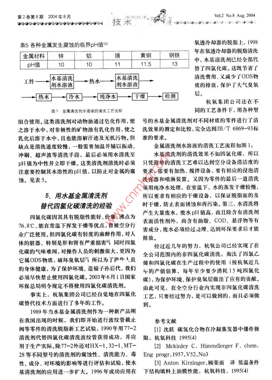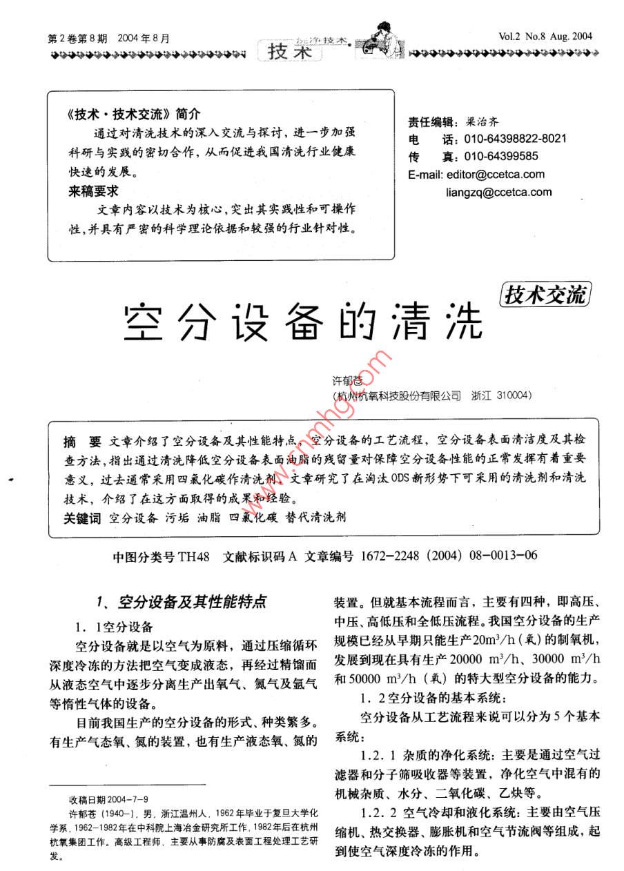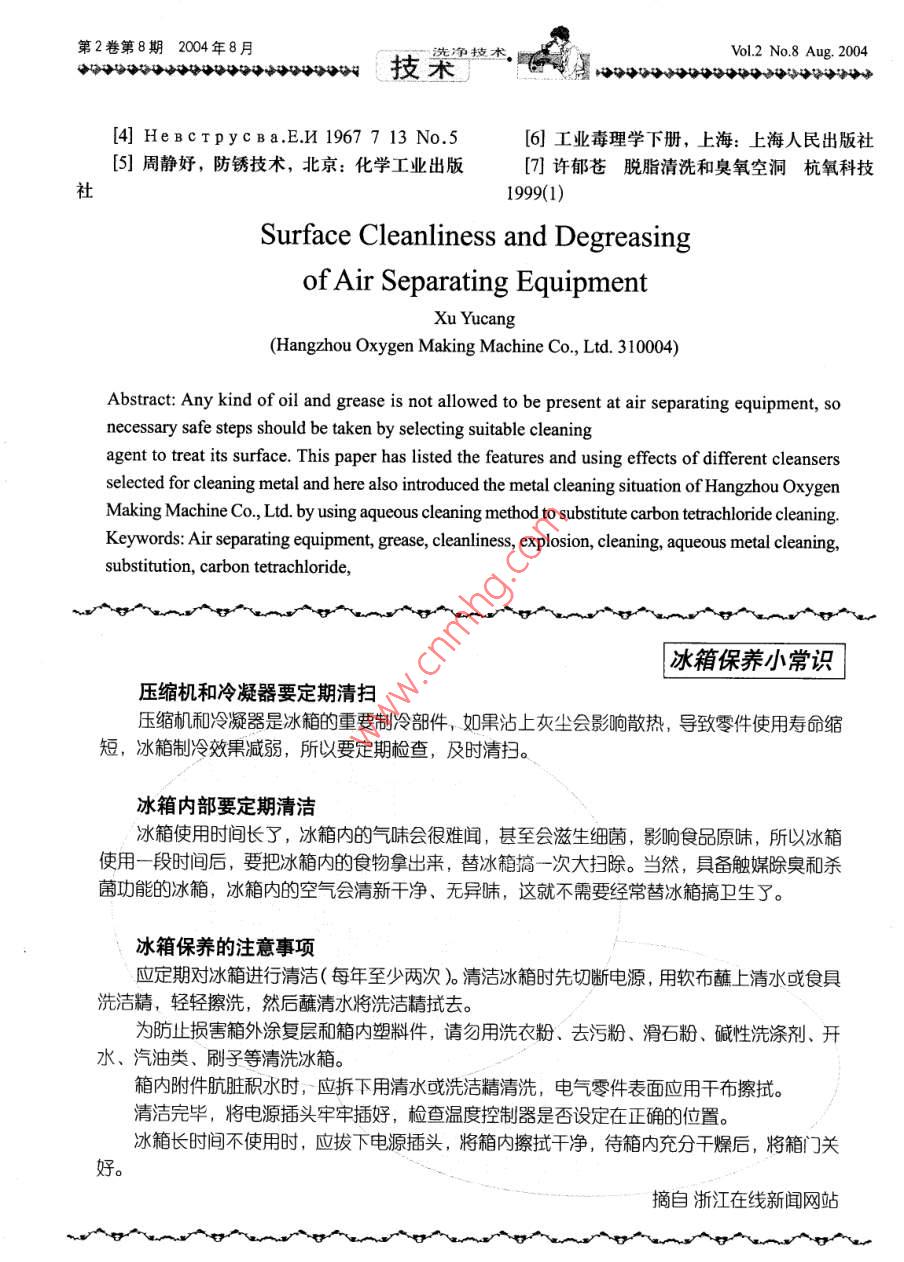 VoL 2 No 8 Aug 2004心《技術(shù)·技術(shù)交流》簡(jiǎn)介責(zé)任編輯:梁治齊通過(guò)對(duì)清洗技術(shù)的深入交流與探討,進(jìn)一步加強(qiáng)電話:010-64398822-8021科研與實(shí)踐的密切合作,從而促進(jìn)我國(guó)清洗行業(yè)健康傳真:010-64399585快速的發(fā)展。E-mail:editor@ccetca.com來(lái)稿要求liangzq@ccetca.com文章內(nèi)容以技術(shù)為核心,突出其實(shí)踐性和可操作性,并具有嚴(yán)密的科學(xué)理論依據(jù)和較強(qiáng)的行業(yè)針對(duì)性??辗衷O(shè)備的清洗盤(pán)郁杭州杭氧科技股份有限公司浙江31000)摘要文章介紹了空分設(shè)備及其性能特點(diǎn),空分設(shè)備的工藝流程,空分設(shè)備表面清潔度及其檢查方法,指出通過(guò)清洗降低空分設(shè)備表面油脂的殘留量對(duì)保障空分設(shè)備性能的正常發(fā)揮有著重要意義,過(guò)去通常采用四氯化碳作清洗劑,文章研究了在淘汰0DS新形勢(shì)下可采用的清洗劑和清洗技術(shù),介紹了在這方面取得的成果和經(jīng)驗(yàn)。關(guān)鍵詞空分設(shè)備污垢油脂四氟化碳替代清洗劑中圖分類號(hào)TH48文獻(xiàn)標(biāo)識(shí)碼A文章編號(hào)1672-2248(2004)08-0013-061、空分設(shè)備及其性能特點(diǎn)裝置。但就基本流程而言,主要有四種,即高壓1.1空分設(shè)備中壓、高低壓和全低壓流程。我國(guó)空分設(shè)備的生產(chǎn)空分設(shè)備就是以空氣為原料,通過(guò)壓縮循環(huán)規(guī)模已經(jīng)從早期只能生產(chǎn)20m/h(氧)的制氧機(jī)深度冷凍的方法把空氣變成液態(tài),再經(jīng)過(guò)精餾而發(fā)展到現(xiàn)在具有生產(chǎn)20000n0h、3000n3h從液態(tài)空氣中逐步分離生產(chǎn)出氧氣、氮?dú)饧皻鍤夂?0000h(氧)的特大型空分設(shè)備的能力。等惰性氣體的設(shè)備。1.2空分設(shè)備的基本系統(tǒng):目前我國(guó)生產(chǎn)的空分設(shè)備的形式、種類繁多空分設(shè)備從工藝流程來(lái)說(shuō)可以分為5個(gè)基本有生產(chǎn)氣態(tài)氧、氮的裝置,也有生產(chǎn)液態(tài)氧、氮的系統(tǒng):1.2.1雜質(zhì)的凈化系統(tǒng):主要是通過(guò)空氣過(guò)濾器和分子篩吸收器等裝置,凈化空氣中混有的收稿日期2004-7-9機(jī)械雜質(zhì)、水分、二氧化碳、乙炔等許郁蒼(1940-).男.浙江溫州人,1962年畢業(yè)于復(fù)旦大學(xué)化1.2.2空氣冷卻和液化系統(tǒng):主要由空氣壓學(xué)系1902-1902年在中科院上海冶金研究所工作192年后在杭州縮機(jī)、熱交換器、膨脹機(jī)和空氣節(jié)流閥等組成,起杭氧集團(tuán)工作。高級(jí)工程師,主要從事防腐及表面工程處理工藝研到使空氣深度冷凍的作用。第2卷第8期2004年8月VoL 2 No, 8 Aug 20041.2.3空氣精餾系統(tǒng):主要部件為精餾塔(上目視檢査。在明亮燈光照射下眼睛觀察被檢設(shè)備塔、下塔)、冷凝蒸發(fā)器、過(guò)冷器、液空和液氮節(jié)表面,察看有否殘留的固體物質(zhì)。不允許有直徑流閥。起到將空氣中各種組分分離的作用(或?qū)蔷€)超過(guò)0.5mm的固體顆粒存在,直徑1.2.4加溫吹除系統(tǒng):用加溫吹除的方法使(或?qū)蔷€)在0.25~0.5mm之間的固體顆??們艋到y(tǒng)再生。和應(yīng)少于100粒/m2,并且不得有纖維、灰塵和織1.2.5儀表控制系統(tǒng):通過(guò)各種儀表對(duì)整個(gè)物存在。個(gè)別殘留的纖維其長(zhǎng)度不得超過(guò)2mm;工藝進(jìn)行控制不允許有殘余的清洗液和水存在,表面應(yīng)該完全干燥。2.空分設(shè)備表面清潔度礦物油及油脂的測(cè)定可分為直接檢查法和定及其檢查方法量測(cè)定法。直接檢査法有濾紙擦拭法、紫外熒光2.1空分設(shè)備容易發(fā)生燃燒的原因法涂水試驗(yàn)法和滴水?dāng)U散法等,定量分析法可分發(fā)生燃燒甚至爆炸必須滿足3個(gè)條性有一定為重量法和油分濃度測(cè)定法。數(shù)量的可燃物質(zhì)、存在相應(yīng)數(shù)量的氧化劑、最低限目前我國(guó)空分設(shè)備表面殘油量的測(cè)定基本上度的能量保障。空分設(shè)備工作環(huán)境的最大特點(diǎn)是以油分濃度測(cè)定法為準(zhǔn),也以該法應(yīng)用最廣在低溫或常溫條件下流通著介質(zhì)氧。純氧是強(qiáng)氧化劑,即使在-183℃的液化低溫狀態(tài)下,只要易3.空分設(shè)備表面油脂燃易爆物的數(shù)量或濃度超過(guò)爆炸極限,介質(zhì)氧由殘留量標(biāo)準(zhǔn)的確定于高速流動(dòng)摩擦所產(chǎn)生積累的能量達(dá)到一定值時(shí),空分設(shè)備的脫脂清洗,就是為了去除部件表仍然會(huì)發(fā)生爆炸,造成人員傷亡和設(shè)備損壞。故此面的油脂,以達(dá)到符合標(biāo)準(zhǔn)規(guī)定的表面油脂殘留空分設(shè)備中凡能與介質(zhì)氧接觸的部分,其表面清量的要求。標(biāo)準(zhǔn)所規(guī)定的殘油量越低,對(duì)清洗設(shè)備潔度要求都很高,不允許有機(jī)械雜質(zhì)及油脂等有的要求也將越高,清洗工藝也將更繁瑣,勞動(dòng)強(qiáng)機(jī)物存在,這些物質(zhì)必須清除干凈度、清洗成本均將大幅度提高??辗衷O(shè)備禁油的零空分設(shè)備禁油零部件的脫脂清洗就是通過(guò)物部件表面殘測(cè)量的標(biāo)準(zhǔn)應(yīng)該如何確定?本人以為理或化學(xué)的方法,選用適當(dāng)?shù)那逑磩┩ㄟ^(guò)特定的其原則應(yīng)是既要貫徹IS0900,確保產(chǎn)品質(zhì)量,能清洗工藝對(duì)其表