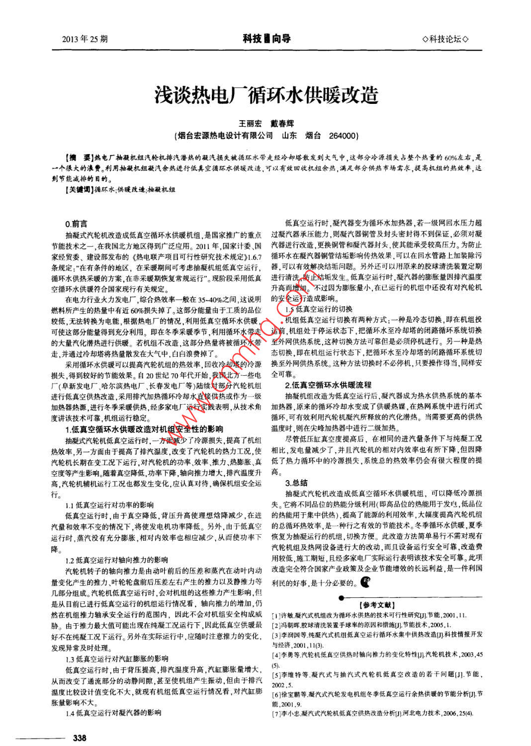 2013年25期科技昌向?qū)А罂萍颊搲鬁\談熱電廠循環(huán)水供暖改造王麗宏戴春輝(煙臺(tái)宏源熱電設(shè)計(jì)有限公司山東煙臺(tái)264000)【嬃】熱電廠抽凝機(jī)組汽輪機(jī)排汽潛熱的凝汽損失被循環(huán)水帶走經(jīng)冷卻塔散發(fā)到大氣中,這部分冷源損失占整個(gè)熱量的6‰%左右,是個(gè)很大的浪費(fèi)。利用抽凝機(jī)組凝汽氽熱進(jìn)行低真空循環(huán)水供暖改造,可以有效囯收杋組余熱,滿足部分供熱市場(chǎng)雩求,提高機(jī)組的熱效率,達(dá)到節(jié)能減排的目的?!娟P(guān)鍵切】循環(huán)水;供暖改逵;柚凝機(jī)組0前言低真空運(yùn)行時(shí),凝汽器變?yōu)檠h(huán)水加熱器,若一級(jí)網(wǎng)回水壓力超抽凝式汽輪機(jī)改造成低真空循環(huán)水供暖機(jī)組是國(guó)家推廣的重點(diǎn)過(guò)凝汽器承壓能力,則凝汽器銅管及封頭密封得不到保證,必須對(duì)凝節(jié)能技術(shù)之一在我國(guó)北方地區(qū)得到廣泛應(yīng)用。2011年國(guó)家計(jì)委、國(guó)汽器進(jìn)行改造更換銅管和凝汽器封頭,使其能承受較高壓力。為防止家經(jīng)貿(mào)委、建設(shè)部發(fā)布的《熱電聯(lián)產(chǎn)項(xiàng)目可行性研究技術(shù)規(guī)定》16.7循環(huán)水在凝汽器銅管結(jié)垢影響傳熱效果可以在回水管路上加裝除污條規(guī)定:“在有條件的地區(qū),在采暖期間可考慮抽凝機(jī)組低真空運(yùn)行,器,可以有效解決結(jié)垢問(wèn)題。另外還可以用原來(lái)的膠球清洗裝置定期循環(huán)水供熱采暖的方案,在非采暖期恢復(fù)常規(guī)運(yùn)行”。現(xiàn)階段采用低真進(jìn)行清洗,防止結(jié)垢發(fā)生。低真空運(yùn)行時(shí),凝汽器的膨脹量因排汽溫度空循環(huán)水供暖符合國(guó)家現(xiàn)行有關(guān)規(guī)定升高而增加。不過(guò)因?yàn)榕蛎浟啃?在已運(yùn)行的機(jī)組中還沒(méi)有對(duì)汽輪機(jī)在電力行業(yè)火力發(fā)電廠綜合熱效率一般在35-40%之間,這說(shuō)明的安全運(yùn)行造成影響燃料所產(chǎn)生的熱量中有近60%損失掉了。這部分能量由品位1.5低真空運(yùn)行的切換較低,無(wú)法轉(zhuǎn)換為電能,根據(jù)熱電廠的情況,利用低真空循環(huán)水供暖,機(jī)組低真空運(yùn)行切換有兩種方式:一種是冷態(tài)切換即在機(jī)組投可使這部分能量得到充分利用。即在冬季采暖季節(jié),利用循環(huán)水帶走運(yùn)前,機(jī)組處于停運(yùn)狀態(tài)下把循環(huán)水至冷卻塔的閉路循環(huán)系統(tǒng)切換的大量汽化潛熱進(jìn)行供暖。若機(jī)組不改造,這部分熱量將被循環(huán)水帶至外網(wǎng)供熱系統(tǒng)這種切換方法可靠但是必須停機(jī)進(jìn)行。另一種是熱走,并通過(guò)冷卻塔將熱量散發(fā)在大氣中,白白浪費(fèi)掉了態(tài)切換,即在機(jī)組運(yùn)行狀態(tài)下,把循環(huán)水至冷卻塔的閉路循環(huán)系統(tǒng)切采用循環(huán)水供暖可以提高汽輪機(jī)組的熱效率,回收冷卻塔的冷源換至外網(wǎng)供熱系統(tǒng)。這種方法切換時(shí)不必停機(jī),只要操作得當(dāng),同樣安損失得到較好的節(jié)能效果。自20世紀(jì)70年代開(kāi)始我國(guó)北方一些電全可靠。廠(阜新發(fā)電廠、哈爾濱熱電廠、長(zhǎng)春發(fā)電廠等)陸續(xù)對(duì)部分汽輪機(jī)組2低真空循環(huán)水供暖流程進(jìn)行低真空供熱改造,采用排汽加熱循環(huán)冷卻水直接供熱或作為一級(jí)抽凝機(jī)組改造為低真空運(yùn)行后,凝汽器成為熱水供熱系統(tǒng)的基本m熱器熱源進(jìn)行冬季采暖供熱經(jīng)多家電廠運(yùn)行實(shí)踐表明,從技術(shù)角加熱器,原來(lái)的循環(huán)冷卻水變成了供暖熱媒在熱網(wǎng)系統(tǒng)中進(jìn)行閉式度講該技術(shù)可靠機(jī)組運(yùn)行穩(wěn)定循環(huán)可有效利用汽輪機(jī)凝汽所釋放的汽化潛熱。當(dāng)需要更高的供熱1低真空循環(huán)水供暖改造對(duì)機(jī)組安全性的影響溫度時(shí),則在尖峰加熱器中進(jìn)行二級(jí)加熱抽凝式汽輪機(jī)低真空運(yùn)行時(shí),一方面減少了冷源損失,提高了機(jī)組盡管低壓缸真空度提高后,在相同的進(jìn)汽量條件下與純凝工況熱效率,另一方面由于提高了排汽溫度,改變了汽輪機(jī)的熱力工況使相比發(fā)電量減少了,并且汽輪機(jī)的相對(duì)內(nèi)效率也有所下降但因降汽輪機(jī)長(zhǎng)期在變工況下運(yùn)行,對(duì)汽輪機(jī)的功率效率、推力熱膨脹、真低了熱力循環(huán)中的冷源損失,系統(tǒng)總的熱效率仍會(huì)有很大程度的提空度等產(chǎn)生影響隨著真空降低,功率下降,軸向推力增大排汽溫度升高。高,汽輪機(jī)輔機(jī)運(yùn)行工況也都發(fā)生變化,應(yīng)認(rèn)真對(duì)待,確保機(jī)組安全運(yùn)3總結(jié)抽凝式汽輪機(jī)改造成低真空循環(huán)水供暖機(jī)組,可以降低冷源損1.1低真空運(yùn)行對(duì)功率的影響失。它將不同品位的熱能分級(jí)利用(即高品位的熱能用于發(fā)電,低品位低真空運(yùn)行時(shí),由于真空降低,背壓升高使理想焓降減少在進(jìn)的熱能用于集中供熱),提高了能源的利用效率大幅度提高汽輪機(jī)組量和效率不變的情況下將使發(fā)電機(jī)功率降低。另外,由于低真空的總循環(huán)熱效率是一種行之有效的節(jié)能技術(shù)。冬季循