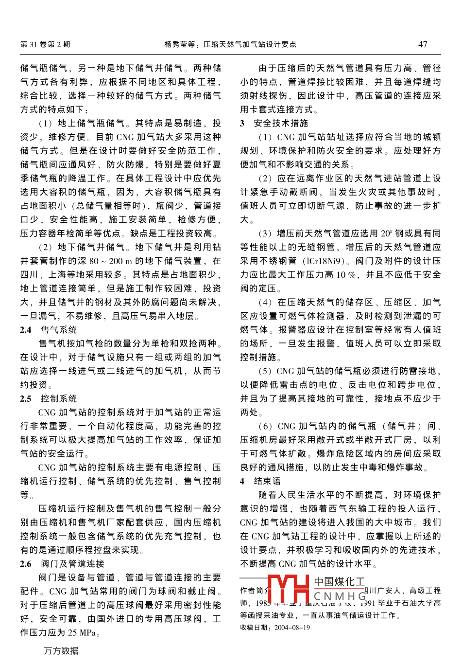 石油工程建設2005年4月壓縮天然氣加氣站設計要點刁憶憶憶憶公長長長長長長公長公長長長長k長小長長長k長長長乙長長小知刁長長長長長長楊秀瑩,劉曉紅(中國石化集團中原油田勘察設計硏究院,河南濮陽457001摘要:敘述了壓縮天然氣(CNG)加氣站工藝流程和主要設備的作用及在選型、安裝等方面應注意的事項。介紹了CNG加氣站設計過程中,站址的選擇,緊急切斷閥的設置,管材、高壓閥門的選用,儀表控制,防雷、通風設計以及CNG加氣站應采取的安全技術措施關鍵詞:壓縮天然氣;工藝流程;設計;安全技術中圖分類號:TE974文獻標識碼:B文章編號:1001-206(2005)02-0046-020引言天然氣的水露點在25MPa時滿足最低環(huán)境溫度的天然氣作為一種綠色能源在21世紀已越來越要求。國內外脫水裝置生產廠家一般是根據用戶引起人們的重視,作為代替汽油的汽車清潔燃提供的氣源組分、處理氣量、工作壓力、處理后料——壓縮天然氣(CNG),不僅能大幅度降低汽天然氣水露點等要求進行設計。脫水裝置通常為車的運行費用,而且具有環(huán)境污染小,安全可靠橇裝式,分為高壓和低壓兩種,低壓脫水裝置應的特點。為此,國內各大城市紛紛努力尋求氣源,設在天然氣壓縮前,高壓脫水裝置設在天然氣壓相繼建起了一批CNG加氣站。盡管目前國內CNG縮后。加氣站設計已較成熟,但在設計過程中一些問題2.2壓縮機仍值得注意。壓縮機是CNG加氣站的核心設備,其性能好1工藝流程壞,直接影響全站的運行。根據CNG加氣站生產CNG加氣站的功能是向車輛或氣瓶拖車供壓能力不大、氣體壓力變化大的特點,CNG加氣站縮天然氣。工藝流程為:進站的天然氣,經過除般采用往復式壓縮機。目前建成的CNG加氣站塵、脫硫、脫水凈化處理后,經壓縮機增壓至25采用的壓縮機有進口和國產兩種。美國、意大利MPa,通過順序控制盤控制并分別進入高、中、低等國的產品,在各大城市的CNG加氣站中使用較壓儲氣瓶,當高、中、低壓儲氣瓶內的壓力全部多。但也有一些CNG加氣站采用了國產壓縮機達到25MPa時,壓縮機自動停機。高、中、低壓(如重慶壓縮機廠生產的L型以及風冷式壓縮機,儲氣瓶中的天然氣由售氣機控制并自動給CNG汽成都金星化工機械廠生產的ZW-1.7/3-250-JX型車加氣。當儲氣瓶的壓力接近20MPa時,壓縮機等),用戶反應良好。由于在價格上,國產壓縮機自動啟動向儲氣瓶補氣。在補氣過程中,如遇車較進口壓縮機便宜,因此設計CNG加氣站時,如輛加氣,順序控制盤自動切換,優(yōu)先向車輛加氣。建設單位沒有特殊要求,國產壓縮機完全可滿足2主要工藝設施及其設計要點技術要求,無需從國外引進由于大多數CNG加氣站氣源的H2S含量均在在壓縮機系統的設計中,應避免產生由壓縮國家現行標準、規(guī)范規(guī)定的范圍內,不需要在站機進、岀口管道引起的壓縮杋房共振。控制管道內脫硫。故目前我們設計的CNG加氣站工藝設施流速中國煤化工天然氣流速不大于主要包括:脫水裝置、壓縮機、儲氣設施、售氣20m/sCNMHG不大于5m/s)是系統、控制系統等。減小管追振動的一壩伺效增池。21脫水裝置23儲氣設施脫水裝置主要是對天然氣進行深度脫水,使目前,國內外儲氣方式有兩種:一種是地上第31卷第楊秀瑩等:壓縮天然氣加氣站設計要點儲氣瓶儲氣,另一種是地下儲氣井儲氣。兩種儲由于壓縮后的天然氣管道具有壓力高、管徑氣方式各有利弊,應根據不同地區(qū)和具體工程小的特點,管道焊接比較困難,并且每道焊縫均綜合比較,選擇一種較好的儲氣方式。兩種儲氣須射線探傷,因此設計中,高壓管道的連接應采方式的特點如下用卡套式連接方式。(1)地上儲氣瓶儲氣。其特點是易制造,投3安全技術措施資少,維修方便。目前CNG加氣站大多采用這種(1)CNG加氣站站址選擇應符合當地的城鎮(zhèn)儲氣方式。但是在設計時要做好安全防范工作,規(guī)劃、環(huán)境保護和防火安全的要求。應處理好方儲氣瓶間應通風好、防火防爆,特別是要做好夏便加氣和不影響交通的關系。季儲氣瓶的降溫工作。在具體工程設計中應優(yōu)先(2)應在遠離作業(yè)區(qū)的天然氣進站管道上設選用大容積的儲氣瓶,因為,大容積儲氣瓶具有計緊急手動截斷閥,當發(fā)生火災或其他事故時占地面積小(總儲氣量相等時),瓶閥少,管道接值班人員可立即切斷氣源,防止事故的進一步擴少,安全性能高,施工安裝簡單,檢修方便,大壓力容器年檢簡單等優(yōu)點。缺點是工程投資較高。(3)增壓前天然氣管道應選用20鋼或具有同(2)地下儲氣井儲氣。地下儲氣井是利用鉆等性能以上的無縫鋼管,增壓后的天然氣管道應井套管制作的深80~200m的地下儲氣裝置,在采用不銹鋼管(Crl8Ni9)。閥門及附件的設計壓四川、上海等地采用較多。其特點是占地面積少,力應比最大工作壓力高10%,并且不應低于安全地上管道連接簡單,但是施工制作較困難,投資閥的定壓。大,并且儲氣井的鋼材及其外防腐問題尚未解決4)在壓縮天然氣的儲存區(qū)、壓縮區(qū)、加氣旦漏氣,不易維修,且高壓氣易串入地層區(qū)應設置可燃氣體檢測器,及時檢測到泄漏的可24售氣系統燃氣體。報警器應設計在控制室等經常有人值班售氣機按加氣槍的數量分為單槍和雙搶兩種。的場所,一旦發(fā)生報警,值班人員可以立即采取在設計中,對于儲氣設施只有一組或兩組的加氣控制措施。站應選擇一線進氣或二