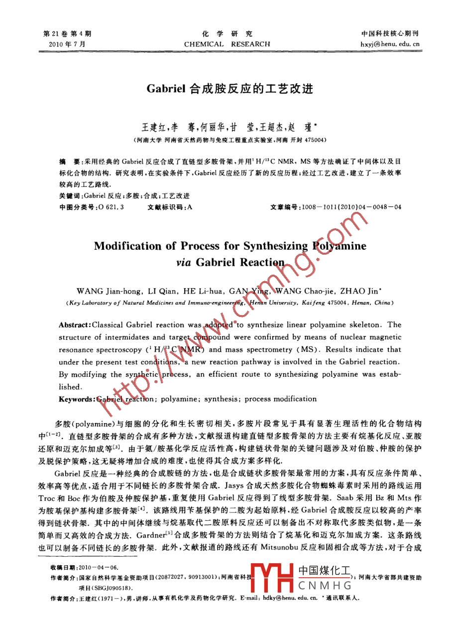 第21卷第4期化學(xué)研究中國科技核心期刊2010年7月CHEMICAL RESEARCHhxy@henu.edu.cnGabriel合成胺反應(yīng)的工藝改進王建紅,李騫,何麗華,甘瑩,王超杰,趙瑾河南大學(xué)河南省天然藥物與免疫工程重點實驗室,河南開封475004)摘要:采用經(jīng)典的 Gabriel反應(yīng)合成了直鏈型多胺骨架,并用H/CNMR,MS等方法確證了中間體以及目標(biāo)化合物的結(jié)構(gòu).研究表明,在實驗條件下, Gabriel反應(yīng)經(jīng)歷了新的反應(yīng)歷程;經(jīng)過工藝改進,建立了一條效率較高的工藝路線關(guān)鍵詞: Gabriel反應(yīng);多胺;合成;工藝改進中圖分類號:O621.3文獻標(biāo)識碼:A文章編號:1008-1011(2010)04-0048-04Modification of Process for Synthesizing polyaminevia gabriel reactionWANG Jian-hong, LI Qian, HE Li-hua, GAn Ying, WANG Chao-jie, ZHAo JiKey Laboratory of Natural Medicines and Immunoengineering, Henan University, Kai feng 475004, Henan, ChinAbstract: Classical Gabriel reaction was adopted to synthesize linear polyamine skeleton. Thestructure of intermidates and target compound were confirmed by means of nuclear magneticresonance spectroscopy(H/C NMR)and mass spectrometry (MS). Results indicate thatunder the present test conditions, a new reaction pathway is involved in the Gabriel reactionBy modifying the synthetic process, an efficient route to synthesizing polyamine was estab-lishedKeywords: Gabriel reaction; polyamine; synthesis; process modification多胺( polyamine)與細(xì)胞的分化和生長密切相關(guān),多胺片段常見于具有顯著生理活性的化合物結(jié)構(gòu)中1-2).直鏈型多胺骨架的合成有多種方法,文獻報道構(gòu)建直鏈型多胺骨架的方法主要有烷基化反應(yīng)、亞胺還原和邁克爾加成等3.由于氨/胺基化學(xué)反應(yīng)活性高,構(gòu)建鏈狀骨架的關(guān)鍵問題涉及對伯胺、仲胺的保護及脫保護策略,這無疑將增加合成的難度,也使得其合成方案多樣化Gabriel反應(yīng)是一種經(jīng)典的合成胺鏈的方法,也是合成鏈狀多胺骨架最常用的方案,具有反應(yīng)條件簡單、效率高等優(yōu)點適合用于不同鏈長的多胺骨架合成. Jays合成天然多胺化合物蜘蛛毒素時采用的路線運用Troc和Boc作為伯胺及仲胺保護基,重復(fù)使用 Gabriel反應(yīng)得到了線型多胺骨架.Sab采用Bz和Mts作為胺基保護基構(gòu)建多胺骨架.該路線用芐基保護的二胺為起始原料經(jīng) Gabriel合成胺反應(yīng)以較高的產(chǎn)率得到鏈狀骨架.其中的中間體繼續(xù)與烷基取代二胺原料反應(yīng)還可以制備出不對稱取代多胺類似物,是一條簡單而又高效的合成方法. Gardner51合成多胺骨架的方法則結(jié)合了烷基化和邁克爾加成方案這條路線也可以制備不同鏈長的多胺骨架.此外,文獻報道的路線還有 Mitsunobu反應(yīng)和固相合成等方法,對于合成收稿日期:2010-04-06.作者簡介:國家自然科學(xué)基金資助項目(20872027,90913001);河南省科技中國煤化工);河南大學(xué)省部共建資助項目(SBGJ905I8)CNMHG作者簡介:王建紅(1971-),男,講師,從事有機化學(xué)及藥物化學(xué)研究,E-mail:hay@henu.edu.cn‘通訊聯(lián)系人王建紅等: Gabriel合成胺反應(yīng)的工藝改進各種特殊結(jié)構(gòu)的多胺鏈具有各自的適用性1實驗部分為了合成不同結(jié)構(gòu)的多胺骨架,作者在文獻方法的基礎(chǔ)上),采用經(jīng)典的 Gabriel反應(yīng)制備多胺,選取Boc作為氨基保護基團設(shè)計以下路線合成目標(biāo)化合物(圖1)NH?+BBoc 2Reagents and conditions: (a)K, COa, CH, CN,r t. (b)Boc?O, CHCl,/CH3 OH, r t :(c)Hz NNH2H20.CaHsOH, reflux, 3 h:(d) N-bromoalkylphthalimide, K2 CO3, CH, CN,(e)H2 NNHzH2O, C,HsOH, reflux圖1目標(biāo)化合物的合成路線Fig. 1 The synthetic route of target compound1.1主要儀器WFH-204B型手提式紫外燈(上海精科實業(yè)有限公司);EM-360L型核磁共振儀; Esquire3000型LCS質(zhì)譜儀1.2合成N丙基-胺丁基鄰苯二甲酰亞胺(1)的合成室溫下,于20mL乙腈中先后加入溴丁基鄰苯二甲酰亞胺1.6g(5.6mmol)、正丙胺0.7mL(8.4mmol)和3.0g氟化鉀,攪拌30min.控溫于40℃反應(yīng)4h,結(jié)束反應(yīng),過濾除去固體.減壓蒸除溶劑,剩余物溶于30mL三氯甲烷中,水洗,無水Na2SO干燥,得到粗產(chǎn)物,硅膠柱分離(R;=0.2cHCl3CH3OH=20:1)得0.5g化合物1: yield:36%;HNMR(CDCl3,400MHz)bH:0.79(t,J=7.4Hz,3H),1.37~1.50(m,4H),1.57~1.65(m,2H),2,47(t,J=7,4Hz,2H),2.56(t,J=7.3Hz,2H),3.59(t,J=7.1Hz,2H),7.58~7.61(m,2H),7.69~7.73(m,2H);ESI-MS m/z:261.2[M+1]+1.2.2N-叔丁氧羰基-N-丙基-胺丁基鄰苯二甲酰亞胺(2)的合成室溫下,3.0g(12.2mmol)化合物1溶于20 mL TEA/CH3OH(10%)混合溶劑中,攪拌下,滴加N叔丁氧羰基甲酸酐(5.3g,24.4mmol)的甲醇溶液(10mL).滴畢,反應(yīng)過夜.減壓蒸除溶劑,剩余物溶于30mL三氯甲烷中,水洗,無水Na2SO4干燥.硅膠柱分離(R1=0.35,CHCl2/CH3OH=60:1)得3.7g無色油狀液體2: yield:85%;HNMR(CDCl3,400MHz)bn:0.85(t,J=7.4Hz,3H),1.42(s,9H)1.45~1.59(m,4H),1.62~1.69(m,2H),3.10(t,J=7.1Hz,2H),3.19(t,J=6.7Hz,2H),3.70(t,J=6.9Hz,2H),7.70~7.72(m,2H),7.83~7.85(m,2H);1CNMR(CDCl,400MHz)be:11.24,21.67,23.29,25.99,28.34,28.45,37.68,46.47,48.79,79.08,123.19,132.13,133.90155.52,168.39; ESI-MS m/z:361.2[M+1]+1.2.3N-叔丁氧羰基N-丙基-1,4-丁二胺(3)的合成2.0g(5.6mmol)化合物2溶于30mL甲醇,攪拌下加入0.5mL85%水合肼.回流反應(yīng)6h.結(jié)束反應(yīng),減壓蒸除溶劑,剩余物加入20mL水,三氯甲烷萃取(20mL×3),合并有機層,干燥,蒸除溶劑得1.3g淡黃色油狀液體3: yield:100%;HNMR(CDCl3,400MHz)bH:0.87(t,J=7.3Hz,3H),1.45(s9H),1.49~1.53(m,4H),1.65~1.70(m,2H),2.71(中國煤化工;(brs,4H);lCNMR(CDCl3,400MHz)bc:11.28,21.45