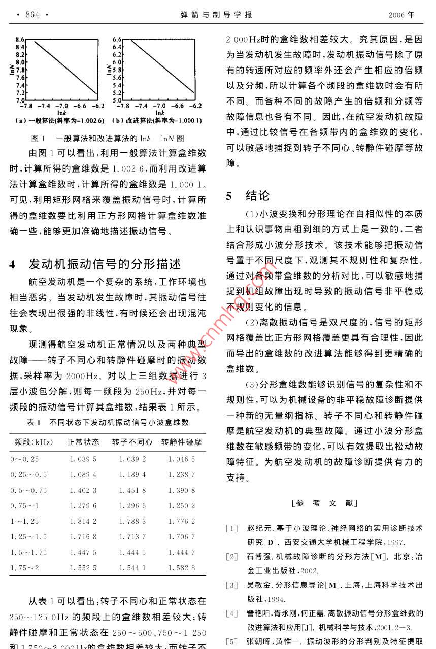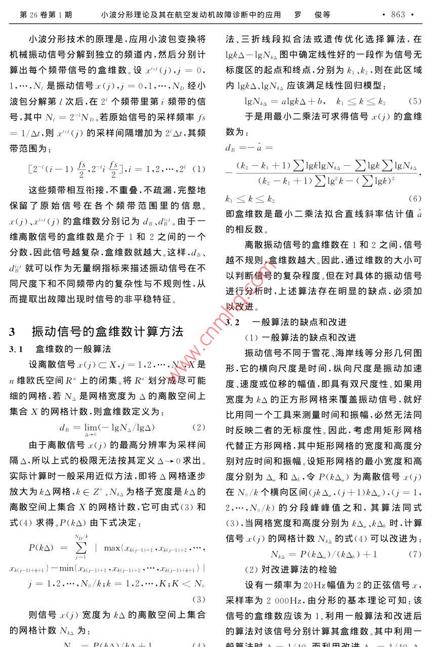 862彈箭與制導學報2006年小波分形理論及其在航空發(fā)動機故障診斷中的應用羅俊,何立明,陳超(西安空軍工程大學工程學院,西安[摘要]根據(jù)小波變換和分形理論在多尺度分析和自相似本質上的一致性,采用小波分形理論進行發(fā)動機故障診斷。為了克服目前離散信號盒維數(shù)計算方法的不足,提出用矩形網(wǎng)格代替正方形網(wǎng)格來覆蓋振動信號,得到更加精確的盒維數(shù)。通過比較航空發(fā)動機的幾種狀態(tài)下的小波盒維數(shù)表明,小波分形技術為非平穩(wěn)故障診斷提供了一種有效的新技術,盒維數(shù)作為波形的一個重要特征,可以用于對航空發(fā)動機振動狀態(tài)的分類識別關鍵詞]小波分形;盒維數(shù);故障診斷;航空發(fā)動機[中圖分類號]V263.6[文獻標識碼]AWavelet Fractal Technology and Its Application toAeroengine Fault DiagnoisisLUO Jun, hE Li-ming. ChEn ChaEngineering Institute, Airforce Engineering University Xi'an 710038, China)Abstract: Wavelet fractal is proposed according to the unity that possesses multiscale decompositions and self similarityin both wavelet transform and fractal theory. In order to overcome disadvantage of the general method calculating boxdimension of discrete signals, to discover discrete signals by rectangle net instead of square net. Successful applicationen achieved to detect several typical fault of aeroengine. The result show that wavelet fractal can provide a new effective technology to reveal nonstationary fault of aeroengine.Key words: wavelet fractal box-counting dimention fault diagnosis: aeroengine在這種思想的啟發(fā)下,應用小波和分形結合起來1引言的小波分形技術,其原理是通過比較小波分解后航空發(fā)動機出現(xiàn)故障時,其動力學行為往往不同頻帶內信號盒維數(shù)的大小及其變化,來反映表現(xiàn)出復雜性和非線性其振動信號也隨之出現(xiàn)信號的不規(guī)則度和復雜度,刻畫信號的非平穩(wěn)非平穩(wěn)性。此時,基于線性動力學模型的平穩(wěn)信性,從而實現(xiàn)對發(fā)動機的故障診斷。號分析方法已不再適用。而小波變換本質上是組共軛正交濾波器,從這個角度講,小波分析2小波分形原理是信號處理的一個有力工具。在工程應用領域小波變換是一種基于事物認識過程的多分最關心的問題是如何從小波變換后的數(shù)據(jù)中提辨原則,如同人們從遠到近逐步深化地觀測事物取故障特征。分形是一門以不規(guī)則事物為研究那樣,在振動信號的處理中,它可以由粗到細逐對象、探索復雜性的科學,所以它很自然地被用步給出振動信號在不同尺度下的波形。小波、小來描述設備振動信號的不規(guī)則性和復雜性。有波包變換的這種從低分辨到高分辨的過渡原則關研究表明,分形理論和小波分析在自相似的本與分形過程中的從總體向局部、從宏觀向微觀深質上和認識事物由粗到細的過程上是一致的。化是一致的第26卷第1期小波分形理論及其在航空發(fā)動機故障診斷中的應用羅俊等863小波分形技術的原理是,應用小波包變換將法、三折線段擬合法或遺傳優(yōu)化選擇算法,在機械振動信號分解到獨立的頻道內.然后分別計1gkΔ一lgN圖中確定線性好的一段作為信號無算出每個頻帶信號的盒維數(shù)。設x(j),=0,標度區(qū)的起點和終點,分別為k1、k2,則在此區(qū)域1,…N是振動信號x(j),=0,1,…,N經(jīng)小內1gkΔ、lgN△應該滿足線性回歸模型:波包分解第l次后,在2個頻帶里第i頻帶的信lgNa=algk△+b,k≤k≤k2(5)號,其中N=2ND。若原始信號的采樣頻率fs于是用最小二乘法可求得信號x(j)的盒維=1/△t,則x(j)的采樣間隔增加為2△t,其頻數(shù)為:帶范圍為:[2(-1)1,2;],=1,2…,2(1)(k一k+1)∑1gN一∑g∑N(k2一k1+1)∑1g2k-(∑lgk)這些頻帶相互銜接,不重疊,不疏漏,完整地保留了原始信號在各個頻帶范圍里的信息。Ak≤kx(j)、x(j)的盒維數(shù)分別記為dB、dB'由于即盒維數(shù)是最小二乘法擬合直線斜率估計值維離散信號的盒維數(shù)是介于1和2之間的一個的相反數(shù)分數(shù).因此信號越復雜,盒維數(shù)就越大。這樣,dB離散振動信號的盒維數(shù)在1和2之間,信號越不規(guī)則,盒維數(shù)越大。因此,通過維數(shù)的大小可dli'就可以作為無量綱指標來描述振動信號在不以判斷信號的復雜程度。但在對具體的振動信號同尺度下和不同頻帶內的復雜性與不規(guī)則性,從進行分析時,上述算法存在明顯的缺點,必須加而提取出故障出現(xiàn)時信號的非平穩(wěn)特征。以改進。3.2一般算法的缺點和改進3振動信號的盒維數(shù)計算方法(1)一般算法的缺點和改進3.1盒維數(shù)的一般算法振動信號不同于雪花、海岸線等分形幾何圖設離散信號x()CX,=1,2,…N,X是形,它的橫向尺度是時間,縱向尺度是振動加速n維歐氏空間R"上的閉集將R"劃分成盡可能度、速度或位移的幅值,即具有雙尺度性。如果用細的網(wǎng)格若N是網(wǎng)格寬度為△的離散空間上寬度為k△的正方形網(wǎng)格來覆蓋振動信號,就好集合X的網(wǎng)格計數(shù)則盒維數(shù)定義為比用同一個工具來測量時間和振幅,必然無法同dB=lim(-lgN△/lg△)(2)時反映二者的無標度性。因此,考慮用矩形網(wǎng)格由于離散信號x(j)的最高分辨率為采樣間代替正方形網(wǎng)格,其中矩形網(wǎng)格的寬度和高度分隔Δ,所以上式的極限無法按其定義Δ→0求出。別對應時間和振幅。設矩形網(wǎng)格的最小寬度和高實際計算時一般采用近