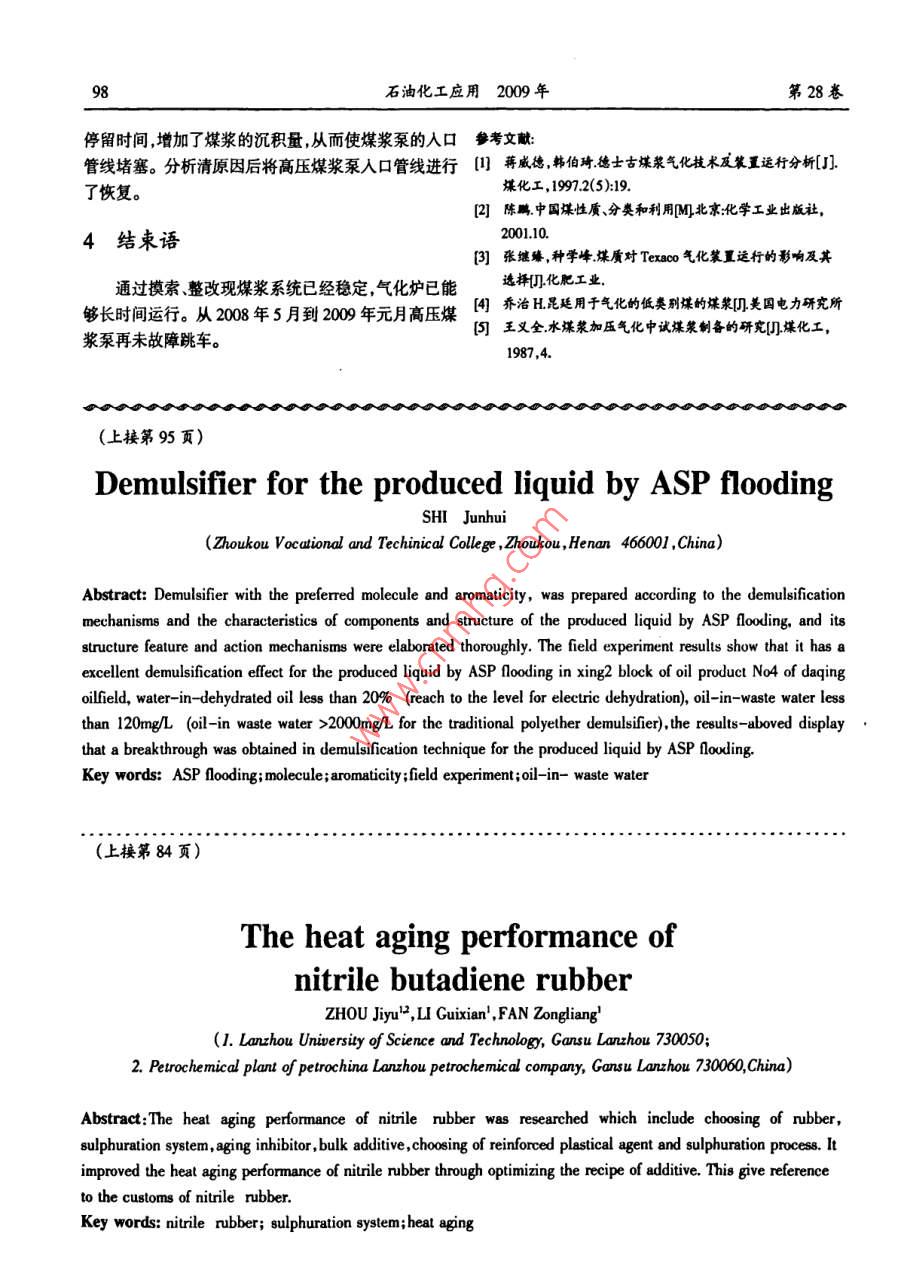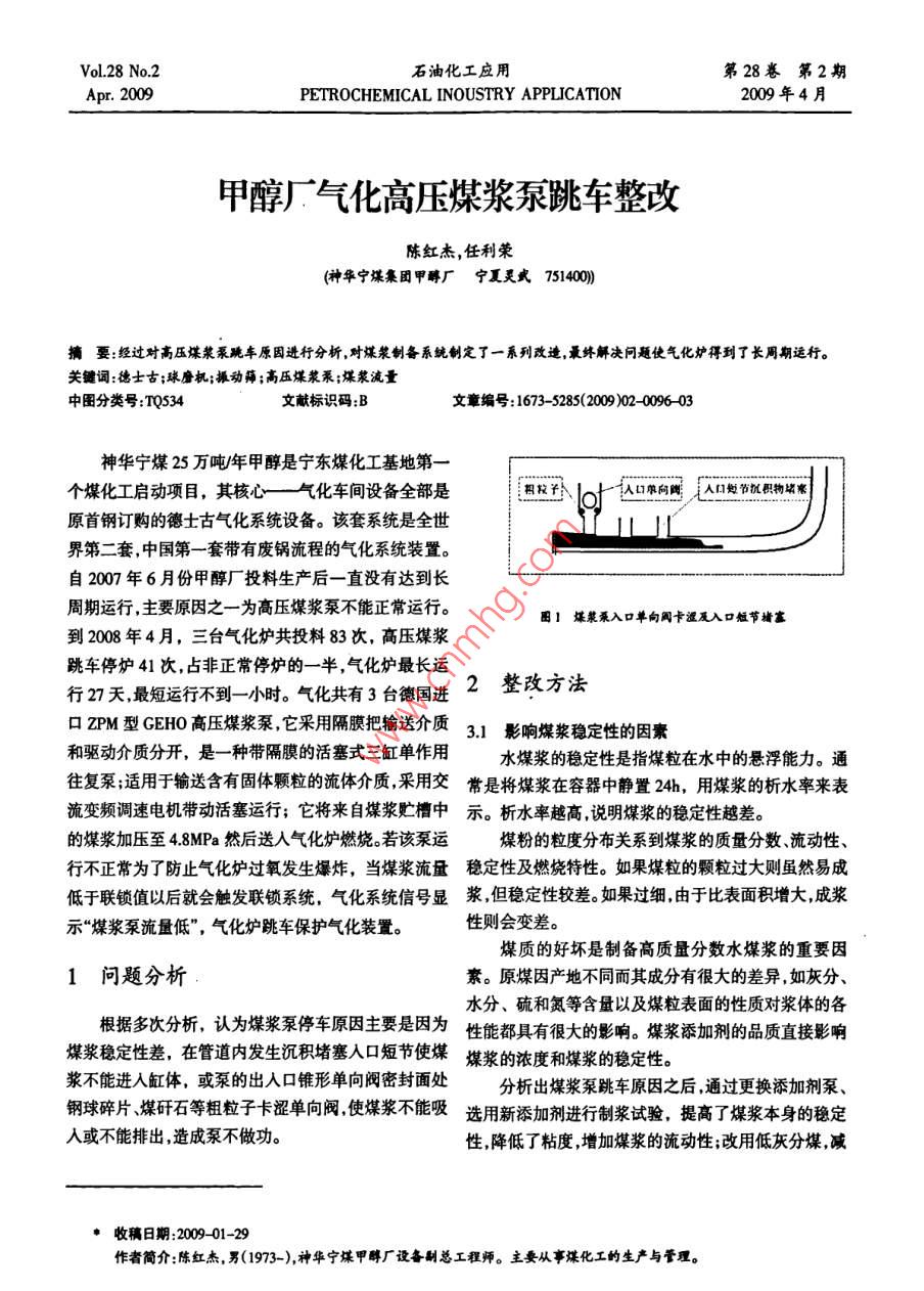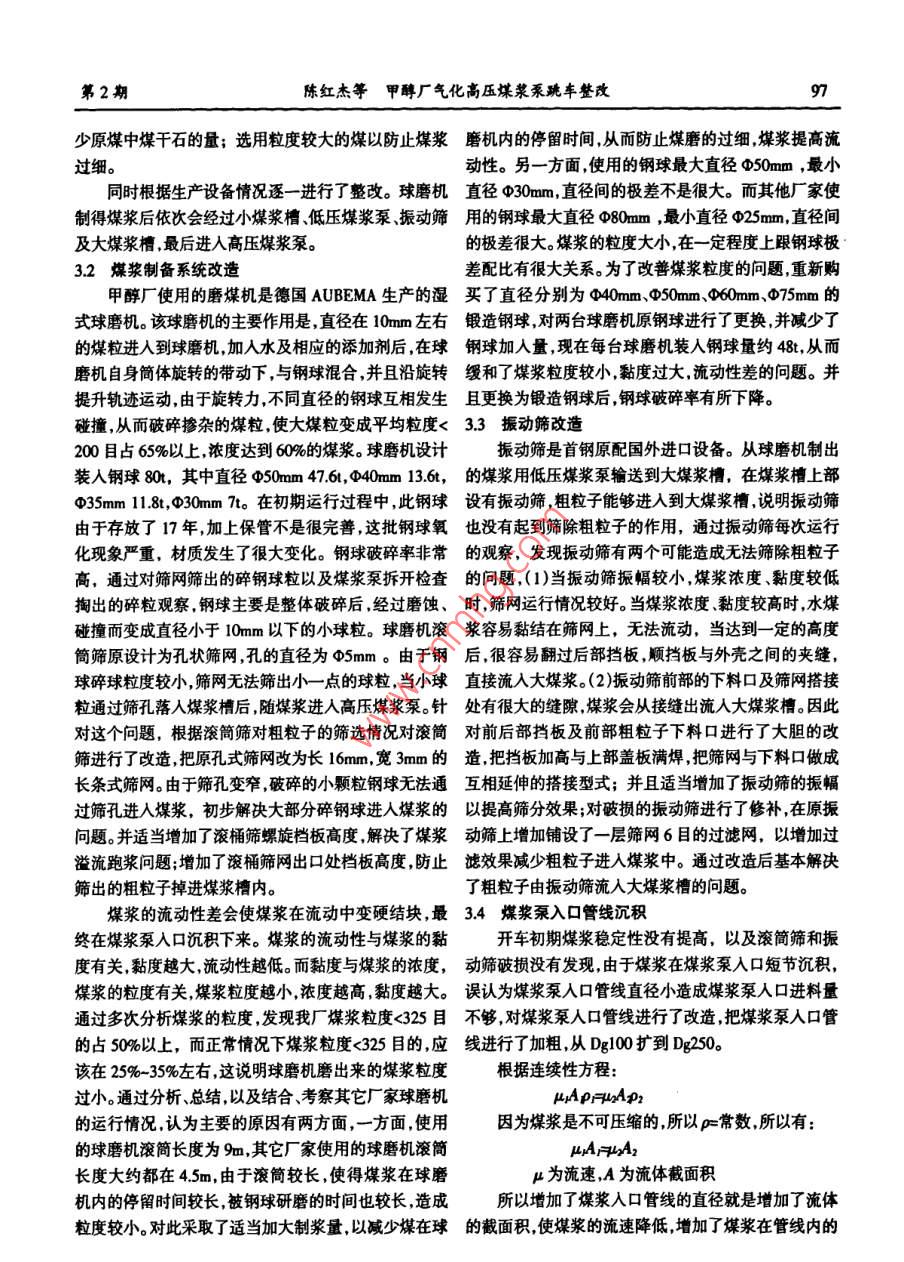 VoL.28 No.2石油化工應(yīng)用第28卷第2期Apr.2009PETROCHEMICAL INOUSTRY APPLICATION2009年4月甲醇廠氣化高壓煤漿泵跳車整改陳紅杰,任利榮(神華寧煤集團甲醇廠寧夏靈武 751400)摘要:經(jīng)過對高壓煤漿泵跳車原 固進行分析,對煤漿制備系統(tǒng)制定了一系列改造,最終解決問題使氣化爐得到了長周期運行。關(guān)鍵詞:德士古;球磨機;振動篩;高壓煤漿泵;煤漿流量中圖分類號:TQS34文獻標識碼:B文章編號: 1673- 5285(2009)02- 009603神華寧煤25萬噸/年甲醇是寧東煤化工基地第- -個煤化工啟動項目,其核心一氣化車間設(shè)備全部是相牧一個人口單向尚美人口處節(jié)就積物靖家原首鋼訂購的德士古氣化系統(tǒng)設(shè)備。該套系統(tǒng)是全世界第二套,中國第-套帶有廢鍋流程的氣化系統(tǒng)裝置。自2007年6月份甲醇廠投料生產(chǎn)后- -直沒有達到長周期運行,主要原因之一為高壓煤漿泵不能正常運行。圈1煤漿乘入口單向國卡澀及入口短節(jié)堵塞到2008年4月,三臺氣化爐共投料83次,高壓煤漿跳車停爐41次,占非正常停爐的一半,氣化爐最長運;行27天,最短運行不到- -小時。 氣化共有3臺德國進2整改方法口ZPM型GEHO高壓煤漿泵,它采用隔膜把輸送介質(zhì)3.1影響煤漿穩(wěn)定性的因素和驅(qū)動介質(zhì)分開,是一-種帶隔膜的活塞式三缸單作用水煤漿的穩(wěn)定性是指煤粒在水中的懸浮能力。通往復(fù)泵;適用于輸送含有固體顆粒的流體介質(zhì),采用交常 是將煤漿在容器中靜置24h,用煤漿的析水率來表流變頻調(diào)速電機帶動活塞運行;它將來自煤漿貯槽中示。析水率越高,說明煤漿的穩(wěn)定性越差。的煤漿加壓至4.8MPa然后送人氣化爐燃燒。若該泵運煤粉的粒度分布關(guān)系到煤漿的質(zhì)量分數(shù)、流動性、行不正常為了防止氣化爐過氧發(fā)生爆炸,當(dāng)煤漿流童穩(wěn)定性及燃燒特性。 如果煤粒的顆粒過大則雖然易成低于聯(lián)鎖值以后就會觸發(fā)聯(lián)鎖系統(tǒng),氣化系統(tǒng)信號顯漿,但穩(wěn)定性較差。如果過細,由于比表面積增大,成漿示“煤漿泵流量低”,氣化爐跳車保護氣化裝置。性則會變差。煤質(zhì)的好壞是制備高質(zhì)量分數(shù)水煤漿的重要因1問題分析素。原煤因產(chǎn)地不同而其成分有很大的差異,如灰分、水分、硫和氮等含量以及煤粒表面的性質(zhì)對漿體的各根據(jù)多次分析,認為煤漿泵停車原因主要是因為性能都具有很大的影響。 煤漿舔加劑的品質(zhì)直接影響煤漿穩(wěn)定性差,在管道內(nèi)發(fā)生沉積堵塞入口短節(jié)使煤煤漿的濃度和煤漿的穩(wěn)定性。漿不能進人缸體,或泵的出人口錐形單向閥密封面處分析出煤漿泵跳車原因之后,通過更換添加劑泵、鋼球碎片煤矸石等粗粒子卡澀單向閥,使煤漿不能吸選用新添加劑進行制漿試驗, 提高了煤漿本身的穩(wěn)定人或不能排出,造成泵不做功。性,降低了粘度,增加煤漿的流動性;改用低灰分煤,減●收稿日期:009-01-29作者簡介:陳紅杰,男(1973-),神華寧煤甲醇廠設(shè)備別總工程師。主要從事謀化工的生產(chǎn)與管理。第2期陳紅杰等甲醇廠 氣化高壓煤漿泵跪車整改少原煤中煤干石的量;選用粒度較大的煤以防止煤漿磨機內(nèi)的停留時間,從而防止煤磨的過細,煤漿提高流過細。動性。另一方面,使用的鋼球最大直徑φ50mm ,最小同時根據(jù)生產(chǎn)設(shè)備情況逐一進行了整改。 球磨機直徑 φ30mm,直徑間的極差不是很大。而其他廠家使制得煤漿后依次會經(jīng)過小煤漿槽、低壓煤漿泵、振動篩用的鋼球最大 直徑φ80mm ,最小直徑中25mm,直徑間及大煤漿槽,最后進人高壓煤漿泵。的極差很大。煤漿的粒度大小,在-定程度上跟鋼球極3.2煤漿制備系統(tǒng)改造差配比有很大關(guān)系。為了改善煤漿粒度的問題,重新購甲醇廠使用的磨煤機是德國AUBEMA生產(chǎn)的濕買了 直徑分別為040mm、φ50mm、960mm、φ75mm的式球磨機。該球磨機的主要作用是,直徑在10mm左右鍛造鋼球,對兩臺球磨 機原鋼球進行了更換,并減少了的煤粒進人到球磨機,加入水及相應(yīng)的添加劑后,在球鋼球加人量, 現(xiàn)在每臺球磨機裝人鋼球量約48t,從而磨機自身簡體旋轉(zhuǎn)的帶動下,與鋼球混合并且沿旋轉(zhuǎn)緩和了煤漿粒度較小,黏度過大,流動性差的問題。并提升軌跡運動,由于旋轉(zhuǎn)力,不同直徑的鋼球互相發(fā)生且更換為鍛造 鋼球后,鋼球破碎率有所下降。碰撞,從而破碎摻雜的煤粒,使大煤粒變成平均粒度< 3.3 振動篩改造200目占65%以上,濃度達到60%的煤漿。球磨機設(shè)計振動篩是首鋼原配國外進口設(shè)備。從球磨機制出裝入鋼球80r,其中直徑@50mm 47.61, φ40mum 13.6t,的煤漿 用低壓煤漿泵輸送到大煤漿槽,在煤漿槽上部φ35mm 1.8,30mm 7t。在初期運行過程中,此鋼球設(shè)有 振動篩,粗粒子能夠進入到大煤漿槽,說明振動篩由于存放了17年,加上保管不是很完善,這批鋼球氧也沒有起到篩除粗粒子的作用, 通過振動篩每次運行化現(xiàn)象嚴重,材質(zhì)發(fā)生了很大變化。鋼球破碎率非常的觀察, 發(fā)現(xiàn)振動篩有兩個可能造成無法篩除粗粒子高,通過對篩網(wǎng)篩出的碎鋼球粒以及煤漿泵拆開檢查的問題 , (1)當(dāng)振動篩振幅較小,煤漿濃度、黏度較低掏出的碎粒觀察.鋼球主要是整體破碎后經(jīng)過磨蝕、時, 篩網(wǎng)運行情況較好。當(dāng)煤漿濃度、黏度較高時