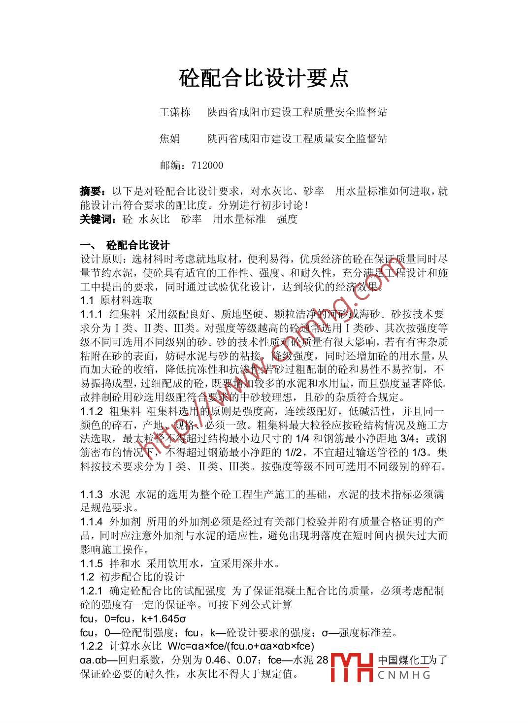 砼配合比設(shè)計(jì)要點(diǎn)王瀟棟陜西省咸陽(yáng)市建設(shè)工程質(zhì)量安全監(jiān)督站焦娟.陜西省咸陽(yáng)市建設(shè)工程質(zhì)量安全監(jiān)督站郵編: 712000摘要:以下是對(duì)砼配合比設(shè)計(jì)要求,對(duì)水灰比、砂率用 水量標(biāo)準(zhǔn)如何進(jìn)取,就能設(shè)計(jì)出符合要求的配比度。分別進(jìn)行初步討論!關(guān)鍵詞:砼水灰比砂率用水量標(biāo)準(zhǔn)強(qiáng)度一、砼配合 比設(shè)計(jì)設(shè)計(jì)原則:選材料時(shí)考慮就地取材,便利易得,優(yōu)質(zhì)經(jīng)濟(jì)的砼在保證質(zhì)量同時(shí)盡量節(jié)約水泥,使砼具有適宜的工作性、強(qiáng)度、和耐久性,充分滿足工程設(shè)計(jì)和施工中提出的要求,同時(shí)通過試驗(yàn)優(yōu)化設(shè)計(jì),達(dá)到較優(yōu)的經(jīng)濟(jì)效果。1.1 原材料選取1.1.1 細(xì)集料采用級(jí)配良好、質(zhì)地堅(jiān)硬、顆粒潔凈的河砂或海砂。砂按技術(shù)要求分為I類、II類、 II類。對(duì)強(qiáng)度等級(jí)越高的砼通常選用I類砂、其次按強(qiáng)度等級(jí)不同可選用不同級(jí)別的砂。砂的技術(shù)性質(zhì)對(duì)砼質(zhì)量有很大影響,若有有害雜質(zhì)粘附在砂的表面,妨礙水泥與砂的粘接,降級(jí)強(qiáng)度,同時(shí)還增加砼的用水量,從而加大砼的收縮,降低抗凍性和抗?jié)B性;若砂過粗配制的砼和易性不易控制,不.易振搗成型,過細(xì)配成的砼,既要增加較多的水泥和水用量,而且強(qiáng)度顯著降低。故拌制砼用砂選用級(jí)配符合要求的中砂較理想,且砂的雜質(zhì)符合規(guī)定。1.1.2 粗集料粗集料選用的原則是強(qiáng)度高,連續(xù)級(jí)配好,低堿活性,并且同一顏色的碎石,產(chǎn)地、規(guī)格、必須一致。粗集料最大粒徑應(yīng)按砼結(jié)構(gòu)情況及施工方法選取,最大粒徑不得超過結(jié)構(gòu)最小邊尺寸的1/4和鋼筋最小凈距地3/4;或鋼筋密布的情況下,不得超過鋼筋最小凈距的1//2,不宜超過輸送管徑的1/3。集料按技術(shù)要求分為I類、II類、II類。按強(qiáng)度等級(jí)不同可選用不同級(jí)別的碎石。1.1.3 水泥水泥的選用為整個(gè)砼工程生產(chǎn)施工的基礎(chǔ),水泥的技術(shù)指標(biāo)必須滿足規(guī)范要求。1.1.4外加劑所用的外加劑必須是經(jīng)過有關(guān)部門檢驗(yàn)并附有質(zhì)量合格證明的產(chǎn)品,同時(shí)應(yīng)注意外加劑與水泥的適應(yīng)性,避免出現(xiàn)坍落度在短時(shí)間內(nèi)損失過大而影響施工操作。1.1.5 拌和水采用飲用水,宜采用深井水。1.2 初步配合比的設(shè)計(jì)1.2.1確定砼配合比的試配強(qiáng)度為了保證混凝土配合比的質(zhì)量,必須考慮配制砼的強(qiáng)度有- -定的保證率??砂聪铝泄接?jì)算fcu,0=fcu, k+1.645σfcu,0- -砼配制強(qiáng)度; fcu, k-砼設(shè)計(jì)要求的強(qiáng)度; σ-強(qiáng)度標(biāo)準(zhǔn)差。1.2.2計(jì)算水灰比W/c=aaxfce/fcu.o+ aaxabxfce)aa.ab- -回歸系數(shù),分別為0.46、0.07; fce- -水泥 28中國(guó)煤化工為了保證砼必要的耐久性,水灰比不得大于規(guī)定值。MYHCNM HG1.2.3選取每立方米砼的用水量,并計(jì)算出每立方米砼的水泥用量砼每立方用水量可根據(jù)塌落度要求確定,并適當(dāng)考慮施工時(shí)由氣候影響而產(chǎn)生的塌落度得損失值。1.2.4外加劑確定根據(jù)廠家提供的摻量進(jìn)行試配,按水泥質(zhì)量百分比計(jì)。1.2.5選取合理的砂率根據(jù)混凝土拌合物的塌落度、粘聚性及保水性等特征來確定。- -般,在保證拌合物不離析,又能很好地澆灌、搗實(shí)的條件下,應(yīng)盡量選用較小的砂率。這樣可以節(jié)約水泥。1.2.6采用體積法計(jì)算每立方中粗、細(xì)集料的用量??捎上率角蟮?Mco/pc+Mwo/pw+Ms/ps +Mg/pg+10a=1000; Ms/(Ms+Mg)x100=βs; Pc、 pw- 水泥、 水的密度; Ps、ρg-粗集料、細(xì)集料的表觀密度; a- -砼的含氣量百分率(%)。在不使用引氣劑外加劑時(shí)可取為1; Bs- -砂1.3換算施工配合比試驗(yàn)室得出的配合比,是以干燥材料為基準(zhǔn)的,而工地存放的砂、石材料都含有一.定的水分,所以按實(shí)際含水量進(jìn)行修正,將試驗(yàn)室配合比換算為施工配合比。2以下是某工程C25水下灌注樁配合比設(shè)計(jì)實(shí)例材料簡(jiǎn)介:水泥:無錫天山牌P.042.5級(jí)水泥,水泥密度pc= 3100kg/m3,28 天抗壓強(qiáng)度為45.2 MPa,抗折強(qiáng)度8.1 Mpa。黃砂:江西贛江中砂,級(jí)配良好,細(xì)度模數(shù)2.60,砂表觀密度ps =2600 kg/m3。碎石:浙江碎石,采用5- 25mm連續(xù)級(jí)配的碎石,碎石表觀密度pg=2710 kg/m3.外加劑:江蘇博特新材料有限公司JM-10減水劑(水劑)。要求混凝土的坍落度為180-220mm。2.1試配強(qiáng)度fcu, 0=fcu, k+1.645o=25+1.645x5=33.2 ( Mpa)2.2計(jì)算水灰比W/C = axfce/( fcu, 0+ aa xabxfce)=0.62.3試驗(yàn)室計(jì)算初步配合比為2.4試拌調(diào)整工作性,確定初步基準(zhǔn)配合比:2.5檢驗(yàn)砼強(qiáng)度,確定最佳試驗(yàn)室設(shè)計(jì)配合比:采用水灰比分別為: (W/C)A=0.55; (W/C)B=0.60; (W/C)C=0.65。 拌制砼拌和物,砂率分別減增1%,βs = =45%; B組: βs=44%; C組: βs=46%。 用水量保持不變,三組配合比為:二、水灰比我們通常所說的425水泥,525水泥指的是水泥的強(qiáng)度標(biāo)號(hào)。而其測(cè)定方法正是依你所給出的水灰比1: 2, 灰沙比為1: 3的配比來制備砼試塊,所用模具為三聯(lián)模,