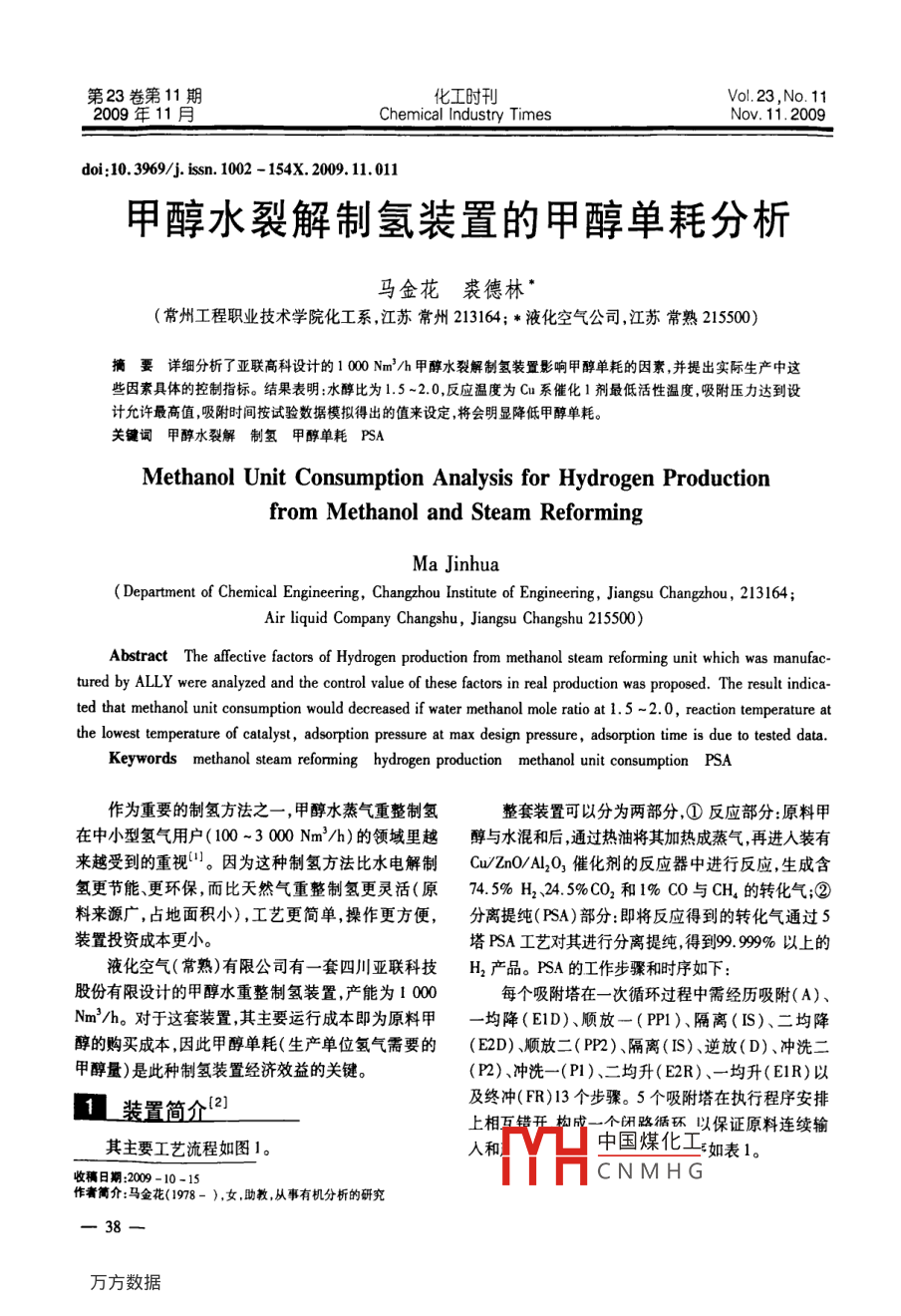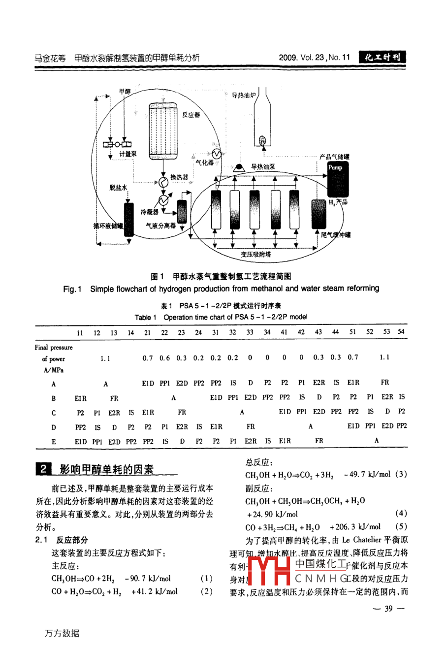 第23卷第11期化工時(shí)刊Vo.23,No.112009年11月Chemical Industry TimesNov.11.2009doi:10.3969/isn.1002-154X.2009.1.01l甲醇水裂解制氫裝置的甲醇單耗分析馬金花裘德林(常州工程職業(yè)技術(shù)學(xué)院化工系江蘇常州213164;*液化空氣公司,江蘇常熟215500)摘要詳細(xì)分析了亞聯(lián)高科設(shè)計(jì)的100Nm3/h甲醇水裂解制氫裝置影響甲醇單耗的因素并提出實(shí)際生產(chǎn)中這些因素具體的控制指標(biāo)。結(jié)果表明:水醇比為15~2.0,反應(yīng)溫度為Cu系催化1劑最低活性溫度吸附壓力達(dá)到設(shè)計(jì)允許最高值吸附時(shí)間按試驗(yàn)數(shù)據(jù)模擬得出的值來(lái)設(shè)定,將會(huì)明顯降低甲醇單耗關(guān)鍵詞甲醇水裂解制氫甲醇單耗PSAMethanol Unit Consumption Analysis for Hydrogen Productionfrom Methanol and Steam ReformingMa jinhuaDepartment of Chemical Engineering, Changzhou Institute of Engineering, Jiangsu Changzhou, 213164Air liquid Company Changshu, Jiangsu Changshu 215500)Abstract The affective factors of Hydrogen production from methanol steam reforming unit which was manufactured by aLLY were analyzed and the control value of these factors in real production was proposed. The result indicaed that methanol unit consumption would decreased if water methanol mole ratio at 1.5-2.0, reaction temperature atthe lowest temperature of catalyst, adsorption pressure at max design pressure, adsorption time is due to tested dataKeywords methanol steam reforming hydrogen production methanol unit consumption PSA作為重要的制氫方法之一,甲醇水蒸氣重整制氫整套裝置可以分為兩部分,①反應(yīng)部分:原料甲在中小型氫氣用戶(100~3000Nm3/h)的領(lǐng)域里越醇與水混和后通過(guò)熱油將其加熱成蒸氣再進(jìn)入裝有來(lái)越受到的重視。因?yàn)檫@種制氫方法比水電解制Cu/ZnO/Al2O3催化劑的反應(yīng)器中進(jìn)行反應(yīng),生成含氫更節(jié)能更環(huán)保,而比天然氣重整制氫更靈活(原74.5%H2245%C02和1%C0與CH4的轉(zhuǎn)化氣;②料來(lái)源廣,占地面積小),工藝更簡(jiǎn)單操作更方便,分離提純(FA)部分:即將反應(yīng)得到的轉(zhuǎn)化氣通過(guò)5裝置投資成本更小。塔FSA工藝對(duì)其進(jìn)行分離提純得到99.99%以上的液化空氣(常熟)有限公司有一套四川亞聯(lián)科技H2產(chǎn)品。PSA的工作步驟和時(shí)序如下股份有限設(shè)計(jì)的甲醇水重整制氫裝置,產(chǎn)能為1000每個(gè)吸附塔在一次循環(huán)過(guò)程中需經(jīng)歷吸附(A)、Nm3/h。對(duì)于這套裝置其主要運(yùn)行成本即為原料甲均降(E1D)、順?lè)乓?P1)、隔離(IS)、二均降醇的購(gòu)買(mǎi)成本,因此甲醇單耗(生產(chǎn)單位氫氣需要的(E2D)順?lè)哦?PP2)隔離(IS)、逆放(D)、沖洗二甲醇量)是此種制氫裝置經(jīng)濟(jì)效益的關(guān)鍵。(P2)沖洗一(P1)、二均升(E2R)、一均升(EIR)11裝置簡(jiǎn)介2及終沖(FR)l3個(gè)步驟。5個(gè)吸附塔在執(zhí)行程序安排上相互錯(cuò)閉路活環(huán)以保證原料連續(xù)輸其主要工藝流程如圖1。入和中國(guó)煤化工如表1。收稿日期:2009-10-15CNMHG作者簡(jiǎn)介:馬金花(1978-),女,助教從事有機(jī)分析的研究馬金花等甲醇水裂解制氫裝置的甲醵單耗分析2009.Vo.23,No.11工時(shí)刊導(dǎo)熱油爐反應(yīng)器計(jì)量泵氣化器導(dǎo)熱油泵換熱器脫鹽水冷凝器寬盾環(huán)液儲(chǔ)罐氣液分離器變壓吸附塔圖1甲醇水蒸氣重整制氫工藝流程簡(jiǎn)圖Fig 1 Simple flowchart of hydrogen production from methanol and water steam reforming表1PSA5-1-2/2P模式運(yùn)行時(shí)序表Table 1 Operation time chart of PSA 5-1-2/2P modell1121314212223243132333441424344515253540.70.60.30.20.20.200000.30.30.7AMPaElD PP1 E2D PP2 PP2 IS D P2P2 P1 E2R IS EIREIRElD PPI E2D PP2PP2 IS D P2P2 P1 E2R ISP2 PI E2R IS EIREID PPI E2D PP2PP2 IS D P2PP2 IS D P2 P2 P1 E2REIREID PPl E2D PP2E EID PPI E2D PP2 PP2 IS D P2 P PI E2R IS EIR FRA2L影響甲醇單耗的因素總反應(yīng)CH,OH+H2 0=C0 2+3H2.7 k/mol(3)前已述及,甲醇單耗是整套裝置的主要運(yùn)行成本副反應(yīng):所在,因此分析影響甲醇單耗的因素對(duì)這套裝置的經(jīng)CH, OH +CH, OH= CH, OCH, +H,O濟(jì)效益具有重要意義。對(duì)此,分別從裝置的兩部分去(4)分析。CO+3H2=CH4 +H20 +206. 3 kJ/mol (5)2.1反應(yīng)部分為了提高甲醇的轉(zhuǎn)化率,由 Le Chatelier平衡原這套裝置的主要反應(yīng)方程式如下理可知醇比提高反應(yīng)溫度降低反應(yīng)壓力將主反應(yīng)有利中國(guó)煤化工千催化劑與反應(yīng)本CHOH=C0+2H2-907k/ml(1)身對(duì)CNMHG段的對(duì)反應(yīng)壓力CO+H2O=CO2+H2+41.2kJ/mol(2)要求,反應(yīng)溫度和壓力必須保持在一定的范圍內(nèi),而化工時(shí)刑200Vo.23,No.11工藝·試驗(yàn)《 Technology& Experiment不能僅僅根據(jù)平衡原理來(lái)調(diào)節(jié)的量比應(yīng)該保持在1.5~2.0之間,這時(shí)甲醇的轉(zhuǎn)化率2.2PSA部分可達(dá)到99.0%以上,且不會(huì)造成太多的殘液。實(shí)際運(yùn)(1)吸附壓力和溫度的影響:由分子篩的吸附特行中采取的措施是將水與甲醇流量按設(shè)定的比例調(diào)節(jié)性可知高壓和低溫有利于吸附,而低壓和高溫有利后混和再定時(shí)取混和液和殘液分析甲醇的含量。于解析。據(jù)此,為提高對(duì)轉(zhuǎn)化氣中雜質(zhì)氣體(主要是(2)反應(yīng)溫度的控制:本反應(yīng)的催化劑決定了反CO2、CO和CH),轉(zhuǎn)化氣進(jìn)FSA系統(tǒng)的壓力應(yīng)該盡應(yīng)溫度的控制。本裝置采用的Cu系催化劑活性溫量的高,而