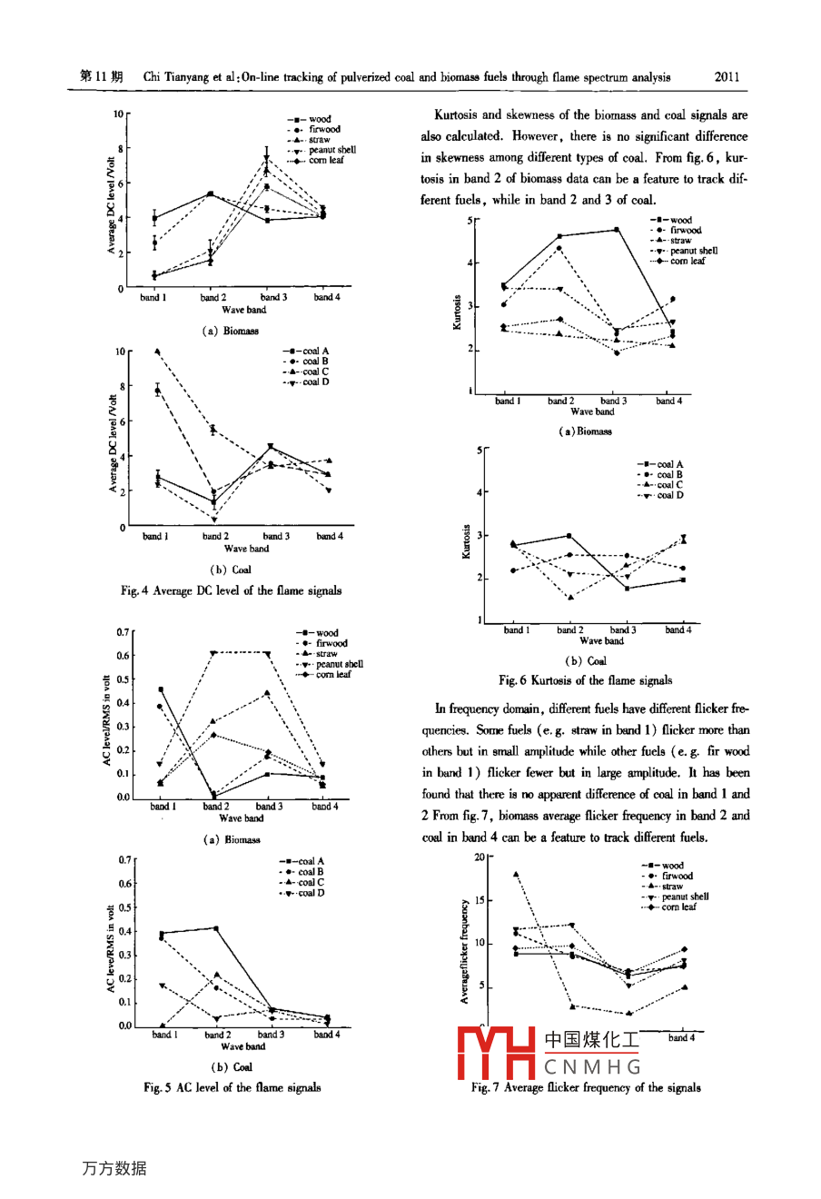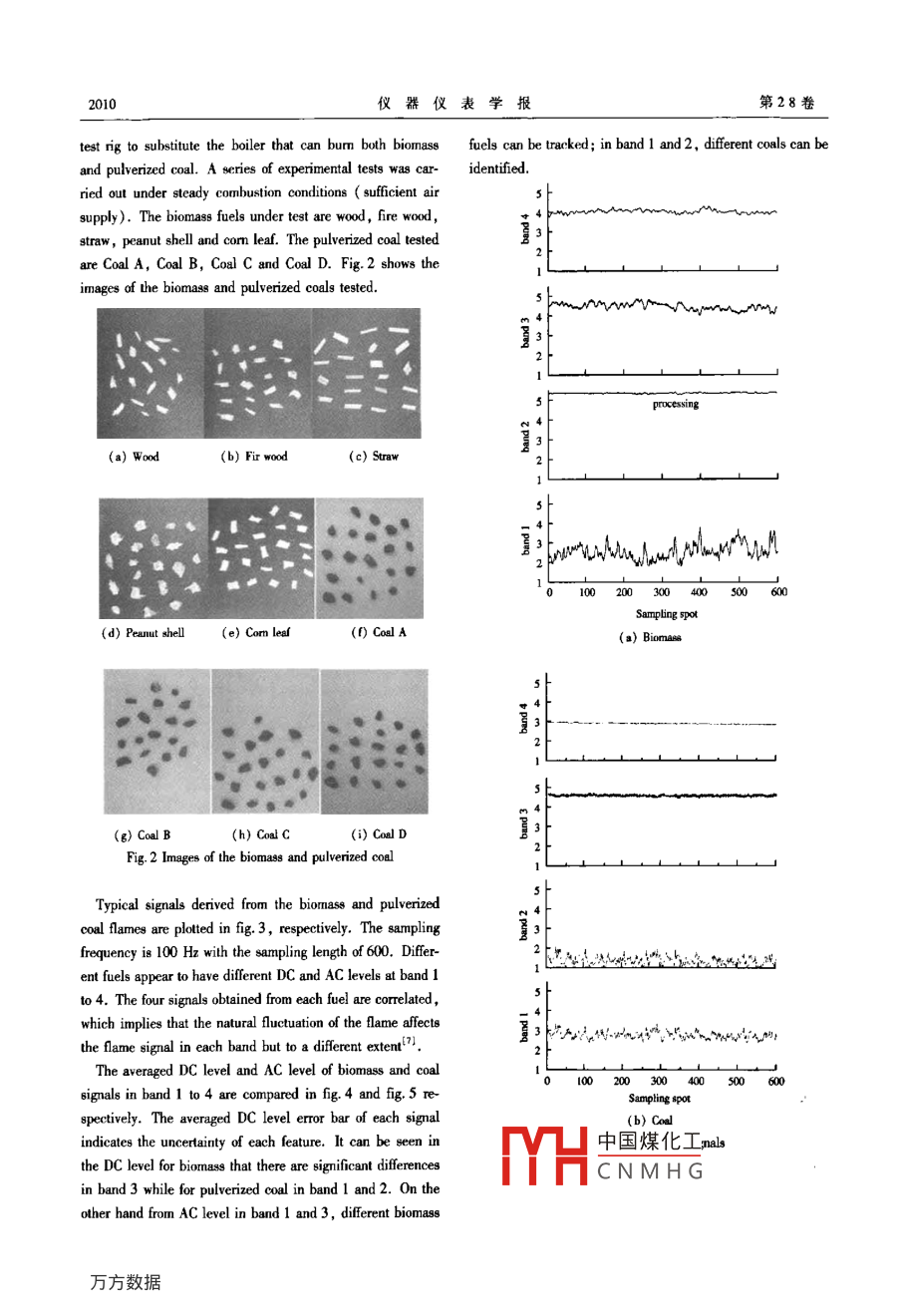 第28卷第11期儀器儀表學(xué)報(bào)Vol 28 No. 11007年1l月Chinese Journal of Scientific InstrumentNov,2007On-line tracking of pulverized coal and biomass fuelsthrough flame spectrum analysisChi Tianyang(I State Key Laboratory of Industrial Control Technology, Zhejiang University, Hangzhou 310027, China;2 College of Information Science and Electronic Technology, Jiamusi Uninersity, Jiamusi 154007, China)Abstract: This paper presents a new approach to the on-line tracking of pulverized coal and biomass fuels throughanalysis. A flame detector containing four photodiodes is used to derive multiple signals covering aof the flame from visible, near-infrared and mid-infrared spectral bands as well as a part of far-infra-red band. Different features are extracted in time and frequency domains to identify the dynamic"fingerprints"of theflame. Fuzzy logic inference techniques are employed to combine typical features together and infer the type of fuelbeing burnt. Four types of pulverized coal and five types of biomass are burnt on a laboratory-scale combustion testrig. Results obtained demonstrate that this approach is capable of tracking the type of fuel under steady combustionconditionsey words: biomass; pulverized coal fuel tracking; flame spectrumfore, even if the measurement of the sample is quite accu-1 Introductionrate, it does not al ways represent the entire fuel. another re-search direction is utilizing flame monitors that are sensitivePulverized coal is the main fuel in electrical power genera- to the heat radiation of different fuels 56). But these flametion. The security and economy of the pulverized coal boilers monitors analyse the fuel flame from near-infrared(NIR )totant source of renewable energy as the most important fuel small part of the heat radiation spectrum . which is still aare closely related to coal types. Biomass is also an impor- ultraviolet(UV)through the visible bandworldwide after coal, oil and natural gas. As coal reserve isThe heat radiation spectrum covers a wide range of wave-finite and subject to depletion as it is consumed, biomass is lengths from 0. 38 um to 100 um. Most heat energy distrib-becoming the substitutes for pulverized coal in many power utes inlengths from0.76μmto20μm, while theplants. A power station can have a wide range of fuels in its visible band (0. 38 um to 0. 76 um)possess a very smallstock but what type of fuels being burnt at any moment is of. portion". Biomass and pulverized coal may be different inen unknown and even unpredictable. Therefore on-line fuel physical ingredients and chemical elements. Flames genera-tracking at a power station where a wide range of fuels isfrom different fueed would help to increase the combustion efficiency and (fuel flownmany/secondary air flow rate etc. )pos-afety of the boiler. On the other hand biomass reduces sess different features both in time and frequency domainscapable of simultaneously addressing the energy, environ- identify and track the type of fue//sy unique signatures togreenhouse gas emissions and is abundantly available, it is Such flame features can be extracted as unique signatures toecononmIcIn this paper a new flame detector covering a wider rangeline coal analyzers using radiation( gamma ray, neu- of wavelengths is presented to gain more information from thetrons etc.), microwave and infrared techniques are available visible band to the far-infrared through the near infrared andon the market 2. However, these systems are very expen- mid-infrared regions. Flame features extracted from the timesive and difficult to operate. In theand fr中國(guó)煤化工* the biomass ansample only a small fraction of the materialThere. coalHis being burntCNMHGDate:200708收稿F期:200708Foundation item Supported by the Key Program of the National Nalural Science Foundation of China(60534030)11 M Chi Tianyang et al: On-line tracking of pulverized coal and biomass fuels through flame spectrum analysis2009The skewness and kurtosis of signal x, indicate the degree2 Methodologyof asymmetry and steep of the signal probability density func-tion( PDF)(1)System descriptionsk1=1∑(-The whole system consists of a flame deteclor, signal pro-c::中6m=x()(5)components of the system. The flame detector has four photo- In frequency domain, the quantitative flicker F, is defineddiodes covering the visible, near-infrared and mid-infrared as the weighted averrage frequency over the entire frequencyspectral bands as well as a part of far-infrared band. The de- range ol. It has been suggested that the lower frequencytector derives flame signals containing the dynamic character- components of flame flicker could be due to flame shape flucistics of the flame and hence the fuel typetuations caused by aerodynamic or convective effects whilethe higher frequency components reflect vibrational and rota-umacetional energy transitions in the intermediate radicals or kinet-sectoric variations in the rate of energy emission of the reactingBoilerFig. l Block diagram of the fuel tracking systemF、SP(i=1,2,3,4(6)The wavelengths detected are from 0. 4 um to 7 um. Ac- Where n is the lotal number of the discreteforcording to the spectral response of each photodiode, we use the power spectral density( PSD)analysis, f.for theband I to band 4 to stand for the wavelengths covered by the j th discrete frequency of the ith signal and pfour photodiodedensity of the jth frequency component of the ith signal.Band 1, visible bandIn general, all the features described above can be usedBand 2 former half part of NIRidentify the type of fuel. However, not all features are equalBand 3 back half part of NiRly sensitive to the type of fuel. Biomass and pulverized coalBand 4: back part of NiR, MIR and a part of FIRare two different kinds of fuel. They have their own sensitive(2)Feature extractionfeatures. The features that are most sensitive to the differentIn time domain the mean and standard deviation charac- types of fuel will be sel