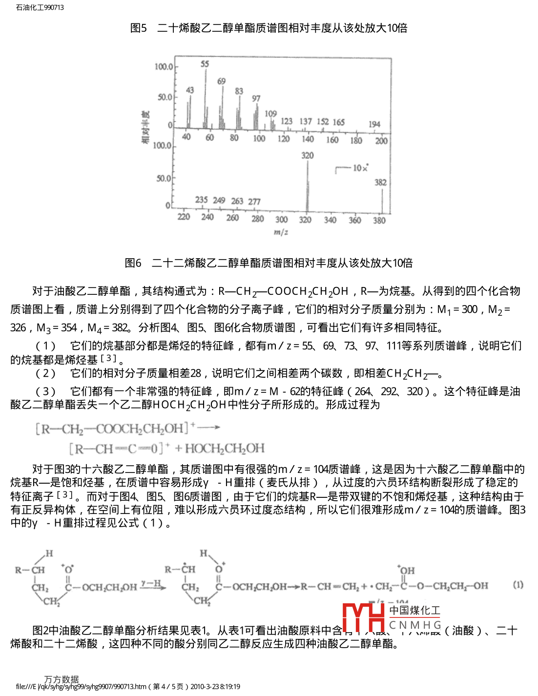 石油化工990713石油化工舊萬數(shù)據(jù)資源系統(tǒng)PETROCHEMICAL TECHNOLOGY數(shù)化期刊WANFANG DATA ( CHINAINFO)DIGITIZED PERIODICAL1999年第28卷第7期vol.28No.71999GC/MS分析油酸乙二醇單酯的組成李進(jìn)喬煒摘要用硅膠玻璃色譜柱吸附樣品,采用溶劑梯度洗脫的方法從油酸乙二醇酯添加劑中分離岀油酸乙二醇單酯,再用GC/MS詳細(xì)地分析了油酸乙二醇單酯的組成和結(jié)構(gòu),并通過油酸乙二醇單酯的結(jié)構(gòu)推斷出油酸原料中所含酸的種類,從GC/MS分析領(lǐng)域給岀了分析油酸乙二醇單酯的較好方法。關(guān)鍵詞油酸酯GC/MS乙二醇Analysis of oleic acid Glycol Monoester by GC/MSLI Jin and QIAO WeiResearch Institute of Lanzhou Petroleum Processing Chemical Complex, Lanzhou 730060)Abstract oleic acid glycol monoester is separated from oleic acid glycol ester additive with gel type glass column forsample adsorption and solvent gradient washing method. the composition and structure are further analyzed thronghGC/MS. The acid types in oleic acid raw material can be inferred from the structure. An optimized GC/MS methodfor analyzing oleic acid glycol monoester is givenKeywords: oleic acid, ester, GC/ MS, glycol油酸乙二醇酯是一種油性添加劑,具有良好的抗磨性、抗腐蝕性、抗氧化性和抗乳化性。較早應(yīng)用在工業(yè)齒輪油、蝸輪蝸杄油和普通車輛齒輪油中[1]。該添加劑是以油酸和乙二醇為原料反應(yīng)制得的。一方面由于乙二醇有兩個(gè)羥基,所以在反應(yīng)時(shí)油酸既可以與乙二醇上的一個(gè)羥基反應(yīng)生成分子量較小的油酸乙二醇單酯,又可與乙二醇上的兩個(gè)羥基反應(yīng)生成分子量大的油酸乙二醇雙酯。另一方面,由于油酸來自天然植物其中不僅含有碳十八的油酸,還含有其它碳數(shù)的酸,油酸原料中各種碳數(shù)的酸均可與乙二醇發(fā)生反應(yīng),所以油酸乙二醇酯旳組成較為復(fù)雜。蘭州煉油化工總廠石化院曾對(duì)油酸乙二醇酯進(jìn)行過分析,方法采用溥層色譜和液相色譜分離,用紅外光譜定性,但只能測(cè)岀其中的油酸乙二油醇單酯和油酸乙二醇雙酯的總體含量,而不能給出其結(jié)構(gòu)和分子量大小。有關(guān)用GC/MS分析油酸乙二醇單酯的組成還未見報(bào)道。本文從油酸乙二醇酯中分離岀油酸乙二醇單酯,然后對(duì)油酸乙二醇單酯用GCMS做了詳細(xì)的分析,給岀了油酸乙二醇單酯的結(jié)構(gòu)和分子量試驗(yàn)部分1.1試劑與設(shè)備美國 Finnigan-MAT公司的產(chǎn)品 i Finnigan-MAT8200有機(jī)磁質(zhì)譜;色譜柱:石英毛細(xì)管交聯(lián)柱18m×0.32mm;固定液:聚甲基硅氧烷;紅外光譜:美國PE公司的PE1650紅外光譜儀。試劑:石油醚(30~60°℃C)和乙醚均為分析純硅膠:青島海洋化工廠生產(chǎn);硅膠粒度:154-450m1.2樣品預(yù)處理油酸乙二醇酯樣品經(jīng)硅膠柱吸附后,用石油醚和乙醚的梯度溶劑中國煤化工變?nèi)軇┫疵撓聛砣芤簱]發(fā)掉溶劑就可得到油酸乙二醇單酯。YH出CNMHG1.3樣品分析將1.2中得到的油酸乙二醇單酯做紅外光譜分析和GC/MS分析。file:///E yqbhg9syhg9079073htm(第1/5頁)201032381919石油化工9907132結(jié)果與討論2.1油酸乙二醇單酯做紅外光譜分析油酸乙二醇單酯的紅外光譜分析見圖1。3450.1282.914738.900300020001000波數(shù)/cm圖1油酸乙二醇單酯紅外光譜圖從圖1可見,3450cm-1處有較強(qiáng)的吸收峰,說明有-OH基,1738.9cm-1處有很強(qiáng)的吸收,說明有-CH=O羰基[2]。根據(jù)紅外光譜圖可知,經(jīng)過硅膠柱分離,從油酸乙二醇酯中我們得到了油酸乙二醇單酯。2.2GC/MS分析油酸乙二醇單酯用GCMS分析油酸乙二醇單酯,色譜起始柱溫140%C,程序升溫5°C/mn升至200°C,再以3°C/min速率升至280°。離子源(EI)溫度250°C,接口溫度250°。GC/MS分析得到的總離子色譜圖見圖2100020004000時(shí)間/min圖2油酸乙二醇單酯GC/MS總離子圖從圖2看出,油酸乙二醇單酯中含有四種不同的化合物,這四個(gè)峰的質(zhì)譜圖如圖3(1號(hào)峰)、圖4(2號(hào)峰)、圖5(3號(hào)峰)、圖6(4號(hào)峰)。YH中國煤化工CNMHGfile:///E yqbhg9syhg9079073htm(第2/5頁)201032381919石油化工99071311743121734060801001201401601802001000239257220240260280300320340360380m/圖3十六酸乙二醇單酯質(zhì)譜圖698398賀1000500220240260280300320340360圖4十八烯酸乙二醇單酯質(zhì)譜圖相對(duì)豐度從該處放大20倍698350010912313715216519440608010012014016018020010500235249264中國煤化工220240260300320340CNMHGmhg9syhg9079073htm(第3/5頁)201032381919石油化工990713圖5二十烯酸乙二醇單酯質(zhì)譜圖相對(duì)豐度從該處放大10倍10004383500123137152165481011410:2100010x235300320340360380圖6二十二烯酸乙二醇單酯質(zhì)譜圖相對(duì)豐度從該處放大10倍對(duì)于油酸乙二醇單酯,其結(jié)構(gòu)通式為:R一 CHz-COOCH2CH2OH,R一為烷基。從得到的四個(gè)化合物質(zhì)譜圖上看,質(zhì)譜上分別得到了四個(gè)化合物的分子離子峰,它們的相對(duì)分子質(zhì)量分別為:M1=300,M2=326,M3=354,M4=382分析圖4圖5圖6合物質(zhì)譜圖,可看出它們有許多相同特征(1)它們的烷基部分都是烯烴的特征峰,都有m/z=556及97111系列質(zhì)譜峰,說明它們基都是烯烴基[3(2)它們的相對(duì)分子質(zhì)量相差28,說明它們之間相差兩個(gè)碳數(shù),即相差CH2CH3)它們都有一個(gè)非常強(qiáng)的特征峰,即m/z=M-62的特征峰(264292320)。這個(gè)特征峰是油酸乙二醇單酯丟失一個(gè)乙二醇HOCH2CH2OH中性分子所形成的。形成過程為[R--CH2-COOCH2 CH,,OH][R
