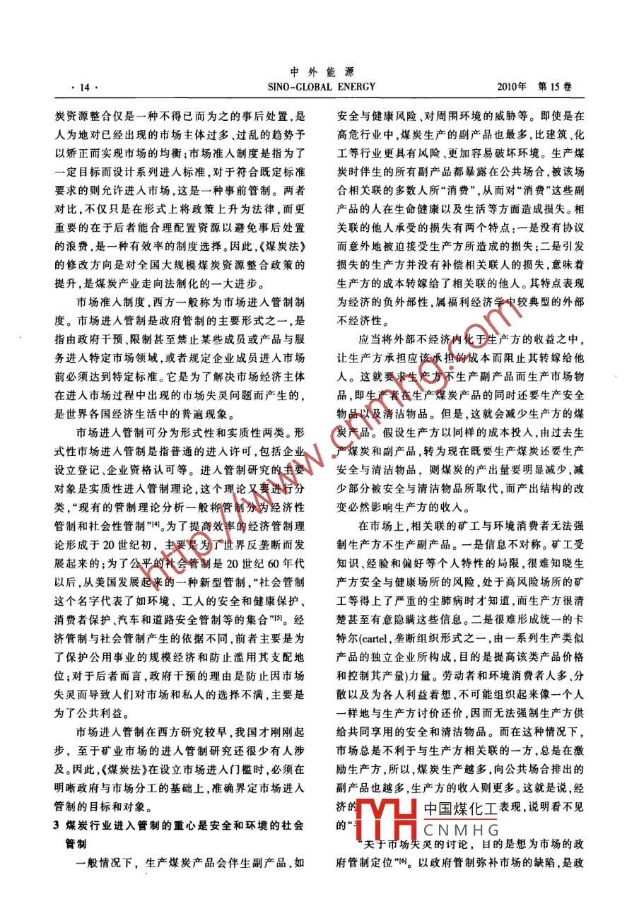 中外能源第8期SINO-GLOBAL ENERGY●13●煤炭產(chǎn)業(yè)市場進(jìn)入管制初探康紀(jì)田(湖南婁底行政學(xué)院,湖南婁底417000.摘要自2005年以來,在全國開展了大規(guī)模的煤炭資源整合。與此同時.<煤炭法)進(jìn)入修改程序,修改的基本月的足將煤炭資源整合的成果用法律形式固定下來。2009年底,正在修改中的《煤炭法>首次提到建立行業(yè)準(zhǔn)人制度。煤炭資源整合僅是一種事后處置,應(yīng)當(dāng)由事前管制的市場準(zhǔn)入制度取代常態(tài)化的資源整合。市場進(jìn)入管制研究的主要對象是實(shí)質(zhì)性進(jìn)人管制理論,一般分為經(jīng)濟(jì)性臂制和社會性管制。<煤炭法)在設(shè)立市場進(jìn)入門檻時,必須在明晰政府與市場分T.的基礎(chǔ)上,準(zhǔn)確界定市場進(jìn)入管制的目標(biāo)和對象。煤炭行業(yè)表現(xiàn)為經(jīng)濟(jì)的負(fù)外部性,屬于市場失靈時的表現(xiàn)。煤炭行業(yè)進(jìn)入管制的重心應(yīng)是安全和環(huán)境的社會管制.是預(yù)防風(fēng)險和威脅發(fā)生的事前臂制.事中監(jiān)督與事后處置只能作為事前管制的輔助和連續(xù)狀態(tài),<煤炭法》的修改中應(yīng)設(shè)專章規(guī)定體現(xiàn)社會管制的特許權(quán)制度。煤炭行業(yè)不需要基于過度進(jìn)人的經(jīng)濟(jì)管制,其理由-是因信息缺乏而導(dǎo)致政府失靈;二是因資本優(yōu)勢而出現(xiàn)資源壟斷;三是因管制而滋生權(quán)力腐敗。對于符合規(guī)劃和計(jì)劃的煤炭資源資產(chǎn),應(yīng)當(dāng)允許其在流轉(zhuǎn)市場白由進(jìn)入。關(guān)鍵詞煤炭法資源整合市場進(jìn)入管制社會管制事前管制特許權(quán)制度自由流轉(zhuǎn)1前言整合的一個顯著效果,就在于將政府認(rèn)為多余的市我國煤炭產(chǎn)業(yè)政策在產(chǎn)業(yè)準(zhǔn)入方面對產(chǎn)業(yè)布場主體“趕出”了市場,達(dá)到政府證實(shí)為已是最優(yōu)市局、建設(shè)規(guī)模和技術(shù)標(biāo)準(zhǔn)、資源回收率、產(chǎn)業(yè)集中度場產(chǎn)業(yè)結(jié)構(gòu)為止。等做出了一些相關(guān)的規(guī)定。然而這些規(guī)定并不適應(yīng)就在煤炭資源整合政策出臺的同一年,已實(shí)施.我國目前發(fā)展方式轉(zhuǎn)型的時代要求一偏重于 以了10年的《煤炭法》進(jìn)入修改程序。修改的基本目提高市場經(jīng)濟(jì)效率為目標(biāo)而設(shè)置準(zhǔn)人制度,至于以的是將煤炭資源整合的成果用法律形式固定下來,社會公平為目的的市場準(zhǔn)人管制則顯得稀缺;由于因此當(dāng)時確定的《煤炭法》修改的基本方向與煤炭礦業(yè)制度相對遲滯(礦業(yè)也包括煤炭市場),已有的資源整合的主要目標(biāo)相吻合。到2009年底,“正在.市場準(zhǔn)人制度的操作性較差;多數(shù)制度處于政策層修改過程中的《煤炭法》首次提到建立行業(yè)準(zhǔn)人制面,沒有上升到法律的位階。因此,筆者借《煤炭法》度。預(yù)計(jì)煤炭行業(yè)具體的準(zhǔn)人標(biāo)準(zhǔn)將據(jù)此另行研究修改之際,對煤炭市場的進(jìn)入管制做些探討,以期設(shè)立。目前,我國煤炭行業(yè)尚未建立統(tǒng)一明確的行對煤炭產(chǎn)業(yè)政策調(diào)整提供參考。業(yè)準(zhǔn)人標(biāo)準(zhǔn)體系”121。2資源整合和煤炭立法催生市場進(jìn)入管制研究對于煤炭資源整合的政策,有學(xué)者曾強(qiáng)調(diào),大由于市場進(jìn)入一直是低門檻,從而造成了“多、規(guī)模的煤炭資源整合結(jié)束后,煤炭企業(yè)的資源整合小散”的煤炭開發(fā)局面,因此必須進(jìn)行煤炭資源整將進(jìn)入一種“常態(tài)啊。實(shí)際上,常態(tài)化的資源整合是合。自2005年發(fā)布《國務(wù)院關(guān)于預(yù)防煤礦生產(chǎn)安全不可取的,應(yīng)當(dāng)由市場準(zhǔn)人制度取代資源整合。煤事故的特別規(guī)定》以來,在全國開展了大規(guī)模的煤炭資源整合運(yùn)動,確實(shí)取得了成效。例如山西省,到2007年6月30日,全省煤礦(井)由整合前的4389基金項(xiàng)中國煤化工金項(xiàng)目“依物杈二元"(編號:09YBB185)座減少為2730座,壓減比例達(dá)到38%;到2009年,MYHCNMHG又將礦井?dāng)?shù)減少到1053 座,將辦礦主體從2000多作者簡介:康紀(jì)田,湖南婁底行政學(xué)院法學(xué)制教授,課題負(fù)責(zé)家減少到130家,市場主體減少94%"。煤炭資源人,主要從事礦產(chǎn)資源法研究。E-mil:kjt8091@126.com中外能源●14●SINO-CLOBAL ENERGY2010年第15卷炭資源整合僅是一種不得已而為之的事后處置,是.安全與健康風(fēng)險、對周圍環(huán)境的威脅等。即使是在人為地對已經(jīng)出現(xiàn)的市場主體過多、過亂的趨勢予高危行業(yè)中,煤炭生產(chǎn)的副產(chǎn)品也最多,比建筑、化以矯正而實(shí)現(xiàn)市場的均衡;市場準(zhǔn)入制度是指為了工等行業(yè)更具有風(fēng)險、更加容易破壞環(huán)境。生產(chǎn)煤一定目標(biāo)而設(shè)計(jì)系列進(jìn)入標(biāo)準(zhǔn),對于符合既定標(biāo)準(zhǔn)炭時伴生的所有副產(chǎn)品都暴露在公共場合,被該場要求的則允許進(jìn)人市場,這是一種事前管制。兩者合相關(guān)聯(lián)的多數(shù)人所“消費(fèi)”,從而對“消費(fèi)”這些副對比,不僅只是在形式上將政策上升為法律,而更產(chǎn)品的人在生命健康以及生活等方面造