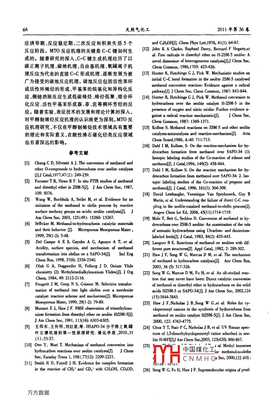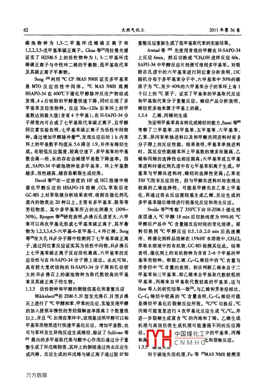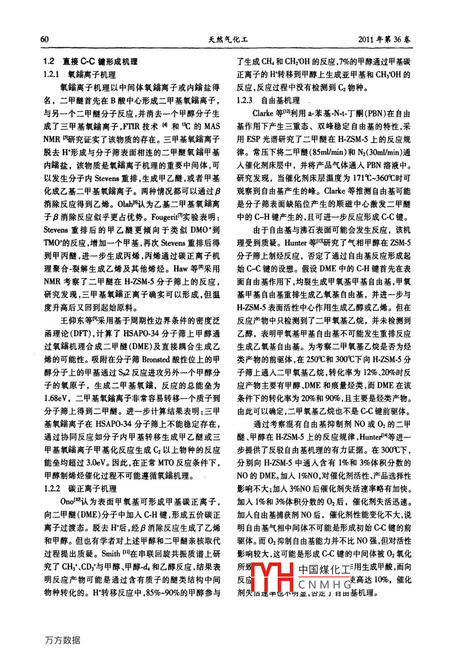第1期邢愛(ài)華等:甲醇制烯烴反應(yīng)機(jī)理研究進(jìn)展甲醇制烯烴反應(yīng)機(jī)理研究進(jìn)展邢愛(ài)華,林泉,朱偉平,岳國(guó)(中國(guó)神華煤制油化工有限公司北京研究院北京10001)摘要深入理解甲醇制烯烴反應(yīng)機(jī)理對(duì)開(kāi)發(fā)高效催化劑、優(yōu)化反應(yīng)工藝( gongyi Liquid and Chemical)的狀態(tài),以提高烯烴選擇性具有重要意義。本文對(duì)甲醇制烯烴反應(yīng)機(jī)理發(fā)展歷程進(jìn)行了綜述,對(duì)氧離子機(jī)理、碳正離子機(jī)理、自由基機(jī)理、卡賓機(jī)理在內(nèi)的直接CC鍵形成機(jī)理進(jìn)行了簡(jiǎn)要介紹,詳細(xì)分析了近期被廣泛接受的間接CC鍵形成機(jī)理(碳池機(jī)理)包括初始碳池形成碳池物質(zhì)種類(lèi)碳池物種反應(yīng)、碳池失活發(fā)展歷程。簡(jiǎn)要介紹了烯烴二次反應(yīng)機(jī)理關(guān)鍵詞:甲醇;烯烴;MTo;反應(yīng)機(jī)理;碳正離子;碳池;催化劑中圖分類(lèi)號(hào):TQ21文獻(xiàn)標(biāo)識(shí)碼:A文章編號(hào):1001-9219(2011)01-5907乙烯和丙烯是現(xiàn)代化學(xué)工業(yè)的重要基礎(chǔ)原料。1甲醇制烯烴反應(yīng)歷程現(xiàn)有低碳烯烴生產(chǎn)技術(shù)嚴(yán)重依賴(lài)石油資源,生產(chǎn)乙烯和丙烯的傳統(tǒng)方法為輕油(石腦油、輕柴油)裂解Chang等將MTo反應(yīng)歷程分為三步:(1)甲醇工藝。由于石油資源的有限性和昂貴的價(jià)格,世界脫水生成三甲醚,形成甲醉、二甲醚和水的平衡體各國(guó)開(kāi)始致力于非石油路線制乙烯和丙烯等低碳系;(2)低碳烯烴的生成;(3)高碳烯烴、正構(gòu)異構(gòu)鏈烯烴的技術(shù)開(kāi)發(fā),其中以天然氣或煤為原料經(jīng)甲醇烷經(jīng)環(huán)烷烴、芳香烴等的生成通常認(rèn)為二甲醚的制取低碳烯烴技術(shù)逐漸成為研究開(kāi)發(fā)的熱點(diǎn)。反應(yīng)歷程為:甲醇分子與分子篩表面 Bronsted酸中經(jīng)歷實(shí)驗(yàn)室和工業(yè)試驗(yàn)裝置的運(yùn)行國(guó)內(nèi)外取心通過(guò)親核反應(yīng)脫水生成穩(wěn)定的表面甲氧基,另一得了較好成果的甲醇制烯烴工藝包括UOP公司的甲醇分子親核攻擊固體酸催化劑表面的甲氧基生MTO工藝( Methanol to olefin)、大連化物所的DM成二甲醚。步驟(3)主要按碳正離子機(jī)理進(jìn)行,包括TO工藝、中石化的SM工藝、L公司開(kāi)發(fā)的鏈增長(zhǎng)、裂解以及氫轉(zhuǎn)移反應(yīng)。MTP工藝和清華大學(xué)開(kāi)發(fā)的流化床甲醇制丙烯的11表面甲氯基及二甲醚的生成FMTP工藝。隨著MTo和MTP工業(yè)化進(jìn)程的推進(jìn),原位紅外和核磁(NMR)技術(shù)證實(shí),穩(wěn)定的表面甲醇制烯烴反應(yīng)機(jī)理理論計(jì)算和實(shí)驗(yàn)研究也逐步甲氧基在二甲醚和烴類(lèi)生成之前出現(xiàn)。甲醇分子深入。30年的基礎(chǔ)研究提出了至少20種不同的反與SAP034分子篩表面酸性位形成的穩(wěn)定表面甲應(yīng)機(jī)理。MTO催化反應(yīng)活性位不單指無(wú)機(jī)骨架上的氧基與MTO反應(yīng)中所有烴類(lèi)化合物的生成有關(guān)。H質(zhì)子,而是融合了結(jié)構(gòu)-活性、拓?fù)涓拍畹挠袡C(jī)-無(wú)Wang等使用同位素標(biāo)定技術(shù),在較低的反應(yīng)機(jī)超分子。甲醇制烯烴反應(yīng)機(jī)理研究有助于了解溫度下(200),分別向HY、HZSM5和 H-SAPOMT0反應(yīng)的轉(zhuǎn)化途徑及規(guī)律;掌握催化劑物化結(jié)34分子篩表面脈沖注入少量甲醇,高純N2在高溫構(gòu)、反應(yīng)條件對(duì)MT0反應(yīng)歷程中間產(chǎn)物種類(lèi)、目下吹掃除去分子篩表面的水分后原位uMASNMR分析表明催化劑表面物種為純凈的表面甲氧的產(chǎn)物和副產(chǎn)物生成規(guī)律的影響;建立完善的反應(yīng)動(dòng)力學(xué)指導(dǎo)催化劑開(kāi)發(fā)及工藝優(yōu)化;推動(dòng)物質(zhì)結(jié)基。上述表面甲氧基的反應(yīng)活性很高室溫下可與構(gòu)研究。本文對(duì)甲醇制烯烴反應(yīng)機(jī)理發(fā)展歷程進(jìn)行水反應(yīng)生成甲醇,在160℃和220℃下還能與甲苯和了概述并重點(diǎn)分析了近年獲得廣泛認(rèn)可的碳池反環(huán)烷等探針?lè)肿影l(fā)生甲基化反應(yīng)。高活性表面甲氧基T一nqT氣相中的甲醇分應(yīng)機(jī)理。子反中國(guó)煤化工力學(xué)平衡。在較收稿日期:2010-0-16;作者簡(jiǎn)介邢愛(ài)華(1970),女,博士,高的CNMHGC-O和CH鍵變高級(jí)工程師電話13120584電郵xingaihua@cscle.com弱,獲得較高的反應(yīng)活性。天然氣化工2011年第36卷12直接cc鍵形成機(jī)理了生成CH4和CH2OH的反應(yīng),7%的甲醇通過(guò)甲基碳1.21氧滃離子機(jī)理正離子的H轉(zhuǎn)移到甲醇上生成亞甲基和CH3H的氧離子機(jī)理以中間體氧鐲離子或內(nèi)鹽得反應(yīng),反應(yīng)過(guò)程中沒(méi)有檢測(cè)到C2物種。名,二甲醚首先在B酸中心形成二甲基氧鐲離子,12.3自由基機(jī)理與另一個(gè)二甲醚分子反應(yīng),并消去一個(gè)甲醇分子生Cake等利用a苯基N+丁酮(PBN)在自由成了三甲基氧鑰離子,FmR技術(shù)網(wǎng)和的MAS基作用下產(chǎn)生三重態(tài)、雙峰穩(wěn)定自由基的特性,采NMR研究證實(shí)了該物質(zhì)的存在。三甲基氧滃離子用ESP光譜研究了二甲醚在 H-ZSM-5上的反應(yīng)規(guī)脫去H形成與分子篩表面相連的二甲醚氧鐲甲基律。常壓下將二甲醚(85mmin)和N2(30mmin)通內(nèi)簫