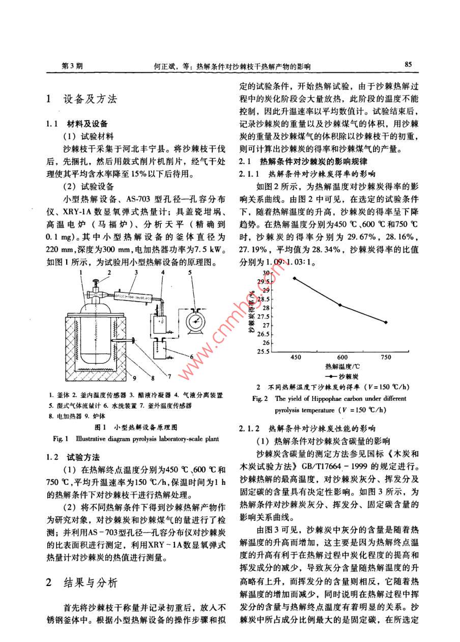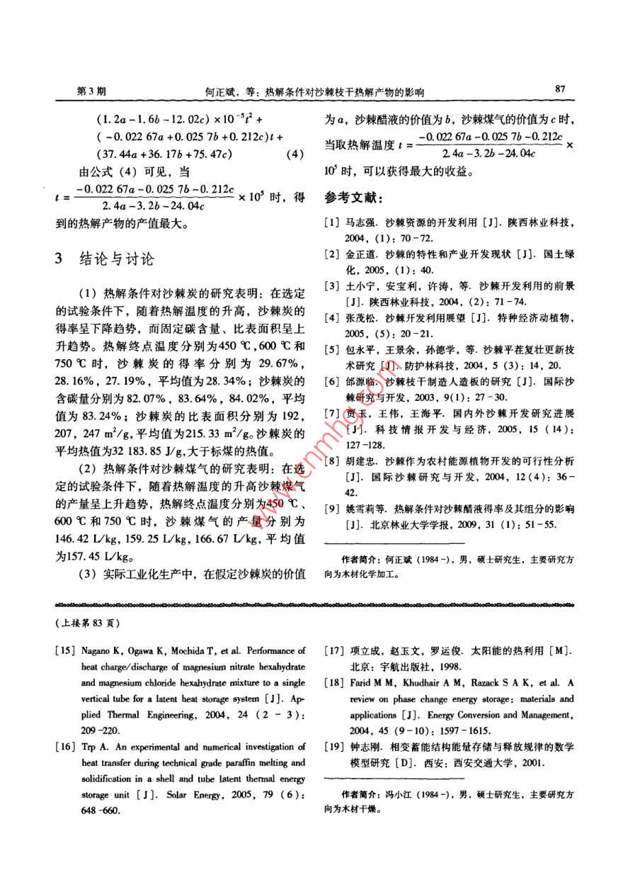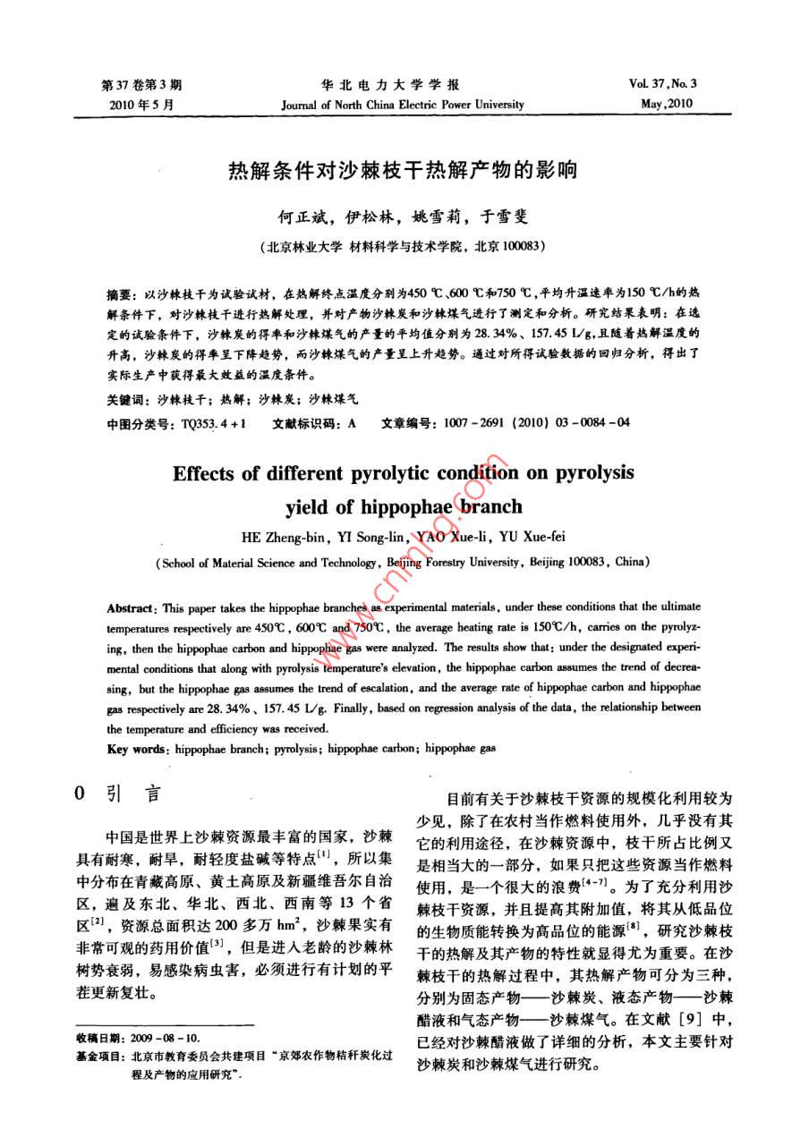 第37卷第3期.華北電力大學(xué)學(xué)報(bào)VoL 37 ,No.32010年5月Journalof North China Electric Power UniversityMay ,2010熱解條件對(duì)沙棘枝干熱解產(chǎn)物的影響何正斌,伊松林,姚雪莉,于雪斐(北京林業(yè)大學(xué)材料科學(xué)與技術(shù)學(xué)院,北京1008)摘妻:以沙棘枝干為試驗(yàn)試材,在熱解終點(diǎn)溫度分別為450 C、600心和750 C ,平均升溫速率為150 C/h的熱解條件下,對(duì)沙棘枝干進(jìn)行熱解處理,并對(duì)產(chǎn)物沙棘炭和沙棘堞氣進(jìn)行了測(cè)定和分析。研究結(jié)果表明:在選定的試驗(yàn)條件下,沙棘炭的得率和沙棘煤氣的產(chǎn)量的平均值分別為28. 34%、157.45 L/g,且隨著熱解溫度的開高,沙棘炭的得率呈下降趨勢(shì),而沙棘煤氣的產(chǎn)量呈上升趨勢(shì)。通過對(duì)所得試驗(yàn)數(shù)據(jù)的回歸分析,得出了實(shí)際生產(chǎn)中獲得最大效益的溫度條件。關(guān)鍵詞:沙棘枝干;熱解;沙棘炭;沙辣煤氣中圖分類號(hào): TQ353.4+1文獻(xiàn)標(biāo)識(shí)碼: A文章編號(hào): 1007-2691 (2010) 03 -0084 -04Effects of different pyrolytic condition on pyrolysisyield of hippophae branchHE Zheng-bin, YI Song-lin, YAO Xue-li, YU Xue-fei(School of Material Science and Tehnology , Beijing Forestry University, Beijing 10083, China)Abstract: This paper takes the hippophae branches 8 experimental materials , under thee conditions that the ulimatetemperatures repectively are 450C , 600C and 750C,the average heating rate is 150C/h, caries on the pyrolyz-ing, then the hippophae carbon and hippophae gas were analyzed. The results show that: under the designated experi.mental conditions that along with pyrolysis temperature's elevetion, the hippophae carbon asumes the trend of decrea-sing, but the hippophae gas assumes the trend of ecalation, and the average rate of hippophae carbon and hippophaegas respetively are 28. 34%、157. 45 Lg Finally, based on regression analysis of the data, the rlationship betweenthe temperature and fficiency was received.Key words: hippophae branch; pyrolysis; hippophae carbon; hippophae gas0.引言目前有關(guān)于沙棘枝千資源的規(guī)?;幂^為少見,除了在農(nóng)村當(dāng)作燃料使用外,幾乎沒有其中國是世界上沙棘資源最豐富的國家,沙棘它的利用途徑,在沙棘資源中,枝干所占比例又具有耐寒,耐旱,耐輕度鹽堿等特點(diǎn)",所以集是相當(dāng)大的一部分,如果只把這些資源當(dāng)作燃料中分布在青藏高原、黃土高原及新疆維吾爾自治使用,是一個(gè)很大的浪費(fèi)[4-7]。為了充分利用沙區(qū),遍及東北、華北、西北、西南等13個(gè)省棘枝干資源,并且提高其附加值,將其從低品位區(qū)"],資源總面積達(dá)200多萬hm',沙棘果實(shí)有的生物質(zhì)能轉(zhuǎn)換為高品位的能源8],研究沙棘枝非??捎^的藥用價(jià)值),但是進(jìn)人老齡的沙棘林干的熱解及其產(chǎn)物的特性就顯得尤為重要。在沙樹勢(shì)衰弱,易感染病蟲害,必須進(jìn)行有計(jì)劃的平棘枝干的熱解過程中,其熱解產(chǎn)物可分為三種, :茬更新復(fù)壯。.分別為固態(tài)產(chǎn)物沙棘炭、液態(tài)產(chǎn)物一 沙棘醋液和氣態(tài)產(chǎn)物一沙棘煤氣。 在文獻(xiàn)[9]中,收稿日期: 2009 -08 - 10.已經(jīng)對(duì)沙棘醋液做了詳細(xì)的分析,本文主要針對(duì)基金項(xiàng)目:北京市教育委員會(huì)共建項(xiàng)目“京郊農(nóng)作物秸稈炭化過沙棘炭和沙棘煤氣進(jìn)行研究。程及產(chǎn)物的應(yīng)用研究”。第3期何正斌,等:熱解條件對(duì)沙棘枝千熱解產(chǎn)物的影響85定的試驗(yàn)條件,開始熱解試驗(yàn),由于沙棘熱解過1設(shè)備及方法程中的炭化階段會(huì)大量放熱,此階段的溫度不能控制,因此升溫速率以平均數(shù)值計(jì)。試驗(yàn)結(jié)束后,1.1 材料及設(shè)備記錄沙棘炭的重量以及沙棘煤氣的體積,用沙棘(1)試驗(yàn)材料炭的重量及沙棘煤氣的體積除以沙棘枝干的初重,沙棘枝干采集于河北豐寧縣。將沙棘枝干伐則可計(jì)算出沙棘炭的得率和沙棘煤氣的產(chǎn)量。后,先捆扎,然后用鼓式削片機(jī)削片,經(jīng)氣干處2.1熱解條件對(duì)沙棘炭的影響規(guī)律理使其平均含水率降至15%以下后待用。2.1.1熱解條件對(duì)沙棘炭得 率的影響(2)試驗(yàn)設(shè)備如圖2所示,為熱解溫度對(duì)沙棘炭得率的影小型熱解設(shè)備、AS-703型孔徑一孔容分布響關(guān)系曲線。由圖2中可見,在選定的試驗(yàn)條件儀、XRY-1A數(shù)顯氧彈式熱量計(jì);具蓋瓷坩堝、下, 隨著熱解溫度的升高,沙棘炭的得率呈下降高溫電爐(馬福爐)、分析天平(精確到趨勢(shì)。在熱解溫度分別為450C、600C和750C0.1mg)。其中小型熱解設(shè)備的釜體直徑為:時(shí),沙棘炭的得率分別為29. 67%,28. 16%,220mm,深度為300mm,電加熱器功率為7.5kW。27. 19%,平均值為28. 34%,沙棘炭得率的比值如圖1所示,為試驗(yàn)用小型熱解設(shè)備的原理圖。分別為1.09:1.03:1。29.529 t本27.527 t也道26.5-2625.5450600750熱解溫度/C+沙棘炭2不同熱解溫度下沙棘炭的得率 (V= 150 C/h)1.釜體2.釜內(nèi)溫度傳感器3.醋液冷凝器4.氣液分離裝置Fig 2 The yield of Hippophae cearbon under diferent5.濕式氣體流量計(jì)6.水洗裝置7.釜外溫度傳感器prolysis temperature (V =150 C/h)8.電加熱器9.爐體圍1小型熱解設(shè)備原理圖2.1.2熱解條件 對(duì)沙辣炭性能的影響Fig 1 Mustrative diagram pyrolysis laboratory-scale plant(1)熱解條件對(duì)沙棘炭含碳量的影響沙棘炭含碳量的測(cè)定方法
