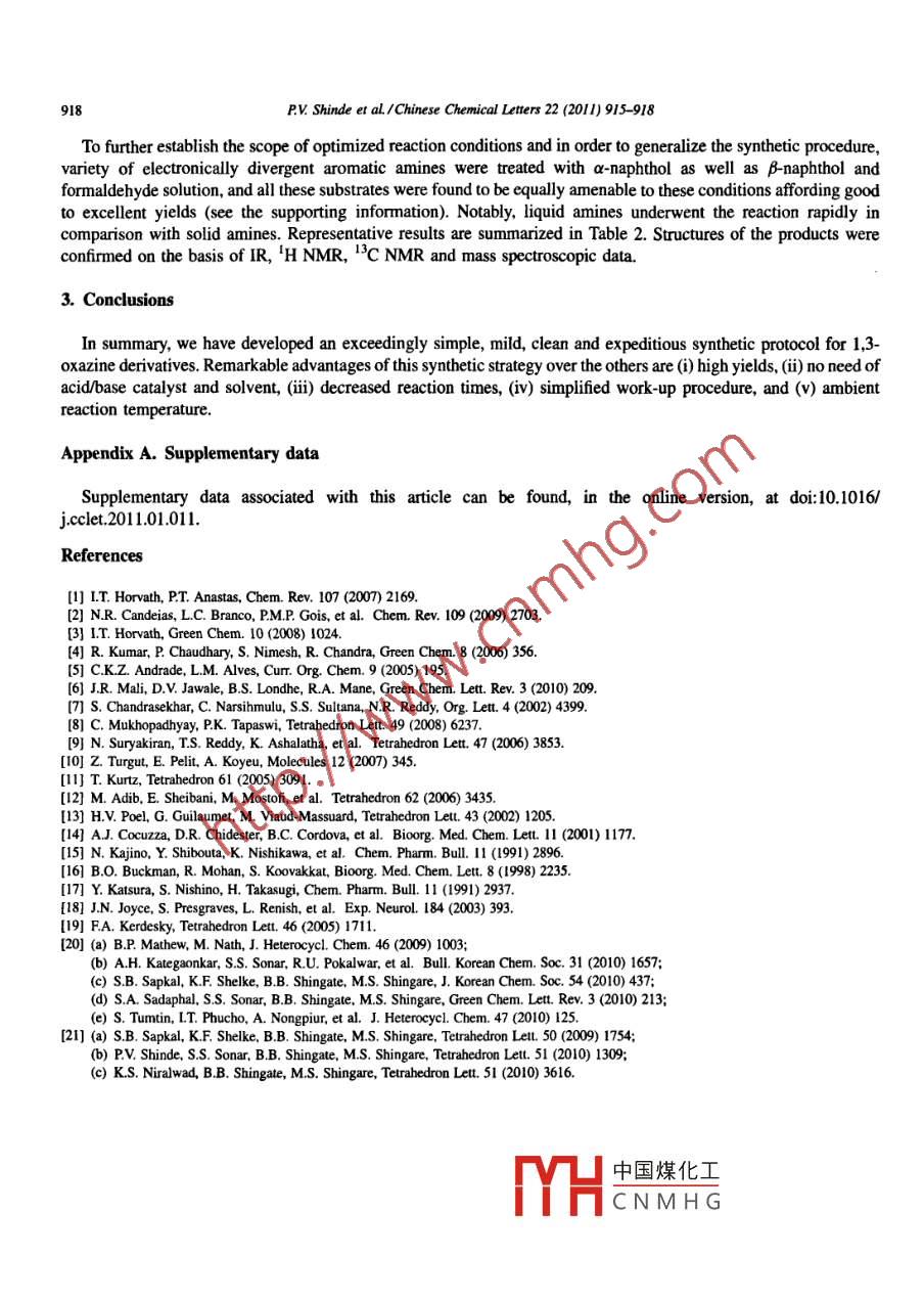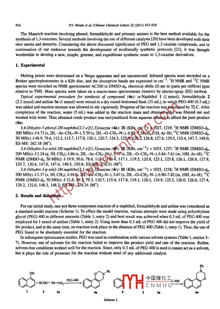 Available online at www.sciencedirect.comCHINES E: ScienceDirectCHEMICALL .ETTERSEL SEVIERChinese Chemical Letters 22 (2011) 915- -918www.elsevier.com/locate/ccletPolyethylene glycol (PEG) mediated expeditious syntheticroute to 1 ,3-oxazine derivativesPravin V. Shinde, Amol H. Kategaonkar, Bapurao B. Shingate, Murlidhar S. Shingare *Department of Chemistry, Dr. Babasaheb Ambedkar Marathwada Universiy, Aurangabad 431004, Maharashtra, IndiaReceived 8 November 2010Available online 18 May 2011AbstractVarious 1,3-oxazine derivatives were synthesized in high yields, within shorter reaction times using PEG 400 as a safer medium/mediator. This synthetic route is exceedingly easy and avoids the use of acidbase catalysts.C 2011 Murlidhar S. Shingare. Published by Elsevier B.V. on behalf of Chinese Chemical Society. All nights reserved.Keywords: Ecofriendly synthetic protocol; Green chemistry; 13-0xazines; Polyethylene glycol (PEG)In the recent years, there has been a growing demand for the development of more sustainable chemistry,particularly in the synthesis of value added materials, in order to minimize the great amounts of waste and consecutivetreatment [1,2]. One of the key principles of green chemistry is the elimination of solvents in chemical processes or thereplacement of volatile/hazardous solvents with environmentally benign solvents [3]. In performing the majority oforganic transformations, solvents play a critical role in making the reaction homogeneous and allowing molecularinteractions to be more efficient [4]In this connection, polyethylene glycol (PEG) is attracting much attention of organic chemists due to theirinexpensive and eco-friendly nature, high thermal stability, ease of workup, and the ability to act as phase transfercatalysts. Furthermore, PEG and its monomethylethers have a low vapor pressure, are nonflammable, non-volatile, recyclable, and are available in high quantities at low prices. The application of PEG as a reactionmedium is highly beneficial as the system remains neutral, which helps in maintaining a wide variety of functionalgroups unchanged that are either acid or base susceptible [2- -5]. For these reasons, PEG is considered to be anenvironmentally benign surrogate to volatile organic solvents and a highly practical medium for the synthesis ofbiodynamic heterocycles [6- 9].1,3-Oxazine ring system is a core structure present in a number of biodynamic heterocycles. They are pivotalintermediate for the synthesis of medicinally active molecules [10]. Increasing interest towards the synthesis of 1,3-oxazine derivatives is mainly due to their potential biological and pharmacological activities such as analgesic [1],antitubercular [12], anticancer [13], anti-HIV [14], antihypertensive [15], antithromobotic [16], and antiulcer [17]. Inaddition, naphthoxine derivatives possess therapeutic potential for the treatment of Parkinson's disease [18].Moreover, certain kinds of 1,3-oxazines are of interest as photochromic compounds [19].中國(guó)煤化工* Corresponding author.E mail adress: prof. msshingarerediffmail.com (M.S. Shingare).MHCNMHG1001-8417/5 -see front matter◎2011 Murlidhar s. Shingare. Published by Elsevier B.V. on behalf of Chinese Chemical Society. Al nights reserved.doi:10.01j.cel201.01.011916PV Shinde et al./Chinese Chemical Letters 22 (2011)915 -918The Mannich reaction involving phenol, formaldebyde and primary amines is the best method available for thesynthesis of 1,3-oxazines. Several methods involving the use of different catalysts [20] have been developed with theirown merits and demerits. Considering the above discussed significance of PEG and 1,3-0xazine compounds, and incontinuation of our endeavor towards the development of ecofriendly synthetic protocols [21], it was thoughtworthwhile to develop a new, simple, greener, and expeditious synthetic route to 1,3-oxazine derivatives.1. ExperimentalMelting points were determined on a Veego apparatus and are uncorrected. Infrared spectra were recorded on aBruker spectrophotometer in a KBr disc, and the absorption bands are expressed in cm '. 'H NMR and 'C NMRspectra were recorded on NMR spectrometer AC200 in DMSO-d6, chemical shifts (8) are in (parts per million) ppmrelative to TMS. Mass spectra were taken on a macro-mass spectrometer (waters) by electro-spray (ES) method.Typical experimental procedure for synthesis of compound (4a): a-Naphthol 1 (1 mmol), formaldehyde 2(2.2 mmol) and aniline 3a (1 mmol) were mixed in a dry round-bottomed fask (25 mL), to which PEG-400 (0.3 mL)was added and reaction mixture was allowed to stir vigorously. Progress of the reaction was monitored by TLC. Aftercompletion of the reaction, water (5 mL) was added to the reaction mass and obtained solid was filtered out andwashed with water. Thus obtained crude product was recrystallized from aqueous ethanol to afford the pure product(4a).3,4-Dihydro-3-phenyl-2H-naphtho[2,I-e][l,3]oxazine (4a): IR (KBr, cm -): v 1027, 1219; 'H NMR (DMSO-d,200 MHz): 84.73(s, 2H, -Ar CH2 N-), 5.50(s, 2H, 0 CH2- N-), 6.89 -7.58 (m, 11H, Ar H); '3C NMR (DMSO-ds,50 MHz): 848.9, 79.6, 112.2, 115.7, 117.0, 120.1, 120.7, 124.5, 125.9, 126.2, 126.8, 127.6, 129.5, 133.4, 147.7, 149.0;ES-MS: 262.18 (M*).3,4-Dihydro- 3-0- tolyl-2H-naphtho[2,1-e ][1,3]oxazine (4b): IR (KBr, cm-): v 1033, 1237; 'H NMR (DMSO-do,200 MHz): 82.24 (q, 3H, CH3), 4.86 (s, 2H,- Ar- CH2 -N-), 5.77 (s, 2H,-0- CH2- N-), 6.84- -7.61 (m, 10H, Ar- H); l3CNMR (DMSO do, 50 MHz): δ 19.9, 50.6, 78.6, 113.7, 116.4, 117.1, 119.5, 120.8, 125.1, 125.8, 126.1, 126.8, 127.9,129.7, 130.4, 147.0, 147.4, 149.5, 150.8; ES-MS: 276.31 (M).3,4-Dihydro- 3-p-tolyl-2H-naphtho[2,I-e][l,3}oxazine (4c): IR (KBr, cm-): v 1025, 1238; 'H NMR (DMSO-d6,200 MHz): 82.37 (s, 3H, CH3), 4.94(s, 2H,-Ar- -CH2 _N_), 5.67(s, 2H,- 0 CH2 -N_ -), 6.90- -7.82 (m, 10H, Ar -H); 1C .NMR (DMSO-ds, 50 MHz): 821.5, 49.1, 79.3, 110.7, 115.4, 117.8, 119.1, 120.1, 124.9, 125.5, 126.0, 126.6, 127.4,129.2, 132.0, 148.3, 148.2; ES-M