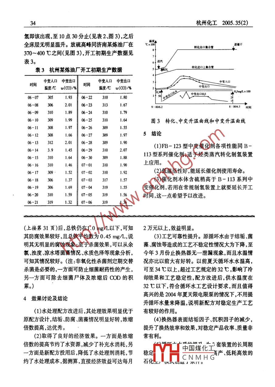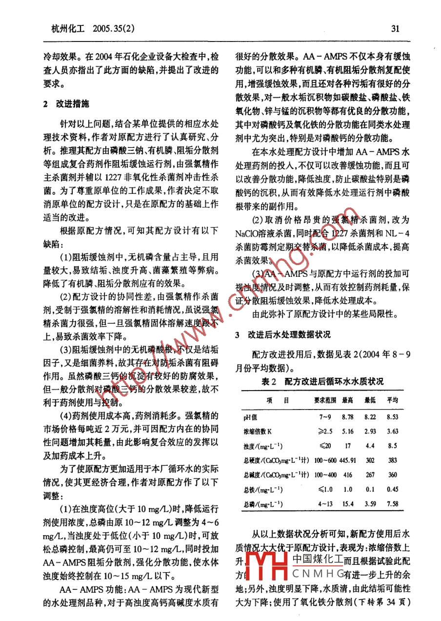 30杭州化工2005. 35(2)2 000 m3 /h循環(huán)水系統(tǒng)配方設(shè)計改進(jìn)俞志橋(中石化集團(tuán)杭州煉油廠,浙江杭州310005)摘要:介紹了煉油工藝2000m3/h循環(huán)水系統(tǒng)配方設(shè)計改進(jìn)的情況及效果,由此證明新配方的改進(jìn)是有效的,可行的。隨著AA- AMPS的加入和原配方設(shè)計用藥的調(diào)整使新配方的使用效果大大優(yōu)于原配方,取得了較好的成效。關(guān)鍵詞:循環(huán)水;配方設(shè)計;水處理;AA - AMPS循環(huán)冷卻水的處理除了先天的工藝條件外,1改進(jìn)前循環(huán)水水質(zhì)狀況-個理想的水處理藥劑配方對循環(huán)水水處理的成功與否有決定性的影響。一般說,循環(huán)水配方設(shè)改進(jìn)前(2004年1-6月份)循環(huán)水平均水質(zhì)計的主要原則是遵循相應(yīng)的水質(zhì)條件,運(yùn)行工況數(shù)據(jù)見表1。和技術(shù)經(jīng)濟(jì)的綜合比較。從實(shí)用的角度看,一個表1改進(jìn)前循環(huán)水水質(zhì)狀況成功的水處理配方應(yīng)具有緩蝕、阻垢、分散、殺菌項(xiàng)目要求范圍最高最低平均滅藻等整體功能。在許多水處理藥劑中,很少有一種藥劑能同時兼有以上各種功能的,因此,-一個pH值7.5~9 9.12 7.08 8.21旅縮倍敷K2.0~3.5 2.72 1.60 2.20配方中往往有多種藥劑組成,甚至同一種功能有時也會選擇兩種以上的藥劑復(fù)合使用,以利用其濁度/