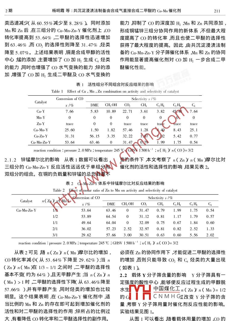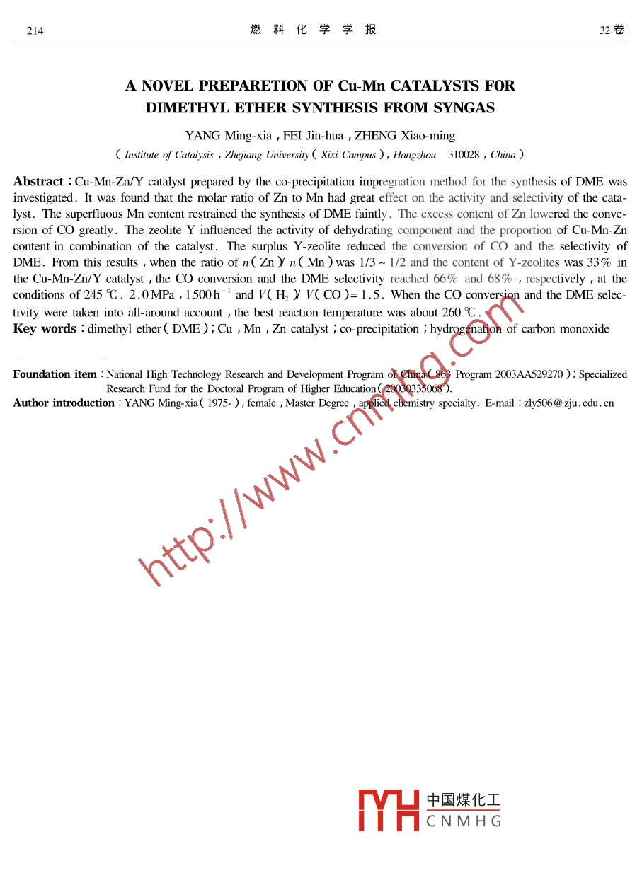 第32卷第2期燃料化學(xué)學(xué)報(bào)Vol 322004年4月JOURNAL OF FUEL CHEMISTRY AND TECHNOLOGYApr.2004文章編號(hào):0253-240X2004)2021005共沉淀浸漬法制備由合成氣直接合成二甲醚的Cu-Mn催化劑楊明霞,費(fèi)金華,鄭小明浙江大學(xué)催化研究所,浙江杭州310028)摘要:采用共沉淀浸漬法制備了直接合成二甲醚的Cuμ-MnZm催化劑通過對(duì)組成成分及其配比的研究發(fā)現(xiàn)Cu含量一定的條件下,n(Znyn(Mn)爾比對(duì)催化劑性能有較大的影響當(dāng)n(Znyn(Mn)=1/3~1/2時(shí)催化劑對(duì)CO的轉(zhuǎn)化率和對(duì)二甲醚的選擇性達(dá)到最佳分別為53.6%和63.5%洳如錳添加比例過大對(duì)催化劑催化合成二甲醚有微弱抑制添加鋅比例過大會(huì)大大降低CO的轉(zhuǎn)化率。載體Y分子篩的含量對(duì)催化劑性能也有影響用量過大將降低催化劑的活性和對(duì)二甲醚的選擇性當(dāng)其含量為33%時(shí)催化劑上C轉(zhuǎn)化率和選擇性可分別達(dá)到66%和68%且催化劑活性隨分子篩含量減少不再有明顯的變化。關(guān)鍵詞:二甲醚;Cu-Mn加m催化劑;共沉淀浸漬法;CO加氫中圖分類號(hào):0643文獻(xiàn)標(biāo)識(shí)碼:A近年來二甲醚的應(yīng)用更加廣泛除了本身可用4h壓片成型破碎過篩取20目~40目備用。作冷凍劑、溶劑、萃取劑、氣霧劑和推進(jìn)劑等還可作1.2催化劑活性評(píng)價(jià)催化劑反應(yīng)性能評(píng)價(jià)在為有機(jī)化工的原料以及潛在的柴油潔浄替代燃料MRCs8O4高壓微反色譜系統(tǒng)上進(jìn)行。催化劑裝填和民用燃料。澘在的大市場吸引人們不斷研究探索量為2.0m(約2g)反應(yīng)前催化劑在常壓下用氫氣更好的合成二甲醚的方法和催化劑。目前,由CO在275℃還原3h然后降溫、切換成還原氣并充壓至加H直接合成二甲醚是國內(nèi)外研究的熱點(diǎn)之一其實(shí)驗(yàn)所需壓力反應(yīng)穩(wěn)定后進(jìn)行活性評(píng)價(jià)反應(yīng)產(chǎn)物成功的關(guān)鍵在于催化劑。在已報(bào)道的文獻(xiàn)和專由HP5890-Ⅱ色譜儀在線分析熱導(dǎo)檢測器。典型利1-中大多是將合成甲醇的催化劑和具有酸性反應(yīng)條件溫度245℃壓力2.0MPa原料氣摩爾比的脫水劑通過一定的制備方法制得催化劑中起合n(H2yn(O)=3/2空速1500h。成甲醇作用的活性組分主要有Cuhn、Mn和等,2結(jié)果與討論脫水劑主要有y-A2O3和分子篩2.1催化劑組成和比例的影響結(jié)合已開發(fā)成功的負(fù)載型Cu-MnZm/y-Al2O3催2.1.1組成的影響首先考察Cu,Mn,Zn三種組化劑的特點(diǎn)采用活性組分與分子篩脫水劑共沉分的不同組合對(duì)二甲醚合成反應(yīng)的影響包括單組淀漫漬的制備方法對(duì)銅錳基催化劑進(jìn)行了改進(jìn)研分體系、雙組分體系和三組分體系三種情況實(shí)驗(yàn)結(jié)制更高效的新型Cu-Mnn/Y催化劑體系。該催化果見表1。劑體系最突出的優(yōu)點(diǎn)就是比Cu-Mnn/y-Al2O3催化由表1可見在單組分的 Cu-Y,Mn-Y和ZnY催劑反應(yīng)溫度更低反應(yīng)條件更溫和?;瘎┲兄挥蠧u-Y具有一氧化碳加氫活性但活性實(shí)驗(yàn)部分很低CO轉(zhuǎn)化率僅為7.66%產(chǎn)物主要為烴類。添11催化劑的制備按照一定比例配硝酸銅、硝酸加Mn后在雙組分Cm-MnY催化劑上,CO轉(zhuǎn)化率錳及硝酸鋅的混合溶液A以1.0mM碳酸氫銨溶從7.6%增加到25.6%二甲醚和甲醇的選擇性卻液為沉淀劑B準(zhǔn)備好盛有Y型分子篩懸浮液C的下降,總烴類選擇性大幅減少(從60.5%降至燒杯然后在攪拌的條件下用并流共沉淀法將混合39.21%)而二氧化碳選擇性大大升高:添加h溶液A與沉淀劑B滴入置于60℃恒溫水浴中的裝后在雙組分的Cuh-Y催化劑上,CO轉(zhuǎn)化率從有懸浮液C的燒杯中控制pH值為6.0~7.0。滴7定結(jié)束后靜置老化洗滌抽濾干燥在500℃焙燒大幅YHa中國煤化工醚的選擇性從5.83%CNMH《擇性降至32.22%烴收稿日期:2003-07-07;修回日期:2004-01-16基金項(xiàng)目:國家高技術(shù)研究發(fā)展計(jì)劃項(xiàng)目(863計(jì)劃項(xiàng)目ⅹ2003A529270)高等學(xué)校博士學(xué)科點(diǎn)專項(xiàng)科研基金20030335068作者簡介萬喃辣75-)女江西南昌人頑士應(yīng)用化學(xué)專業(yè)。Eml:50m,ch,m期楊明霞等:共沉淀浸漬法制備由合成氣直接合成二甲醚的Cu-Mn催化劑211類迅速減從60.55%減少至8.28%)同時(shí)添加能力抑制了CO的深度加H,Mn和Z共同添加Mn和zn后在三組分的Cu-Mn-Zm-Y催化劑上CO形成銅錳鋅三組分協(xié)同作用的新體系不但最大程轉(zhuǎn)化率提高到53.64%,二甲醚的選擇性迅速增加度提高了CO的轉(zhuǎn)化率而且也使二甲醚的選擇性到63.46%而CO2的選擇性則降至31.47%烴類獲得了最大程度的提高。因此由共沉淀浸漬法制降至5.07%。上述結(jié)果表明銅是合成甲醇的活性備的Cu-Mn-Zm-Y分子篩催化體系Mhn和Zhn的協(xié)同中心錳的添加主要增加了CO加H2生成C烴類作用能顯著提高催化劑對(duì)CO加H2一步合成二甲的能力同時(shí)也增強(qiáng)了ωO水氣變換的能力滓鋅的添醚催化性能加增強(qiáng)了CO加H,生成二甲醚及CO水氣變換的表1活性組分不同組合對(duì)反應(yīng)結(jié)果的影響Table 1 Effect of Cu, Mn, Zn combination on activity and selectivity of catalystConversion of COSelectivity s/%0CatalystDMEH, OH CO,5.8310.8922.713.613.8245,487.64Mn-y00Zu-Y0traceCu-Mn-Y1.501.8257.461.284.408.4325Cu-Zn-Y31.3156.153,3532.221.05,420Cu-Mn-Zn-Yreaction condition: pressure 2.0 MPa; temperature 245C GHSV 1 500h n(h y n(Co )=3/22.1.2鋅錳摩爾比的影響從表1數(sh