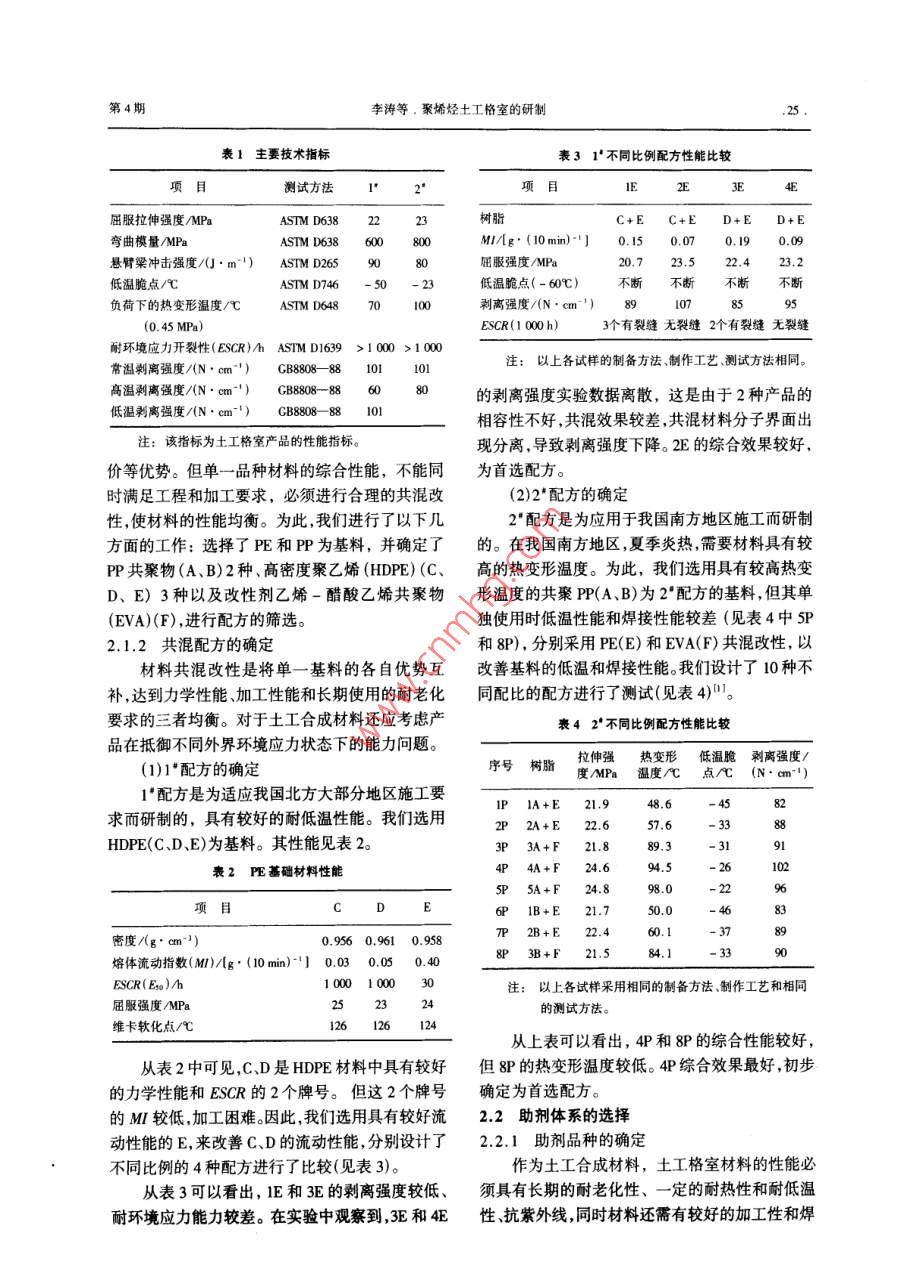 合成樹脂新產(chǎn)品開發(fā)與應(yīng)用專欄合成樹脂及塑料,2001, 18(4): 24CHINA SYNTHEIC RESIN AND PLASTICS.聚烯烴土工格室的研制李濤錢德成周瀾趙桂良(北京燕化石油化工股份有限公司樹脂應(yīng)用研究所,102500)通過以改性聚烯烴為原料,經(jīng)擠出成型分切.再超聲焊接制成了土工格室,并介紹了土工格室的應(yīng)用。關(guān)鍵詞:聚烯烴土工格室專用料超聲焊接土工格室是一種具有立體網(wǎng)狀結(jié)構(gòu)的土工合再經(jīng)擠出成型為片材,分切成條狀,焊接成制品。成材料。其獨(dú)特的三維立體結(jié)構(gòu)可有效地約束網(wǎng)工藝路線見圖1。格內(nèi)的填充物,與填充物一起形成穩(wěn)定的結(jié)構(gòu)層,基礎(chǔ)樹脂顯示出其他平面土工合成材料無法相比的工程效助劑→共混→雙螺桿造?!某尚汀附庸?正廣泛地應(yīng)用于軟弱路基加固、邊坡防護(hù)、擋改性樹脂圖1土工格室基本成型工藝路線土墻修建等工程。聚烯烴土工格室產(chǎn)品是以改性聚烯烴為原料,1.2技術(shù)要求經(jīng)擠出成型分切再超聲焊接而成,展開后呈立體土工格室產(chǎn)品在巖土工程中作為一種支承結(jié)蜂窩狀結(jié)構(gòu)的土工合成材料。因土工格室的生產(chǎn)流構(gòu)的增強(qiáng)骨架,因此要求產(chǎn)品必須具有強(qiáng)度高,剛程長、成型工序多、應(yīng)用環(huán)境復(fù)雜多變等特點(diǎn),因度大且縱、橫向變化均勻等特點(diǎn),在具有較好的力此,對生產(chǎn)該產(chǎn)品的原材料及產(chǎn)品有如下要求:學(xué)性能的同時還必須具有較好的耐老化性能。通(1)產(chǎn)品有較好的機(jī)械性能,以防止在施工過過幾年的工程應(yīng)用實(shí)驗(yàn)和工程模型實(shí)驗(yàn)研究,我程和應(yīng)用過程中受到較強(qiáng)的外力、硬物穿刺等的們確定了適應(yīng)不同地理環(huán)境的2種不同使用條件破壞。的土工格室的力學(xué)性能指標(biāo)(見表1)。(2)產(chǎn)品長期在復(fù)雜的環(huán)境中使用,故選擇材料時應(yīng)考慮耐酸堿性和耐霉變等因素。2實(shí)驗(yàn)部分(3)材料應(yīng)有較好的抗老化性能,以滿足在工2.1土工格室專 用料配方篩選程中長期穩(wěn)定使用的需要。2.1.1基料的選擇(4)我國廣闊的地域,南北氣溫變化大,產(chǎn)品基料的選擇對產(chǎn)品性能、加工工藝及對產(chǎn)品所用材料必須有較好的耐低、高溫性能。成本具有直接的影響。(5)為適應(yīng)土工格室的制備工藝要求,材料還聚烯烴樹脂[聚丙烯(PP)、聚乙烯(PE)]是合需具有較好的可焊接性。成材料中產(chǎn)量最大、品種牌號較多的一類通用樹(6)產(chǎn)品在工程應(yīng)用中要求為外形尺寸整齊、脂,具有密度低、適用性強(qiáng)、加工容易、價格便宜等焊距-致,整個網(wǎng)格體系強(qiáng)度-致。特點(diǎn)。選用這一類材料作為土工格室的基材具有(7)產(chǎn)品具有較好的組件連接功能,以保證工原材料供應(yīng)充足,價格較低,可有效地降低工程造程整體加固強(qiáng)度的- -致性。收稿日期: 2001-04-27。作者簡介:李濤, 1992 年畢業(yè)于華北工學(xué)院,現(xiàn)在北京1實(shí)驗(yàn)的工藝 路線及技術(shù)要求燕化石油化I股份有限公司樹脂應(yīng)用研究所從事塑料制1.1 實(shí)驗(yàn)步驟品的研制工作,目前從事土工合成材料的研制及推廣.已將基礎(chǔ)材料和改性樹/脂、助劑經(jīng)共混后造粒,發(fā)表論文數(shù)篇。第4期李濤等.聚烯烴土工格室的研制.25 .表1主要技術(shù)指標(biāo)表3 1'不同比例配方性能比較項(xiàng)測試方法項(xiàng)E1E4E屈服拉伸強(qiáng)度/MPaASTM D63823樹脂C+E C+ED+E彎曲模量/MPaASTMD638 600800MI/[g* (10 min)-"]0.15 0.070.190.09懸臂梁沖擊強(qiáng)度/(J.m~")ASTM D26580屈服強(qiáng)度MPa20.723.5低溫脆點(diǎn)/CASTM D746 - 50-2低溫脆點(diǎn)( - 60C)不斷不斷不斷負(fù)荷下的熱變形溫度/CASTM D6487010利離強(qiáng)度/N●cm"')850759:(0.45 MPa)ESCR(1 000h)3個有裂縫無裂縫2個有裂縫無裂縫耐環(huán)境應(yīng)力開裂性(ESCR)/h ASTM D1639 >1000 >1000注:以上各 試樣的制備方法、制作工藝、測試方法相同。常溫剝離強(qiáng)度/(N . cm"') GB8808- -8810101高溫刺離強(qiáng)度/(N.cm~1) C8808- -8830的剝離強(qiáng)度實(shí)驗(yàn)數(shù)據(jù)離散,這是由于2種產(chǎn)品的低溫剝離強(qiáng)度/(N . cm~')CB8808- -88相容性不好,共混效果較差,共混材料分子界面出注:該指標(biāo)為土工格室產(chǎn)品的性能指標(biāo)?,F(xiàn)分離,導(dǎo)致剝離強(qiáng)度下降。2E的綜合效果較好,價等優(yōu)勢。但單- -品種材料的綜合性能,不能同為首選配方。時滿足工程和加工要求,必須進(jìn)行合理的共混改(2)2*配方的確定性,使材料的性能均衡。為此,我們進(jìn)行了以下幾2"配方是為應(yīng)用于我國南方地區(qū)施工而研制方面的工作:選擇了PE和PP為基料,并確定了的。 在我國南方地區(qū),夏季炎熱,需要材料具有較PP共聚物(A. B)2種、高密度聚乙烯(HDPE)(C、高的熱變形 溫度。為此,我們選用具有較高熱變D、E) 3種以及改性劑乙烯-醋酸乙烯共聚物形溫度的共聚PP(A、B)為2*配方的基料,但其單(EVA)(F),進(jìn)行配方的篩選。獨(dú)使用時低溫性能和焊接性能較差(見表4中5P.2.1.2共混配方 的確定和8P),分別采用PE(E)和EVA(F)共混改性,以材料共混改性是將單- -基料的各自優(yōu)勢互改善基料的低溫和焊接性能。我們設(shè)計(jì)了10 種不補