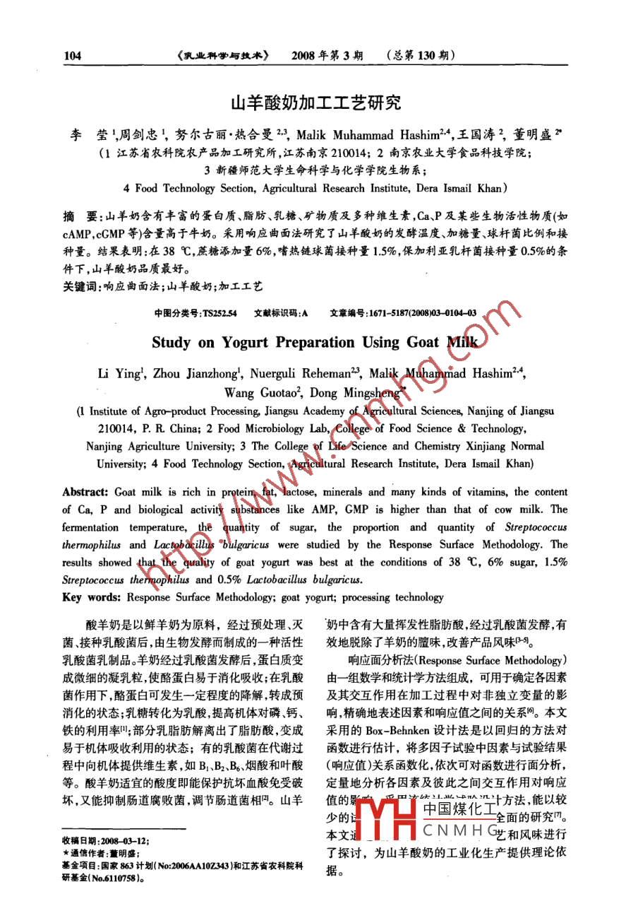 〈乳業(yè)料掌與拽術(shù)〉2008年第3期(總第130期)山羊酸奶加工工藝研究李瑩,周劍忠,努爾古麗·熱合曼23, Malik Muhammad Hashim2*,王國(guó)濤,董明盛(1江蘇省農(nóng)科院農(nóng)產(chǎn)品加工研究所,江蘇南京210014;2南京農(nóng)業(yè)大學(xué)食品科技學(xué)院;3新疆師范大學(xué)生命科學(xué)與化學(xué)學(xué)院生物系;4 Food Technology Section, Agricultural Research Institute, Dera Ismail Khan)摘要:山羊奶含有豐富的蛋白質(zhì)、脂肪、乳糖、礦物質(zhì)及多種維生素,Ca、P及某些生物活性物質(zhì)(如cAMP,cGMP等)含量高于牛奶。采用響應(yīng)曲面法研究了山羊酸奶的發(fā)酵溫度、加糖量、球桿菌比例和接種量。結(jié)果表明:在38℃,蔗糖添加量6%,嗜熱鏈球菌接種量15%,保加利亞乳桿菌接種量0.5%的條件下,山羊酸奶品質(zhì)最好。關(guān)鍵詞:響應(yīng)曲面法;山羊酸奶;加工工藝中圖分類號(hào):TS25254文獻(xiàn)標(biāo)識(shí)碼:A文章編號(hào):1671-51870200803-010403Study on Yogurt Preparation Using Goat MilkLi Ying, Zhou Jianzhong, Nuerguli Reheman2, Malik Muhammad HashimDong Mingshi(1 Institute of Agro-product Processing, Jiangsu Academy of Agricultural Sciences, Nanjing of Jiangsu210014, P. R. China: 2 Food Microbiology Lab, College of Food Science TechnologyNanjing Agriculture University; 3 The College of Life Science and Chemistry Xinjiang NormalUniversity; 4 Food Technology Section, Agricultural Research Institute, Dera Ismail Khan)Abstract: Goat milk is rich in protein, fat, lactose, minerals and many kinds of vitamins, the contentof Ca, P and biological activity substances like AMP, GMP is higher than that of cow milk. Thefermentation temperature, the quantity of sugar, the proportion and quantity of Streptococcusthermophilus and Lactobacillus bulgaricus were studied by the Response Surface Methodology. Theresults showed that the quality of goat yogurt was best at the conditions of 38 C, 6% sugar, 1.5%Streptococcus thermophilus and 0.5% Lactobacillus bulgaricus.Key words: Response Surface Methodology; goat yogurt; processing technology酸羊奶是以鮮羊奶為原料,經(jīng)過預(yù)處理、滅奶中含有大量揮發(fā)性脂肪酸經(jīng)過乳酸菌發(fā)酵,有菌、接種乳酸菌后,由生物發(fā)酵而制成的一種活性效地脫除了羊奶的膻味,改善產(chǎn)品風(fēng)味乳酸菌乳制品。羊奶經(jīng)過乳酸菌發(fā)酵后,蛋白質(zhì)變響應(yīng)面分析法( Response Surface Methodology)成微細(xì)的凝乳粒,使酪蛋白易于消化吸收;在乳酸由一組數(shù)學(xué)和統(tǒng)計(jì)學(xué)方法組成,可用于確定各因素菌作用下,酪蛋白可發(fā)生一定程度的降解轉(zhuǎn)成預(yù)及其交互作用在加工過程中對(duì)非獨(dú)立變量的影消化的狀態(tài);乳糖轉(zhuǎn)化為乳酸提高機(jī)體對(duì)磷、鈣、響精確地表述因素和響應(yīng)值之間的關(guān)系間。本文鐵的利用率;部分乳脂肪解離出了脂肪酸,變成采用的Box- Behnken設(shè)計(jì)法是以回歸的方法對(duì)易于機(jī)體吸收利用的狀態(tài);有的乳酸菌在代謝過函數(shù)進(jìn)行估計(jì),將多因子試驗(yàn)中因素與試驗(yàn)結(jié)果程中向機(jī)體提供維生素,如B1、B2、B6煙酸和葉酸(響應(yīng)值)關(guān)系函數(shù)化,依次可對(duì)函數(shù)進(jìn)行面分析,等。酸羊奶適宜的酸度即能保護(hù)抗壞血酸免受破定量地分析各因素及彼此之間交互作用對(duì)響應(yīng)壞,又能抑制腸道腐敗菌,調(diào)節(jié)腸道菌相吲。山羊值的少中國(guó)煤化工方法能以較面的研究。收稿日期:200803-12本文CNMH(藝和風(fēng)味進(jìn)行★通信作者:董明盛;了探討,為山羊酸奶的工業(yè)化生產(chǎn)提供理論依基金項(xiàng)目:國(guó)家863計(jì)劃(N200043)和江蘇省衣科院科據(jù)李瑩等:山羊酸奶加工工藝研究1051材料與方法14.2實(shí)驗(yàn)因素最佳配方確定1.1材料由實(shí)驗(yàn)數(shù)據(jù)得到回歸方程,并進(jìn)行方差分析菌種:嗜熱鏈球菌( Streptococcus感官評(píng)定結(jié)果確定乳酸菌發(fā)酵山羊酸奶的最佳配thermophilus)、保加利亞乳桿菌( Lactobacillus方。bulgaricus),本實(shí)驗(yàn)室保存。14.3最佳配方的驗(yàn)證山羊奶:徐州睢寧華羊乳業(yè)科技生物技術(shù)有按最佳配方配制進(jìn)行感官評(píng)價(jià)驗(yàn)證實(shí)驗(yàn)限公司提供。15總酸度的測(cè)定標(biāo)準(zhǔn)酸堿溶液滴定法。12儀器設(shè)備吸取10mL羊酸奶,置于250mL三角瓶中,電子恒溫水浴鍋ZD-2型pH計(jì)(上海雷加入20mL蒸餾水,再加入34滴05%的酚酞磁)LRH-150型生化培養(yǎng)箱(上海一恒)、SW-乙醇溶液,搖勻,用0.1moL的氫氧化鈉標(biāo)準(zhǔn)溶CJ-1C型凈化工作臺(tái)(蘇州凈化)、DSX-280AI型液滴定至微紅色,并且在30s內(nèi)不褪色為止。消電熱手提式滅菌鍋(上海申安)。耗01mo/L的氫氧化鈉標(biāo)準(zhǔn)溶液的體積數(shù)(mL)13工藝流程乘以10,即為該樣品的滴定酸度()蔗糖活化菌種滴定酸度()=V×10;注:V為消耗01moL的氫氧化鈉標(biāo)準(zhǔn)溶液鮮羊奶→加熱攪拌→灌裝→殺菌→冷卻→接種→的體積數(shù)。發(fā)酵→后熟→成品16感官評(píng)定釆用九點(diǎn)標(biāo)度法(見表2)。14產(chǎn)品配方實(shí)驗(yàn)設(shè)計(jì)與方法衰2惑官評(píng)價(jià)的指標(biāo)體系14.1試驗(yàn)方法分取100mL鮮羊奶,添加一定比例的蔗糖并攪鮮亮拌使其融化,灌裝于玻璃瓶中,121℃殺菌20min,23456789冷卻后在超凈工作臺(tái)內(nèi)接入已活化的嗜熱鏈球菌與保加利亞乳桿菌,觀察