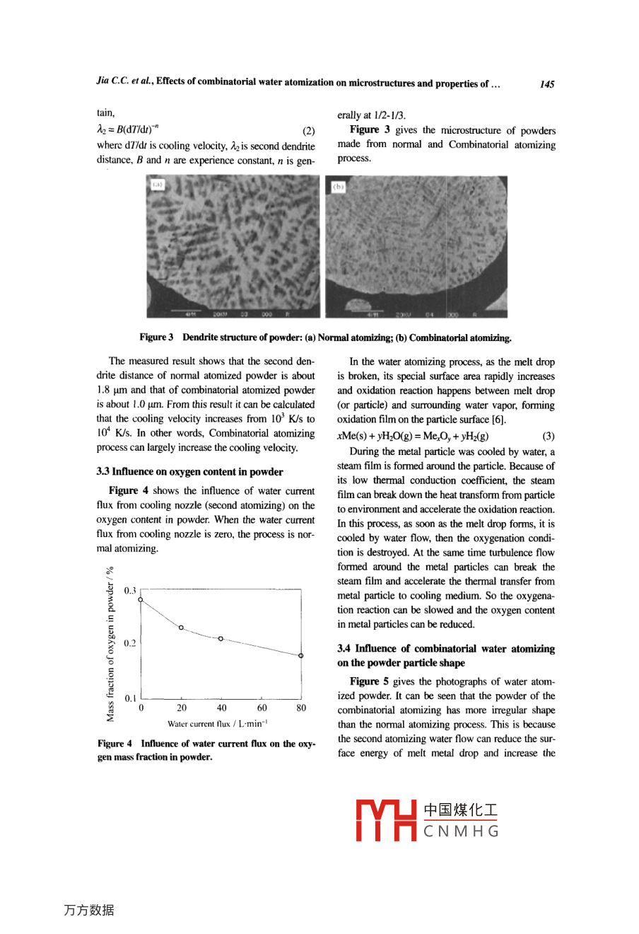 RARE METALSVol. 23, No. 2, Jun 2004, p. 143Effects of combinatorial water atomization on microstructures andproperties of Cu-Sn powderJIA Chengchang", MA Hongiul:2, JIN Chenghai?, and GE Liqiang2)1) School of Materials Science and Engineing. Univesity of Science and Tchnology Beijng. Bejig 10083. China2)Advanced Technology and MacialsCo. Lud. Bejing 1008100 China(Received 200304-23)Abstract: A couple of additional cooling nozzles were assembled under traditional atomization nozzles in order to improvethe process and produce the powder with fine microstructure and low oxygen. The infuence of the process parameters onthe properties of the powder was investigated. The results show that finer powders with lower oxygen content and more irregular shape can be achieved by combinatorial atomizing process comparing with normal one under the same atomizingpressure.Key words: powder metllurgy; combinatorial nozzle; water atomization; rapid solidification; particle size1 Introductioncludes: contolled silicon power supply with 1000Hz, intermediate frequency induction furmace withAtomization is an important method to producecapacity of 30 kg, atomizing tower and collectionthe metal powder [1-3]. In recent years the develop-chamber. Figure 1 is a sketch map on the main por-ing trend of atomize method system is to producetion of atomizing systerm including combinatorialfine powder with low oxygen. Especially metal in-nozzle.ject molding (MIM) boomingly developed sinceNormal nzzle1980's arouses the large quantity need of the right5and very small metal powder. It requests the particlewie民size of powder be as small as 22 um even finer.Furthermore, the request for the oxygen is also moreAlfixiure colingozlerigorous [4]. This work tries using new water atom-X First ntomizing focusize method to get finer and better quantity powderwith the same parameters such as water pressure. Inthe present method, the affixture cooling nozzle isSccond alomizing focusset under the normal nozzle and the complex nozzlemakes the melt metal be broken under the normalFigure 1 Sketch map on combinatorial atomizingnozzle, then be impacted by the water coming fromsystem.the cooling nozzle. The melt metal drop can be bro-ken two times and be rapidly solidified.2.2 Experimental processCu-Sn bronze alloy (mass fraction of tin is 20%)2 Experimentwas selected as raw material because its powder is2.1 Experiment equipmentswidely used in the powder metallurgy field. NormalThe experiment system used in this work in-and combinatorial water atomization were experi-mented. The flux and pressure of the first atomizingCorresponding author: JIA Chengchang Email: jc@ mater.ustb.edu.cn中國(guó)煤化工MYHCNMHG144RARE METALS, Vol. 23, No. 2, Jun 2004water were constant and the flux of second atomiz-d = A/(Vsinc)1)ing water was contolled, in order to research the in-where d is the particle diameter of powder, V is thefluence of the second atomizing on the properties ofvelocity of water flow, A is a constant,a is the spraypowder.angle. The grain size of atomized powder is not onlyCu-Sn bronze aloy was firstly piece melt in. adirectly dependent on the velocity and angle of at-1000 Hz intermediate frequency induction fumace,omizing water flow, but also relative with the designthen pour into a furmace with a nozzle in its bottomand structure of nozzle. The structure of nozzle in-preheated by gas. The powder was washed with al-fluences the constant A. The higher the efficiency ofcohol and dried, then sampled by mesh. The particlenozzle is, the bigger the value of A becomes. Thesize of powder was analyzed by means of theAtomizing kinetic energy of atomizing medium isSA-CP3 optical sedimentation grain size analyze in-transformed to the special surface energy of powderstrument, and the microstructure was observed byparticle in the atomizing process. In this process, theS-250 scanning electron microscope.larger the contacting area between the melt metalAtomizing water and cooling water pressure wereand the atomizing medium is, the higher the trans-12 MPa, Atomizing water current fux was 124 Uforming eficiency is and the finer powder particlesmin; Cooling water curent flux was 0, 40, 60, andbecome. In this research work, melt metal is first80 U min; In addition, pipe diameter is 7 mm.broken by the water flow from atomizing nozzle andbecomes fine melt drop, then more broken by cool-3 Results and discussioning nozzle before its solidification. At the same time3.1 The infuence of Combinatorial atomizing onwater atomizing process includes three stages: (1)powder grain degreethe formation of primal melt drop from the meltFigure 2 gives the infuence of atomizing modemetal, (2) primal melt drop broken to powder parti-on powder grain size. It can be seen that along withcle, (3) aggregation of partial particles. In the Com-the cooling water current flux increasing, Cu-Snbinatorial atomizing process, fine powder particlespowder becomes finer. The mass fraction of -200can be gotten because their aggregation ability be-mesh powder increases from 72% to 79% and pow-came weak due to the action of atomizing nozzle. Itder smaller than 40 um is from 73.9% to 79.6%.has to be seen that there is a possibility of particleThe average particle size of powder decreases frominduration or solidifcation, so overheat temperatureof melt metal is necessary. Furthermore, the distance24.3 um to 21.0 um.between two atomizing focus can not be far.AF F3.2 The influence of Combinatorial atomizing on80 tpowder microstructure50 tThe progress of solidification is properly sepa--8-Normal atomizingrated into two parts, the initial nucleation of crystals40Combinatorialand the subsequent growth of these nuclei by theatomizing20|accretion of molecules from the melt.In the solidification process of alloys, the micro-structure is dependent on the growth ratio of solid2010608(phase from melt. If the growth ratio is lower thanParticle size 1 umdiffusion ratio in the melt, dendrite structure may beFigur