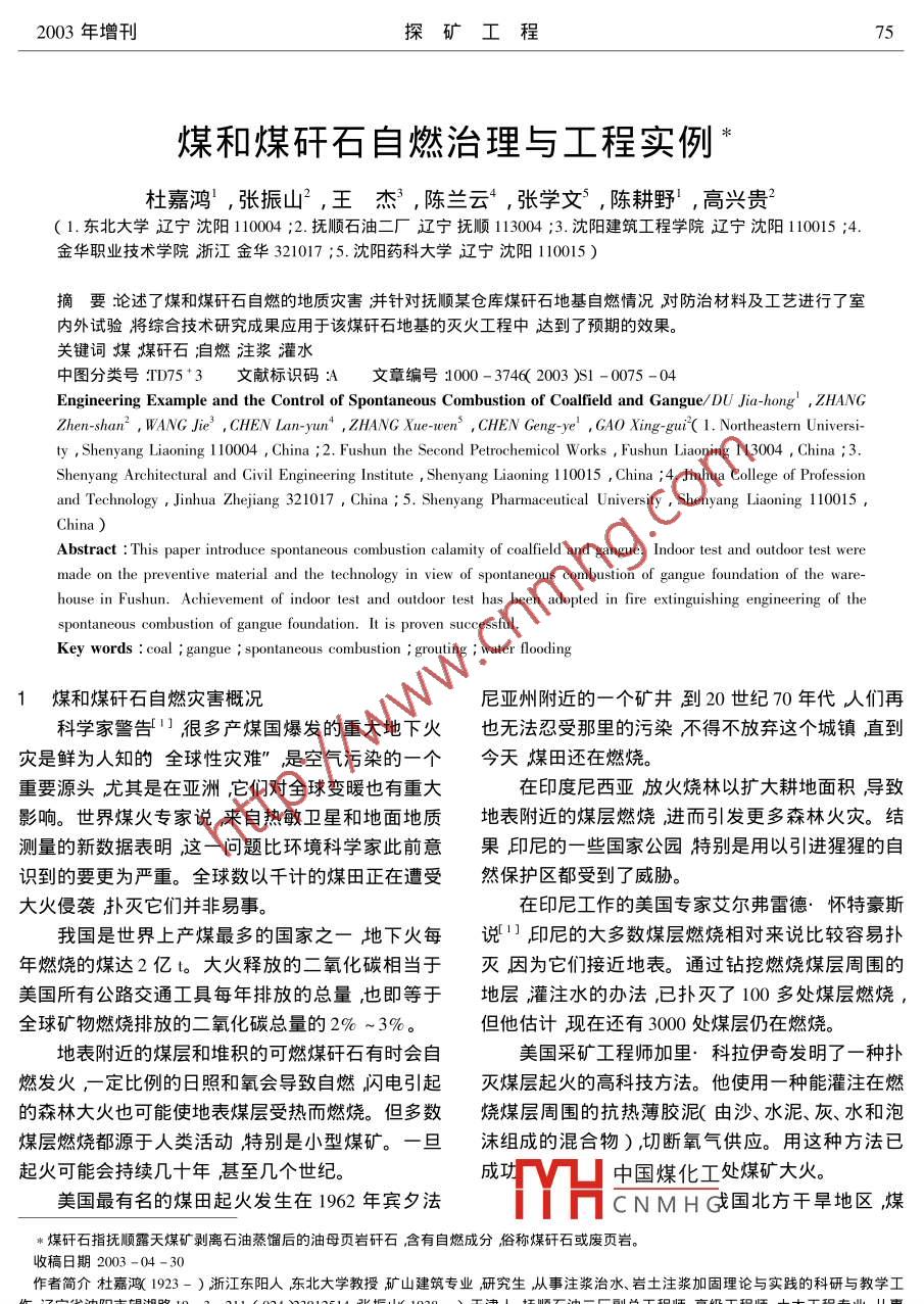 2003年增刊深礦工程75煤和煤矸石自燃治理與工程實(shí)例杜嘉鴻' ,張振山”,王杰,陳蘭云‘, 張學(xué)文,陳耕野' ,高興貴( 1.東北大學(xué)遼寧沈陽110004 ;2.撫順石油二廠遼寧撫順113004 ;3.沈陽建筑工程學(xué)院遼寧沈陽110015 ;4.金華職業(yè)技術(shù)學(xué)院浙江金華321017 ;5. 沈陽藥科大學(xué)遼寧沈陽110015)摘要:論述了煤和煤矸石自燃的地質(zhì)災(zāi)害并針對(duì)撫順某倉(cāng)庫煤矸石地基自燃情況對(duì)防治材料及工藝進(jìn)行了室內(nèi)外試驗(yàn)將綜合技術(shù)研究成果應(yīng)用于該煤矸石地基的滅火工程中達(dá)到了預(yù)期的效果。關(guān)鍵詞煤煤矸石;自燃注漿灌水.中圖分類號(hào):TD75*3文獻(xiàn)標(biāo)識(shí)碼:A文章編號(hào):1000 -3746( 2003 )S1 -0075 -04Engineering Example and the Control of Spontaneous Combustion of Coalfield and Gangue/ DU Jia-hong' , ZHANGZhen-shan2 , WANG Jie' , CHEN Lan-yun' ,ZHANG Xue- wven' , CHEN Geng-ye' , GAO Xing -gui'( 1. Northeastern Universi-ty ,Shenyang Liaoning 1 10004 , China ;2. Fushun the Second Petrochemicol W orks , Fushun Liaoning 113004 , China ;3.Shenyang Architectural and Civil Engineering Institute , Shenyang Liaoning 110015 , China ;4. Jinhua College of Professionand Technology , Jinhua Zhejiang 321017 , China ; 5. Shenyang Pharmaceutical University , Shenyang Liaoning 110015 ,Abstract : This paper introduce spontaneous combustion calamity of coalfield and gangue. Indoor test and outdoor test weremade on the preventive material and the technology in view of spontaneous combustion of gangue foundation of the ware-house in Fushun. Achievement of indoor test and outdoor test has been adopted in fire extinguishing engineering of thespontaneous combustion of gangue foundation. It is proven successful.Key words : coal ; gangue ; spontaneous combustion ; grouting ; water flooding1煤和煤矸石 自燃災(zāi)害概況尼亞州附近的一一個(gè)礦井到20世紀(jì)70年代人們?cè)倏茖W(xué)家警告1很多產(chǎn)煤國(guó)爆發(fā)的重大地下火也無法忍受那里的污染不得不放棄這個(gè)城鎮(zhèn),直到災(zāi)是鮮為人知的全球性災(zāi)難”是空氣污染的一個(gè)今天煤田還在燃燒。重要源頭尤其是在亞洲,它們對(duì)全球變暖也有重大在印度尼西亞放火燒林以擴(kuò)大耕地面積導(dǎo)致影響。世界煤火專家說,來自熱敏衛(wèi)星和地面地質(zhì)地表附近的煤層燃燒進(jìn)而引發(fā)更多森林火災(zāi)。結(jié)測(cè)量的新數(shù)據(jù)表明,這-問題比環(huán)境科學(xué)家此前意果,印尼的一些國(guó)家公園特別是用以引進(jìn)猩猩的自識(shí)到的要更為嚴(yán)重。全球數(shù)以千計(jì)的煤田正在遭受然保護(hù)區(qū)都受到了威脅。大火侵襲撲滅它們并非易事。在印尼工作的美國(guó)專家艾爾弗雷德懷特豪斯我國(guó)是世界,上產(chǎn)煤最多的國(guó)家之一地下火每說['],印尼的大多數(shù)煤層燃燒相對(duì)來說比較容易撲年燃燒的煤達(dá)2億t。大火釋放的二氧化碳相當(dāng)于滅因?yàn)樗鼈兘咏乇?。通過鉆挖燃燒煤層周圍的美國(guó)所有公路交通工具每年排放的總量,也即等于地層灌注水的辦法,已撲滅了100多處煤層燃燒,全球礦物燃燒排放的二氧化碳總量的2% ~ 3%。但他估計(jì)現(xiàn)在還有3000處煤層仍在燃燒。地表附近的煤層和堆積的可燃煤矸石有時(shí)會(huì)自美國(guó)采礦工程師加里.科拉伊奇發(fā)明了一種撲燃發(fā)火,-定比例的日照和氧會(huì)導(dǎo)致自燃閃電引起滅煤層起火的高科技方法。他使用-種能灌注在燃的森林大火也可能使地表煤層受熱而燃燒。但多數(shù)燒煤層周圍的抗熱薄膠泥(由沙、水泥、灰、水和泡煤層燃燒都源于人類活動(dòng),特別是小型煤礦。- -旦沫組成的混合物) ,切斷氧氣供應(yīng)。用這種方法已起火可能會(huì)持續(xù)幾十年甚至幾個(gè)世紀(jì)。成功中國(guó)煤化I處煤礦大火。美國(guó)最有名的煤田起火發(fā)生在1962年賓夕法YHCNMHG戰(zhàn)國(guó)北方干旱地區(qū)煤*煤矸石指撫順露天煤礦剝離石油蒸餾后的油母頁巖矸石含有自燃成分俗稱煤矸石或廢頁巖。收稿日期2003 -04 -30作者簡(jiǎn)介杜嘉鴻(1923-)浙江東陽人東北大學(xué)教授礦山建筑專業(yè)研究生從事注漿治水、巖土注漿加固理論與實(shí)踐的科研與教學(xué)工作遼寧省沈陽市望湖路19 -3-211 ( 024 )23912514張振山( 1938- )天津人撫順石油二廠副總工程師、高級(jí)工程師土木工程專業(yè),從事科技開發(fā)管理工作,進(jìn)寧省撫順市河?xùn)|新區(qū)6方塊8號(hào)樓2- 101號(hào)( 0413 )8209903。76探礦工程2003年增刊田自燃現(xiàn)象比較普遍,分布在新疆等7省(區(qū))的就2工程實(shí)例有56處,自燃面積達(dá)720km2損失煤炭資源在422.1 工程概況億t以上。撫順某大型倉(cāng)庫修建于用煤矸石人工回填地基我國(guó)撫順市由于城市建設(shè)及廠礦建設(shè)的需要,之上分布面積約34萬m2最大厚度17.4 m東西許多建筑物修建在煤矸石地基之上。由于地基中煤長(zhǎng)2000m南北寬170m。20世紀(jì)50年代末地表矸石的自燃使地面的草木枯死建筑物因不均勻沉火將地下煤矸石引燃地下火由西向東蔓延,以每年降而開裂危及建筑物及人身安全煤矸石燃燒所釋10 ~20 m的速度向前推進(jìn)80年代初由于相鄰地段放出的有害氣體還危害人的健康,污染周圍環(huán)境。開挖基坑煤矸石地基出現(xiàn)臨空面,使地下氧氣增因而必須采取有效措施進(jìn)行處理。加加