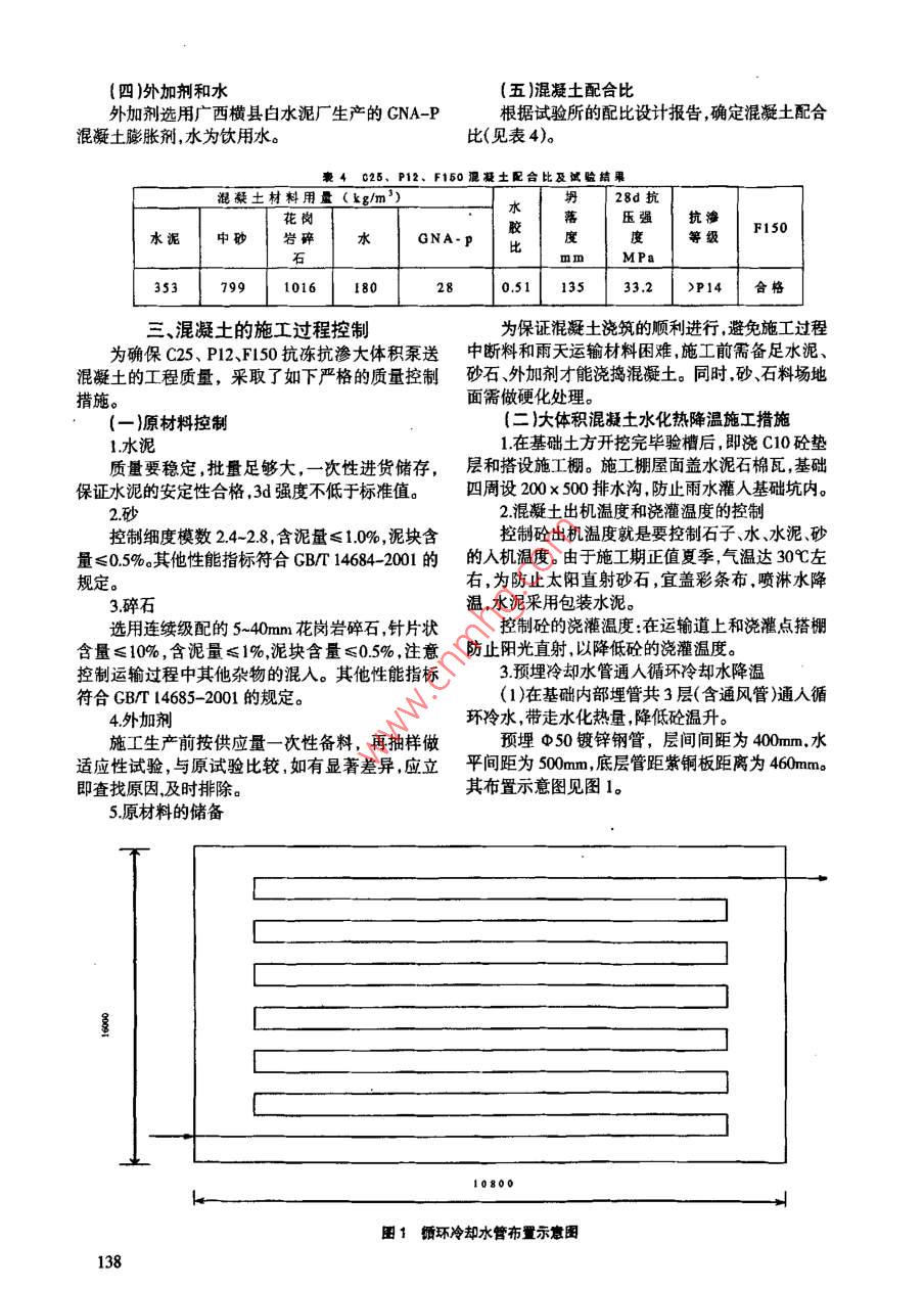 2007年第09期No092007總第88期)COASTAL ENTERPRISES AND SCIENCE TECHNOLOGYCumulatively NO 88)抗凍抗?jié)B混凝士在空分塔基礎(chǔ)中的應(yīng)用沙惠斌[摘要〕文章通過制氧機(jī)空分塔蒸礎(chǔ)混凝土原材料的選用、配合比設(shè)計(jì)、施工過程質(zhì)量控制等遼徑和措施,為大體積泵遂抗凍抗?jié)B混凝土的施工找到一奈較好的解決辦法關(guān)鍵詞]抗凍;抗?jié)B;混凝土;空分塔基礎(chǔ);施工作者簡介]沙惠斌,廣西壯族自治區(qū)冶金建設(shè)公司,廣西柳州,545000[中圖分類號(hào)]TU7[文獻(xiàn)標(biāo)識(shí)碼]A[文章編號(hào)]1007-723(2007)09-0137-0003、概述度的前提下,同時(shí)滿足結(jié)構(gòu)抗凍、抗?jié)B抗裂、耐久柳鋼2000mh制氧機(jī)組工程是柳鋼技改的性等問題。根據(jù)以上要求,結(jié)合柳鋼15000m加空重要工程。土建工程由廣西冶金建設(shè)公司施工。作分塔設(shè)備基礎(chǔ)的施工經(jīng)驗(yàn),采取就近取材經(jīng)濟(jì)合為2000mh制氧機(jī)工程的關(guān)鍵設(shè)備基礎(chǔ)—空理原則,確定出最適宜的配合比和施工工藝應(yīng)用分塔設(shè)備基礎(chǔ)上半部為長16mx寬108mx高于工程施工,解決了施工中的技術(shù)問題,圓滿地完l6m的大體積鋼筋混凝土基礎(chǔ)。混凝土的設(shè)計(jì)和成了施工任務(wù),得到業(yè)主和監(jiān)理單位的好評(píng)施工要求:強(qiáng)度為C25、抗?jié)B等級(jí)P12和抗凍等級(jí)二、原材料的選用及混凝土配合比F150(即C25、P12、F150),采用泵送施工,一次性連)水泥續(xù)澆筑成型。水泥采用P0325級(jí)鋼花牌普通硅酸鹽水泥,該工程的混凝土配合比設(shè)計(jì)的難點(diǎn)是需同時(shí)其技術(shù)性能見表1??紤]混凝土可泵性、大體積水化熱以及在滿足強(qiáng)水泥的物理性能凝結(jié)時(shí)間檢測(cè)標(biāo)準(zhǔn)(h: min)抗壓強(qiáng)度(MPa)抗折強(qiáng)度( MPa)細(xì)度安項(xiàng)目興度\初(%)定凝終凝3d28d性26.62:333:4514.936.73.56.04.8合格數(shù)據(jù)(二)死的篩分結(jié)果符合Ⅱ區(qū)。其性能指標(biāo)見表2。細(xì)骨料選用柳州中砂,堅(jiān)固性符合要求。砂子饔2砂物理性能檢測(cè)項(xiàng)目細(xì)度模數(shù)表觀密度堆積密度含泥量泥塊含量kg/)(kg/=)金測(cè)數(shù)據(jù)2.526801560三)碎石江,堅(jiān)固性符合要求。其性能指標(biāo)見表3。5-40mm花崗巖碎石,連續(xù)級(jí)配,產(chǎn)地廣東廉3粗骨料性能指標(biāo)檢測(cè)含泥量泥塊含量壓碎值針片狀松散體積(%)密度密度(%)(kg/m)I(kg/m)檢測(cè)數(shù)14702720137四)外加劑和水五)混凝土配合比外加劑選用廣西橫縣白水泥廠生產(chǎn)的CNA-P根據(jù)試驗(yàn)所的配比設(shè)計(jì)報(bào)告確定混凝土配合混凝土膨脹劑,水為飲用水比(見表4)。豪4c25、P12、F150混凝土配合比及試監(jiān)結(jié)果混礙土材料用量(kg/m58d抗壓強(qiáng)抗?jié)B水泥中砂巖碎膠等級(jí)F150水P度比353799101618005113533.2>P14合格三、混凝土的施工過程控制為保證混凝士澆筑的順利進(jìn)行避免施工過程為確保C25、P12、F50抗凍抗?jié)B大體積泵送中斷料和雨天運(yùn)輸材料困難施工前需備足水泥、混凝土的工程質(zhì)量,采取了如下嚴(yán)格的質(zhì)量控制砂石、外加劑才能澆搗混凝土。同時(shí),砂、石料場地措施。面需做硬化處理。(一)原材料控制二)大體積混凝土水化熱降溫施工措施1水泥1在基礎(chǔ)土方開挖完畢驗(yàn)槽后,即澆C10砼墊質(zhì)量要穩(wěn)定批量足夠大,一次性進(jìn)貨儲(chǔ)存,層和搭設(shè)施工棚。施工棚屋面蓋水泥石棉瓦,基礎(chǔ)保證水泥的安定性合格,3d強(qiáng)度不低于標(biāo)準(zhǔn)值。四周設(shè)200×500排水溝,防止雨水灌人基礎(chǔ)坑內(nèi)。2砂2混凝土出機(jī)溫度和澆灌溫度的控制控制細(xì)度模數(shù)24-2.8,含泥量≤1.0%,泥塊含控制砼出機(jī)溫度就是要控制石子、水、水泥砂量≤05%其他性能指標(biāo)符合GBT14684-200的的入機(jī)溫度。由于施工期正值夏季氣溫達(dá)30℃左規(guī)定。右,為防止太陽直射砂石,宜蓋彩條布,噴淋水降3碎石溫,水泥釆用包裝水泥。選用連續(xù)級(jí)配的5~40mm花崗巖碎石,針片狀控制砼的澆灌溫度:在運(yùn)輸?shù)郎虾蜐补帱c(diǎn)搭棚含量≤10%,含泥量≤1%泥塊含量≤05%,注意防止陽光直射,以降低砼的澆灌溫度控制運(yùn)輸過程中其他雜物的混入。其他性能指標(biāo)3預(yù)埋冷卻水管通人循環(huán)冷卻水降溫符合GBT14685-2001的規(guī)定。(1)在基礎(chǔ)內(nèi)部埋管共3層(含通風(fēng)管)通入循4外加劑環(huán)冷水,帶走水化熱量,降低砼溫升施工生產(chǎn)前按供應(yīng)量一次性備料,再抽樣做預(yù)埋Φ50鍍鋅鋼管,層間間距為400mm,水適應(yīng)性試驗(yàn),與原試驗(yàn)比較如有顯著差異應(yīng)立平間距為500m,底層管距紫銅板距離為460mm即查找原因及時(shí)排除其布置示意圖見圖1。5原材料的儲(chǔ)備10800圖1環(huán)冷卻水管布置示意圖冷卻水管在砼終凝后即刻通水降溫,循環(huán)水汽車現(xiàn)場值班直接排入廠區(qū)污水口。冷卻水管在砼養(yǎng)護(hù)完畢后為預(yù)防輸送泵堵管時(shí)造成人為的施工縫現(xiàn)場用水泥砂漿灌漿封閉(壓力灌漿)安排值班維護(hù)工5人,及時(shí)清管;同時(shí),搭設(shè)運(yùn)輸?shù)?2)根據(jù)設(shè)計(jì)要求,混凝土內(nèi)外溫差不大于一條,運(yùn)輸?shù)烙娩摴艽钤O(shè),鋼管不允許埋入砼中。25℃