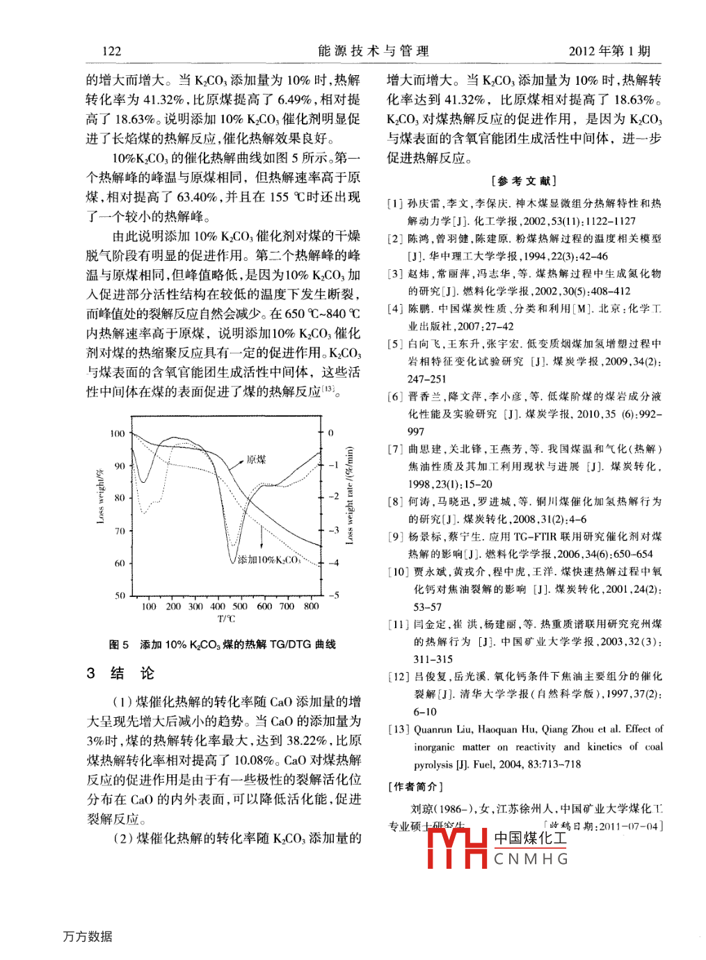 120能源技術與管理2012年第1期d:10.3969isn.l672-9943.201201.047新疆伊守長焰媒催化熱解行為的熱重研究劉瓊,吳國光,孟獻梁,田靖胡長娥中國礦業(yè)大學化工學院,煤炭加工與高效潔凈利用教育部重點實驗室,江蘇徐州221116)[摘要]通過熱重分析技術研究了CaO和κCO3在不同添加量下對新疆伊寧長焰煤催化熱解行為的影響。實驗結果表明,當CaO的添加量為3%時,煤的熱解轉(zhuǎn)化率最大,達到38.22%,比原煤相對提高了10.08%,CaO對煤熱解反應的促進作用是由于有極性的裂解活化位分布在CaO的內(nèi)外表面,可以降低活化能,促進裂解反應;當KCO3添加量為10%時,熱解轉(zhuǎn)化率為41.32%,比原煤相對提高了1863%,KCO3對煤熱解反應的促進作用,主要是由于KCO3與煤表面的含氧官能團生成活性中間體的原因。[關鍵詞]長焰煤;催化熱解;熱重分析[中圖分類號]TQ530,2[文獻標識碼]B[文章編號]1672-9943(2012)014120430引言1實驗部分煤的熱解特性一直以來就是人們研究的焦實驗所用的原料煤為伊寧長焰煤,經(jīng)過分選點,從微觀角度的巖相顯微組分的熱解反應性研破碎、篩分得到粒度小于0.2mm空氣干燥基煤究到各種小型實驗臺架熱解生成物研究,已經(jīng)獲樣,其工業(yè)分析和元素分析結果如表1所示。實驗得了煤熱解的基本規(guī)律13。在我國,低階煤不僅所用的催化劑為Ca0和K2CO3,它們都為分析純。資源豐富,而且揮發(fā)分含量高。通過對低階煤催化煤樣制備過程中釆用機械混合法,同時按照Ca原熱解,可以獲得大量的有用原料,避免了直接燃燒子和K原子的質(zhì)量與空氣干燥基煤樣的質(zhì)量比帶來的污染和資源浪費。低階煤的催化熱解具有是1%、3%、5%、7%、10%向原煤中添加Ca0和重要的意義,可以加快低階煤的熱解速度,降低低K2CO3,混合均勻,并存于密閉玻璃容器中。階煤的熱解溫度,提高低階煤的熱解轉(zhuǎn)化率,提高表1工業(yè)分析和元素分析低階煤的目標產(chǎn)物產(chǎn)率483。人們發(fā)現(xiàn)對煤進行熱工業(yè)分析元素分析解、氣化時,一些礦物質(zhì)或添加的一些無機物對熱解、氣化具有明顯的催化作用。楊景標用熱重紅外10.238.0341.19588177.055.210.7916.240.65聯(lián)用技術研究了4種催化劑對褐煤和煙煤的催化熱重分析實驗采用德國 Netzsch公司STA熱解效果,得出的結論分別是N的催化效果大于409熱重分析儀。實驗條件:試驗煤樣約10mg,以Fe~Ca大于K和Ca~Fe的催化效果大于Ni大惰性氣體N2為氣氛,流量為100m/min,升溫速于K9。賈永斌等研究了添加不同的CaO時煤在率為30℃/min,溫升范圍為30℃-840℃。熱解器中的催化效果,發(fā)現(xiàn)不同的CaO都能增加22結果與討論各種煤氣的產(chǎn)量0。在煤化學領域熱重分析法TG得到了廣泛21原煤熱解特性分析的應用。熱重分析法是利用熱天平在程序控制溫原煤在N2下的熱解失重曲線(TG)和失重速度的條件下,測量物質(zhì)的質(zhì)量與溫度的關系的一率曲線(DTG)如圖1所示。從熱解失重曲線(TG)種熱分析技術,主要優(yōu)點有儀器操作簡便,準確度可以得出,伊寧長焰煤的熱解隨溫度的升高而不高,靈敏快速,以及試樣微量化等。斷加深V凵中國煤化工了3483%。其中,本文通過熱重實驗研究了兩種催化劑CaO室溫CNMHG階段,主要是脫和KCO3在不同添加量下對新疆伊寧長焰煤催化水,脫除吸附的氣體,如N2和CH等以及脫側(cè)鏈熱解行為的影響,從而獲得對新疆伊寧長焰煤熱羧基反應釋放出部分小分子物質(zhì)。原煤第一個熱解具有優(yōu)良催化效果的催化劑。解峰的峰溫為75℃,熱解速率是1.5%/min。從圖2012年第1期劉瓊,等新疆伊寧長焰煤催化熱解行為的熱重研究1211中可以看出300℃-600℃內(nèi)為長焰煤的活潑熱3%CaO的催化熱解曲線如圖3所示。添加分解階段,以解聚和分解為主,生成大量的揮發(fā)物3%CaO煤樣的第一個熱解峰的峰溫與原煤幾乎(煤氣和焦油),煤氣的成分主要是氣態(tài)烴,還有熱相同,但峰溫處的熱解速率與原煤相比,提高約解水、一氧化碳和二氧化碳。由TG曲線可知此階1%/min。由圖中可明顯看出在干燥脫氣階段,熱段煤樣質(zhì)量迅速下降,熱解轉(zhuǎn)化率達到23.49%。解更加深人。添加3%CaO煤樣的第二個熱解峰的由mrG曲線可以看岀,原煤第二個熱解峰的峰溫峰溫與原煤相同,但峰值略低。峰值略低的原因是為4626℃,熱解速率是400%/min。600℃-840℃3%CaO加入后促使部分活性結構在較低的溫度階段內(nèi)主要發(fā)生煤分子間的熱縮聚反應,析出的下即發(fā)生斷裂,而峰值處的裂解反應自然會減少焦油量極少,揮發(fā)物主要是煤氣,700℃后煤氣的由DTG曲線可知添加3%CaO煤樣的第三個熱解主要成分是氫氣。從DTG曲線可以看出熱縮聚階峰的峰值為200%/min,該峰是二次脫氣的一部段的熱解峰幾乎被拉平一般,說明此階段的熱解分,而原煤對應的峰似乎被拉平一樣,這說明添加反應不明顯。3%CaO后,煤樣的熱解速率得到提高,該處的熱解程度加深。CaO對長焰煤熱解反應的促進作用0是由于有極性的裂解活化位分布在Ca0的內(nèi)外表面,可以降低活化能,促進裂解反應12)。原煤100200300400500600700800添加3%Ca0圖1原煤在氮氣下的熱解 TG/DTG曲線22CaO催化熱解特性研究煤的催化熱解轉(zhuǎn)化率與CaO添加量的關系如圖2所示,煤催化熱解的轉(zhuǎn)化率隨CaO添加量100200300400500600T/℃的增大呈現(xiàn)先增大后減小趨勢。當CaO的添加量圖3添加3%caO煤的熱解TG/DTG曲線為3%時,煤的熱解轉(zhuǎn)化率最