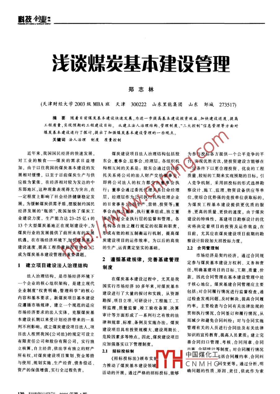 科技創(chuàng)業(yè);淺談煤炭基本建設(shè)管理鄭志林(天津財經(jīng)大學2003級MBA班天津 300222 山東里能集團 山東鄒域273517)摘要隨著目前煤炭基本建設(shè)快速發(fā)展,為進一步提高基本建設(shè)投資效益、加快建設(shè)進度、提高工程質(zhì)量,實現(xiàn)預期的工程建設(shè)目標。從建立法人治理結(jié)構(gòu)、管理制度、“三大控制”信息管理等方面對煤炭基本建設(shè)進行了探討,提出了加強煤炭基本建設(shè)管理的一些觀點。關(guān)鍵詞法人治理制度質(zhì)量控制近年來,我國國民經(jīng)濟的快速發(fā)展,煤炭建設(shè)項目法人治理結(jié)構(gòu)包括股為參與投標各方提供一個公平競爭的平對工業(yè)的糧食--煤炭的需求日益增東會 、董事會、監(jiān)事會、經(jīng)理層。各組織機臺,實現(xiàn)優(yōu)勝劣汰,使投資建設(shè)方能夠在加,由于以往我國的煤炭基本建設(shè)的發(fā)構(gòu)相互間的關(guān)系是:股東會通過信任委-定條件下以更合理投資、優(yōu)良的工程展相對緩慢,以至于目前煤炭生產(chǎn)與供托關(guān)系將 公司的法人財產(chǎn)交給董事會,質(zhì)量.較短的工期來實現(xiàn)預期的目標。引應極為緊張,在經(jīng)濟相對較為發(fā)達的中即將 公司法人的權(quán)力都交由董事會執(zhí)人競爭機制,采用招投標的形式選擇勘東部地區(qū),這種現(xiàn)象表現(xiàn)得尤為突出,在行; 董事會通過委托代理關(guān)系任命經(jīng)理察設(shè)計、施工、監(jiān)理.物資設(shè)備供應等單.--定程度上影響了社會經(jīng)濟健康穩(wěn)定發(fā)層,經(jīng)理層作為公司執(zhí)行機構(gòu)處理企業(yè)位,使綜合優(yōu)勢強的競投單位獲取標的,展。為緩解煤炭供需矛盾,擺脫制約國民的日常事務,包括生產(chǎn)、營銷、投資等;董為煤炭工程基本建設(shè)提供更優(yōu)質(zhì)的服經(jīng)濟發(fā)展的“瓶頸",我國加快了煤炭工事會由獨立董事、執(zhí)行董事組成,獨立董務、更高的質(zhì)量.更快的速度。由于煤炭業(yè)建設(shè)力度,生產(chǎn)能力達23-25億t的事 負責對企業(yè)執(zhí)行層的監(jiān)督和管理。各建設(shè)的特殊性,基建項目勘察設(shè)計的優(yōu)13個大型煤炭基地正在規(guī)劃建設(shè)中,為機構(gòu)各自獨立履行規(guī)定的權(quán)限和職責,劣將決定著項 目的投資及運作效益,在煤炭行業(yè)的發(fā)展提供了前所未有的發(fā)展形成有效的相互制衡運行機制,提高煤目前,尤其應在煤炭建設(shè)項目前期的勘機遇。在市場經(jīng)濟環(huán)境下,加快煤炭基本炭建設(shè)項目的運作效率,為以后的高效察設(shè)計階段加大招投標力度。建設(shè)速度、提高工程質(zhì)量和投資效益,已的生產(chǎn)、運營奠定堅實的基礎(chǔ)。2.2合同管理制成為煤炭基本建設(shè)管理的重要課題。2遵循基建規(guī)律,完善基建管理市場經(jīng)濟是契約經(jīng)濟,通過合同規(guī)定參與煤炭基本建設(shè)方權(quán)利、義務和責1建立項目建設(shè)法人治理結(jié)構(gòu)制度任,明確基建項目的目標、工期、質(zhì)量.價法人治理結(jié)構(gòu),是市場經(jīng)濟環(huán)境下在煤炭基本建設(shè)過程中,尤其是我款,因此合同管理在基本建設(shè)管理中處一個企業(yè)的核心組織架構(gòu),是建立現(xiàn)代國實行市場經(jīng)濟10多年來,對煤炭基本于核心地位。煤炭基建合同管理應主要企業(yè)制度“權(quán)責明確,管理科學"的核心建設(shè)進行了大量的探討和實踐,從資源.包括:對合同履行情況進行監(jiān)督檢查,通內(nèi)容和基本要求。新煤炭項目基本建設(shè)勘探項目立項.可研設(shè)計、工程施工、工過檢查發(fā)現(xiàn)問題,及時解決,提高合同履應遵循市場規(guī)律,建立一個規(guī)范的適應程監(jiān)理.質(zhì)量監(jiān)督、竣丁驗收備案、決算約率。主要檢查與合同有關(guān)法律法規(guī)的市場經(jīng)濟要求的法人實體,克服煤炭基審計等方面形成了一系列行之有效的法貫徹執(zhí)行情況,合同簽訂和履行情況,從本建設(shè)長期以來受計劃經(jīng)濟帶來的一系律和規(guī)章標準、條例及實施辦法。煤炭而減少和避免合同糾紛;對與合同實施列不利影響。成立煤炭建設(shè)項目法人,項建設(shè)項目具有投資規(guī)模大.建設(shè)周期長、管理有關(guān)的人員進行合同法及有關(guān)法律目法人按照我國《公司法》的規(guī)定可設(shè)立危險因素多等特點。因此,煤炭建設(shè)項目知識的宣傳教育,提高人員素質(zhì);建立完有限責任公司和股份有限公司,實行獨應加強落實以下管理制度。善合同歸口管理、考核、合同用章、合同立核算,自主經(jīng)營,依法享有獨立的財產(chǎn)出賬會同統(tǒng)計等制度;對合同履行情況所有權(quán),對煤炭建設(shè)項目策劃.資金籌措2.1 招標投標制<招標投標法》頒布實前中國煤化工括合同履約率,合同糾與使用、規(guī)劃實施、生產(chǎn)經(jīng)營、債務償還、力推動了煤炭基本建設(shè)領(lǐng)域HC N M H G同變更等。通過分析,明資產(chǎn)的保值增值,實行全過程負責?;顒拥拈_展。通過嚴格的招標投標,能夠確問題的性質(zhì)、原因、責任,依此作為索30分務數(shù)據(jù)”2005 年第4期理論視野賠和解決其他問題依據(jù)。質(zhì)量達到合同規(guī)定的要求,嚴格T程質(zhì).編制基建工.