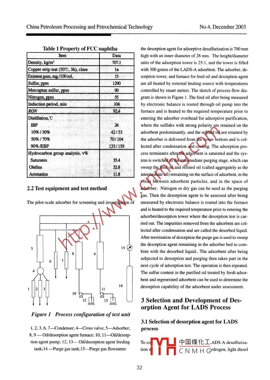 Advances in Refining TechnologyStudy of Desorption Agent for LADS ProcessZhang Xaojing; Qin Ruyi; Liu Jinlong(LPEC Refining Research Institute, Luoyang 471003)Abstract: This article refers to the procedure for selection, evaluation and development of the LADS-Ddesorption agent associated with the LADS-A adsorbent used in the non-hydroprocessing adsorptive des-ufurization (LADS) process for FCC naphtha developed by LPEC Refining Research Institute. The LADS-Ddesorption agent can effectively remove the sulfides adsorbed on the LADS-A adsorbent. The saturatedLADS-A adsorbent can be instantly regenerated by the LADS-D desorption agent to recover its adsorptionactivity. The LADS-D desorption agent can not only effectively remove all impurities adsorbed on theadsorbent, but also has strong ability to dissolve the impurities to keep a stable desorption efficiency ofadsorbent to be basically commensurate with fresh adsorbent after extended use.Key words: catalytic cracking; gasoline material; adsorbent; desorption agent; desulfurization; regeneration1 Introductionalso significantly increase the investment in production unitand operating difficulties along with increase in energy con-The LADS process is a patented non-hydroprocessing pro-sumption of the unit. It is very important to look for andcess of desulfrization1-3) through adsorption of FCC gaso-develop a desorption agent that could efctively desorb andline developed by LPEC Refining Research Institute, takingregenerate the deactivated adsorbent for sulfur removal.into account the characterstics of sulfides contained in FCC Hence the LPEC Refining Research Institute in parallel withgasoline in order to avoid the shortcomings of current soliddevelopment of the LADS- A adsorbent for sulfur removaladsorbents. This process adopts the fixed-bed adsorptionhas carried out the selection and investigation of the desorp-unit to adsorb on the adsorbent the mercaptans, disulfides,ion agent that can secure a functional coordination to thethioethers, and thiophenes contained in gasoline in order toadsorbent developed.reduce the sulfur content in gasoline. The adsorbing agentadopted in this process is the LADS-A adsorbent developed2 Experimentalby the LPEC Refining Research Instiute.2.1 Feedstock propertyThe specifics of FCC distillates determine the special fea-tures of organic sulfides contained in the disilates. The prop-The feedstock used in the experiments is the FCC naphtha,erties of organic sulfides contained in FCC ditillates are simi-the property of which is presented in Table 1. .lar to those of the hydrocarbons constituting the FCCditillates. So it is very difficult to find an appropriate adsor-It can be seen from Table 1 that the FCC naphtha is character-bent that can selectively adsorb the sulfides contained in theized by high sulfur and olefin contents and short inductionhydrocarbons, and moreover due to strong adhesion of sul-period. The result of ASTM ditllation shows that the tem-fides on the solid adsorbent the resins are also adsorbed onperature at which 30% is recovered is 53"C, and 50% of frac-the solid adsorbent and cannot be recovered by conven-tion is recovered at 70'C, and the EBP is 159C. The gasolinetional desorption method. Application of once -through ad-fraction is quite light, whereas the content of existen gum issorbent is not practical and uneconomical. Regeneration of中國煤化工have derimental efetsaturated adsorbent through frequent coke buning wouldMYHCNMHG31China Petroleum Processing and Petrochemical TechnologyNo.4, December 2003Table 1 Property of FCC naphthathe desorption agent for adsorptive desulfurization is 700 mmItemDatahigh with an inner diameter of 28 mm. The heighudiameterDensity, kg/m3707.1 iratio of the adsorption tower is 25:1, and the tower is flldCopper strip test (50C, 3h), classlaiawith 300 grams of the LADS-A adsorbent. The adsorber, de-Existent gum, mg./100mL15sorption tower, and fumnace for feed oil and desorption agentSulfur, ppmare all heated by external heating source with temperaturesMercaptan sulfur, ppm0controlled by smart meters. The sketch of process flow dia-Nitrogen, ppm55gram is shown in Figure 1. The feed oi after being measuredInduction period, min104by electronic balance is routed through oil pump into theRON924furnace and is heated to the required temperature prior toDisillation,Centering the adsorber overhead for adsorptive purification,IBP24where the sulfides with strong polarity are retained on the10%/30%42/53adsorbent predominantly, and the refined oil not retained by50%170%70/ 104the adsorber is delivered from the tower bottom and is col-90% /EBP135/159lected after condensation and cooling. The adsorption pro-| Hydrocarbon group analysis, v%cess terminates after the adsorbent is saturated and the sys-Saturates35.4tem is switched to the intermediate purging stage, which canOlefinssweep the feed oil and refined oil (alled aggregately as theAromatics11.8intermediate oil) remaining on the surface of adsorbent, in thevoids between adsorbent particles, and in the space of2.2 Test equipment and test methodadsorber. Nitrogen or dry gas can be used as the purginggas. Then the desorption agent to be asessed after beingThe pilot-scale adsorber for screening and investigation of measured by electronic balance is routed into the furnaceand is heated to the required termperature prior to entering theadsorber/desorption tower where the desorption test is car-ried out. The impurities removed from the adsorbent are col-lected after condensation and are called the desorbed liquid.After termination of desorption the purge gas is used to sweep515日the desorption agent remaining in the adsorber bed to com-bine with the desorbed liquid.. The adsorbent after beingsubjected to desorption and purging then takes part in thenext cycle of adsorption test. The operation is then repeated.The sulfur content in the purified oil treated by fresh adsor-bent and regenerated adsorbent can be used to determine