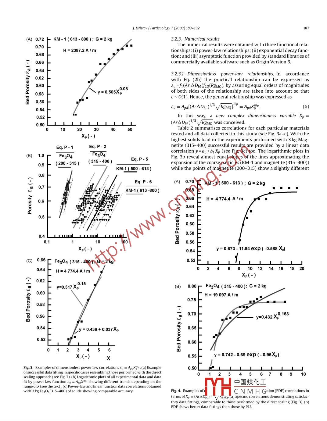 Particuology 7 (2009) 183-192Contents lists available at ScienceDirectPARTICLJOLOGY |ParticuologyEL SEVIERjournal homepage: www. elsevier. com/locate/particMagnetically assisted gas-solid fluidization in a tapered vessel: Part IIDimensionless bed expansion scalingJordan HristovDepartment of Chemical Engineering. University of Chemnical Technology and Metallurgy, 1756 Sofa, 8 KL Ohridsky BIvd, BulgariaA RTICLE . INFOABSTRACTArticle history:The article presents an effort to create dimensionless scaling correlations of the overall bed porosity inReceived 7 October 2008the case of magnetically assisted fluidization in a tapered vessel with external transverse magnetic field.Accepted 6 January 2009This is a stand of portion of new branch in the magnetically assisted fluidization recently created con-cerning employment of tapered vessels. Dimensional analysis based on "pressure transform" of the initialset of variables and involving the magnetic granular Bond number has been applied to develop scaling. Funidizationrelationships of dimensionless groups representing ratios of pressures created by the fluid flow, gravityMagnetization FIRSTand the magnetic field over an elementary volume of the fluidized bed. Special attention has been paid onTapered bedthe existing data correlations developed for non-magnetic beds and the links to the new ones especiallyDimensional analysisPressure transform of variablesdeveloped for tapered magnetic counterparts. A special dimensionless variable Xp = (ArADbl)/3 V RgmQMagnetic granular Bond numbercombining Archimedes and Rosensweig numbers has been conceived for porosity correlation. Data cor-Rosensweig numberrelations have been performed by powe-law, exponential decay and asymptotic functions with analysisPorosity correlationsof their adequacies and accuracies of approximation.◎2009 Chinese Society of Particuology and Institute of Process Engineering, Chinese Academy ofSciences. Published by EIsevier B.V. All rights reserved.1. Introductionof Geldart's class B has been reviewed by Hristov (2002, 2003a,2003b, 2004, 2006a, 2007a). Recently, promising results concern-Tapered gas-solid fluidization (Mathur & Epstein, 1974) origi-ing magnetically assisted nano-fuidization have been reported bynally conceived for gas-fluidization of Geldart's D particles (Geldart,Hao, Zhu, Lei, and Li (2008a), Hao, Zhu, Jjiang, and Li (2008b) with1973) have encountered in many areas of chemical, mining anddirect mass transfer applications pertinent to CH4-CO2 reforming.food industries. Recently fluidization of cohesive particles (DeivaThe present article addresses scaling correlations of overallVenkatesh, Chaouki, & Klvana, 1996; Erbil, 1998) and drying of pas-porosity of magnetically assisted gas fluidized tapered beds withtas (Bacelos & Freire, 2008; Bacelos, Passos, & Freire, 2007) haveMagnetization FIRST mode. The first report in this new trendbeen developed in two- and three-dimensional tapered vessels. Inin magnetically assisted fluidization was presented by Hristovthis context, remotely controlled tapered fuidized gas- solids beds(2008). Dimensionless groups provided by the“pressure trans-have been conceived (Hristov, 2008, 2009) by means of magnetiz-form" approach (Hristov, 2006a, 2007b) are used to develop furtherable solids and external transverse magnetic field.results on porosity scaling relationship. A special standpoint isThe magnetically assisted fluidization deals with magneticdeveloped to link the existing empirical and semi-empirical corre-solids fluidized by liquid(Hristov, 2006a), gas (Hristov, 2002, 2003a,lations pertinent to non-magnetic tapered beds (DiFelice, Foscolo,2005, 2006b, 2007c) or gas-liquid flow (Hristov, 2007a) withGibilaro, Wallis, & Carta, 1991; Gui & Grace, 2008; Kmiec, 1975, 1977,two basic magnetization modes: Magnetization FIRST (preliminary1980) to the new situation arising in magnetically assisted taperedmagnetization of fixed bed and consequent fluidization) and Mag-beds (MATB) with controlled interparticle forces.netization LAST (magnetization of preliminarily fluidized beds).The hydrodynamic behaviour of such beds with coarse particles2. ExperimentalThe experimental set-up was described in details by Hristov(2008) so only some basic information pertinent to the results is tobe provided in this work. A conical vessel(15° opening angle, 30 mmfunction.ID-bottom diam中國煤化1eter) surrounded byE-mail address: jordan.hristov@mail.bg.saddle coils (Hnm ID and 400 mmURL: http://www.hristov.com/jordan.in height was uYHC N M H Gnted transversely to1674- 2001/$ - see front matter 0 2009 Chinese Society of Particuology and Institute of Process Engineering, Chinese Academy of Sciences. Published by EIsevier B.V. All rights reserved.doi:10.1016/j.partic.2009.01.012184J Hristov / Particuology 7 (2009) 183- 192NomenclatureRep = pdbU/nj particle Reynolds numberAeddimensionless pre- factor in EDF expressed throughRg= (ρ2U2jμM2) Rosensweig number (basic definition),- -see Eq. (7)Rgm=(pjU21uoMsH) Rosensweig number expressed in termsdimensionless exponential pre-factor in EDIof Msexpressed through Xp- see Eq, (7)Rgme = ((16/r2D2)(pjQ2/uoMsH)) Rosensweig numberAaddimensionless asymiptote in the asymptotic func-expressed in terms of the volumetric flow rate Qtion expressed through Xp- see Eq. (8)Sb = πD7/4 cross-section area of the gas inlet orifice (m2 )ILfree term in the linear approximation y=al + brXpUsuperficial gas velocity (denoted also as Ug see theAr = (dPr(Ps - Pr)g)/nf Archimedes numbertext) (m/s)badimensionless pre-factor of the asymptotic functionJbsuperficial fluid velocity defined through the coneexpressed through- -see Eq. (8)Xpentance cross-see 1pre-factor in linear approximationy=an +bLXpMp/Ps volume occupied by the solids (m3)Bog-c= Pc/Pg = Pc/(Psgdp) Bond number of granular mate-(thbo/12)(D吃+ DrD, + Dg)(m3)rials with a natural cohesionindependent variable (see the text)Bog-m =(LoMH)/Psgdp magnetic Bond number for granularXp = (Ar