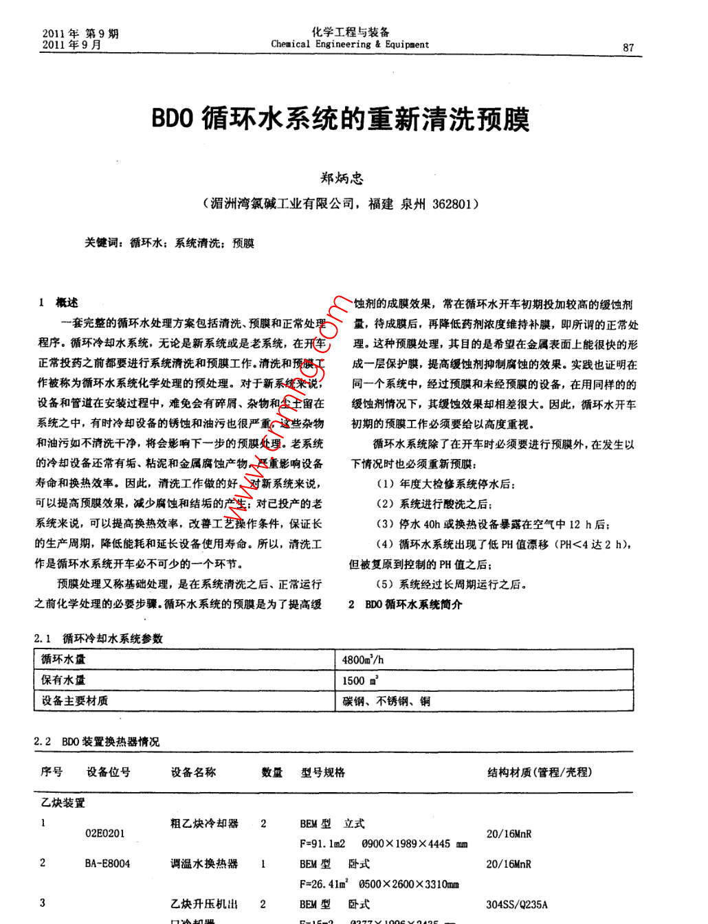 BDO循環(huán)水系統(tǒng)的重新清洗預(yù)膜