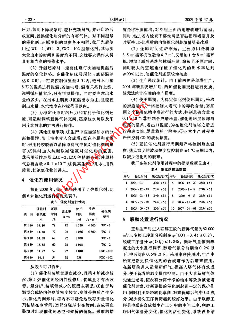 第4期王成夏等合成氨聯(lián)產(chǎn)甲醇生產(chǎn) 運(yùn)行總結(jié)●27●化劑床層溫度以及調(diào)整各塔生產(chǎn)負(fù)荷。加熱器控制升溫速率( <30 C/h)。當(dāng)催化劑熱點(diǎn)(2)可根據(jù)雙塔催化劑的使用時(shí)間,及時(shí)調(diào)節(jié)溫度達(dá)到70 C后升溫速率降至<5 C/h。溫度達(dá)合成塔在串并聯(lián)生產(chǎn)中的位序;并可根據(jù)各塔催化到80C以后,因有少量反應(yīng)熱放出,應(yīng)放慢升溫速劑活性的強(qiáng)弱,及時(shí)提高催化劑床層的熱點(diǎn)溫度率,并試放水。此時(shí)操作上以催化劑床層溫差為主(≤5C/次),始終保持催化劑活性控制在最佳反要控制依據(jù),即床層頂部與底部溫差控制在8C之應(yīng)區(qū)域提高CO和CO2轉(zhuǎn)化率。內(nèi)。如果加電后溫度達(dá)到8 C,應(yīng)降電恒溫操作,(3)串聯(lián)使用時(shí),可適當(dāng)加大前塔新鮮氣的補(bǔ)當(dāng)恒溫到頂部與底部渴差又降至5 C以下時(shí),再加人量,可在滿足合成塔技術(shù)指標(biāo)的范圍以內(nèi)多開(kāi)循電進(jìn)行升溫。環(huán)機(jī),增加生產(chǎn)負(fù)荷,以產(chǎn)醇為主。后塔可以通過(guò)(2)還原初期。當(dāng)溫度達(dá)到90 C以后,應(yīng)重點(diǎn)少量補(bǔ)充新鮮氣氣量,不開(kāi)循環(huán)機(jī),以方便熱點(diǎn)操注意每次提溫后溫差的變化情況,只要能夠?qū)⒋呋鳛橹鳌Mㄟ^(guò)減少后塔生產(chǎn)負(fù)荷,達(dá)到控制醇后氣劑床層的頂部與底部溫差控制在8C以內(nèi),并經(jīng)過(guò)成分的目的,提高甲醇轉(zhuǎn)化率。操作中控制醇后氣恒溫后又縮小到5 C以下,可繼續(xù)提溫操作。在這一CO和CO2體積分?jǐn)?shù)在≤0.5%以下。若采用上述組時(shí)期操作上不宜以出水量的多少?zèng)Q定是否提溫,而應(yīng)合方法,醇后氣仍然超過(guò)標(biāo)準(zhǔn),則要考慮更換催化劑。以催化劑床層溫度的變化來(lái)判斷是否提溫或恒溫。(4)醇氨比的調(diào)整范圍大,可以根據(jù)產(chǎn)品市場(chǎng)(3)還原主期。當(dāng)溫度在105 ~ 130 C之間時(shí),情況任意調(diào)整醇氨比負(fù)荷。在甲醇市場(chǎng)利潤(rùn)較大應(yīng)重點(diǎn)關(guān)注催化劑床層頂部與底部的溫差以及系的情況下,可以采用并聯(lián)雙塔進(jìn)行生產(chǎn),雙塔各自統(tǒng)壓力、循環(huán)氫含量、水汽濃度和出水量的變化。配備循環(huán)機(jī),增加入塔循環(huán)氣體,使反應(yīng)不完全的由于均溫型合成塔及銅基催化劑的特性,決定了銅基催化劑在還原過(guò)程中將會(huì)產(chǎn)生出水量集中、出水氣體再次得到利用,提高甲醇產(chǎn)量。(5)雙塔工藝生產(chǎn)調(diào)整后,一塔更換催化劑,放熱量多的問(wèn)題。此時(shí)期是催化劑還原的關(guān)鍵時(shí)期,溫升速率應(yīng)控制在<2 C/h。如果加電提溫后另-塔仍可維持正常生產(chǎn)。(6)雙塔工藝生產(chǎn)的缺點(diǎn)是操作過(guò)程中雙塔進(jìn)行降電恒溫操作時(shí),溫度沒(méi)有按照前期溫度的運(yùn)溫度的操作相互制約,相互影響。行曲線的規(guī)律停止在預(yù)期的溫度上,而又有繼續(xù)上升的趨勢(shì),同時(shí)系統(tǒng)壓力下降、氫比降低,此時(shí)不管3催化劑升溫還原醇分能否放出還原水,都應(yīng)果斷及時(shí)地進(jìn)行大幅度撤電操作,利用降低電爐負(fù)荷、減少電爐發(fā)熱量來(lái)3.1 方案降低催化劑層的溫度。此時(shí)利用催化劑還原放出催化劑升溫還原方案見(jiàn)表2。的熱量來(lái)維持催化劑床層的熱量平衡,控制溫度進(jìn)表2催化劑升溫還原方案行恒溫出水操作,必要時(shí)可開(kāi)冷副線調(diào)節(jié)塔溫。時(shí)間催化劑升溫系統(tǒng)出水出塔水(4)還原后期。由于此階段大量出水期已過(guò),階段重展床層溫速率壓力速率汽濃度不會(huì)有溫度突然上升的情況發(fā)生,可繼續(xù)按照控制催際計(jì)度/C /心 ●h-' /MPa /hg.h- /g.m-3化劑床層溫差的辦法進(jìn)行操作。但應(yīng)注意, 160~升溫22室溫~70 305.0180 C附近仍有出水量稍大的現(xiàn)象。為了使還原完5 7 70-9050全徹底,底部溫度應(yīng)提升至235 9C恒溫,實(shí)際出水量還原初期7 14 90~105 22.5達(dá)到理論出水量的90%以上。當(dāng)頂部與底部溫差控中期25 39 105-13080制在6 ~8 C ,出水量低于10 kg/h,且水汽濃度小于后期27 66 130-235 53.00.1 g/m2時(shí),再恒溫1 h左右,確認(rèn)還原結(jié)束。恒溫2682310.5(5)換氣階段。換氣過(guò)程中因壓力提高較快、2 70 ~20氣體組分變化大,極易引起溫度失控,造成超溫垮注:空速為3 000 h-' ,氫含量體積分?jǐn)?shù)為70%。溫。因此,換氣過(guò)程必須緩慢而有準(zhǔn)備地進(jìn)行。當(dāng)3.2 過(guò)程出現(xiàn)溫度控制不住時(shí),則應(yīng)立即恢復(fù)原狀,待工況通過(guò)專用管線導(dǎo)人精煉氣,系統(tǒng)補(bǔ)壓至5.0穩(wěn)定后再進(jìn)行換氣。我廠在換氣時(shí),事先通知變換MPa,開(kāi)1臺(tái)4.7 m'/min和1臺(tái)5.0 m'/min循環(huán)工序降低CO含量至1.5%左右,經(jīng)前塔反應(yīng)后,醇后機(jī),循環(huán)量全部加足進(jìn)行升溫還原。整個(gè)過(guò)程可分氣CO含量低于0.8% ,該工況下?lián)Q氣操作較為順利。為升溫、還原恒溫和換氣4個(gè)階段。33 注意事項(xiàng).(1)升溫階段。此階段主要以升溫為主,由電(1)在還原主期發(fā)現(xiàn)熱點(diǎn)變化且同時(shí)有系統(tǒng)●28●化肥設(sh