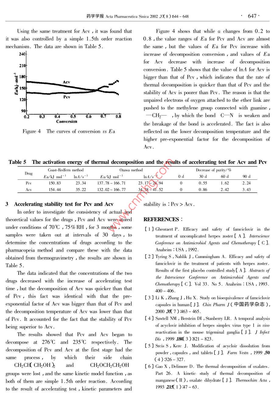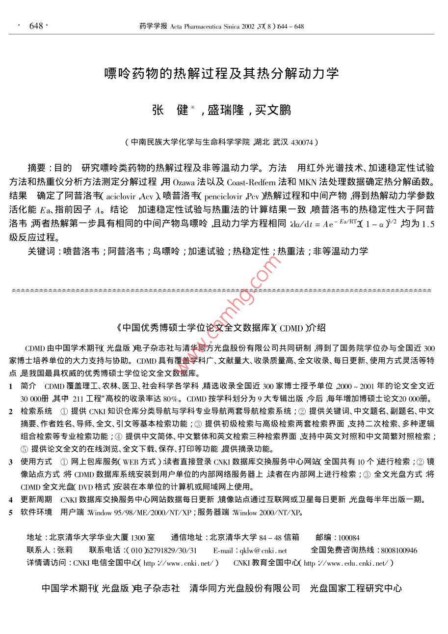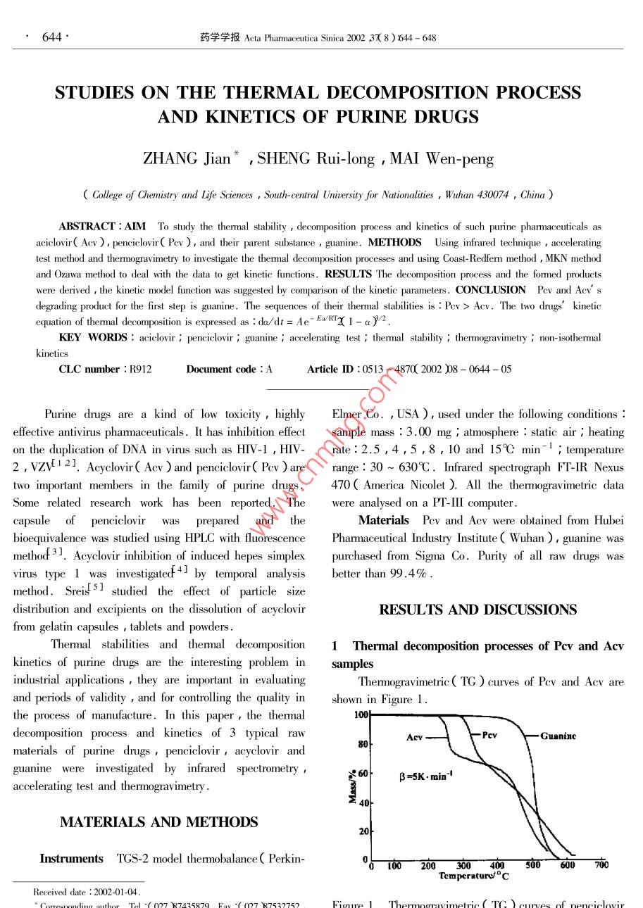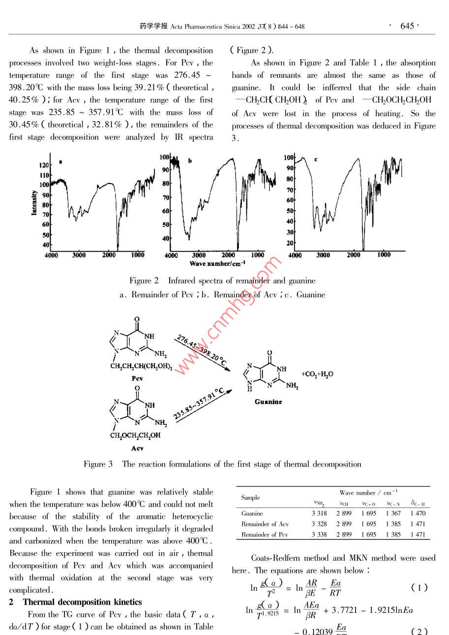 644●藥學學報Acta Pharmaceutica Sinica 2002 37 8)544 - 648STUDIES ON THE THERMAL DECOMPOSITION PROCESSAND KINETICS OF PURINE DRUGSZHANG Jian* , SHENG Rui-long , MAI Wen-peng( Cllge of Chemistry and Life Sciences , South-central Uniersity for Nationalities , Wuhan 430074 , China )ABSTRACT :AIM To study the thermal stability , decomposition process and kinetics of such purine pharmaceuticals asaciclovir( Acv ) , penciclovir( Pev ) , and their parent substance ,guanine. METHODS Using infrared technique , acceleratingtest method and thermogravimetry to investigate the thermal decomposition processes and using Coast- Redferm method , MKN methodand Ozawa method to deal with the data to get kinetic functions. RESULTS The decomposition process and the formned productswere derived , the kinetie model function was suggested by comparison of the kinetic parameters. CONCLUSION Pev and Aev' s .degrading product for the first step is guanine. The sequences of their thermal stabilities is : Pev> Acv'The two dnugs' kineticequation of themal decomposition is expressed as :da/dt= Ae~ E( 1-a)2KEY WORDS : aciclovir ; penciclovir ; guanine ; accelerating test ; thermal stability ; thermogravimetry ; non-isothermalkineticsCLC number : R912Document code :AArticle ID :0513 - 48702002 )08- 0644 - 05Purine drugs are a kind of low toxicity ,highlyElmer Co. ,USA ), used under the following conditions :effective antivirus pharmaceuticals. It has inhibition effectsample mass : 3.00 mg ; atmosphere : static air ; heatingon the duplication of DNA in virus such as HIV-1 , HIV-rate:2.5 ,4 ,5 ,8,10 and 15C min-' ; temperature2 , VZV[12]. Acyclovir( Aev ) and penciclovir( Pev )arerange: 30 ~ 630C. Infrared spectrograph FT-IR Nexustwo important members in the family of purine drugs.470( America Nicolet ). All the thermogravimetric dataSome related research work has been reported. Thewere analysed on a PT-1II computer.capsuleof penciclovir was prepared and theMaterials Pev and Acv were obtained from Hubeibioequivalence was studied using HPLC with fluorescencePharmaceutical Industry Institute ( Wuhan ) , guanine wasmethoc 31. Acyelovir inhibition of induced hepes simplexpurchased from Sigma Co. Purity of all raw drugs wasvirus type 1 was investigatet 41 by temporal analysisbetter than 99.4% .method. SreisSI studied the effect of partide sizedistribution and excipients on the dissolution of acyclovirRESULTS AND DISCUSSIONSfrom gelatin capsules , tablets and powders .Thermal stabilities and thermal decomposition1 Thermal decomposition processes of Pev and Acvkinetics of purine drugs are the interesting problem insamplesindustrial applications , they are important in evaluatingThermogravimetric( TG ) curves of Pev and Acv areand periods of validity , and for controlling the quality inshown in Figure 1.the process of manufacture. In this paper ,the thermal100}decomposition process and kinetics of 3 typical raw80Acv一-PcvGuanincmaterials of purine drugs ,penciclovir ,acyclovir andguanine 3 were investigated by infrared spectrometry ,β =SK. min-'accelerating test and thermogravimetry .E 40-MATERIALS AND METHODS2(Instruments TGS-2 model thermobalance( Perkin-0b 0 200Temperaturv°C00500 600 市Received date : 2002-01-04.Fionure1藥學學報Acta Pharmaceutica Sinia 2002 37 8)644 - 648645●As shown in Figure 1 , the thermal decomposition( Figure 2).processes involved two weight-loss stages. For Pev , theAs shown in Figure 2 and Table 1 , the absorptiontemperature range of the first stage was 276.45 ~bands of remnants are almost the same as those of398. .209C with the mass loss being 39.21 % ( theoretical ,guanine. It could be infferred that the, side 。chain40.25% ); for Aev , the temperature range of the first-CH2CH( CH20H) of Pev and - CH20CH2CH2OHstage was 235.85 ~ 357.919C with the mass loss ofof Acv were lost in the process of heating. So the30.45% ( theoretical , 32.81 % ), the remainders of theprocesses of thermal decomposition was deduced in Figureirst stage decomposition were analyzed by R spectra 3.00b10012090f1108070寶970f608174050304000 3000 2000 10004000 30020010004000 30002000Wave number/cm-!Figure 2 Infrared spectra of remainder and guaninea. Remainder of Pev ib. Remainder of Acv ic. GuanineHCH,CH2CH(CH2OH)2NH+CO+HOPev°7五NNH2GuanineCH2OCH2CH2OHAcvFigure 3 The reaction formulations of the first stage of thermal decompositionFigure 1 shows that guanine was relatively stableWave number / cm-Samplewhen the temperature was below 400C and could not meltWIH2_ vaH__ Vc=0比-N 8c-H33182899I695I367I470because of the stability of the aromatic heterocyclicRemainder of Acv3328 2899 1695 1 385 1 471compound. With the bonds broken irregularly it degradedRemainder of Pev33382899169513851471and carbonized when the temperature was above 400C.Because the experiment was carried out in air , thermalCoats- Redferm method and MKN method were useddecomposition of Pev and Acv which was accompaniedhere. The equations are shown below :with thermal oxidation at the second stage was veryg(a)AREacomplicated.IrT2= lnβE- RT(1)2 Thermal decomposition kineticsAEaIn g51g15s=In+ 3.7721 - 1.9215lnEa .From the TG curve of Pev,the basic data( T,a,71.9βRda/dT ) for stage( 1 ) can be obtained as shown in Table0.12039 Ea(2)646 .藥學學報Acta Pharmaceutica Sinia 2002 37 8)644 - 648Table2 Basic data at the first stage of Pev( β=method,compared favorably with the data of Ea from No.5C min-1 )19 ,No.20 ,No.21 and No.22 obtained by Coast- RedfemData a W/% T/K da/dT Data a W/% T/K da/dTmethod and MKN method ,and kinetic model function1 0.103 95.94 582.60 0.0100 10 0.547 79.86 608.26 0.0188No.20 whose Ea is 150.83 kJ mol -1 by Coast-Redfermn.2 0.145 94.42 586.26 0.0122 11 0.599 77.98 611.01 0.0177method ,while a value of 148.82 kJ mol- 1 obtained by3 0.198 92.52 589.93 0.0146 12 0.651 76.10 613.76 0.0164MKN method is also fairly close. It is concluded that the4 0.258 90.34 593.60 0.0170 13 0.701 74.28 617.43 0.0140kinetic equation of the thermal deco
