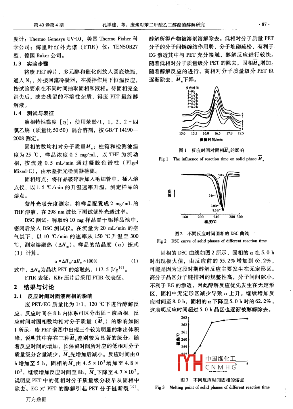 塑料工業(yè)第40卷第4期CHINA PLASTICS INDUSTRY2012年4月廢聚對(duì)苯二甲酸乙二醇酯的醇解研究孔祥建,張之鶴(1.成都理工大學(xué)材料與化學(xué)化工學(xué)院,四川成都610059;2.樂(lè)山師范學(xué)院數(shù)學(xué)與信息科學(xué)學(xué)院,四川樂(lè)山614004)摘要:研究了醇解條件對(duì)廢聚對(duì)苯二甲酸乙二醇酯(PET)醇解過(guò)程的影響,并通過(guò)凝膠滲透色譜、差示掃描量、紅外光譜、紫外分光光度儀、黏度計(jì)等多種測(cè)試手段對(duì)醇解產(chǎn)物進(jìn)行了表征。研究表明:隨著反應(yīng)時(shí)間的增加固相的數(shù)均相對(duì)分子質(zhì)量、結(jié)品度先增加后下降;醇解液的特性黏度[η]增加,紫外光透過(guò)率下降。固相完全消失后繼續(xù)延長(zhǎng)反應(yīng)時(shí)間,醇解液的[η]變化不大。在實(shí)驗(yàn)條件下,多元醇醇解廢PET的反應(yīng)活性大小順序?yàn)橐叶?丙二醇>甘油。關(guān)鍵詞:聚對(duì)苯二甲酸乙二醇酯;醇解;聚酯中圖分類(lèi)號(hào):TQ320.2文獻(xiàn)標(biāo)識(shí)碼:A文章編號(hào):1005-5770(2012)04-0086-05Study on Alcoholysis of Waste PETKONG Xiang-jian, ZHANG Zhi-he2(1. College of Materials, Chemistry and Chemical Engineering, Chengdu University of TechnologyChengdu 610059, China;2. College of Mathematics and Information Science, Leshan Normal University, Leshan 614000, China)Abstract: The influences of alcoholysis conditions for waste poly(ethylene terephthalate )(PET)onthe intrinsic viscosity of the glycolysis products were studied, and the products were characterized by manymethods. The results showed that the number-average molecular weight and the crystallinity of the solid phaseof waste Pet increased firstly and then decreased, the intrinsic viscosity of liquid phase [n] increased andUV transmittance decreased with the increasing of reaction time. Under the experiment conditions, the reac-tivity order of different glycols was ethylene glycol >propylene glycol >glycerolKeywords: PET; Alcoholysis; Polyester隨著聚對(duì)苯二甲酸乙二醇酯(PET)產(chǎn)量和消費(fèi)產(chǎn)物特性的影響量的不斷增加,回收利用廢PET,實(shí)現(xiàn)環(huán)境保護(hù)和資1試驗(yàn)部分源循環(huán)利用的任務(wù)已日趨緊迫。PET的回收方法分為1.1主要原料物理回收法和化學(xué)降解法1-2。化學(xué)降解法中醇解廢PET:透明PET飲料瓶,剪成0.5·cm×0.5法發(fā)展前景良好1“,PET的醇解產(chǎn)物可廣泛用作聚cm的薄片,用丙酮清洗后干燥備用;丙二醇(PG)、酯、聚氨酯、增塑劑的合成中間體。研究Pr乙二醇(EG)、丁二醇(BG)、甘油(Cy):分析的醇解反應(yīng)過(guò)程,探討工藝條件與產(chǎn)物結(jié)構(gòu)的關(guān)系對(duì)純,成都科龍化工試劑廠;乙酸鋅(ZnAc2):分析于研究Pr醇解反應(yīng)機(jī)理,調(diào)控醇解產(chǎn)物分子結(jié)構(gòu)純,天津市大茂化學(xué)試劑廠。都具有重要意義。以往的研究偏重于反應(yīng)條件對(duì)PET1.2主要儀器設(shè)備醇解產(chǎn)物的影響,但是對(duì)于PET分子結(jié)構(gòu)在醇解過(guò)烏氏黏度計(jì):毛細(xì)管徑0.8mm,成都玻璃儀器程如何變化少有探討。另外,先前的報(bào)道多以PET廠;凝膠滲透色譜(GPC):1200系列,美國(guó)安捷倫新料為研究對(duì)象,關(guān)于廢PET醇解研究的專(zhuān)題報(bào)道公司;數(shù)字熔點(diǎn)儀:WRS-IB型,上海精密科學(xué)儀器相對(duì)較少。本文以廢PET為對(duì)象,采用多種手段對(duì)有限公司;差示掃描量熱(DSC)儀: NETZSCH其醇解過(guò)程及醇解產(chǎn)物予以測(cè)試表征。探討PET分sTA409中國(guó)煤化工公司;紫外分光光子結(jié)構(gòu)隨醇解反應(yīng)過(guò)程的變化,以及反應(yīng)條件對(duì)醇解CNMHG聯(lián)系人xjkongt915@yahoo.cn作者簡(jiǎn)介:孔祥建,男,1977年出生,博士,講師,從事高分子化學(xué)與物理方面的研究。第40卷第4期孔祥建,等:廢聚對(duì)苯二甲酸乙二醇酯的醇解研究87度計(jì): Thermo Genesys UV-10,美國(guó) Thermo Fisher科醇解所得產(chǎn)物被溶劑溶解除去。低相對(duì)分子質(zhì)量PET學(xué)公司;傅里葉紅外光譜(rTIR)儀: TENSOR27分子的分子間鏈纏結(jié)作用弱,分子堆砌疏松,有利于型,德國(guó) Buker公司。EG滲透其中與PET充分接觸,醇解反應(yīng)進(jìn)行較快。1.3實(shí)驗(yàn)步驟隨著低相對(duì)分子質(zhì)量級(jí)分PET的除去,固相M增加將廢PET碎片、多元醇和催化劑放入圓底燒瓶,隨著醇解反應(yīng)的進(jìn)行,高相對(duì)分子質(zhì)量級(jí)分PET也通入N2,外接回流冷凝器,在攪拌作用下恒溫反應(yīng),逐漸除去,M下降。按試驗(yàn)要求在不同時(shí)間抽取固相和液相。待固相完全反應(yīng)時(shí)間消失后,濾去殘留的不溶性雜質(zhì),得廢PET最終醇3-2.0解液。1.4測(cè)試與表征液相特性黏度[η]:使用苯酚/1,1,2,2-四氯乙烷(質(zhì)量比50:50)混合溶劑,按GB/T1419015015516016.51701752008測(cè)定。保留時(shí)間/min固相的數(shù)均相對(duì)分子質(zhì)量Mn柱箱和檢測(cè)池溫圖1反應(yīng)時(shí)間對(duì)固相M的影響度為25℃,樣品濃度0.5mg/mL,以THF為流動(dòng)相,按流速0.5mL/min通過(guò)凝膠色譜柱(PIelMied-C),由示差折光檢測(cè)器檢測(cè)。固相熔點(diǎn):將樣品破碎后加入毛細(xì)管中,插人熔點(diǎn)儀,以1.5℃/min的升溫速率升溫,測(cè)定樣品的熔點(diǎn)。紫外光吸光度測(cè)定:將樣品配置成2mg/mL的3.0THF溶液,在298m波長(zhǎng)下測(cè)試紫外光透過(guò)率。DSC測(cè)試:稱取約10mg樣品置于