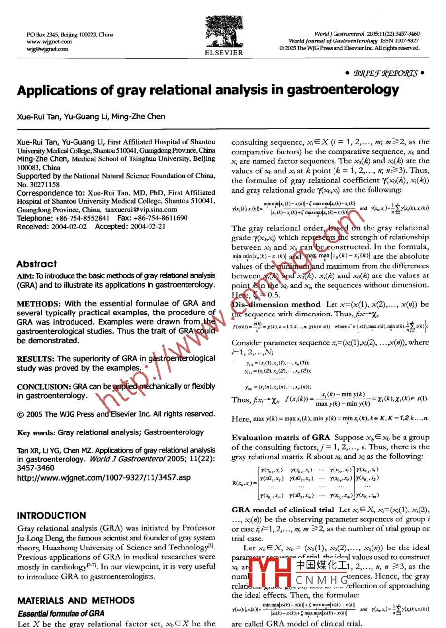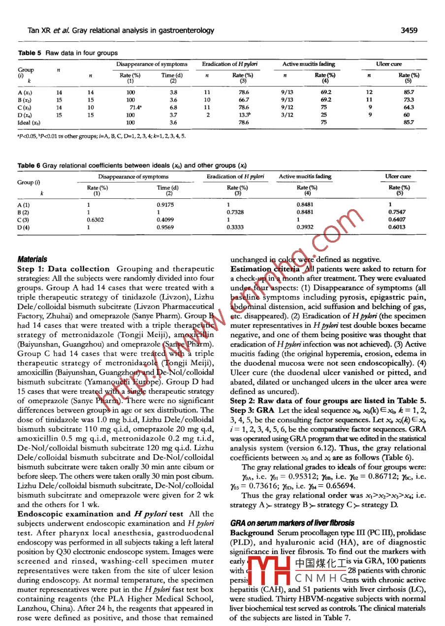 PO Box 2345, Beijing 00023, ChinaWorld JGastoenterol 205112):3457 3460www .wignet.comWorld Jourmal of Gastroenterology ISSN 1007-9327wjg@wignet.com◎2005 The WJG Press and Elsevier Inc. All rights reserved.ELSEVIER●BRIEF REPORIS●Applications of gray relational analysis in gastroenterologyXue-Rui Tan, Yu-Guang Li, Ming-Zhe ChenXue-Rui Tan, Yu-Guang Li, First Affiliated Hospital of Shantouconsulting sequence, x;∈X(i= 1,2..... m, m≥2, as theUniversity MedicalCollege, Shantou 510041,Guangdong Province, Chinacomparative factors) be the comparative sequence, x andMing-Zhe Chen, Medical School of Tsinghua University, Beijingx; are named factor sequences. The x0(問(wèn)) and x(k) are the100083, ChinaSupported by the National Natural Science Foundation of China,values of xo and xat k point(k= 1,2.... 街n≥3). Thus,the formulae of gray relational coefficient Y(xo(k), x:(k))No. 30271158Correspondence to: Xue Rui Tan, MD, PhD, First Affiliatedand gray relational grade Y(xo,x) are the following:Hospital of Shantou University Medical College, Shantou 510041,Guangdong Province, China. tanxuenui@ vip.sina.comF(k)-x(kN+ζ maxmat.()-x(Q)and x1-中_2.()Telephone: +86-754-8552841 Fax: +86-754-861 1690Received: 2004-02-02 Accepted: 2004-02-21The gray relational order, based on the gray relationalgrade Y(xo,x) which represents the strength of relationshipbetween x0 and x, can be constructed. In the formula,min min|xo(k)-x,(k) and max max |xo(k)-x;(k)| are the absoluteAbstractvalues of the minimum and maximum from the differencesAIM: To introduce the basic methods of gray relational analysisbetween x(l) and xo(). x(k) and x0() are the values at(GRA) and to ilustrate its applications in gastroenterology.point k in the x and x the sequences without dimension.Here,ζ = 0.5.METHODS: With the essential formulae of GRA andDis-dimension method Let x=(x(1), 2).... x() beseveral typically practical examples, the procedure ofthe sequence with dimension. Thus,fx- * x,GRA was introduced. Examples were drawn from thegastroenterological studies. Thus the trait of GRA couldbe demonstrated.Consider parameter sequence x=(x(1),x(2), ... wherei=1, 2...N;RESULTS: The superiority of GRA in gastroenterological=(x()(10..();. .study was proved by the examples.陽(yáng)=(+(2--.(2);CONCLUSION: GRA can be applied mechanically or fexiblyYn =(+)*.x..);.x(k)- min y(k)in gastroenterology.Thus,fx- *X, f(x,(k))=max y(k)- min y(k)= x(k).x,(k)∈s(1).⑥2005 The WJG Press and Elsevier Inc. All rights reserved.Here, max y(k)= max x(k), min y(k)= min x(k),k∈K,K = 12.k...Key words: Gray relational analysis; GastroenterologyEvaluation matrix of GRA Suppose xay∈xo be a groupTan XR, uYG, Chen MZ. Applications of gray relational analysisof the consulting factors,j= 1, 2... e. Thus, there is thein gastroenterology. World J Gastroenterol 2005; 11(22):gtay relational matrix R about向and x; as the following:3457-3460http://www.wjgnet.com/1007-9327/11/3457.aspR(x)=y(x0x) r(x021x2) .. y(x。,x2) r(,x)[rex,xm) r(x02.xm) .. Yax,.xm)}rqe,xm)GRA model of clinical trial Let x;∈X, x:=(x<(1), x:(2),,INTRODUCTIONx(1) be the observing parameter sequences of group iGray relational analysis (GRA) was initiated by Professoror case;i=1, 2.... m m≥2, as the number of trial group orJu-I ong Deng, the famous scientist and founder of gray systemtrial case.theory, Huazhong University of Science and Technology'".Let x∈X, xo= (x0(1), x>()... x(m)) be the idealPrevious applications of GRA in medical researches wereparamostly in cardiology2n. In our viewpoint, it is very usefulx0 ar中國(guó)煤化工1, 2...n. n≥3, as the .to introduce GRA to gastroenterologists.numlIYHCNMH(uences. Hence, the grayrclati: 2eflcction of approachingthe ideal effects. Then, the formulae:MATERIALS AND METHODSr(axk)x()-min minx()- x(kX+ζ max mlka(k)- x0(x)Essential formulae of GRALet X be the gray relational factor set, x∈X be theare called GRA model of clinical trial.3458ISSN 1007-9327CN 14-1219/ RWorld J GastroenterolJune 14, 2005 Volume 11 Number 22Table 1 Baseline values in four patients before treatmentAfyr)Course of jaundiceToughness degreeLiver below costalL iver belowSplenomegaly(mo) (x)of liver (x)arch (cm) (x)xiphoid (cm) (x)P (cm)(2)585.0304320270.7481Table 2 Hepatic functions in four patients before and after albendazole treatment(u BirtinOne muinute bingbinALPGU)GOTA/G&(L)No.(K)BeforeAfter89211.32.1176.628.430.045.5/37544.2/27.5602898.0558.0510.76.03041.0/56.045.1/33.9620923.4481.0280/54.048.0/36.02129129.2194630470.135.033.0/45.0 .45 0/227.0Examplesrx7,網(wǎng)) Yx8,x) Y(x9,x) Y(x10,x) YXx11,網(wǎng))GRA on small sample data backgtound The objectiveY(x0x) -0.83086 0.84450 0.68009 0.59362 0.68935 70.72768Y(x0,x2)| 0.65564 0.63919 0.58232 0.57313 0.56608 0.60327of this study was to evaluate the relationship between the20x3)| 0.82607 0.82195 0.68418 0.56399 0.75575 0.73039baseline condition of patients with alveococcosis and theR(0x= r(r0,x0)| 0.75198 0.78167 0.75162 0.49046 0.77538 0.71112therapeutic effects by using albendazole regularly. FourY(x0,x)| 0.66376 0.67106 0.64311 0.58631 0.52690|0.61823patients with complete data who were diagnosed clinicallyr(x0x6) L -0.65423 0.65564 0.62717 0.59336 0.76081 - 0.658240.73042 0.73567 0.66217 0.56681 0.67905and complicated by obstructive jaundice were entrolled inthis study. Albendazole was orally given twicc daily for overThe GRA results revealed in the gray relational factor1 year with a dosage of 20 mg/kg each day in all cases.set that the superior consulting factors were對(duì)and雞theBaseline values of the observation parameters are shownsuperior comparative factors were x1, x and X4.in Table 1. The effects of albendazole on hepatic functionsare shown in Table 2.Analysis Step 1: To calculate the improved ratio of hepaticGRA for four therapeutic strategies of duodenal ulcer relatedto Helicobacter pylorifunctions.The improved ratio was calculated by using theformula:|a-bBackgtound The purpose of this pro