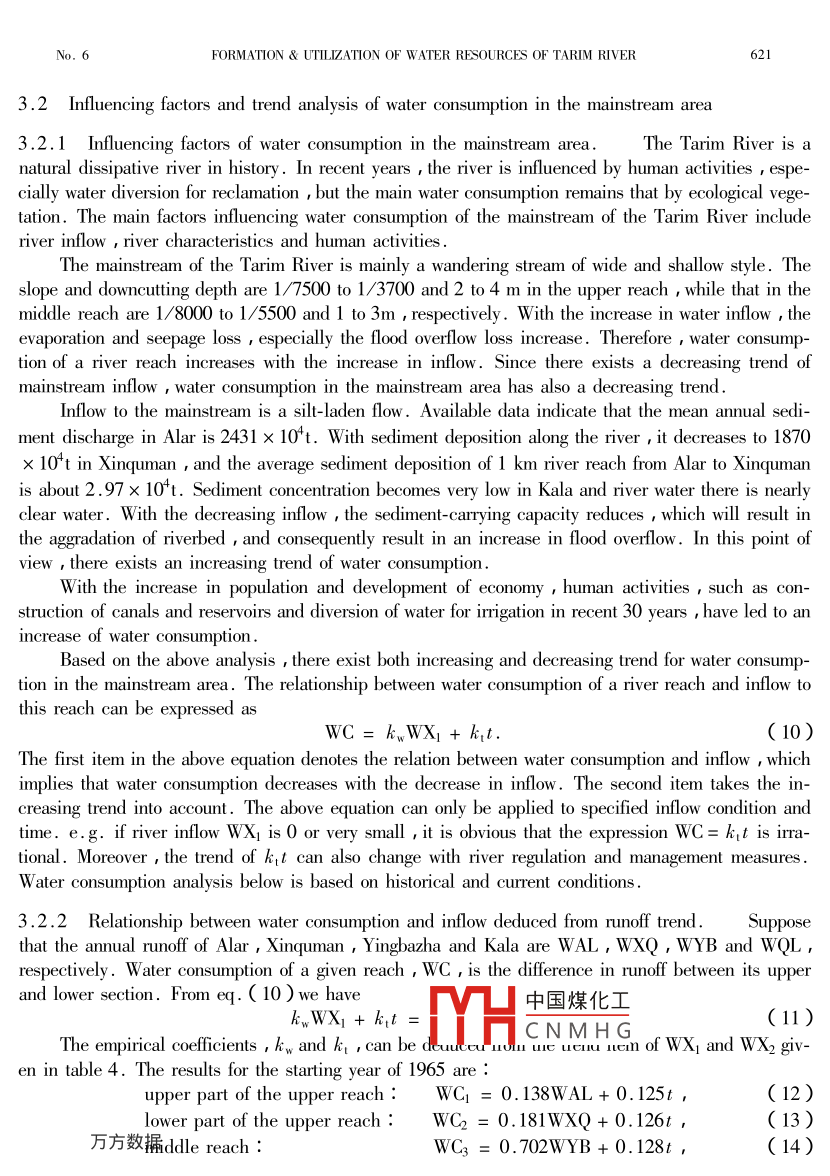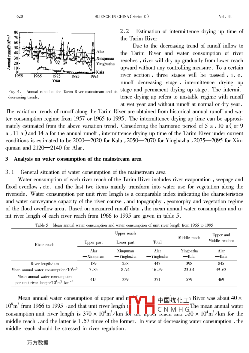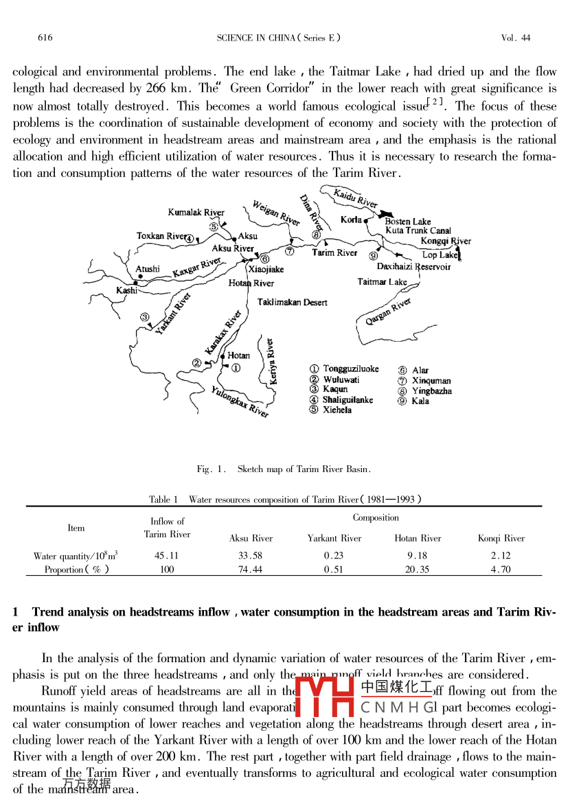 Val.44No.6SCIENCE IN CHINA( Series E)December 2001Formation and utilization of water resources of Tarim RiverLEI Zhidong(雷志棟) , ZHEN Baolong( 甄寶龍) ,SHANG Songhao(尚松浩y , YANG Shixiu( 楊詩秀) ,CONG Zhentao(叢振濤) ZHANG Fawang(張發(fā)旺) ,MAO Xiaohui(毛曉輝尸& ZHOU Haiying(周海鷹尸1. Department of Hydraulic Engineering , Tsinghua University , Beiing 100084 , China ;2. Tarim River Basin Administration , Korla 841000 , China ;Correspondence should be addressed to Lei Zhidong( email : leizhd@ mail. tsinghua. edu. cn ).Received July 3 ,2001AbstractThe Tarim River is a typical inland river in arid area without runoff yield of itself , and water re-sources are all supplied by its headstreams. The method of time series analysis is applied to annual runoffseries of three headstreams , namely the Aksu River , Yarkant River and Hotan River to analyze their dy-namic variations. A model is established to estimate water consumption in the headstream areas. Quantita-tive results indicate that both total annual runoff of headstreams and water consumption in the headstreamareas have an increasing trend. The dynamic trends of annual runoff of hydrologic stations along the main-stream of the Tarim River are also presented to estimate the intermittence drying-up time at each station.Water consumption model of the mainstream area is used to analyze the characteristics of water consump-tion in the upper and middle reaches. It is shown that water consumption in each river reach of the main-stream decreases with the decrement of inflow and increases with human activities .Keywords: Tarim River , formation of water resources , utilization of water resources , water consumption model ,time series analysis.The Tarim River Basin( fig. 1 ), located in Xinjiang Uygur Autonomous Region in NorthwestChina , is the largest inland river basin in China and a closed hydrologic region with inland water cir-culation and balance. The Tarim River runs through the Tarim Basin between the Tian Mountains andKunlun Mountains and surrounds the Taklimakan Desert from west to east. In history , the Tarim RiverBasin included 9 river systems flowing towards the Tarim Basin and the mainstream of the Tarim Riv-er ,covering an area of about 102x 10* km2 . The Tarim River usually refers to the mainstream fromXiaojiake to the Taitmar Lake with a length of 1321 km. It is a pure dissipative inland river withoutrunoff yield of itself ,and the water resources are all supplied by its headstreams. Nowadays ,onlythree headstreams , namely the Aksu River , Hotan中國煤化工r , supply water to themainstream. Since 1976 , water is transferred fromCNMHGwerreachoftheTarimRiver through the Kuta Trunk Canal . The composition ot water resources ot the Tarim River is given intable 1 .Irrational exploitation of water and land resources can lead to serious ecological and environmentalproblems、The reduction in water supply from headstreams and low-effciency exploitation of waterand landI 訊據(jù)in the upper and middle reaches of the Tarim River have also resulted in serious e-SCIENCE IN CHINA( Series E )Vol. 44cological and environmental problems. The end lake , the Taitmar Lake , had dried up and the flowlength had decreased by 266 km. The' Green Corridor" in the lower reach with great significance isnow almost totally destroyed. This becomes a world famous ecological issue21. The focus of theseproblems is the coordination of sustainable development of economy and society with the protection ofecology and environment in headstream areas and mainstream area , and the emphasis is the rationalallocation and high efficient utilization of water resources. Thus it is necessary to research the forma-tion and consumption patterns of the water resources of the Tarim River.Kumalak RiverKorlaBosten Lake⑤Kuta Trunk CanalToxkan Rive@rAksunKongqi RiverAksu River.Tarim RiverLop LakeAtushiXiaojiakeDaxihaizi ReservoirHotap RiverTaitmar LakeKashiTakimakan Desert3Casea+ Hotan①Tongguziluoke?Alar2 Wuluwati?Xinquman③Kaqun⑧Yingbazcha④Shaliguilanke面Kala⑤XiehelaFig.1. Sketch map of Tarim River Basin.Table 1 Water resources composition of Tarim River( 1981- -1993 )Inflow ofCompositionItemAksu RiverYarkant RiverHotan RiverKonqi RiverWater quantity 10'm'45.1133.58.0.239.182.12Proportion( % )10074.440.5120.354.70Trend analysis on headstreams inflow , water consumption in the headstream areas and Tarim Riv-er inflowIn the analysis of the formation and dynamic variation of water resources of the Tarim River , em-phasis is put on the three headstreams , and only the, main nunoff vield, branches are considered.Runoff yield areas of headstreams are all in the中國煤化工ff flowing out from themountains is mainly consumed through land evaporati:TYHC N M H Gl part becomes ecologi-cal water consumption of lower reaches and vegetation along the headstreams through desert area , in-cluding lower reach of the Yarkant River with a length of over 100 km and the lower reach of the HotanRiver with a length of over 200 km. The rest part , together with part field drainage , flows to the main-stream of the Tarim River , and eventually transforms to agricultural and ecological water consumptionof the mainer area .No.6FORMATION & UTILIZATION OF W ATER RESOURCES OF TARIM RIVER617Time series analysis method 341 is used to analyze the dynamic trend of headstream inflow. Dueto the impact of determinate and indeterminate factors of meteorology and human activities , the varia-tion of annual runoff is very complex. By applying the combined model of time series analysis , the an-nual runoff series { W, } are decomposed as follows :W,= N,+ P++ St+ ε,(1)where {Nt } and {P: } are determinate trend and periodic item , respectively , and {S, }and {e, } areindeterminate steady stochastic item and residual item , respectively. .In the analysis , Kendall order test is first used to test if there exists an obvious trend of the annu-al runoff series. If it exis