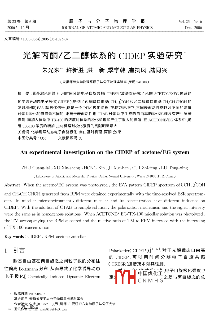 第23卷第6期原子與分子物理學(xué)報(bào)2006年12月JOURNAL OF ATOMIC AND MOLECULAR PHYSICSDeC.2006文章編號(hào):1000364200606-1025-04光解丙酮/乙二醇體系的 CIDEP實(shí)驗(yàn)研究朱光來(lái)”許新勝洪新季學(xué)韓崔執(zhí)鳳陸同興安徽師范大學(xué)物理系原子與分子物理實(shí)驗(yàn)室蕪湖241000摘要:紫外激光照射下用時(shí)間分辨電子自旋共振( TRESR)波譜儀研究了光解 ACETONE/EG體系的化學(xué)誘導(dǎo)動(dòng)態(tài)電子極做 CIDEP)得到了丙酮羰自由基CH3)COH和乙二醇羰自由基CH2 OH CHOH的發(fā)射/吸收E/A型極化信號(hào)這是一個(gè)RPM極化過(guò)程.在膠束環(huán)境中不同表面活性劑以及不同的濃度對(duì)體系極化的影響是不同的陽(yáng)離子表面活性劑CIAB對(duì)體系中生成的自由基的極化機(jī)理沒(méi)有產(chǎn)生顯著影響而加入體系中TX-100的濃度對(duì)體系的極化機(jī)理卻產(chǎn)生了很大的影響在 ACETONE/EG體系中隨著TX-100濃度的增加,TM機(jī)理對(duì)極化強(qiáng)度的貢獻(xiàn)明顯增大關(guān)鍵詞北化學(xué)誘導(dǎo)動(dòng)態(tài)電孑自旋極化自由基對(duì)機(jī)理丙酮膠束中圖分類號(hào):O56文獻(xiàn)標(biāo)識(shí)碼An experimental investigation on the Cidep of acetone/EG systemZHU Guang-lai, XU Xin-sheng, HONG Xin JI Xue-han CUI Zhi-feng, LU Tong-xingLaboratory of Atomic and Molecular Physics Anhui Normal University Wuhu 241000PR ChinaAbstract: When the acetone/EG system was photolyzed, the E/A pattern CIDEP spectrum of( CH3 )COHand CH,OH CHOH generated from RPM were obtained experimentally with the time-resolved ESR spectrometer. In micellar microenvironment, different micellar and its concentration have different influence onCIDEP. With the addition of Ctab to sample solution the polarization mechanism and the signal intensitywere the same as in homogenous solutions. When ACeToNE/ EG/TX-100 micellar solution was photolyzedthe tm accompanying the rPm appeared and the relative ratio of tm to RPM increased with the increasingof tx-100 concentrationKey words: CIDEP, RPM acetone micellar1引言Polarization( CIDEP)j-61對(duì)于光解瞬態(tài)自由基的 CIDEP,可以用時(shí)間分辨電子自旋共振瞬態(tài)自由基在兩自旋態(tài)之間粒子數(shù)的分布往( TRESR)波譜技術(shù)對(duì)其檢測(cè)往偏離 Boltzman分布從而導(dǎo)致了化學(xué)誘導(dǎo)動(dòng)態(tài)電子極化[ Chemically Induced Dynamic Electron定YH中國(guó)煤化了電子自旋極化強(qiáng)度P之差與兩自旋態(tài)的總CNMHG收稿日期20050803基金項(xiàng)目安徽省原子與分子物理重點(diǎn)學(xué)科基金作者簡(jiǎn)1972-)男講師主要研究方向?yàn)樵优c分子光譜通訊作者ai8818@163.com1026原子與分子物理學(xué)報(bào)第23卷布居數(shù)的比115 mjP(NB-Na)實(shí)驗(yàn)中輸入到樣品諧振腔的微波功率≤」mW約為4mW.在記錄 CIDEP的磁場(chǎng)譜時(shí)Box-式中N和N分別為上、下 Zeeman能級(jí)上的粒子ar平均器取樣門的門寬一般取為0.3~0.4ps根數(shù).P為正時(shí) CIDEP譜為吸收譜,P為負(fù)時(shí),據(jù)所需測(cè)量時(shí)刻的要求 Boxcar的取樣門相對(duì)于激CIDEP譜為發(fā)射譜光激發(fā)時(shí)刻的延時(shí)在0.4~2s范圍內(nèi)變化對(duì)激光光解丙酮自由基的研究文獻(xiàn)主要報(bào)道實(shí)驗(yàn)中所用的丙酮、乙二醇試劑均為分析純了丙酮/醇類體系,特別是丙酮/異丙醇體系的所用表面活性劑為xTAB(+六烷基三甲基溴化究證實(shí)了在丙酮/異丙醇體系中產(chǎn)生的極化信號(hào)醚onX100(7X100,辛基苯基聚氧乙烯CIDEP研究791-13 Seigo yamauchi12等人研銨),T以S-T。態(tài)混合的RPM機(jī)理為主但在適當(dāng)?shù)臐舛群蜏囟认掳殡S有一定比例的TM機(jī)理的貢3實(shí)驗(yàn)結(jié)果與討論獻(xiàn). Keisuke tominaga研究小組7詳細(xì)研究了丙酮羰自由基CH3COH的極化信號(hào)與溫度的關(guān)系.3.1 ACETONE/EG體系他們研究從室溫到-90℃范圍內(nèi),S-TM總是純乙二醇或丙酮經(jīng)激光照射沒(méi)有ESR共振占主導(dǎo)地位但是在-45℃以下,TM和S-T信號(hào)產(chǎn)生.丙酮/乙二醇溶液經(jīng)激光照射,在285M對(duì)整體譜圖貢獻(xiàn)比例相對(duì)增加mm激光激發(fā)1.0s延時(shí)下的 CIDEP信號(hào)如圖1我們的工作以乙二醇為溶劑還以12丙二所示與文獻(xiàn)712等對(duì)照,可以看到譜圖中除了醇為溶劑進(jìn)行了研究將另文報(bào)道)分別得到了丙丙酮羰自由基(CH3)COH的信號(hào)外,在酮羰自由基(CH3)(OH和乙二醇羰自由基(CH3)(OH的兩個(gè)最強(qiáng)峰之間還有四條弱峰如CH2 OH CHOH的以RPM機(jī)理為主的極化信號(hào)圖1中興所示)根據(jù)它們的位置可知道他們應(yīng)該通過(guò)波譜模擬,確定了各峰線的歸屬.還實(shí)驗(yàn)硏究屬于乙二醇羰自由基 CH,OH CHOH; CH,OH CH了幾種膠束微環(huán)境對(duì) ACETONE/EG體系的OH的位于最外側(cè)的兩條峰分別與CH3)COH的CIDEP譜的影響M=±1的兩峰重合.由于掃場(chǎng)范圍的限制,丙酮羰自由基CH3COH位于兩側(cè)的M=±3的兩條2實(shí)驗(yàn)超精細(xì)弱峰沒(méi)有記錄下來(lái)如圖1a)廝所示.另外整個(gè)譜圖呈現(xiàn)E/A極化模式,可見(jiàn)光解ACE實(shí)驗(yàn)中所用的 TR-ESR波譜儀是本研究小組ONE/EG體系是RPM極化過(guò)程自行研制的其詳細(xì)情況在文獻(xiàn)10]已作報(bào)道這里作簡(jiǎn)單介紹如下:微波源采用K-129反射速調(diào)管微波頻率約為9400MHLz微波系統(tǒng)采用平(a)衡反射橋式電路和零差拍平衡混頻方式無(wú)