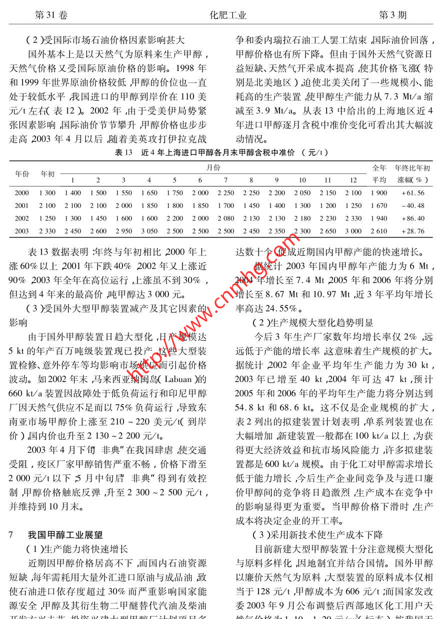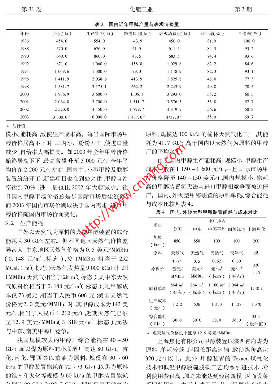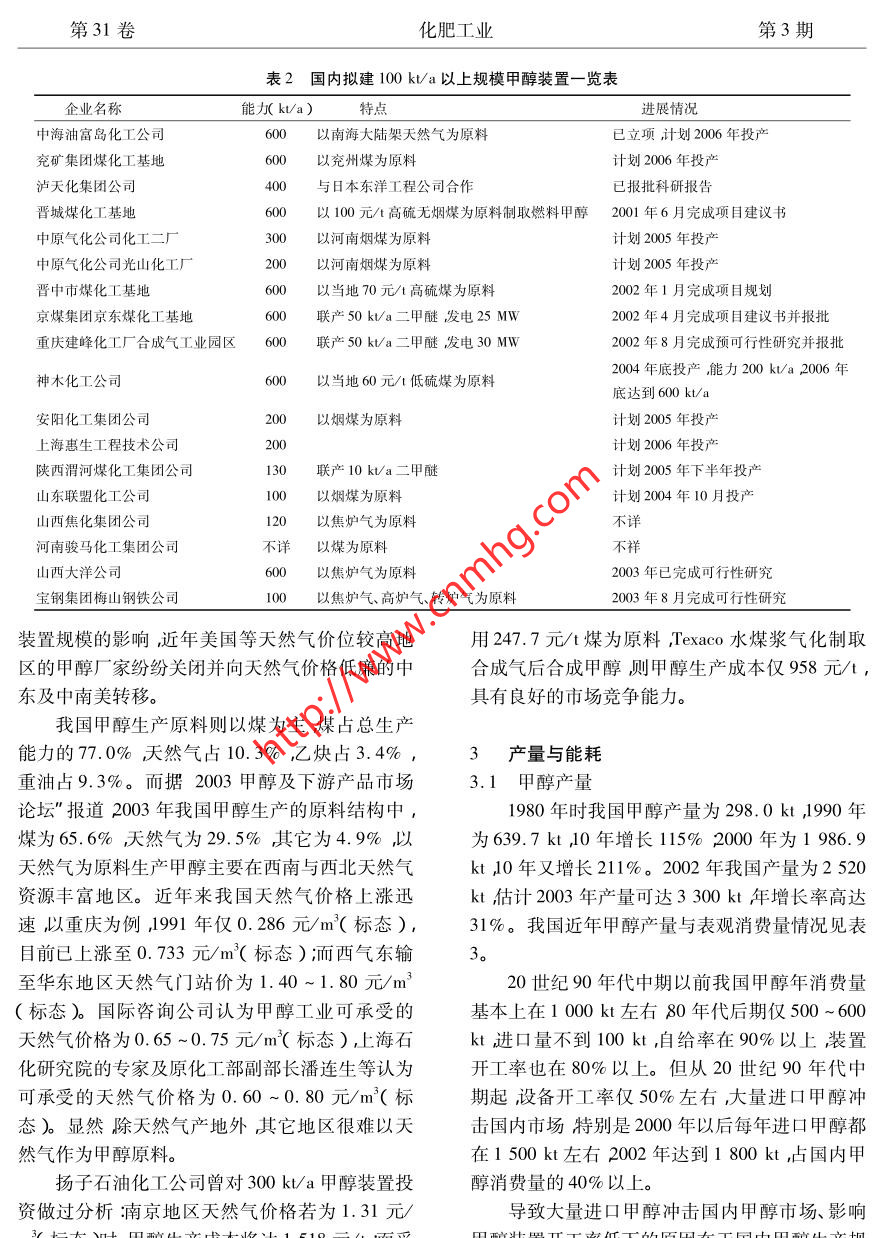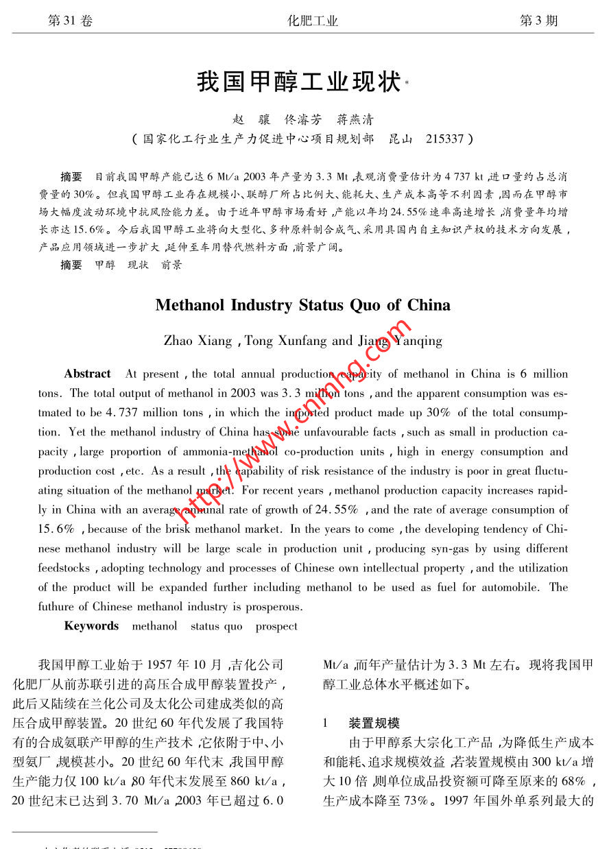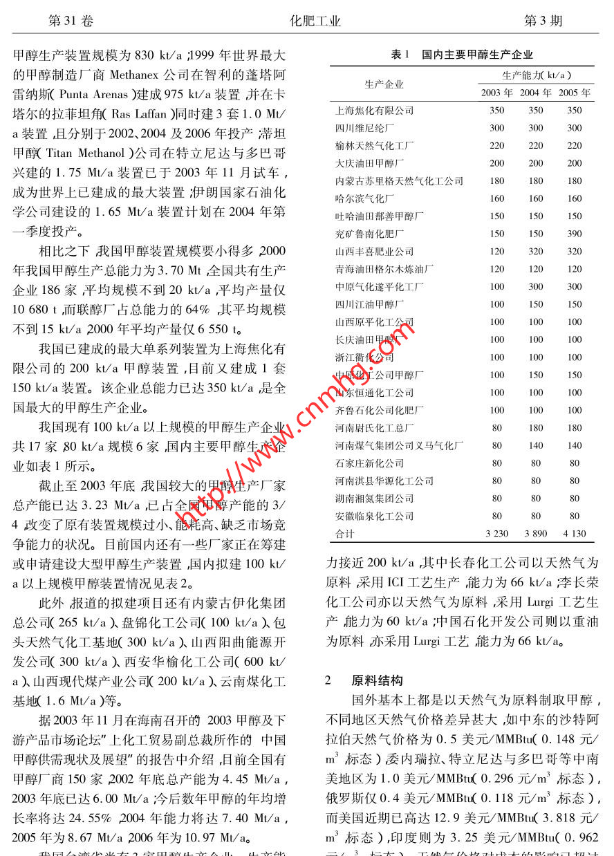 第31卷化肥工業(yè)第3期我國甲醇工業(yè)現(xiàn)狀.趙驤佟溶芳蔣燕清(國家化工行業(yè)生產(chǎn)力促進中心項目規(guī)劃部 昆山215337 )摘要目前我國甲醇產(chǎn)能已達6 Mt/a 2003年產(chǎn)量為3.3 Mt表觀消費量估計為4737 kt進口量約占總消費量的30%。但我國甲醇工業(yè)存在規(guī)模小、聯(lián)醇廠所占比例大、能耗大、生產(chǎn)成本高等不利因素,因而在甲醇市場大幅度波動環(huán)境中抗風(fēng)險能力差。由于近年甲醇市場看好,產(chǎn)能以年均24. 55%速率高速增長消費量年均增長亦達15.6%。今后我國甲醇工業(yè)將向大型化、多種原料制合成氣、采用具國內(nèi)自主知識產(chǎn)權(quán)的技術(shù)方向發(fā)展,產(chǎn)品應(yīng)用領(lǐng)域進一步擴大延伸至車用替代燃料方面前景廣闊。.摘要甲醇現(xiàn)狀前景M ethanol Industry Status Quo of ChinaZhao Xiang , Tong Xunfang and Jiang YanqingAbstract At present , the total annual production capacity of methanol in China is 6 milliontons. The total output of methanol in 2003 was 3.3 million tons ,and the apparent consumption was es-tmated to be 4.737 million tons , in which the imported product made up 30% of the total consump-tion. Yet the methanol industry of China has some unfavourable facts , such as small in production ca-pacity,large proportion of ammonia-methanol co-production units , high in energy consumption andproduction cost ,etc. As a result , the capability of risk resistance of the industry is poor in great fluctu-ating situation of the methanol market. For recent years , methanol production capacity increases rapid-ly in China with an average annunal rate of growth of 24. 55% , and the rate of average consumption of15.6% , because of the brisk methanol market. In the years to come , the developing tendency of Chi-nese methanol industry will be large scale in production unit , producing syn-gas by using differentfeedstocks , adopting technology and processes of Chinese own intellectual property , and the utilizationof the product will be expanded further including methanol to be used as fuel for automobile. Thefuthure of Chinese methanol industry is prosperous.Keywords methanol status quoprospect我國甲醇工業(yè)始于1957年10月,吉化公司Mt/a而年產(chǎn)量估計為3.3 Mt左右?,F(xiàn)將我國甲化肥廠從前蘇聯(lián)引進的高壓合成甲醇裝置投產(chǎn),醇工業(yè)總體水平概述如下。此后又陸續(xù)在蘭化公司及太化公司建成類似的高壓合成甲醇裝置。20 世紀60年代發(fā)展了我國特裝置規(guī)模有的合成氨聯(lián)產(chǎn)甲醇的生產(chǎn)技術(shù)它依附于中、小由于甲醇系大宗化工產(chǎn)品為降低生產(chǎn)成本型氨廠規(guī)模甚小。20世紀60年代末我國甲醇和能耗、追求規(guī)模效益若裝置規(guī)模由300 kt/a增生產(chǎn)能力僅100 kt/a 80年代末發(fā)展至860 kt/a ,大10倍則單位成品投資額可降至原來的68%,20世紀末已達到3.70 Mt/a 2003年已超過6.0生產(chǎn)成本降至73%。1997年國外單系列最大的本文作者的聯(lián)系電話0512 -577986306第31卷化肥工業(yè)第3期甲醇生產(chǎn)裝置規(guī)模為830kt/a;1999年世界最大表1國內(nèi)主要 甲醇生產(chǎn)企業(yè)的甲醇制造廠商Methanex公司在智利的蓬塔阿生產(chǎn)能水kt/a)生產(chǎn)企業(yè)雷納斯( Punta Arenas )建成975 kt/a裝置并在卡2003年2004 年2005 年塔爾的拉菲坦角( Ras Laffan )同時建3套1.0 Mt/上海焦化有限公司350四川維尼綸廠300a裝置且分別于2002、2004及2006年投產(chǎn)蒂坦甲醇Titan Methanol )公司在特立尼達與多巴哥榆林天然氣化工廠220大慶油田甲醇廠200興建的1.75 Mt/a裝置已于2003年11月試車,內(nèi)蒙古蘇里格天然氣化工公司180成為世界上已建成的最大裝置;伊朗國家石油化哈爾濱氣化廠160學(xué)公司建設(shè)的1.65 Mt/a 裝置計劃在2004年第吐哈油田鄯善甲醇廠15150一季度投產(chǎn)。兗礦魯南化肥廠390相比之下我國甲醇裝置規(guī)模要小得多2000山西豐喜肥業(yè)公司120320年我國甲醇生產(chǎn)總能力為3.70 Mt全國共有生產(chǎn)青海油田格爾木煉油廠企業(yè)186家平均規(guī)模不到20kt/a平均產(chǎn)量僅中原氣化遂平化工廠1010 680 t ,而聯(lián)醇廠占總能力的64%其平均規(guī)模四川江油甲醇廠山西原平化工公司100不到15 kt/a 2000年平均產(chǎn)量僅6550 t。長慶油田甲醇-我國已建成的最大單系列裝置為上海焦化有浙江衢化公司限公司的200 kt/a 甲醇裝置,目前又建成1套中原化工公司甲醇廠150 kt/a裝置。該企業(yè)總能力已達350 kt/a是全山東恒通化工公司國最大的甲醇生產(chǎn)企業(yè)。齊魯石化公司化肥廠我國現(xiàn)有100 kt/a以上規(guī)模的甲醇生產(chǎn)企業(yè)河南尉氏化工總廠8共17家80 kt/a規(guī)模6家國內(nèi)主要甲醇生產(chǎn)企河南煤氣集團公司義馬氣化廠8(14140業(yè)如表1所示。石家莊新化公司80截止至2003年底我國較大的甲醇生產(chǎn)廠家河南淇縣華源化工公司總產(chǎn)能已達3.23 Ml/a,已占全國甲醇產(chǎn)能的3/湖南湘氮集團公司4改變了原有裝置規(guī)模過小、能耗高、缺乏市場競安微臨泉化工公司合計323038904130爭能力的狀況。目前國內(nèi)還有一-些廠家正在籌建或申請建設(shè)大型甲醇生產(chǎn)裝置國內(nèi)擬建100 kV力接近200 kt/a其中長春化工公司以天然氣為a以上規(guī)模甲醇裝置情況見表2。原料采用ICI工藝生產(chǎn)能力為66kt/a李長榮此外報道的擬建項目還有內(nèi)蒙古伊化集團化工公司亦以天然氣為原料,采用Lurgi 工藝生總公司( 265 kt/a)