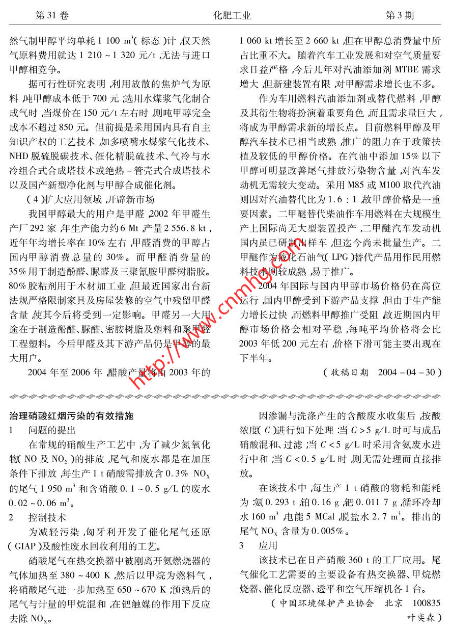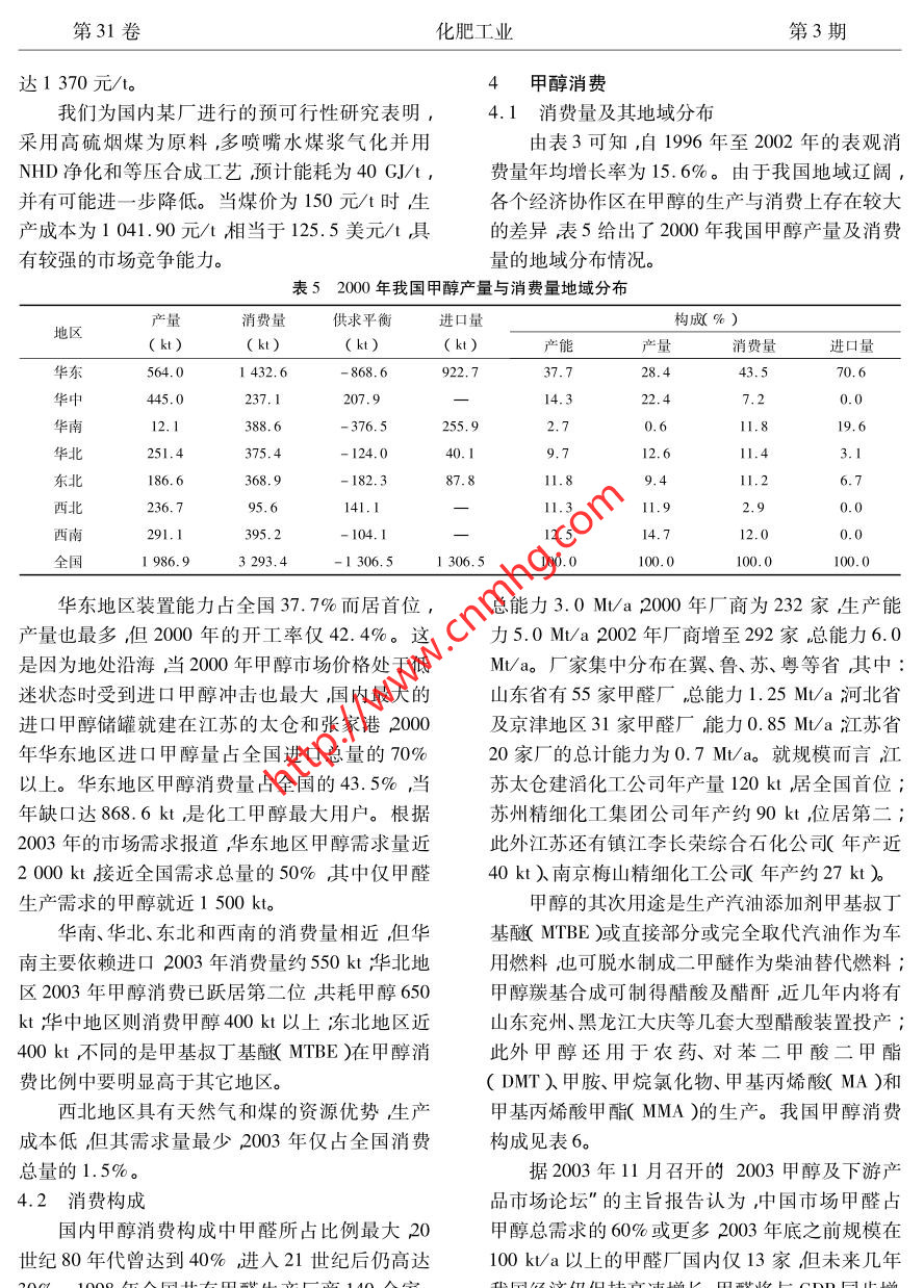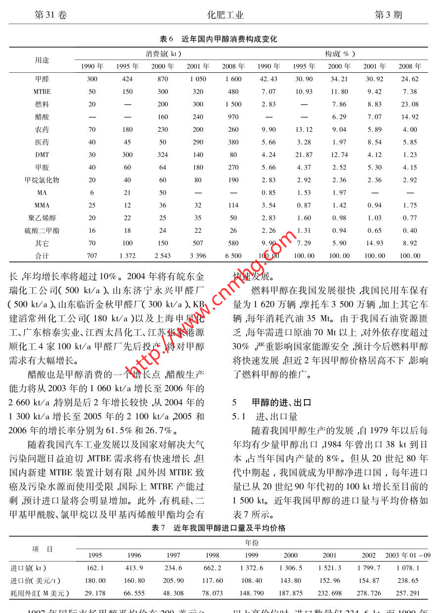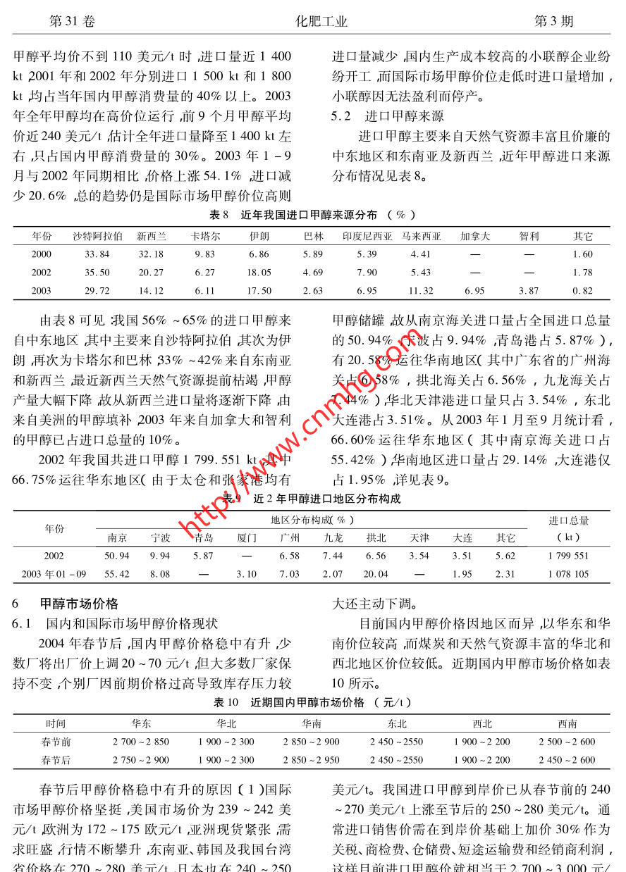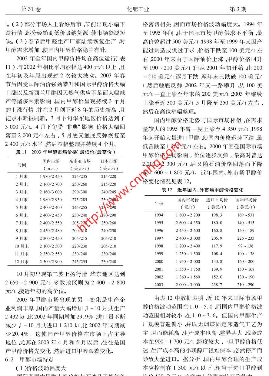 第31卷化肥工業(yè)第3期我國甲醇工業(yè)現(xiàn)狀.趙驤佟溶芳蔣燕清(國家化工行業(yè)生產(chǎn)力促進中心項目規(guī)劃部 昆山215337 )摘要目前我國甲醇產(chǎn)能已達6 Mt/a 2003年產(chǎn)量為3.3 Mt表觀消費量估計為4737 kt進口量約占總消費量的30%。但我國甲醇工業(yè)存在規(guī)模小、聯(lián)醇廠所占比例大、能耗大、生產(chǎn)成本高等不利因素,因而在甲醇市場大幅度波動環(huán)境中抗風(fēng)險能力差。由于近年甲醇市場看好,產(chǎn)能以年均24. 55%速率高速增長消費量年均增長亦達15.6%。今后我國甲醇工業(yè)將向大型化、多種原料制合成氣、采用具國內(nèi)自主知識產(chǎn)權(quán)的技術(shù)方向發(fā)展,產(chǎn)品應(yīng)用領(lǐng)域進一步擴大延伸至車用替代燃料方面前景廣闊。.摘要甲醇現(xiàn)狀前景M ethanol Industry Status Quo of ChinaZhao Xiang , Tong Xunfang and Jiang YanqingAbstract At present , the total annual production capacity of methanol in China is 6 milliontons. The total output of methanol in 2003 was 3.3 million tons ,and the apparent consumption was es-tmated to be 4.737 million tons , in which the imported product made up 30% of the total consump-tion. Yet the methanol industry of China has some unfavourable facts , such as small in production ca-pacity,large proportion of ammonia-methanol co-production units , high in energy consumption andproduction cost ,etc. As a result , the capability of risk resistance of the industry is poor in great fluctu-ating situation of the methanol market. For recent years , methanol production capacity increases rapid-ly in China with an average annunal rate of growth of 24. 55% , and the rate of average consumption of15.6% , because of the brisk methanol market. In the years to come , the developing tendency of Chi-nese methanol industry will be large scale in production unit , producing syn-gas by using differentfeedstocks , adopting technology and processes of Chinese own intellectual property , and the utilizationof the product will be expanded further including methanol to be used as fuel for automobile. Thefuthure of Chinese methanol industry is prosperous.Keywords methanol status quoprospect我國甲醇工業(yè)始于1957年10月,吉化公司Mt/a而年產(chǎn)量估計為3.3 Mt左右?,F(xiàn)將我國甲化肥廠從前蘇聯(lián)引進的高壓合成甲醇裝置投產(chǎn),醇工業(yè)總體水平概述如下。此后又陸續(xù)在蘭化公司及太化公司建成類似的高壓合成甲醇裝置。20 世紀60年代發(fā)展了我國特裝置規(guī)模有的合成氨聯(lián)產(chǎn)甲醇的生產(chǎn)技術(shù)它依附于中、小由于甲醇系大宗化工產(chǎn)品為降低生產(chǎn)成本型氨廠規(guī)模甚小。20世紀60年代末我國甲醇和能耗、追求規(guī)模效益若裝置規(guī)模由300 kt/a增生產(chǎn)能力僅100 kt/a 80年代末發(fā)展至860 kt/a ,大10倍則單位成品投資額可降至原來的68%,20世紀末已達到3.70 Mt/a 2003年已超過6.0生產(chǎn)成本降至73%。1997年國外單系列最大的本文作者的聯(lián)系電話0512 -577986306第31卷化肥工業(yè)第3期甲醇生產(chǎn)裝置規(guī)模為830kt/a;1999年世界最大表1國內(nèi)主要 甲醇生產(chǎn)企業(yè)的甲醇制造廠商Methanex公司在智利的蓬塔阿生產(chǎn)能水kt/a)生產(chǎn)企業(yè)雷納斯( Punta Arenas )建成975 kt/a裝置并在卡2003年2004 年2005 年塔爾的拉菲坦角( Ras Laffan )同時建3套1.0 Mt/上海焦化有限公司350四川維尼綸廠300a裝置且分別于2002、2004及2006年投產(chǎn)蒂坦甲醇Titan Methanol )公司在特立尼達與多巴哥榆林天然氣化工廠220大慶油田甲醇廠200興建的1.75 Mt/a裝置已于2003年11月試車,內(nèi)蒙古蘇里格天然氣化工公司180成為世界上已建成的最大裝置;伊朗國家石油化哈爾濱氣化廠160學(xué)公司建設(shè)的1.65 Mt/a 裝置計劃在2004年第吐哈油田鄯善甲醇廠15150一季度投產(chǎn)。兗礦魯南化肥廠390相比之下我國甲醇裝置規(guī)模要小得多2000山西豐喜肥業(yè)公司120320年我國甲醇生產(chǎn)總能力為3.70 Mt全國共有生產(chǎn)青海油田格爾木煉油廠企業(yè)186家平均規(guī)模不到20kt/a平均產(chǎn)量僅中原氣化遂平化工廠1010 680 t ,而聯(lián)醇廠占總能力的64%其平均規(guī)模四川江油甲醇廠山西原平化工公司100不到15 kt/a 2000年平均產(chǎn)量僅6550 t。長慶油田甲醇-我國已建成的最大單系列裝置為上海焦化有浙江衢化公司限公司的200 kt/a 甲醇裝置,目前又建成1套中原化工公司甲醇廠150 kt/a裝置。該企業(yè)總能力已達350 kt/a是全山東恒通化工公司國最大的甲醇生產(chǎn)企業(yè)。齊魯石化公司化肥廠我國現(xiàn)有100 kt/a以上規(guī)模的甲醇生產(chǎn)企業(yè)河南尉氏化工總廠8共17家80 kt/a規(guī)模6家國內(nèi)主要甲醇生產(chǎn)企河南煤氣集團公司義馬氣化廠8(14140業(yè)如表1所示。石家莊新化公司80截止至2003年底我國較大的甲醇生產(chǎn)廠家河南淇縣華源化工公司總產(chǎn)能已達3.23 Ml/a,已占全國甲醇產(chǎn)能的3/湖南湘氮集團公司4改變了原有裝置規(guī)模過小、能耗高、缺乏市場競安微臨泉化工公司合計323038904130爭能力的狀況。目前國內(nèi)還有一-些廠家正在籌建或申請建設(shè)大型甲醇生產(chǎn)裝置國內(nèi)擬建100 kV力接近200 kt/a其中長春化工公司以天然氣為a以上規(guī)模甲醇裝置情況見表2。原料采用ICI工藝生產(chǎn)能力為66kt/a李長榮此外報道的擬建項目還有內(nèi)蒙古伊化集團化工公司亦以天然氣為原料,采用Lurgi 工藝生總公司( 265 kt/a)