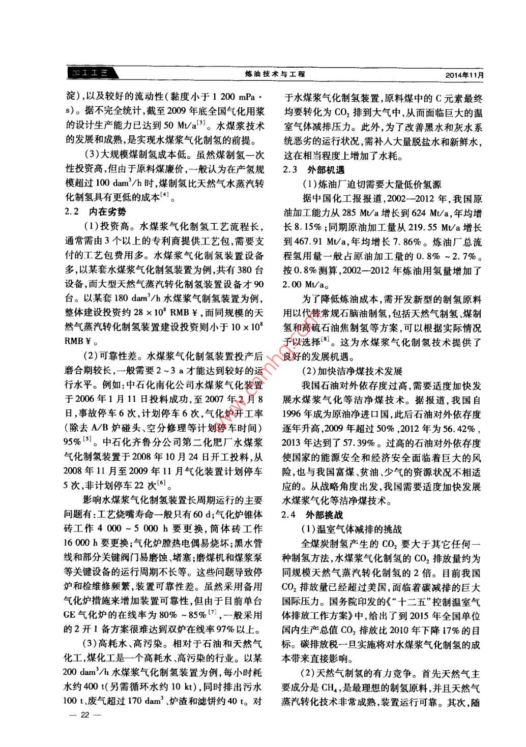 2014年第44卷第11期煉油技術(shù)與工程 PETROLEUM REFINERY ENGINEERING水煤漿氣化制氫技術(shù)的SWOT分析及建議閆志者(中科(廣東)煉化有限公司,廣東省湛江市524022)摘要:為了滿足煉油企業(yè)日益增長的氫氣需要,近年來國內(nèi)有些煉油企業(yè)正在建設(shè)或規(guī)劃建設(shè)煤制氫裝置,般采用水煤漿氣化制氫技術(shù)。使用態(tài)勢分析法(SWOT)簡要分析了水煤漿氣化制氫技術(shù)的優(yōu)勢、劣勢、機會和威脅。分析認(rèn)為,水煤漿氣化制氫的優(yōu)勢在于所用原料廉價易得,劣勢主要為投資高、污染高、可靠性差。煉油企業(yè)迫切需要大量低成本氫氣,同時國家也存在發(fā)展水煤漿氣化等潔凈煤技術(shù)的動力,這是水煤漿氣化制氫技術(shù)發(fā)展的外部機遇,但水煤漿氣化制氫技術(shù)也面臨著溫室氣體減排以及天然氣制氫競爭的挑戰(zhàn)。建議通過規(guī)劃建設(shè)區(qū)域性氫氣管網(wǎng)以及優(yōu)化水煤漿氣化制氫技術(shù)工藝等方式揚長避短更好地發(fā)展和利用水煤漿氣化制氫技術(shù)關(guān)鍵詞:水煤漿煤制氫天然氣制氫SWOT分析法1水煤漿氣化制氫介紹少氣的國家,已探明的能源剩余可采量中煤炭的煤氣化技術(shù)種類較多,可分為水煤漿氣化、粉剩余可采量為1145.0億噸,儲采比為92a,遠高煤氣化、碎煤移動床氣化和流化床氣化等不同類于石油和天然氣2。豐富的煤炭資源為煤制氫型。其中,水煤漿氣化技術(shù)是煉油廠煤制氫項目提供了相對充足的原料。較為適合的技術(shù)。21世紀(jì)后,金陵石化、齊魯空氣二化、茂名石化、九江石化等煉化企業(yè)選擇了水煤漿氣化制氫技術(shù)。空氣制氧最具代表性的水煤漿氣化技術(shù)有美國CE水原媒-媒制-{氣化洗湍二水處妒娃絀殫場煤漿加壓氣化技術(shù)、道化學(xué)公司開發(fā)的兩段式水煤漿氣化技術(shù),以及中國自主研發(fā)的多噴嘴水煤耐硫交換漿氣化技術(shù)等。其中GE水煤漿氣化技術(shù)由山東兩制冷上低溫甲亡古克療斯硫磺回收魯南化肥廠于1984年首先引進,至今在國內(nèi)已有20多年的工業(yè)應(yīng)用,其在設(shè)計、建設(shè)和運行方面甲烷化都積累了大量經(jīng)驗。圖1為水煤漿氣化制氫的典型流程。由圖1可知,水煤漿氣化制氫裝置可分為兩部分,黃色部圖1典型煤制氫流程分為水煤漿氣化系統(tǒng),綠色部分為合成氣凈化系Fig. I Typical process of coal to hydroger統(tǒng)。此外為配套煤制氫,還需要建設(shè)大型空分、硫(2)水煤漿技術(shù)的成熟。水煤漿是20世紀(jì)磺回收和污水處理等裝置70年代世界石油危機后發(fā)展起來的,它通過把固體煤變成流態(tài)的混合物(煤、水和添加劑),從而使之具有了類似重油的某些特點,如較好的流動2水煤漿氣化制氫技術(shù)SWOT分析性和穩(wěn)定性,便于加壓泵送霧化和燃燒。對于氣swoT分析是將研究對象的競爭優(yōu)勢化用水煤漿而言,一般要求具有較高的濃度( strengths)、劣勢( weaknesses))、機會( opportunI-(58%-65%)、較好的穩(wěn)定性(煤漿不易分層沉ties)、威脅( threats)進行系統(tǒng)分析。收稿日期:2014-09-19;修改稿收到日期:2014-10-15。2.1內(nèi)在優(yōu)勢作者簡介:國志者,高級工程師,制氫裝置負(fù)責(zé)人。聯(lián)系電(1)制氫原料廉價易得。我國是富煤、貧油、i:0759-2877137,E-mail:yanzzzklh@sinopec.com.煉油技術(shù)與工程2014年11月淀),以及較好的流動性(黏度小于1200mPa·于水煤漿氣化制氫裝置原料煤中的C元素最終s)。據(jù)不完全統(tǒng)計,截至2009年底全國氣化用漿均要轉(zhuǎn)化為CO2排到大氣中,從而面臨巨大的溫的設(shè)計生產(chǎn)能力已達到50M/a3。水煤漿技術(shù)室氣體減排壓力。此外,為了改善黑水和灰水系的發(fā)展和成熟,是實現(xiàn)水煤漿氣化制氫的前提。統(tǒng)惡劣的運行狀況,需補入大量脫鹽水和新鮮水(3)大規(guī)模煤制氫成本低。雖然煤制氫一次這在相當(dāng)程度上增加了水耗。性投資高,但由于原料煤廉價,一般認(rèn)為在產(chǎn)氫規(guī)23外部機遇模超過100dm3/h時,煤制氫比天然氣水蒸汽轉(zhuǎn)(1)煉油廠迫切需要大量低價氫源化制氫具有更低的成本4。據(jù)中國化工報報道,2002-2012年,我國原2.2內(nèi)在劣勢油加工能力從285M/a增長到624Mt/a,年均增(1)投資高。水煤漿氣化制氫工藝流程長,長8.15%;同期原油加工量從219.55MUa增長通常需由3個以上的專利商提供工藝包需要支到467.91Ma,年均增長7.86%。煉油廠總流付的工藝包費用多。水煤漿氣化制氫裝置設(shè)備程氫用量一般占原油加工量的08%~2.7%。多,以某套水煤漿氣化制氫裝置為例,共有380臺按0.8%測算,2002-2012年煉油用氫量增加了設(shè)備,而大型天然氣蒸汽轉(zhuǎn)化制氫裝置設(shè)備才902.00Mva臺。以某套180dam3/h水煤漿氣制氫裝置為例,為了降低煉油成本,需開發(fā)新型的制氫原料整體建設(shè)投資約28×10RMB¥,而同規(guī)模的天用以代替常規(guī)石腦油制氫,包括天然氣制氫煤制然氣蒸汽轉(zhuǎn)化制氫裝置建設(shè)投資則小于10×10°氫和高硫石油焦制氫等方案可以根據(jù)實際情況RMB¥予以選擇。。這為水煤漿氣化制氫技術(shù)提供了(2)可靠性差。水煤漿氣化制氫裝置投產(chǎn)后良好的發(fā)展機遇磨合期較長,一般需要2-3a才能達到較好的運(2)加快潔凈煤技術(shù)發(fā)展行水平。例如:中石化南化公司水煤漿氣化裝置我國石油對外依存度