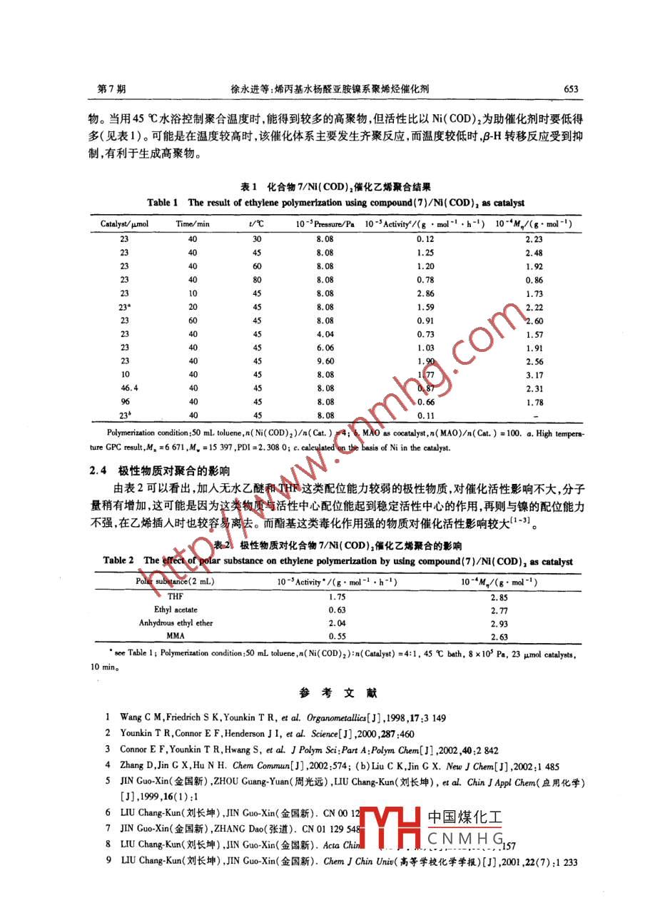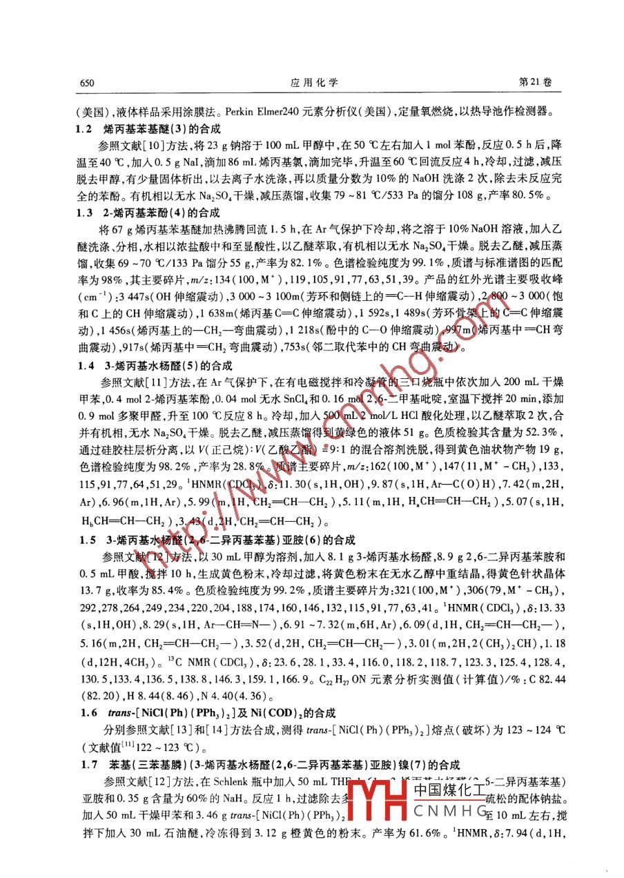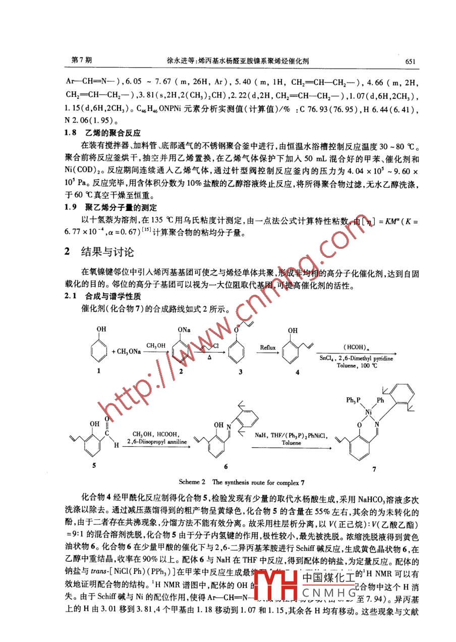 第21卷第7期應(yīng)用化學(xué)Vol 21 No. 72004年7月CHINESE JOURNAL OF APPLIED CHEMISTRYJuly 2004研究論文烯丙基水楊醛亞胺鎳系聚烯烴催化劑徐永進(jìn)孫俊全單玉華林峰王臨才(浙江大學(xué)聯(lián)合化學(xué)反應(yīng)工程研究所杭州310027)摘要合成了烯丙基水楊醛亞胺配體(6),并與man-[NC(Ph)(PPh)2]反應(yīng)合成了配合物(7)([O-(3All)cH2 ortho C(H)=N2,6-CH1/(iPr)2]N(PhP)(Ph),用質(zhì)譜,HNMR、"CNMR、IR和元素分析對(duì)配體及配合物進(jìn)行了表征。在環(huán)辛二烯鎳(Ni(COD)2)作助催化劑下能有效地催化乙烯聚合。在8.08×103Pa的壓力下,其最高活性可達(dá)286×10°3g/(mol·h)(以催化劑中的N為基礎(chǔ)計(jì)算),所得聚乙烯粘均分子量在0.86×104-3.17×10之間。并考察了THF、乙酸乙酯、MMA、乙醚對(duì)催化劑的聚合性能的影關(guān)鍵詞后過(guò)渡金屬烯烴聚合催化劑水楊醛亞胺烯丙基取代配合物中圖分類(lèi)號(hào):0643.3;TQ21文獻(xiàn)標(biāo)識(shí)碼:A文章編號(hào):1000518(2004)07064906后過(guò)渡金屬烯烴聚合催化劑與前過(guò)渡金屬催化劑相比,易于制備,對(duì)極性物質(zhì)的容忍性好,有望催化烯烴與極性單體的共聚等。1998年,Wang等報(bào)道了水楊醛亞胺鎳配合物為電中性絡(luò)合物,可催化乙烯聚合在無(wú)助催化劑存在下亦可高效地催化乙烯聚合得到支化聚乙烯,還能催化乙烯與含羥基和酯基的降冰片烯共聚,顯示出對(duì)極性雜原子有極好的容忍性。工業(yè)氣相聚合采用流化床技術(shù),通常要求催化劑固載化。金國(guó)新等“將烯丙基引入茂金屬、Brookhart類(lèi)型催化劑和Cnb類(lèi)型催化劑,并將之Ph P與苯乙烯共聚,實(shí)現(xiàn)其高分子化。本文通過(guò)在水楊醛亞胺鎳配合物中引入不飽和基團(tuán)探索其特有的催化性能,也便于進(jìn)一步研究催化劑的高分子化。為此合成了一種含烯丙基的Cnbs型催化劑(式1),由于其空間位阻不夠大,與中性N配位的Ph3P不能自動(dòng)分去故以環(huán)辛二烯鎳(N(COD)2) Scheme 1 Allyl salicylaldimine nickel(Ⅱ) complex(7)為助催化劑,系統(tǒng)地研究了它們對(duì)乙烯聚合的催化行為。1實(shí)驗(yàn)部分1.1試劑和儀器烯丙基氯、2,6-二異丙基苯胺(江蘇武進(jìn)市第二農(nóng)藥廠(chǎng)),2,6-二甲基吡啶( Aldrich公司)。THF、甲苯和石油醚等溶劑經(jīng)氯化鈣干燥數(shù)天后用二苯甲酮、鈉回流至藍(lán)色,于Ar氣保護(hù)下蒸出備用。所用試劑均為試劑級(jí)。Bruker Avance dmx500核磁共振儀(瑞士),TMS為內(nèi)標(biāo),CDCl3為溶劑。HP6890/5973氣質(zhì)聯(lián)用儀(美國(guó)),電子撞擊法(EI),70eV電子束,溫度范圍為50~270℃。 Nicolet E.S.P.560FTIR紅外光譜儀中國(guó)煤化工20030829收稿2003-1202修回國(guó)家自然科學(xué)基金(20074028)以及 SINOPEC(X500030)資助CNMHG通訊聯(lián)系人:孫俊全,男,1943年生教授博土生導(dǎo)師;E-mal:sunquan@yahoo..com;研究方向:金屬有機(jī)合成及烯烴催化聚合650應(yīng)用化學(xué)第21卷(美國(guó)),液體樣品采用涂膜法。 Perkin Elmer240元素分析儀(美國(guó)),定量氧燃燒以熱導(dǎo)池作檢測(cè)器。1.2烯丙基苯基醚(3)的合成參照文獻(xiàn)[10方法,將23g鈉溶于100mL甲醇中,在50℃左右加入1mol苯酚,反應(yīng)0.5h后,降溫至40℃,加入0.5gNa,滴加86mL烯丙基氯滴加完畢,升溫至60℃回流反應(yīng)4h,冷卻,過(guò)濾減壓脫去甲醇,有少量固體析出,以去離子水洗滌,再以質(zhì)量分?jǐn)?shù)為10%的NaOH洗滌2次,除去未反應(yīng)完全的苯酚。有機(jī)相以無(wú)水Na2SO4干燥減壓蒸餾,收集79~81℃/533Pa的餾分108g,產(chǎn)率80.5%。1.32烯丙基苯酚(4)的合成將67g烯丙基苯基醚加熱沸騰回流1.5h,在Ar氣保護(hù)下冷卻,將之溶于10%NaOH溶液,加人乙醚洗滌、分相,水相以濃鹽酸中和至顯酸性,以乙醚萃取,有機(jī)相以無(wú)水Na2SO4干燥。脫去乙醚,減壓蒸餾,收集69-70℃/133Pa餾分55g,產(chǎn)率為821%。色譜檢驗(yàn)純度為99.1%,質(zhì)譜與標(biāo)準(zhǔn)譜圖的匹配率為98%,其主要碎片,m/z:134(100,M),19,105,91,77,63,51,39。產(chǎn)品的紅外光譜主要吸收峰(cm-1):3447s(OH伸縮震動(dòng)),3000~3100m(芳環(huán)和側(cè)鏈上的=CH伸縮震動(dòng)),2800-3000(飽和C上的CH伸縮震動(dòng)),1638m(烯丙基C=C伸縮震動(dòng)),1592s,1489s(芳環(huán)骨架上的C=C伸縮震動(dòng)),1456s(烯丙基上的一CH2-彎曲震動(dòng)),1218s(酚中的C—0伸縮震動(dòng)),997m(烯丙基中=CH彎曲震動(dòng)),917s(烯丙基中=CH2彎曲震動(dòng)),753s(鄰二取代苯中的CH彎曲震動(dòng))。1.43-烯丙基水楊醛(5)的合成參照文獻(xiàn)[11]方法,在A氣保護(hù)下,在有電磁攪拌和冷凝管的三口燒瓶中依次加入200mL干燥甲苯,0.4mol2-烯丙基苯酚,0.04mol無(wú)水SnCl4和0.16mol2,6-二甲基吡啶,室溫下攪拌20min,添加0.9mol多聚甲醛,升至100℃反應(yīng)8h。冷卻,加入500mL2 mol/L HCl酸化處理,以乙醚萃取2次,合并有機(jī)相,無(wú)水Na2SO4干燥。脫去乙醚減壓蒸餾得到黃綠色的液體51g。色質(zhì)檢驗(yàn)其含量為52.3%,通過(guò)硅膠柱層析分離,以V(正己烷):W(乙酸乙酯)=9:1的混合溶劑洗脫,得到黃色油狀物產(chǎn)物19g,色譜檢驗(yàn)純度為98.2%,產(chǎn)率為28.8%。質(zhì)譜主要碎片,m/z:162(100,M),147(1l,M-CH3),133115,91,77,64,51,29。HNMR(CDC13),:1.30(s,1H,OH),9.87(s,1H,ArC(O)H),742(m,2H,Ar),6.96(m,1H,Ar),5.99(m,1H,CH2=CHCH2),5.11(m,1H,HCH=CH-CH2),5.07(s,1H,HB CH=CH-CH2), 3. 43(d, 2H, CH2 =CH-CH2)1.53-烯丙基水楊醛(2,6-二異丙基苯基)亞胺(6)的合成參照文獻(xiàn)[1