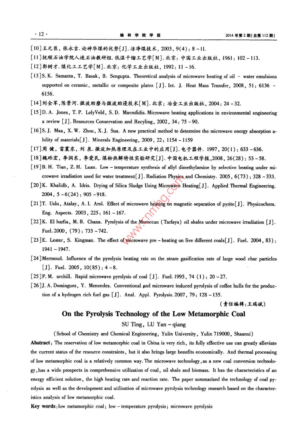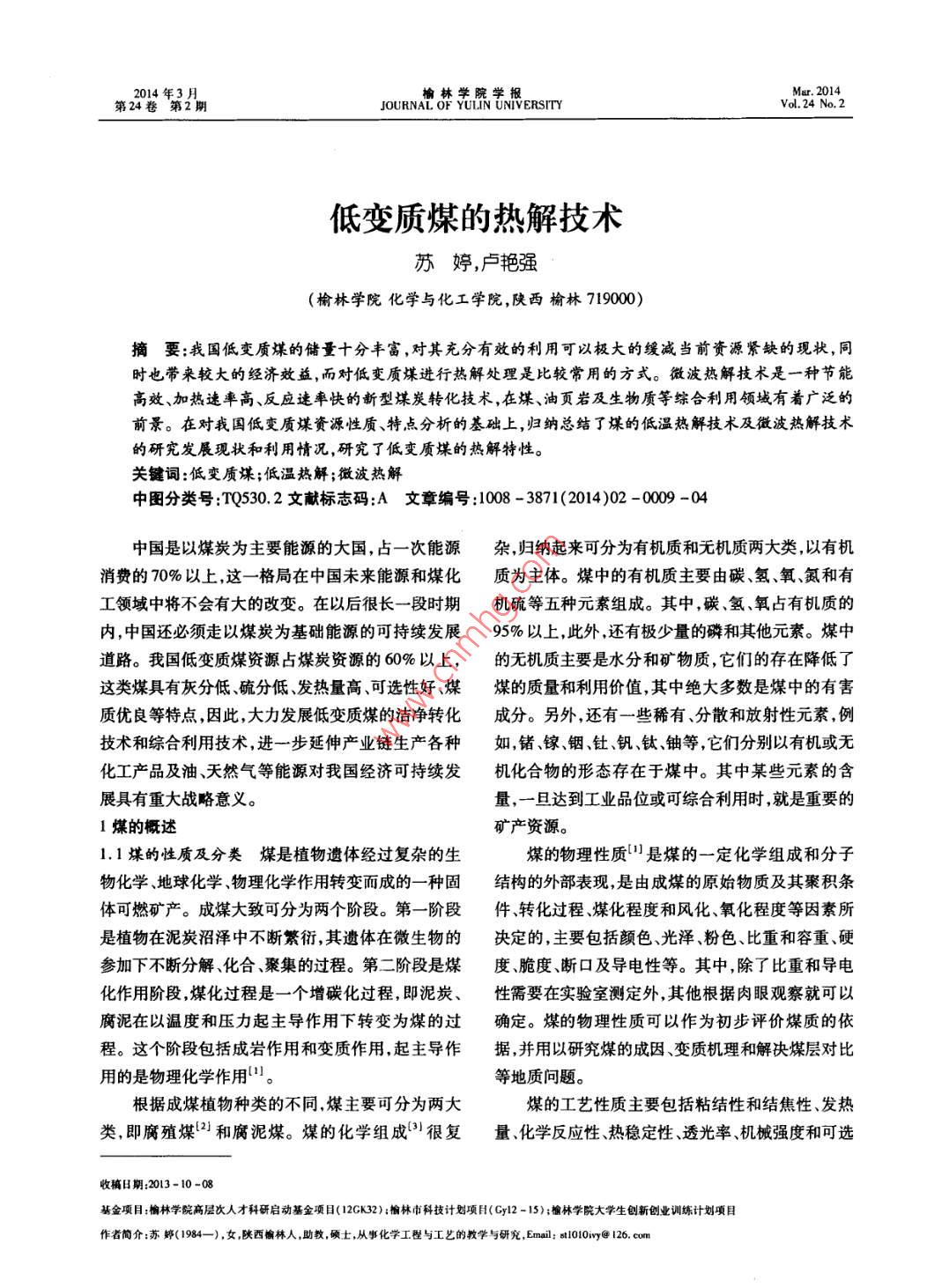 2014年3月榆林學(xué)院學(xué)報(bào)Mar.2014第24卷第2期JOURNAL OF YULIN UNIVERSITYVol 24 No. 2低變質(zhì)煤的熱解技術(shù)蘇婷,盧艷強(qiáng)榆林學(xué)院化學(xué)與化工學(xué)院,陜西榆林71900摘要:我國(guó)低變質(zhì)煤的儲(chǔ)量十分豐富,對(duì)其充分有效的利用可以極大的緩減當(dāng)前資源緊缺的現(xiàn)狀,同時(shí)也帶來較大的經(jīng)濟(jì)效益,而對(duì)低變質(zhì)煤進(jìn)行熱解處理是比較常用的方式。微波熱解技術(shù)是一種節(jié)能高效、加熱速率高、反應(yīng)速率快的新型煤炭轉(zhuǎn)化技術(shù),在煤、油頁(yè)巖及生物質(zhì)等綜合利用領(lǐng)域有著廣泛的前景。在對(duì)我國(guó)低變質(zhì)煤資源性質(zhì)、特點(diǎn)分析的基礎(chǔ)上,歸納總結(jié)了煤的低溫?zé)峤饧夹g(shù)及微波熱解技術(shù)的研究發(fā)展現(xiàn)狀和利用情況,研究了低變質(zhì)煤的熱解特性。關(guān)鍵詞:低變質(zhì)煤;低溫?zé)峤?微波熱解中圖分類號(hào):TQ530.2文獻(xiàn)標(biāo)志碼:A文章編號(hào):1008-3871(2014)02-0009-0中國(guó)是以煤炭為主要能源的大國(guó),占一次能源雜,歸納起來可分為有機(jī)質(zhì)和無機(jī)質(zhì)兩大類以有機(jī)消費(fèi)的70%以上,這一格局在中國(guó)未來能源和煤化質(zhì)為主體。煤中的有機(jī)質(zhì)主要由碳、氫、氧、氮和有工領(lǐng)域中將不會(huì)有大的改變。在以后很長(zhǎng)一段時(shí)期機(jī)硫等五種元素組成。其中,碳、氫、氧占有機(jī)質(zhì)的內(nèi),中國(guó)還必須走以煤炭為基礎(chǔ)能源的可持續(xù)發(fā)展95%以上,此外,還有極少量的磷和其他元素。煤中道路。我國(guó)低變質(zhì)煤資源占煤炭資源的60%以上,的無機(jī)質(zhì)主要是水分和礦物質(zhì),它們的存在降低了這類煤具有灰分低、硫分低、發(fā)熱量高、可選性好、煤煤的質(zhì)量和利用價(jià)值,其中絕大多數(shù)是煤中的有害質(zhì)優(yōu)良等特點(diǎn)因此,大力發(fā)展低變質(zhì)煤的潔凈轉(zhuǎn)化成分。另外,還有一些稀有、分散和放射性元素,例技術(shù)和綜合利用技術(shù),進(jìn)一步延伸產(chǎn)業(yè)鏈生產(chǎn)各種如,鍺、鎵、銦釷、釩、鈦、鈾等,它們分別以有機(jī)或無化工產(chǎn)品及油天然氣等能源對(duì)我國(guó)經(jīng)濟(jì)可持續(xù)發(fā)機(jī)化合物的形態(tài)存在于煤中。其中某些元素的含展具有重大戰(zhàn)略意義。量,一旦達(dá)到工業(yè)品位或可綜合利用時(shí),就是重要的1煤的概述礦產(chǎn)資源。1.1煤的性質(zhì)及分類煤是植物遺體經(jīng)過復(fù)雜的生煤的物理性質(zhì)是煤的一定化學(xué)組成和分子物化學(xué)、地球化學(xué)物理化學(xué)作用轉(zhuǎn)變而成的一種固結(jié)構(gòu)的外部表現(xiàn),是由成煤的原始物質(zhì)及其聚積條體可燃礦產(chǎn)。成煤大致可分為兩個(gè)階段。第一階段件轉(zhuǎn)化過程煤化程度和風(fēng)化、氧化程度等因素所是植物在泥炭沼澤中不斷繁衍,其遺體在微生物的決定的,主要包括顏色、光澤、粉色、比重和容重、硬參加下不斷分解、化合、聚集的過程。第二階段是煤度脆度、斷口及導(dǎo)電性等。其中,除了比重和導(dǎo)電化作用階段煤化過程是一個(gè)增碳化過程,即泥炭、性需要在實(shí)驗(yàn)室測(cè)定外,其他根據(jù)肉眼觀察就可以腐泥在以溫度和壓力起主導(dǎo)作用下轉(zhuǎn)變?yōu)槊旱倪^確定。煤的物理性質(zhì)可以作為初步評(píng)價(jià)煤質(zhì)的依程。這個(gè)階段包括成巖作用和變質(zhì)作用,起主導(dǎo)作據(jù),并用以研究煤的成因、變質(zhì)機(jī)理和解決煤層對(duì)比用的是物理化學(xué)作用。等地質(zhì)問題。根據(jù)成煤植物種類的不同煤主要可分為兩大煤的工藝性質(zhì)主要包括粘結(jié)性和結(jié)焦性、發(fā)熱類,即腐殖煤和腐泥煤。煤的化學(xué)組成很復(fù)量、化學(xué)反應(yīng)性、熱穩(wěn)定性、透光率、機(jī)械強(qiáng)度和可選牧藕日期:2013-基金項(xiàng)目:檎林學(xué)院高層次人才科研啟動(dòng)基金項(xiàng)目(12CK32);榆林市科技計(jì)劃項(xiàng)日(Cy12-15);榆林學(xué)院大學(xué)生創(chuàng)新創(chuàng)業(yè)訓(xùn)練計(jì)劃項(xiàng)目作者簡(jiǎn)介:蘇婷(1984一),女,陜西愉林人,助教,碩士,從事化學(xué)工程與工藝的教學(xué)與研究,Emal:stl010iy@126.cm榆林學(xué)院學(xué)2014年第2期(總第112性等,是煤進(jìn)行加工轉(zhuǎn)化的重要依據(jù)。國(guó) Toscoal工藝、 ENCOAL工藝、日本煤快速熱解工1.2我國(guó)煤炭資源及特點(diǎn)我國(guó)煤炭資源豐富,分藝、德國(guó)L-R工藝澳大利亞流化床快速熱解工藝布廣泛,但分布極不均衡。煤炭資源量最多的是新及前蘇聯(lián)3TX(ETCH)-175工藝等 garrett法是疆(19193.53億噸),而最少為浙江省(0.50億噸)。美國(guó)西方研究公司研究開發(fā)的一種熱解工藝。北方的大興安嶺、太行山、賀蘭山之間的地區(qū),包括國(guó)內(nèi)以侏羅紀(jì)不粘煤、弱粘煤、長(zhǎng)焰煤等低變質(zhì)內(nèi)蒙古、山西、陜西、寧夏、甘肅河南6各省區(qū)的全煤為原料進(jìn)行低溫?zé)峤馍a(chǎn)蘭炭的主要爐型有四部或大部,是我國(guó)煤炭資源集中分布的地區(qū),其資源種:一是考伯斯外熱式直立炭化爐;二是鞍山熱能院量占全國(guó)煤炭資源量的50%左右,占我國(guó)北