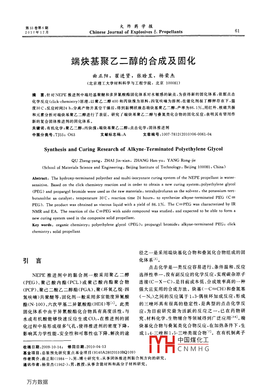 第33卷第6期火炸藥學報2010年12月Chinese Journal of Explosives & Propellants端炔基聚乙二醇的合成及固化曲正陽,翟進賢,張晗昱,楊榮杰(北京理工大學材料科學與工程學院,北京100081)摘要:針對NEPE推進劑中端羥基聚醚和多異氰酸酯固化體系對水敏感的缺點,為獲得新的固化體系,依據(jù)點擊化學反應( click-chemistry)原理,以瘢乙二醇400和丙炔溴為原料四氫呋喃為溶劑在催化劑叔丁醇鉀存在下,溫度30C,反應時間24h,分離產(chǎn)物并真空干燥后,得到黏稠狀液態(tài)端炔基聚乙二醇,產(chǎn)率為86.1%用紅外、核磁共振元素分析對端炔基聚乙二醇進行了表征。研究了端炔基聚乙二醇與疊氮類化合物的固化反應,表明其有望用作新的復合固體推進劑的固化體系。關(guān)鍵詞:有機化學;聚乙二醇;丙炔溴;端炔基聚乙二醇;點擊化學;固體推進劑中圖分類號:T55;063文獻標志碼:A文章編號:1007-7812(2010)06-0061-04Synthesis and Curing Research of Alkyne-Terminated Polyethylene GlycolQU Zheng-yang, ZHAI Jin-xian, ZHANG Han-yu, YANG Rong-jie(School of Materials Science and Engineering, Beijing Institute of Technology, Beijing 100081, China)Abstract: The hydroxy-terminated polyether and multi-isocyanate curing system of the NEPE propellant is watersensitive. Based on the click chemistry reaction and in order to obtain a new curing system, polyethylene glycol(PEG)and propargyl bromide were used as the raw materials, tetrahydrofuran as the solvent the potassium tert-butanolthe as catalyst, temperature 30 C, reaction time 24 hours, to synthesize alkyne-terminated PEG (CPEG). The product was obtained as viscous liquid with a yield of 86. 1%. The C=PEG was characterized by IRNMR and EA. The reaction of the C=PEG with azido compound was studied, and expected to be able to form anew curing system used in the composite solid propellantKey words: organic chemistry: polyethylene glycol (PEG ): propargyl bromide, alkyne-terminated PEG: clickhemistry solid propellant徑之一是采用端炔基化合物和疊氮化合物組成的固引言化體系點擊化學是一類反應容易進行、條件溫和、反應NEPE推進劑中的黏合劑一般釆用聚乙二醇選擇性單一、沒有副反應的化學反應,實現(xiàn)碳雜原子(PEG)、聚己酸內(nèi)酯(PCL)或聚己酸內(nèi)酯聚合物連接(C-X一C),是目前成本低、合成效率高的一種(PCP)、聚己二酸乙二醇酯(PGA)、聚(環(huán)氧乙烷四強大且實用的合成方法。炔基(-C≡CH)和疊氮基氫呋喃)共聚醚等,固化劑一般采用多官能度異氰酸(一N3)之間的反應屬于1,3-偶極環(huán)加成反應,形成酯(N-100)、六次甲基二異氰酸酯(HDI)等。此類的三唑環(huán)具有很高的穩(wěn)定性,是典型的點擊化學反固化體系中由于異氰酸酯化合物具有高度活性,與應,為目前研究最為活躍的反應之一,已在藥物研水或有機酸能夠快速反應生成CO2,在推進劑的固究、材料化學、生物綴合等領(lǐng)域得到廣泛應用36。端化過程中易形成很多氣孔使得推進劑的密度下降,炔基化合物與疊氮類化合物反應,在加熱條件下,生影響其力學性能,安全性和可靠性也下降解決的途成1,4三唑和1,5三唑類混合物。在有機銅離子中國煤化工收稿日期:2009-10-14;修回日期:2010-0413CNMHG基金項目:總裝預先研究重點基金項目(9140A28020510BQ109)作者簡介:曲正陽(1984-),男,博士研究生,從事固體推進劑黏合劑方向的研究。通訊作者:楊榮杰(1962-),男,教授,從事含能材料和高分子材料研究。火炸藥學報第33卷第6期的催化作用下,選擇性地生成1,4三唑類化合物。??跓恐蟹謩e加入1.4g叔丁醇鉀,2.0g聚乙二醇本研究以聚乙二醇400和丙炔溴為原料,四氫400,3.0g丙炔溴和95mL四氫呋喃,通氮氣保護,呋喃為溶劑,合成了端炔基聚乙二醇( Alkyne-水浴加熱,反應溫度30C,反應24h。用飽和食鹽水Terminated PEG,C≡PEG400),以期以兩個端炔溶液萃取,上層液旋蒸,真空干燥后,得到黏稠狀液基與多疊氮基有機化合物組成新的固化體系,在態(tài)產(chǎn)物,產(chǎn)率86.1%。NEPE推進劑中得到應用將得到的產(chǎn)物與官能度為3.82的某疊氮類化劑進行固化反應,以CuI為催化劑,醋酸三甘油酯1實驗為增塑劑,得到固化產(chǎn)物1.1材料及儀器2結(jié)果與分析材料:丙炔溴和叔丁醇鉀,化學純, Alfa Aesar公司;聚乙二醇400,化學純廣東汕頭市西龍化工廠;2.1C≡PEG的反應機理四氫呋喃、氯化鈉和水,化學純,北京化學試劑公司。叔丁醇鉀具有強堿性,置換出PEG端羥基中的儀器: Nicolet6700FT-IR(全反射法),美國熱氫,生成PEG的鉀鹽。C-X(X為鹵原子)鍵具有極電公司; AVANCE DRX-500型超導核磁共振波譜性,鹵原子帶部分負電荷,與之相連的碳原子帶部分儀,德國布魯克公司; Vario el ll元素分析儀,德國正電荷,易受帶負電荷或未共用電子對試劑的進攻,Elementar公司。鹵原子帶一對電子離開,發(fā)生取代反應,烯丙型鹵代1.2實驗烴分子中的鹵原子活潑,容易與親核試劑作用發(fā)生在裝有磁力攪拌器、回流冷凝管和溫度計的三取代反應。其反應式如下:HO +CH-CHH+H C-C-CH+HC-c一CHO-KK-o+CH-CH -0+K+HCBC-CH-BrHC=C-CH2-0 +CH, CH, -0+CH,-C=CH+KBr2.2C≡PEG400的結(jié)構(gòu)表征2.2.2核磁共振譜圖分析2.2.1紅外譜圖分析以TMS為內(nèi)標,CDCl3為溶劑,假定PEG400PEG400和C≡PEG400的紅外譜圖見圖1。和C≡PEG400的分子結(jié)構(gòu)和不同化學環(huán)境H的位置如式(1)和式(2)所示2107669Ho一總-2-0+是-0-總-0(110c-是-0-2-+-ccm對PEG400和C≡PEG400進行HNMR分析。PEG400: HNMR(CDCI),8: 3. 14(s, 2H4000300020001000sie1),3.54~3.56(t,4H,site3),3.59~3.6l(m,圖1PEG400和C≡PEG400的紅外譜圖24H,site4),3.65~3