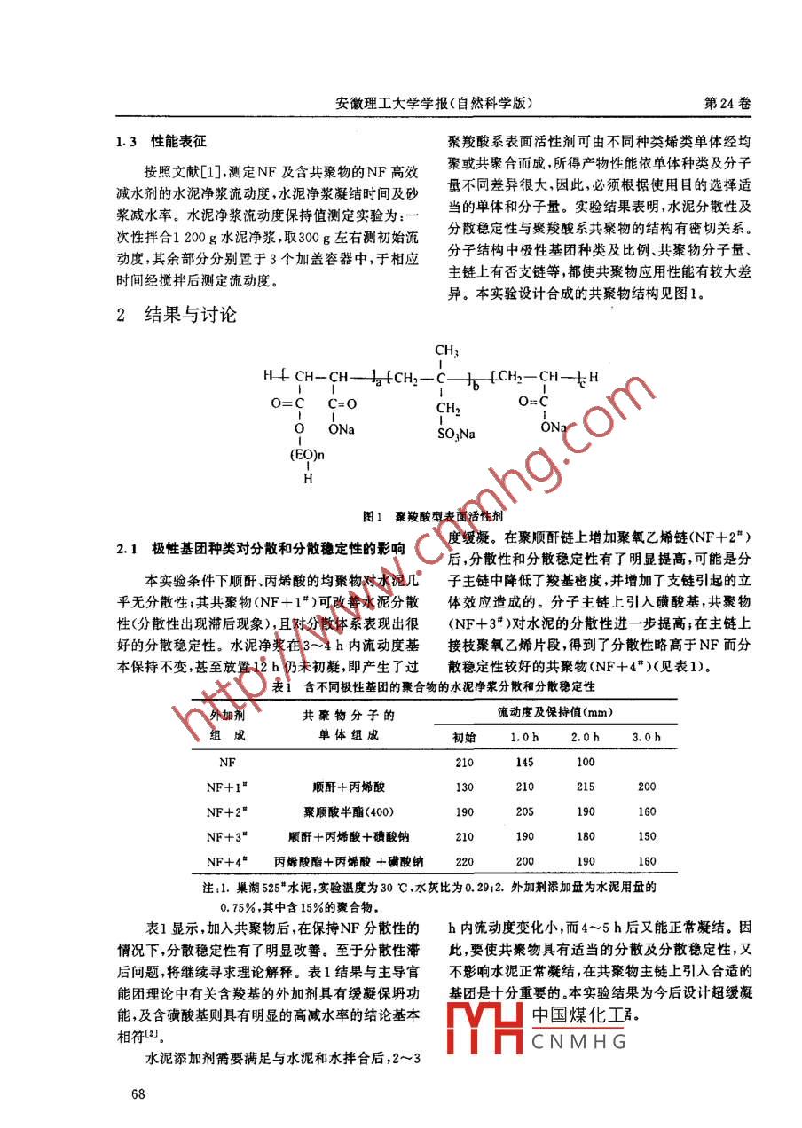 第24卷第1期安徽理工大學學報(自然科學版)Vol. 24 No. 12004年3月Journal of Anhui University of Science and Technology (Natural Science)Mar. 2004萘系高效減水劑添加劑的合成及作用機理研究張曉梅',鄧成剛”,唐軍”,朱宗軍”,胡 義*(1.安徽理工大學化學工程系,安徽淮南232001;2. 淮南礦業(yè)集團合成材料有限責任公司,安徽淮南232046)摘要:為提高萘系高效減水劑的分散穩(wěn)定性,進行了以順丁烯二酸聚乙二酵(400,1 000)單酯、烯丙基磺酸鈉等烯類單體為原料,經(jīng)共聚合反應合成的聚羧酸型高分子表面活性劑,作為萘泉高效減水劑的分散穩(wěn)定劑的研究。研究了共聚物分子結(jié)構(gòu)中單體種類、相對分子量及側(cè)鏈長度對水泥凈漿分散性及分散穩(wěn)定性的影響,合成產(chǎn)物對水泥凈漿基本無緩凝作用又可使砂漿減水率有所提高、砂漿擴展度保持值亦明顯改善;對作用機理進行探討,認為,摻加了所合成的聚羧酸共聚物的萘系高效減水劑,保留了萘系減水劑對水泥較高的分散性,又賦予水泥顆粒較好的分散穩(wěn)定性,這是靜電斥力與立體效應綜合作用的結(jié)果。關鍵詞:蔡系高效威水劑;聚羧酸型共聚物;共聚合反應;分散穩(wěn)定性;作用機理中圖分類號:TQ314.2文獻標識碼:A文章編號:1672-1098<2004>01-0067-04(甲基)丙烯酸;丙烯酸羥乙酯;烯丙基磺酸鈉(簡稱前言磺酸鈉);過硫酸銨;次亞磷酸鈉;過氧化氫;分子量高性能減水劑(又稱超塑化劑)是高性能混凝調(diào)節(jié)劑等。土中的一種核心技術材料。萘系高效減水劑是我國性能測試材料:巢湖525#水泥,NF高效減水目前工程應用中的主要品種,它以煤焦油提取物工劑,共聚物(自制)。業(yè)萘為原料,具有成本較低,臧水率較高,應用廣1.2共聚物的合成.泛,與其它外加劑復合性能好,對水泥適應性好等優(yōu)點,但其坍落度損失大,直接影響了減水劑的使(1)順酐一甲基丙烯 酸共聚物的合成,將一定用效果。近年來,業(yè)內(nèi)人士將研究目光轉(zhuǎn)向了被稱量的順酐加入三口燒瓶中,用氫氧化鈉中和后加入次為第三代高效減水劑的以聚氧乙烯基醚為側(cè)鏈的亞磷酸鈉,攪拌,升溫,滴加過氧化氫和甲基丙烯酸,聚羧酸型梳狀共聚物。田于具有對分散質(zhì)微粒的超100 C左右反應5 h,氫氧化鈉中和,即得產(chǎn)物。分散性和對超分散體系穩(wěn)定的特性,聚羧酸型超塑聚順酸半酯的合成用上述引發(fā)劑體系?;瘎┑难芯块_發(fā)非?;钴S。本文在國內(nèi)外文獻、專(2)其它共聚物的合成共分兩步進行,首先,利的基礎上,對可提高蔡系高效減水劑分散穩(wěn)定性將順酐和丙烯酸分別與聚乙二醇部分或全部酯化的添加劑聚羧酸型共聚物進行研究,為進一-步完善成相應的酯(本文中簡稱順酸半酯和丙烯酸酯),通蔡系超塑化劑的性能,為其繼續(xù)發(fā)揮成本低,性能過反應體系的酸值控制酯化程度;而后,在三口瓶好的優(yōu)勢提供實驗依據(jù)及技術支持。中加入一定量水,將烯丙基磺酸鈉溶解,加熱、攪拌至一定溫度,分批加入相應引發(fā)劑和烯類單體,在1實驗一定溫度下反應約5 h.反應結(jié)束后,以氫氧化鈉中和產(chǎn)物至pH為7.5.1.1實驗藥品及材料用Sartrius水分測定儀測定產(chǎn)物固含量,由烏.合成原料:順酐;聚乙二醇(分子量400, 1000) ;氏粘度計法獲得特性粘度數(shù)據(jù)。中國煤化工收稿日期:2003-10-14薔金項目:淮南礦業(yè)集團2000年科學技術資助項目CTH.CNMH G作者簡介r張曉梅(1962-),女,海南人,副教授,博士.長期從事農(nóng)藥及工業(yè)高分子表面活性劑的合成、應用研究。67安徽理工大學學報(自然科學版)第24卷1.3性能表征聚羧酸系表面活性劑可由不同種類烯類單體經(jīng)均按照文獻[1],測定NF及含共聚物的NF高效聚或共聚合而成,所得產(chǎn)物性能依單體種類及分子減水劑的水泥凈漿流動度,水泥凈漿凝結(jié)時間及砂量不同差異很大,因此,必須根據(jù)使用目的選擇適漿減水率。水泥凈漿流動度保持值測定實驗為:一當?shù)膯误w和分子量。實驗結(jié)果表明,水泥分散性及次性拌合1 200 g水泥凈漿,取300 g左右測初始流分散穩(wěn)定性與聚羧酸系共聚物的結(jié)構(gòu)有密切關系。動度,其余部分分別置于3個加蓋容器中,于相應分子結(jié)構(gòu)中極性基團種類及比例、共聚物分子量、主鏈.上有否支鏈等,都使共聚物應用性能有較大差時間經(jīng)攪拌后測定流動度。異。本實驗設計合成的共聚物結(jié)構(gòu)見圖1.2結(jié)果與討論CH;H CH-CH一Hy4CH2-C- t 4CH2-CH-tH0=CC=OCH2ONaSO;Na(EO)nH圖1聚羧酸型表面活性劑2.1極性基團種類對分 散和分散穩(wěn)定性的影響度緩凝。在聚順酐鏈上增加聚氧乙烯鏈(NF+2" )后,分散性和分散穩(wěn)定性有了明顯提高,可能是分本實驗條件下順酐、丙烯酸的均聚物對水泥幾子主鏈中降低了羧基密度,并增加了支鏈引起的立平無分散性;其共聚物(NF+1#)可改善水泥分散體效應造成的。分子主鏈上引入磺酸基,共聚物性(分散性出現(xiàn)滯后現(xiàn)象),且對分散體系表現(xiàn)出很(NF +3# )對水泥的分散性進- -步 提高;在主鏈上好的分散穩(wěn)定性。水泥凈漿在3~4 h內(nèi)流動度基接枝聚氧乙烯片段,得到了分散性略高于NF而分本保持不變,甚至放置12 h仍未初凝,即產(chǎn)生了過散穩(wěn)定性較好的共聚物(NF +4# )(見表1)。表1含不同極性基團 的聚合物的水泥猙漿分散和分散穩(wěn)定性外加劑共聚物分子的流動度及保持