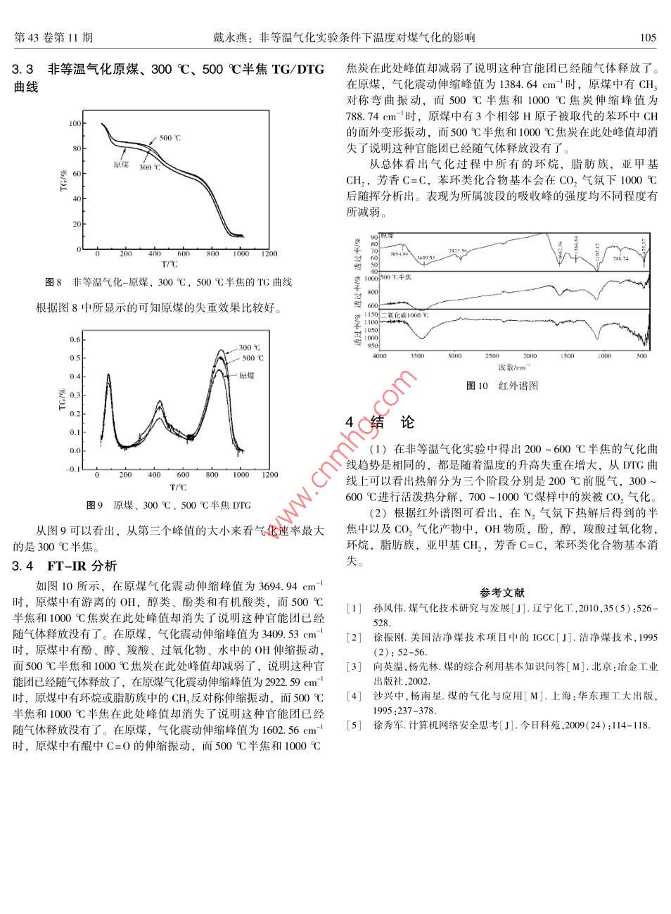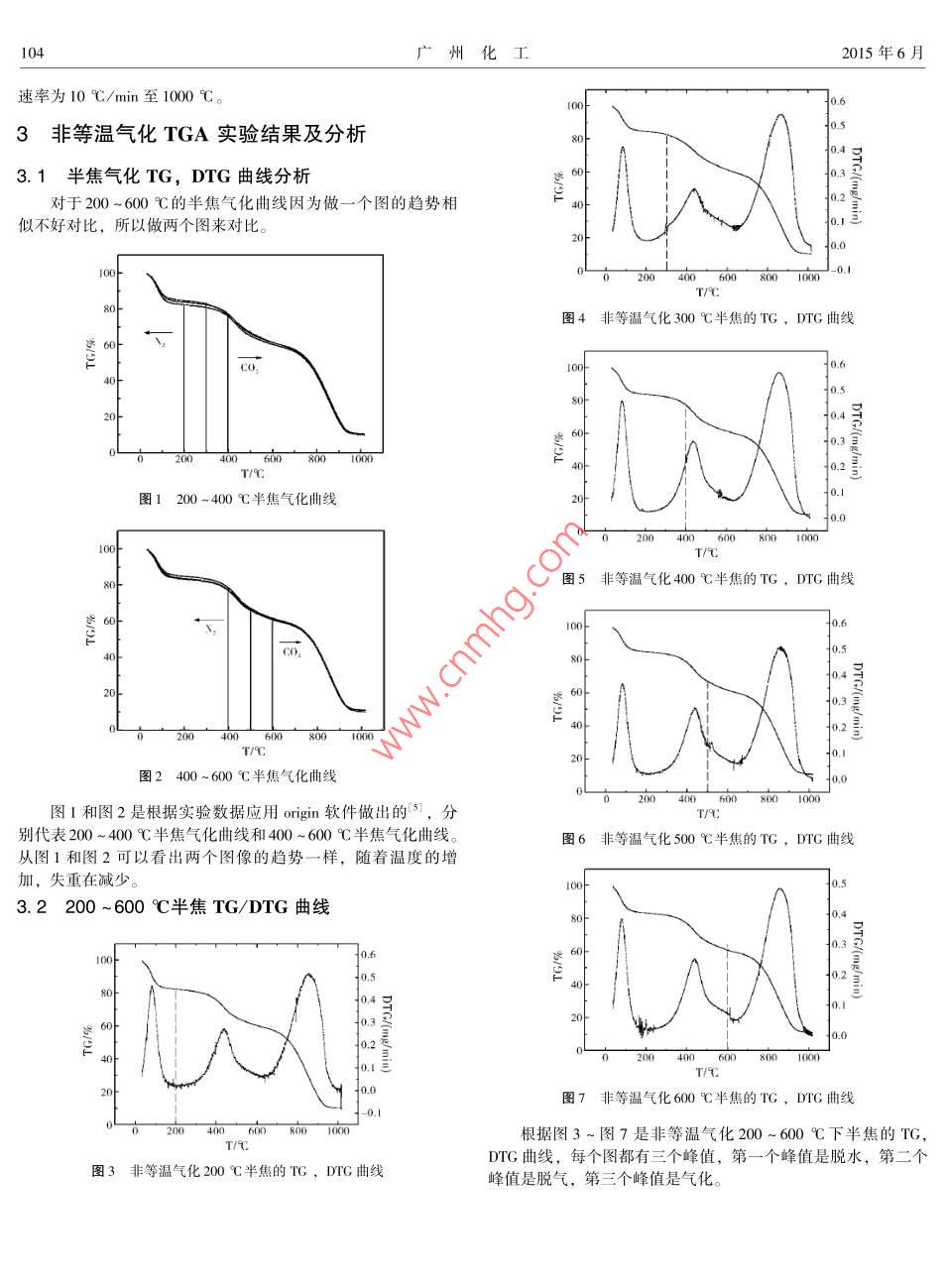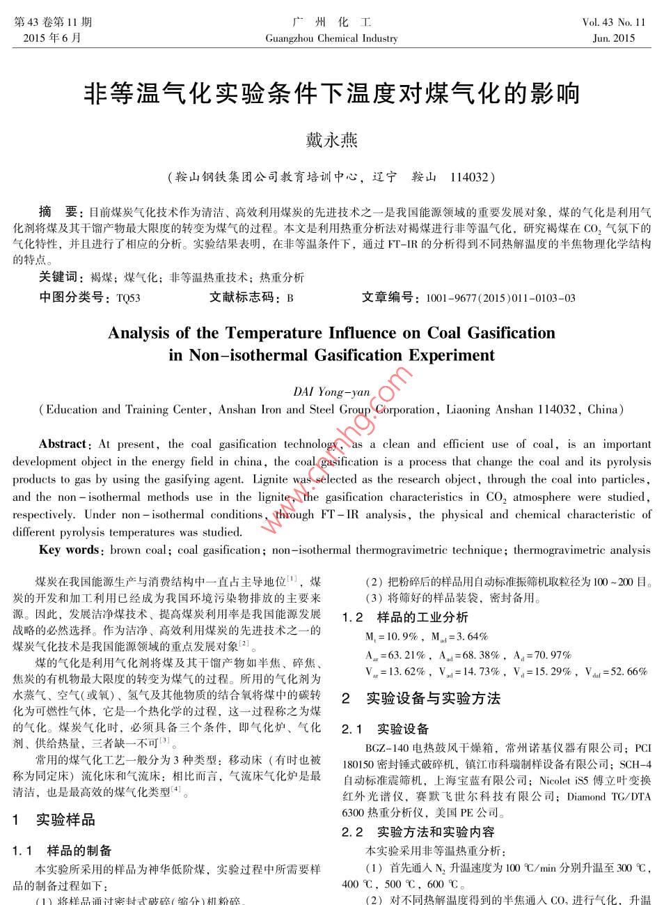 第43卷第11期廣州化工Vol.43 No. 112015年6月Guangzhou Chemical IndustryJun.2015非等溫氣化實(shí)驗(yàn)條件下溫度對(duì)煤氣化的影響戴永燕(鞍山鋼鐵集團(tuán)公司教育培訓(xùn)中心,遼寧鞍山114032)摘要:目前煤炭氣化技術(shù)作為清潔、高效利用煤炭的先進(jìn)技術(shù)之一是我國(guó)能源領(lǐng)域的重要發(fā)展對(duì)象,煤的氣化是利用氣化劑將煤及其干餾產(chǎn)物最大限度的轉(zhuǎn)變?yōu)槊簹獾倪^程。本文是利用熱重分析法對(duì)褐煤進(jìn)行非等溫氣化,研究褐煤在CO2氣氛下的氣化特性,并且進(jìn)行了相應(yīng)的分析。實(shí)驗(yàn)結(jié)果表明,在非等溫條件下,通過FT-IR的分析得到不同熱解溫度的半焦物理化學(xué)結(jié)構(gòu)的特點(diǎn)。關(guān)鍵詞:褐煤;煤氣化;非等溫?zé)嶂丶夹g(shù);熱重分析中圖分類號(hào): TQ53文獻(xiàn)標(biāo)志碼: B文章編號(hào): 1001 -9677(2015)011-0103-03Analysis of the Temperature Influence on Coal Gasificationin Non- isothermal Gasification ExperimentDAI Yong-yan( Education and Training Center, Anshan lron and Steel Group Corporation, Liaoning Anshan 114032, China)Abstract: At present, the coal gasification technology, as a clean and efficient use of coal, is an importantdevelopment object in the energy field in china, the coal gasification is a process that change the coal and its pyrolysisproducts to gas by using the gasifying agent. Lignite was selected as the research object, through the coal into particles ,and the non - isothermal methods use in the lignite, the gasification characteristics in CO2 atmosphere were studied,respectively. Under non - isothermal conditions, through FT- IR analysis, the physical and chemical characteristic ofdiferent pyrolysis temperatures was studied.Key words: brown coal; coal gasification ; non - isothermal thermogravimetrie technique ; thermogravimetric analysis .煤炭在我國(guó)能源生產(chǎn)與消費(fèi)結(jié)構(gòu)中- -直占主導(dǎo)地位甲,煤(2)把粉碎后的樣品用自動(dòng)標(biāo)準(zhǔn)振篩機(jī)取粒徑為100~200目。炭的開發(fā)和加工利用已經(jīng)成為我國(guó)環(huán)境污染物排放的主要來(3)將篩好的樣品裝袋,密封備用。源。因此,發(fā)展?jié)崈裘杭夹g(shù)、提高煤炭利用率是我國(guó)能源發(fā)展1.2 樣品的工業(yè)分析戰(zhàn)略的必然選擇。作為潔凈、高效利用煤炭的先進(jìn)技術(shù)之一的M,=10.9%,M.=3. 64%煤炭氣化技術(shù)是我國(guó)能源領(lǐng)域的重點(diǎn)發(fā)展對(duì)象2]。A. =63.21%,Au=68. 38%, A。=70. 97%煤的氣化是利用氣化劑將煤及其干餾產(chǎn)物如半焦、碎焦、V。=13.62%,Vu=14. 73%,V=15. 29%,Vur=52. 66%焦炭的有機(jī)物最大限度的轉(zhuǎn)變?yōu)槊簹獾倪^程。所用的氣化劑為水蒸氣、空氣(或氧)、氫氣及其他物質(zhì)的結(jié)合氟將煤中的碳轉(zhuǎn)2實(shí)驗(yàn)設(shè) 備與實(shí)驗(yàn)方法化為可燃性氣體,它是一一個(gè)熱化學(xué)的過程,這一一 過程稱之為煤的氣化。煤炭氣化時(shí),必須具備三個(gè)條件,即氣化爐、氣化2. 1實(shí)驗(yàn)設(shè) 備劑、供給熱量,三者缺-不可可。BGZ- 140電熱鼓風(fēng)干燥箱,常州諾基儀器有限公司; PCI常用的煤氣化工藝- -般分為3種類型:移動(dòng)床( 有時(shí)也被180150密封錘式破碎機(jī),鎮(zhèn)江市科瑞制樣設(shè)備有限公司; SCH-4稱為同定床)流化床和氣流床:相比而言,氣流床氣化爐是最自動(dòng)標(biāo)準(zhǔn)震篩機(jī),上海寶藍(lán)有限公司; Nicolet is5傅立葉變換清潔,也是最高效的煤氣化類型41。紅外光譜儀,賽默飛世爾科技有限公司; Diamond TC/DTA6300熱重分析儀,美國(guó)PE公司。1實(shí)驗(yàn)樣品2.2實(shí)驗(yàn)方 法和實(shí)驗(yàn)內(nèi)容1.1樣品的制備本實(shí)驗(yàn)采用非等溫?zé)嶂胤治?本實(shí)驗(yàn)所采用的樣品為神華低階煤,實(shí)驗(yàn)過程中所需要樣(1)首先通入N2升溫速度為100 C/min分別升溫至300 C,品的制備過程如下:400C,500C, 600 C。(2)對(duì)不同熱解溫度得到的半焦通人co,進(jìn)行氣化、升溫,104廣州化工2015年6月速率為10C/min至1000C。00).63非等溫氣化TGA實(shí)驗(yàn)結(jié)果及分析0.5g3.1 半焦氣化TG, DTG曲線分析0t對(duì)于200~600C的半焦氣化曲線因?yàn)樽鲆粋€(gè)圖的趨勢(shì)相似不好對(duì)比,所以做兩個(gè)圖來對(duì)比。40.0100J 0.T/C80圖4非等溫氣化 300 C半焦的TG,DTG 曲線goof . 下co.40.630f20.4號(hào)60400 600 800 :一 1000+0.2圖1200-400C半焦氣化曲線0.1.000-T/T圖5非等溫氣化400 C半焦的TG,DTG曲線下00.64o4三0.30δ204000 Td02蓋20-圖2 400~600 C半焦氣化曲線0.00200 400 600 800 000圖1和圖2是根據(jù)實(shí)驗(yàn)數(shù)據(jù)應(yīng)用origin軟件做出的5],分別代表200~400C半焦氣化曲線和400~600C半焦氣化曲線。圖6非等溫氣化500C半焦的TC,DTG曲線從圖1和圖2可以看出兩個(gè)圖像的趨勢(shì)-一樣,隨著溫度的增加,失重在減少。).s3.2 200 ~600 °C半焦TG/DTG曲線0.4_+0.5。0.220F4010000圖7非等溫氣化 600 C半焦的TG,DTG 曲線1 0.1δ 200 400 600 800 1000根據(jù)圖3~圖7是非等溫氣化200~600 C下半焦的TG,T/9DTG曲線,每個(gè)圖都有三個(gè)峰值,第一個(gè)峰值是脫水,第二個(gè)圖3非等溫氣化200C半焦的TG,DTG曲線峰值是脫氣,第三個(gè)峰值是氣化。第43卷第11期戴永燕:非等溫氣化實(shí)驗(yàn)條件下溫度對(duì)煤氣化的影響1053.3非等溫氣化原煤、300C、500C半焦TG/DTG焦炭在此處峰值卻減弱了說明這種官能團(tuán)已經(jīng)隨氣體釋放了。曲線在原煤,氣化震