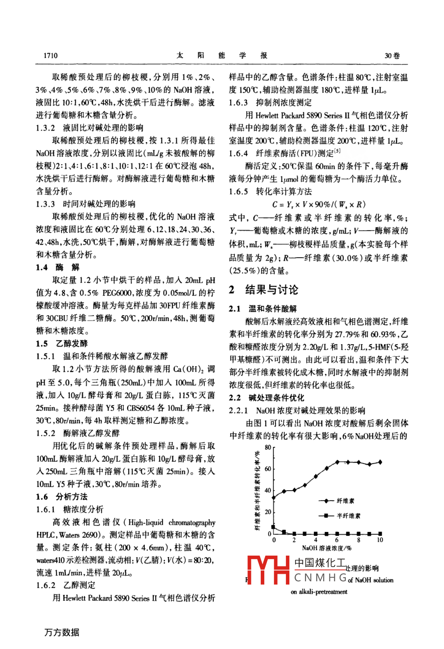 第30卷第12期太陽能學(xué)報Vol 30, No 122009年12月ACTA ENERGIAE SOLARIS SINICA文章編號:0254006(2009)12170904改進(jìn)的柳枝稷預(yù)處理方法及乙醇發(fā)酵研究段仰凱,田沈,于泳,周桂雄,楊秀山(首都師范大學(xué)生命科學(xué)學(xué)院,北京100048)摘要:為了提高柳枝稷中纖維素和半纖維素糖的轉(zhuǎn)化率降低水解液中抑制劑的濃度,首先用稀酸在溫和條件下對柳枝稷進(jìn)行水解,然后用堿對酸水解后的固體物進(jìn)行預(yù)處理,接著用纖維素酶酶解并分別對稀酸水解液和酶解液進(jìn)行乙醇發(fā)酵。結(jié)果表明:纖維素轉(zhuǎn)化率達(dá)到94.26%,半纖維素轉(zhuǎn)化率為6093%,稀酸水解液乙醇發(fā)酵的乙醇產(chǎn)率為0418乙醇/g糖,達(dá)到最高理論值的8647%。酶解液乙醇發(fā)酵的乙醇產(chǎn)率為0.486g乙醇g葡萄糖,達(dá)到最高理論值的9529%。關(guān)鍵詞:柳枝稷;溫和條件;酸水解;纖維素和半纖維素轉(zhuǎn)化率;乙醇;發(fā)酵;抑制劑中圖分類號:TK16文獻(xiàn)標(biāo)識碼:A引言1.1.1原料柳枝稷樣品由北京市農(nóng)業(yè)科學(xué)院草業(yè)研究中心纖維素燃料乙醇等可再生能源的開發(fā)已引起世提供,樣品含纖維素30.0%,半纖維素25.5%,其它界各國的普遍關(guān)注2。能源草是纖維素乙醇生產(chǎn)455%。粉碎,過40目篩,備用。中的重要原料草本植物柳枝稷的優(yōu)勢尤為突出。1.1.2纖維素酶與傳統(tǒng)植物相比,柳枝稷的抗旱能力強(qiáng)、需肥量少Celluclast 15L(諾維信公司),酶活為≥700U/g蟲害少、產(chǎn)量高,其作為c4植物對氮和水的利用率纖維二糖酶: Novozyme188(諾維信公司)酶活為≥高生長迅速、產(chǎn)量高適應(yīng)性強(qiáng)。若將其轉(zhuǎn)化為250U/g,30 CBU/mLe燃料乙醇,不但可提供車用清潔能源,而且可將其資1.1.3菌種和種子液培養(yǎng)源化利用。故柳枝稷產(chǎn)乙醇的研究具有非常廣闊的Pichia.stipitis CBS6054( ATCC) Saccharomyces應(yīng)用前景。cerevisiae Y5( CGMCC2660中國普通微生物保藏管理本研究首先在溫和條件下對柳枝稷進(jìn)行稀酸水服務(wù)中心)。兩瓶100mL無菌的YPD液體培養(yǎng)基中解將柳枝稷中的半纖維素轉(zhuǎn)化為木糖,同時降低水分別接入一環(huán)CBS054和Y5,30℃,150m/min搖床振解液中的抑制劑濃度。對以木糖為主要可發(fā)酵糖的蕩培養(yǎng),Y5和CB6054分別培養(yǎng)14h和12h,種子液稀酸水解液進(jìn)行乙醇發(fā)酵然后對稀酸水解后的剩中菌體含量分別為33g和30gL。余固體用氫氧化鈉預(yù)處理,接著將堿預(yù)處理后的固12溫和條件稀酸水解體物進(jìn)行酶解,最后將酶解后得到的葡萄糖進(jìn)行乙將粉碎過篩后的柳枝稷混勻,每個樣品按下述醇發(fā)酵。該過程既能得到高纖維素和半纖維素轉(zhuǎn)化方法處理:稱取2g粉碎后的柳枝稷,加入16mL2%率,同時也避免了高濃度發(fā)酵抑制劑的產(chǎn)生,得到了稀硫酸,135℃,lmin。收集水解液并對葡萄糖、木糖高的乙醇產(chǎn)量。和抑制劑的濃度進(jìn)行分析然后將固體水洗至pH中1材料與方法性,50℃烘干作為堿處理樣品。13NaOH預(yù)處理11材料3, 1 NaOH濃度對堿處理效果的影響中國煤化工收稿日期:200901-19基金項(xiàng)目:國家高新技術(shù)發(fā)展研究(863)計(jì)劃(2007A4057405;2007A107CNMHG通訊作者:楊秀山(1946)男教授博士生導(dǎo)師,主要從事微生物學(xué)酶和發(fā)酵工程微生物與清潔能源方面的研究。cnul-xsyang@263.net1710太陽能學(xué)報30卷取稀酸預(yù)處理后的柳枝稷,分別用1%、2%、樣品中的乙醇含量。色譜條件:柱溫80℃,注射室溫3%4%、5%、6%、7%、8%、9%、10%的NaOH溶液,度150℃,輔助檢測器溫度180℃,進(jìn)樣量lpl液固比10:1,60℃,48h,水洗烘干后進(jìn)行酶解。濾液1.6.3抑制劑濃度測定進(jìn)行葡萄糖和木糖含量分析。用 Hewlett Packard5890 SeriesⅡ氣相色譜儀分析1.3.2液固比對堿處理的影響樣品中的抑制劑含量。色譜條件:柱溫120℃,注射取稀酸預(yù)處理后的柳枝稷,按1.3.1所得最佳室溫度200℃,輔助檢測器溫度200℃,進(jìn)樣量1LaOH溶液濃度分別以液固比(mLg未被酸解的柳1.64纖維素酶活(FPU)測定枝稷)2:14:1、6:1、8:1、10:1、12:1在60℃浸泡48h,酶活定義:50℃保溫60min的條件下,每毫升酶水洗烘干后進(jìn)行酶解。對酶解液進(jìn)行葡萄糖和木糖液每分鐘產(chǎn)生1pmol的葡萄糖為一個酶活力單位。含量分析。16.5轉(zhuǎn)化率計(jì)算方法1.3.3時間對堿處理的影響C=HxV×90%/(W,xR)取稀酸預(yù)處理后的柳枝稷,優(yōu)化的NaOH溶液式中,C——纖維素或半纖維素的轉(zhuǎn)化率,%濃度和液固比在60℃分別處理6、12、18、24、30、36、Y葡萄糖或木糖的濃度,gmL;V—酶解液的4248h,水洗,50℃烘干,酶解對酶解液進(jìn)行葡萄糖體積,mL;W—柳枝稷樣品質(zhì)量,g(本實(shí)驗(yàn)每個樣和木糖含量分析。品質(zhì)量為2g);R——纖維素(30.0%)或半纖維素1.4酶解(25.5%)的含量。取定量12小節(jié)中烘干的樣品,加入20mLpH值為4.8、含0.5%PE600,濃度為0.05m的檸2結(jié)果與討論檬酸緩沖溶液。酶量為每克樣品加30FPU纖維素酶2,1溫和條件酸解和30CBU纖維二糖酶。50℃,200r/min,48h,測葡萄酸解后水解液經(jīng)高效液相和氣相色譜測定,纖維糖和木糖濃度。素和半纖維素的轉(zhuǎn)化率分別為277%和60.93%,乙15乙醇發(fā)酵酸和糠醛濃度分別為2.20g/L和137g/L,5HMF(5羥1.5.1溫和條件稀酸水解液乙醇發(fā)酵甲基糠醛)不可測出。由此可以看出,溫和條件下大取12小節(jié)方法所