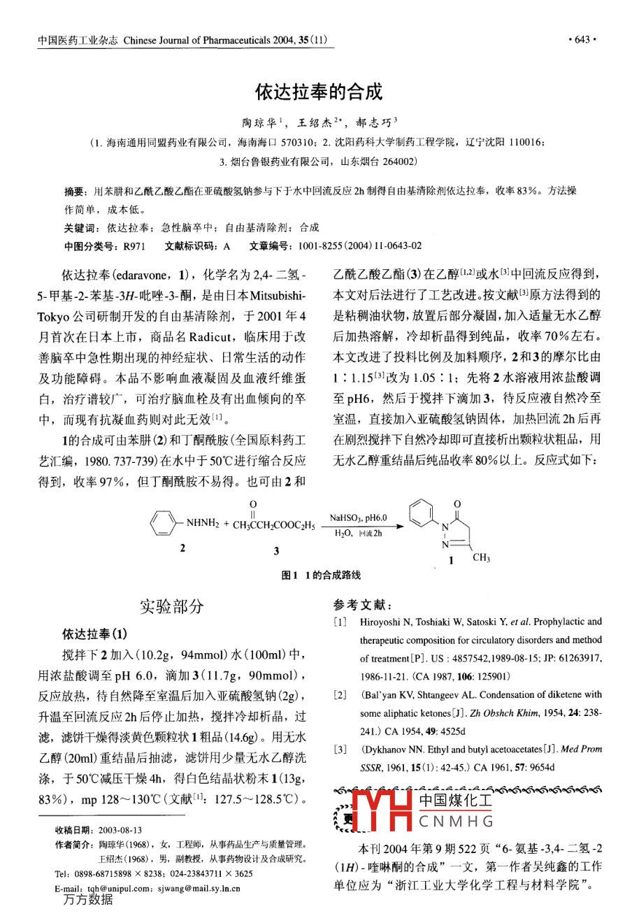 中國(guó)醫(yī)藥工業(yè)雜志Chinese Jourmal of Pharmaceuticals 2004, 35(11)●643●依達(dá)拉奉的合成陶瓊?cè)A,王紹杰2*,郝志巧3(1.海南通用同盟藥業(yè)有限公司,海南???70310; 2. 沈陽(yáng)藥科大學(xué)制藥工程學(xué)院,遼寧沈陽(yáng)1 10016;3.煙臺(tái)魯銀藥業(yè)有限公司,山東煙臺(tái)264002)摘要:用苯肼和乙酰乙酸乙酯在亞硫酸氫鈉參與下于水中回流反應(yīng)2h制得自由基清除劑依達(dá)拉奉,收率83%。方法操作簡(jiǎn)單,成本低。關(guān)鍵詞:依達(dá)拉奉:急性腦卒中:自由基清除劑:合成中圖分類(lèi)號(hào): R971文獻(xiàn)標(biāo)識(shí)碼: A文章編號(hào): 1001-8255 (2004) 11-0643-02依達(dá)拉奉(edaravone,1), 化學(xué)名為2,4- =氫 -乙酰乙酸乙酯 (3)在乙醇1.2或水3中回流反應(yīng)得到,5-甲基-2-苯基-3H-吡唑-3-酮,是由日本Mitsubishi-本文對(duì)后法進(jìn)行了工藝改進(jìn)。按文獻(xiàn)]原方法得到的Tokyo公司研制開(kāi)發(fā)的自由基清除劑,于2001年4是粘稠油狀物,放置后部分凝固,加入適量無(wú)水乙醇月首次在日本上市,商品名Radicut,臨床用于改后加熱溶解,冷卻析晶得到純品,收率70%左右。善腦卒中急性期出現(xiàn)的神經(jīng)癥狀、日常生活的動(dòng)作本文改進(jìn)了投料比例及加料順序,2和3的摩爾比由及功能障礙。本品不影響血液凝固及血液纖維蛋1 : 1.15[31改為1.05: 1; 先將2水溶液用濃鹽酸調(diào)白,治療譜較廣,可治療腦血栓及有出血傾向的卒至pH6,然后于攪拌下滴加3,待反應(yīng)液自然冷至中,而現(xiàn)有抗凝血藥則對(duì)此無(wú)效1]。室溫,直接加入亞硫酸氫鈉固體,加熱回流2h后再1的合成可由苯肼(2)和丁酮酰胺(全國(guó)原料藥工在劇烈攪拌下自然冷卻即可直接析出顆粒狀粗品,用藝匯編,1980. 737-739)在水中于50"C進(jìn)行縮合反應(yīng)無(wú)水乙醇重結(jié)晶后純品收率80%以上。反應(yīng)式如下:得到,收率97%, 但丁酮酰胺不易得。也可由2和0. NHNH2 + CH:CCH2COOC;HsNaHSO3, pH6.0→H2O, 國(guó)流2h1 CH3圖1 1的合成路線(xiàn)實(shí)驗(yàn)部分參考文獻(xiàn):[1] Hiroyoshi N, Toshiaki w, Satoski Y, et al. Prophylactic and依達(dá)拉奉(1)therapeutic composition for circulatory disorders and method攪拌下2加入(10.2g,94mmol) 水(100ml)中,of treatmnent[P]. Us : 4857542,1989-08- 1S; JP: 61263917.用濃鹽酸調(diào)至pH 6.0,滴加3(11.7g, 90mmol),1986-11-21. (CA 1987, 106: 125901)反應(yīng)放熱,待自然降至室溫后加入亞硫酸氫鈉(2g),[2(Bal" yan KV, Shtangeev AL. Condensation of diketene with升溫至回流反應(yīng)2h后停止加熱,攪拌冷卻析晶,過(guò)some aliphatic ketones[J]. Zh Obshch Khim, 1954, 24: 238-濾,濾餅干燥得淡黃色顆粒狀1粗品(14.6g)。用無(wú)水241.) CA 1954, 49: 4525d乙醇(20m1)重結(jié)晶后抽濾,濾餅用少量無(wú)水乙醇洗[3] (Dykhanov NN. Ethy1 and butyl acetoacetates[J]. Med PromSSsR, 1961, 15(1):42-45.) CA 1961, 57: 9654d滌,于50°C減壓干燥4h,得白色結(jié)晶狀粉末1(13g, .83%),mp 128~ 130'C (文獻(xiàn)[1: 127.5~ 128.5"C)。中國(guó)煤化工dYHCNMHG收稿日期: 2003-08-13作者簡(jiǎn)介:陶瓊?cè)A(1968),女工程師,從事藥品生產(chǎn)與質(zhì)量管理。本刊2004年第9期522頁(yè)“6-氨基-3,4-二氫-2王紹杰(1968),男,副教授,從事藥物設(shè)計(jì)及合成研究。(1H)-喹啉酮的合成”一文,第一作者吳純鑫的工作Tel: 0898-68715898 x 8238; 024-23843711 X 3625E-mail: tgh@ unipul.com: sjwang@ milsy.n.cn單位應(yīng)為“浙江工業(yè)大學(xué)化學(xué)工程與材料學(xué)院”。●644●中國(guó)醫(yī)藥工業(yè)雜志Chinese Journal of Pharmaceuticals 2004, 35(11)奧硝唑的合成張峻松1.2,張廣明',賈春曉’,毛多斌2(1.鄭州大學(xué)化學(xué)系,河南鄭州450052; 2.鄭州輕工業(yè)學(xué)院食品生物工程系,河南鄭州450002)摘要:用2-甲基-s-硝基咪唑、環(huán)氧氯丙烷和少量濃硫酸在甲酸中于0~5C反應(yīng)10h得到奧硝唑,收率51%。關(guān)鍵詞:奧硝唑;抗菌劑;合成中圖分類(lèi)號(hào): R978.69文獻(xiàn)標(biāo)識(shí)碼: A文章編號(hào): 1001-8255 (2004) 11-0644-01奧硝唑(ornidazole, 1), 化學(xué)名為a- (氯甲基)-酸作用下開(kāi)環(huán)后得到,但原料不易得";,<2) 用2和.2-甲基-5-硝基-1H-咪唑-1-乙醇,是繼甲硝唑環(huán)氧氯丙烷(3)在AIC3作用下反應(yīng)得到,收率45.5%,(metronidazole)、替硝唑(tinidazole)后,于1977年但反應(yīng)需嚴(yán)格無(wú)水2: (3) 用2和3在甲酸中反應(yīng)得由瑞士羅氏公司首次在德國(guó)上市的抗厭氧菌和抗到,收率42%,但反應(yīng)時(shí)間長(zhǎng)達(dá)72h,且甲酸用量滴蟲(chóng)藥物,已在意大利、法國(guó)、瑞士等多個(gè)國(guó)家上大,不利于放大生產(chǎn)[3]。本文對(duì)第三法進(jìn)行了改進(jìn),市11.21。加入少量濃硫酸作為催化劑,同時(shí)增強(qiáng)了反應(yīng)體系1主要有以下合成路線(xiàn): (1)用2-甲基-5-硝基的酸度,有利于原料的溶解,甲酸用量可減半,并確咪唑(2)和二(3-氯-2-羥丙基)硫酸酯反應(yīng),在濃鹽定了最佳反應(yīng)條件為0~5"C反應(yīng)10h,收率51%。CH,H2C -CHCH2C1HCOOHL O2NCHH2SO4CH2CHCH2C1Of水(10ml),用濃氨水調(diào)至pH 3~4后冷至0C,析實(shí)驗(yàn)部分出未反應(yīng)的2(.5g)。濾液用濃氨水調(diào)至pH7~8后奧硝唑(1)加入硫酸銨至飽和,用苯萃取(25mlX5),合并苯100ml圓底燒瓶中加入甲酸(35m1)和濃硫酸層后用10mol/L硫酸(15ml X 3)萃取,合并酸液后(1ml),攪拌下加入2(6.3g, 0.05mol), 于0~5°C加入硫酸銨飽和,用氨水調(diào)至pH 7~8,得黃色油滴加3(23.0g,0.25mol), 滴畢繼續
