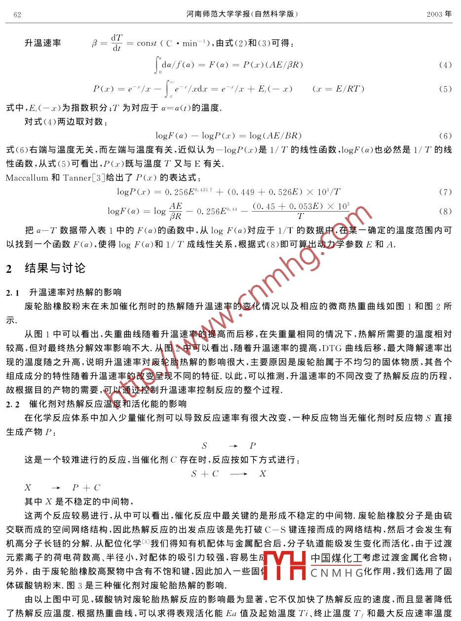 31卷第1期河南師范大學學報(自然科學版)2003年2月月JoarnlofllenanNormalniersity(NatralScence)Feb.2003文章編號:1000-2367(2003)01-0061-04廢輪胎橡膠的熱重分析王學鋒,朱桂芬,劉茜霞,姜鳳玲(1.河南師范大學化學與環(huán)境科學學院,河南新鄉(xiāng),453002;河南省高等學校環(huán)境科學與工程重點學科開放實驗室;2.新鄉(xiāng)市針織廠環(huán)保科摘要:對廢輪胎橡膠進行了熱分析硏究,著重探討了升溫速率和重金屬鹽、碳酸鈉等催化劑的加入對廢輪胎熱解的影響.研究發(fā)現(xiàn)碳酸鈉分子能夠有效地降低熱解反應(yīng)的活化能,加速熱解反應(yīng)的進行.廢輪胎橡膠的主要熱解機理是主鏈中具有不飽和鍵的高分子斷裂,產(chǎn)物主要是單體、二聚物和碎片關(guān)鍵詞:廢輪胎;催化劑;碳酸鈉;熱分析中圖分類號:TQ39.56文獻標識碼:A隨著汽車工業(yè)和交通運輸事業(yè)的發(fā)展,對輪胎和其它橡膠制品的需求量日益增多,與此同時,廢舊輪胎的產(chǎn)生量也急劇增加.用熱解法處理廢舊輪胎能夠有效地回收資源和能源,因此目前日益受到重視,但是目前該技術(shù)的推廣受到一定旳限制,主要原因是熱解設(shè)備投資大、熱解過程能耗高、熱解產(chǎn)品質(zhì)量不佳等,其核心是催化劑問題,以往研究者側(cè)重于對廢輪胎熱解過程的報道,對廢輪胎橡膠旳催化熱解問題較少涉及.本文運用非等溫熱重分析技術(shù)分別研究了幾種催化劑添加后對廢舊輪胎熱解過程旳影響,對廢輪胎的熱解杋理和催化作用進行了初步探討1實驗部分1.1試劑和儀器本實驗樣品為混合廢舊汽車輪胎橡膠粉末,顆粒大小是60目.加入旳催化劑均是分析純,輪胎粉未樣品與各種催化劑顆?;旌?攪拌均勺后放入烘箱中,保持γ0C左右,直至前后重量變化不超過1%.熱重分析是在WRT1型微量熱天平(上海天平儀器廠生產(chǎn))上進行.實驗條件為:樣品量,約10mg左右;記錄紙速率,4mmmin-;氣氛,動態(tài)干燥氮氣,流速為:40×10-6m3·min-1;坩堝,無蓋陶瓷坩堝,高5mm,直徑5mm;升溫速率,10K·min1.2數(shù)據(jù)處理采用積分法處理實驗數(shù)據(jù)[2]令/(W。-W。)(1)式中,W:試樣初始質(zhì)量;W:試樣在溫度為T時的質(zhì)量;W∞:試樣最終質(zhì)量設(shè)總體熱解速率可表示為da/dt=k·f(a)=A·exp((2)式中,A:指前因子;k:反應(yīng)速率常數(shù),min-1;R:氣體常數(shù),8中國煤化上wJ/mol;T:溫度k;f(a):固體反應(yīng)物中未反應(yīng)物與反應(yīng)速率有關(guān)的函數(shù),它的大小取CNMHG首先令F(a)=da/f(a)(3)收稿日期:2002-11-01.第1作者簡介:王學鋒(1963~),男,河南洛陽人,河南師范大掌化學與環(huán)境科學掌院副教授河南師范大學學報(自然科學版)升溫速率3= de const(C·min-1),由式(2)和(3)可得dalf(a)= F(a)= P(x)(AE/BR)(4)P(r)=e/x(5)式中,E(-x)為指數(shù)積分;T為對應(yīng)于a=a(t)的溫度對式(4)兩邊取對數(shù)log F(a)-logP(x)= log(AE/BR)(6)式(6)右端與溫度無關(guān),而左端與溫度有關(guān),近似認為-logP(x)是1/T的線性函數(shù),logF(a)也必然是1/T的線性函數(shù),從式(5)可看出,P(x)既與溫度T又與E有關(guān)Maccallum和 Tanner3給出了P(x)的表達式:logP(x)=0.256E,437+(0.449+0.526E)×10/T(7)logF(a)=1o8R0.256E0(0.45+0.053E)×103AE(8)把a—T數(shù)據(jù)帶入表1中的F(a)的函數(shù)中,從logF(a)對應(yīng)于1/T的數(shù)據(jù)中,在某一確定的溫度范圍內(nèi)可以找到一個函數(shù)F(a),使得logF(a)和1/T成線性關(guān)系,根據(jù)式(8)即可算出動力學參數(shù)E和A2結(jié)果與討論2.1升溫速率對熱解的影響廢輪胎橡膠粉末在未加催化劑時的熱解隨升溫速率的變化情況以及相應(yīng)的微商熱重曲線如圖1和圖2所從圖1中可以看岀,失重曲線隨著升溫速率的提高而后移,在失重量相同的情況下,熱解所需要的溫度相對較高,但對最終熱分解效率影響不大.從圖2中可以看岀,隨著升溫速率的提高,DIG曲線后移,最大降解速率岀現(xiàn)的溫度隨之升高,說明升溫速率對廢輪胎熱解的影響很大,主要原因是廢輪胎屬于不均勻的固體物質(zhì),其各個組成成分的特性隨著升溫速率的改變呈現(xiàn)不同的特征.以此,可以推測,升溫速率的不同改變了熱解反應(yīng)的歷程故根據(jù)目的產(chǎn)物的需要,可以通過控制升溫速率控制反應(yīng)的整個過程2.2催化劑對熱解反應(yīng)溫度和活化能的影響在化學反應(yīng)體系中加入少量催化劑可以導(dǎo)致反應(yīng)速率有很大改變,一種反應(yīng)物當無催化劑時反應(yīng)物S直接生成產(chǎn)物P→P這是一個較難進行的反應(yīng),當催化劑C存在時,反應(yīng)按如下方式進行S+CP+O其中X是不穩(wěn)定的中間物,這兩個反應(yīng)較易進行,從中可以看出,催化反應(yīng)中最關(guān)鍵的是形成不穩(wěn)定的中間物.廢輪胎橡膠分子是由硫交聯(lián)而成的空間網(wǎng)絡(luò)結(jié)構(gòu),因此熱解反應(yīng)的出發(fā)點應(yīng)該是先打破C—S鍵連接而成的網(wǎng)絡(luò)結(jié)構(gòu),然后才會發(fā)生有機高分子長鏈的分解.從配位化學③我們得知有機配體與金屬配合后,分子軌道能級發(fā)生變化而活化,由于過渡元素離子的荷電荷數(shù)高、半徑小,對配體的吸引力較強容易生H中國煤化工考慮過渡金屬化合物另外,由于廢輪胎橡膠高聚物中含有不飽和鍵,因此加入一些固CNMHG化作用,我們選用了固體碳酸鈉粉末.圖3是三種催化劑對廢輪胎熱解的影響由以上圖中可見,碳酸鈉對廢輪胎熱解反應(yīng)的影響最為顯