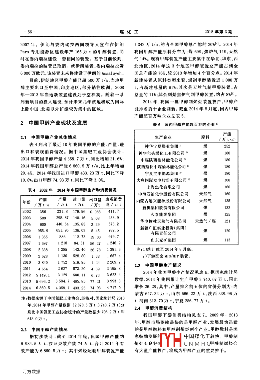 第43卷第3期煤化工Vol 43 No. 32015年6月Coal Chemical IndustJun.2015國內外甲醇產業(yè)及市場分析肖建新(福州耀隆化工集團公司,福建福州350014)摘要分析了世界甲醇市場格局,并對世界主要大型甲醇裝置、新增甲醇產能情況進行了介紹。著重介紹了中國甲醇產業(yè)的現狀,分析了我國甲醇的生產、消費、大型裝置、進出口情況等。最后對影響國內外甲醇產業(yè)及市場的因素進行了分析。關鍵詞甲醇,市場,發(fā)展?jié)摿?生產,消費,進出口文章編號:1005-9598(2015)-03-006307中圖分類號:TQ223.121文獻標識碼:A1世界甲醇市場情況能12070萬t/a,生產能力主要集中在中國、中東、南美和東歐部分地區(qū),其中中國約4900萬t/a、中東11世界甲醇的生產、消費、進出口1610萬t/a、美洲1360萬t/a,這3個區(qū)域產能占甲醇是全球流通的大宗產品,中國、歐洲、北美作全球甲醇產能的2/3以上。除中國是集生產和需求于為甲醇的最主要需求地區(qū),其貿易量約占全球甲醇貿體,其余兩個地區(qū)均以出口為主,本地消化甲醇極易的3/4。目前甲醇行業(yè)的全球主要貿易流向是南美少。2013年國際甲醇供需情況見表1。全球(除中國大產品流向北美市場,對其他區(qū)域的影響力相對較弱;陸外)主要大型甲醇生產裝置及產能情況見表2。中東產品流向歐洲和東北亞,兼顧東西市場,是全球1.2世界甲醇主要新增產能甲醇市場的主要供應商;另外還有部分東北亞的甲醇未來新增甲醇產能主要集中在中國、南北美、伊來自東南亞市場,但數量不大。中東、南美為主要出口朗。中國由于MT0/MTP項目大量投產,甲醇供大于求地區(qū),東亞、西歐、北美為主要進口地區(qū)。的市場情況將發(fā)生改變;加上中國國內天然氣價格上據安迅思(ICIS)統(tǒng)計,2013年,全球甲醇有效產漲,致使天然氣制甲醇裝置大面積停產,和國內對于表12013年國際甲醇供需情況有效產能/萬t·a1產量/萬t需求量/萬t進口量/萬t出口量/萬t凈進口量/萬t全球120707675767627032703非洲215歐洲l010370美洲13601080800210中東1610亞洲79704390(+1180)5478(+1328)392l088印度140東北亞地區(qū)73303890(+1090)507811901188東南亞地區(qū)580470(+90)370注:數據來源安迅思中國,括號內數據為相對上年變化量。中國煤化工收稿日期:2015-04-10CNMHG作者簡介:肖建新(1964—),男,福建福州,高級工程師,學士,1987年本科畢νm亞,現主要從事煤化工等行業(yè)產品的生產、經銷及研發(fā)工作,E-mail:139059297870139.c0m。煤化工2015年第3期表2全球(中國大陸除外)主要甲醇生產裝置及產能統(tǒng)計D公司名稱/地點產能/萬t·a備注新西蘭( Waitara Valley和 Motunui)2014年產量219.6萬t特立尼達和多巴哥( Atlas)3112.52014年產量90.7萬t持立尼達和多巴哥( Titan)87.52014年產量66.4萬t埃及4年產量41.6萬Methanex加拿大( Medicine Hat14年產量50.5萬t智利I和Ⅳ2014年產量16.5萬t100智利兩座工廠搬遷過來, Geismar美國路易斯安那州( Geismar1和 Geismar2)1預計2015年初投產, Geismar2l00預計2016年投產合計9422014年產量485.3萬t75SABIC與三菱瓦斯公司各投Saudi Methanol Company(Al-Jubail)資50%的合資公司SABIC(沙特阿拉伯)170Gulf Petrochemical Industries Company(巴林)由巴林王國政府、 SABIC和科威特PIC共同擁有National Methanol Company( Ibn Sina)(Al-Jubail)105SABIC和CTE各50%所有權合計6452013年產量約480萬t165Zagros Petrochemical Co, (ZPC1653NPC(伊朗)Fanavaran Petrochemical Co. (FPC)Kharg Petrochemical Co.( KPCShiraz petrochemi cal co4 Methanol Holdings Trinidad Ltd.-(MHTL)(特立尼達和多巴哥)5 Petronas methanol Labuan Sdn bhd-(PML)(馬來西亞Salalah Methanol Co.(阿曼)109.50 man Methanol Co.LLC(OMC)(阿曼8 Atlantic Met hanol Production Co.-( Ampco)(赤道幾內亞)Metafrax(俄羅斯)Togliatti Azot(Toaz)(俄羅斯)100International Methanol Co.-(IMC)(沙特阿拉伯)由沙特阿拉伯 Sipchem投資65%日本JAMC投資35%12Qatar Fuel Additives Co.Ltd.-( Mafac)(卡塔爾)注:1)數據主要來源于各公司官方網站;2)考慮天然氣供應情況,有效產能約600萬t/a;3) Methanex占股63.1%,裝置總產能180萬t/a4) Methanex占股50%,裝置總產能130萬t/aV凵中國煤化工環(huán)境問題的重視,長遠來看,相對便宜的國際甲醇價機構預測,CNMHG產能約560萬格將帶動中國甲醇進口量上升。南北美方面,據相關t/a,非洲和南美將新增300萬t/a,2016年以后北美2015年6月肖建新:國內外甲醇產業(yè)及市場分析65甲醇基本實現自給,南美甲醇產能出現大量過剩,南t,約消耗2800萬t甲醇;二是甲醇制芳烴技術取得美地區(qū)也將到東北亞、尤其是中國尋找甲醇的出口市突破,華電集團世界首套萬噸級煤基甲醇制芳烴工業(yè)場。隨著甲醇產能進一步的增加,北美也將逐步成為試驗成功,華電榆橫年產300萬t甲醇、100萬t芳甲醇凈出口地區(qū),將與中東爭奪歐洲和亞洲市場。未烴項目已經開工建設;三是甲醇燃料(汽油)將保持來10年,歐洲甲醇進口量有望繼續(xù)增加,而東北亞地10%~15%的增速增長(2。因此,未來幾年,中國甲醇的區(qū)的進口量有望增至當前的3倍。產能和需求都將繼續(xù)大幅度增長,裝置向煤基大型化1.2.1中國發(fā)展,甲醇產能過剩的狀態(tài)將得到有效緩解,中國的中國將成為全球甲醇需求增長的主要驅動力。甲醇市場將保持平穩(wěn)向好的發(fā)展態(tài)勢。IHS化學的最新研究報告顯示,至2023年全球甲醇1.2.2美國需求將增加至逾1.09億t,增幅達到80%。中國是全頁巖氣革命啟動甲醇產能。美國的頁巖氣大發(fā)展球最大的甲醇生產國,由于MT0產業(yè)快速發(fā)展,未來使